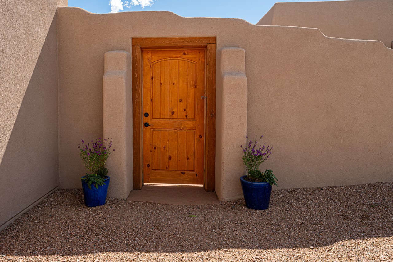 Stunning Adobe contemporary pueblo masterpiece by one of Santa Fe's premier adobe builders, Jeff Fagley of Shaylube Construction. This home has never been lived in, is waiting for the first owner to enjoy. Open plan design with dramatic corbelled beam ceiling and Kiva fireplace in great room, tiled floors and gleaming thick smooth plastered walls throughout complement the classic elements of Santa Fe style. Spacious feel with high ceilings throughout, split 3 bedrooms plus office, large owners suite with private walled portal, 4 bathrooms separate guest suite. Natural gas radiant heat plus 5 mini splits for heating and cooling complementing the radiant in floor heating and passive solar design. A sunny chefs kitchen with butlers pantry and large central island, large formal dining area opening to a wraparound portal for private outside dining and entertainment. A walled courtyard entry with wrap around portal also provides the access to both main home and guest quarters. There is a second privacy walled south courtyard with bricked portals accessed from living room and master suite also excellent for sunset mountain viewing. Roof drainage to 2 cisterns already installed underground catch the rainfall for landscaping. A large 3 car garage for lots of toys or hobbies, plenty of guest parking and lovely views with 7+acres to enjoy. Horses allowed. Enjoy access to local Eldorado area shopping, schools, senior center and library plus only minutes into Santa Fe.
