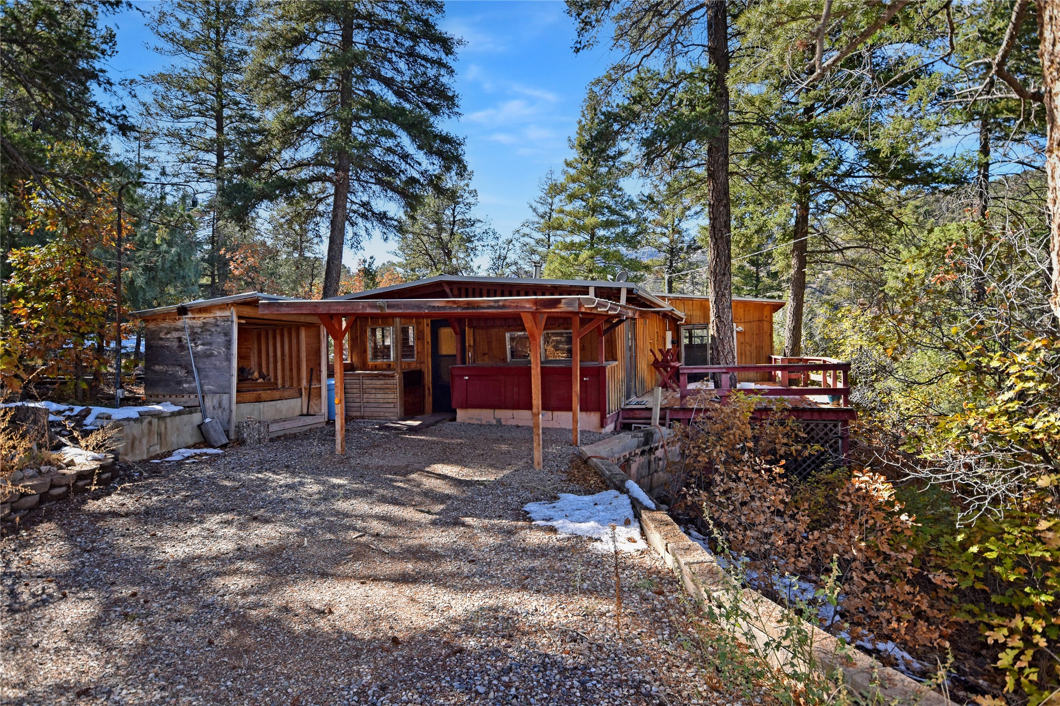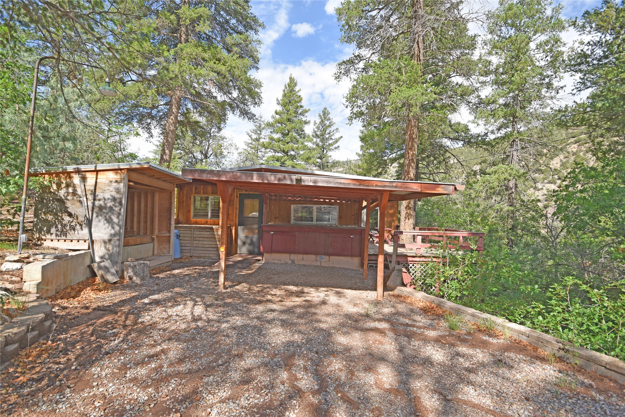 Dreaming of your own cabin in the pines? This one may be just the ticket!! Nestled in the mesa cliffs above the Jemez River, this cozy retreat is ready for you, your family, and friends. Two spacious bedrooms, each with private bathrooms, plus a third that could easily be a workspace or office. Cozy living room with a woodstove for warmth and charm. The super CUTE kitchen is part of the original vintage travel trailer that this family started with for this special getaway place! 2 large decks to soak in the fabulous views and enjoy the Jemez Mountain air. Community water and County maintained road. Don't miss out--call today for more information! Adjoining .60-acre lot with 576 sq/ft garage is also available for purchase with the home (not included in the purchase price)