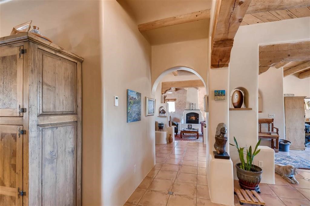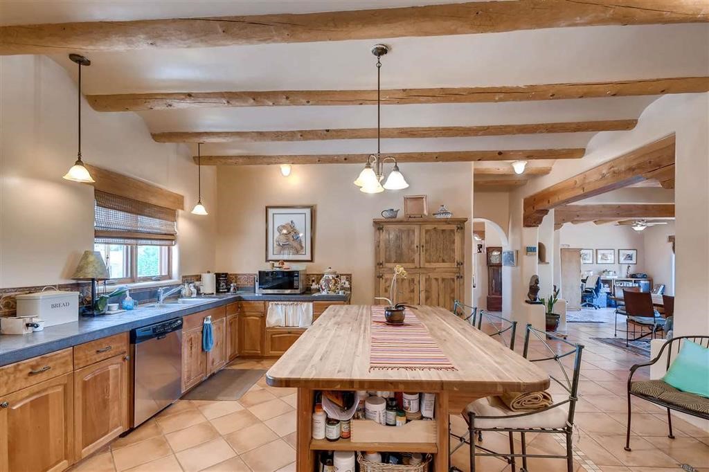 LUSH Pecos River frontage Pueblo style home with irrigated waterfront lands. Your waterfront farmland and farmhouse experience awaits! Acequia rights (19.425 acre feet per year), community water, private well, rain catchment tanks and 400 feet of Riverfront. Rare offering is an understatement. Environmentally friendly home is constructed from RASTRA offering exceptional thermal and acoustic insulation, keeping it cool in the summer and warm in the winter. The interior boasts Venetian plaster, tile floors, vigas, classic nichos, coved ceilings, cooks kitchen with large island and stainless steel appliances. With 3 bedrooms and 2 full baths, offering comfortable living.