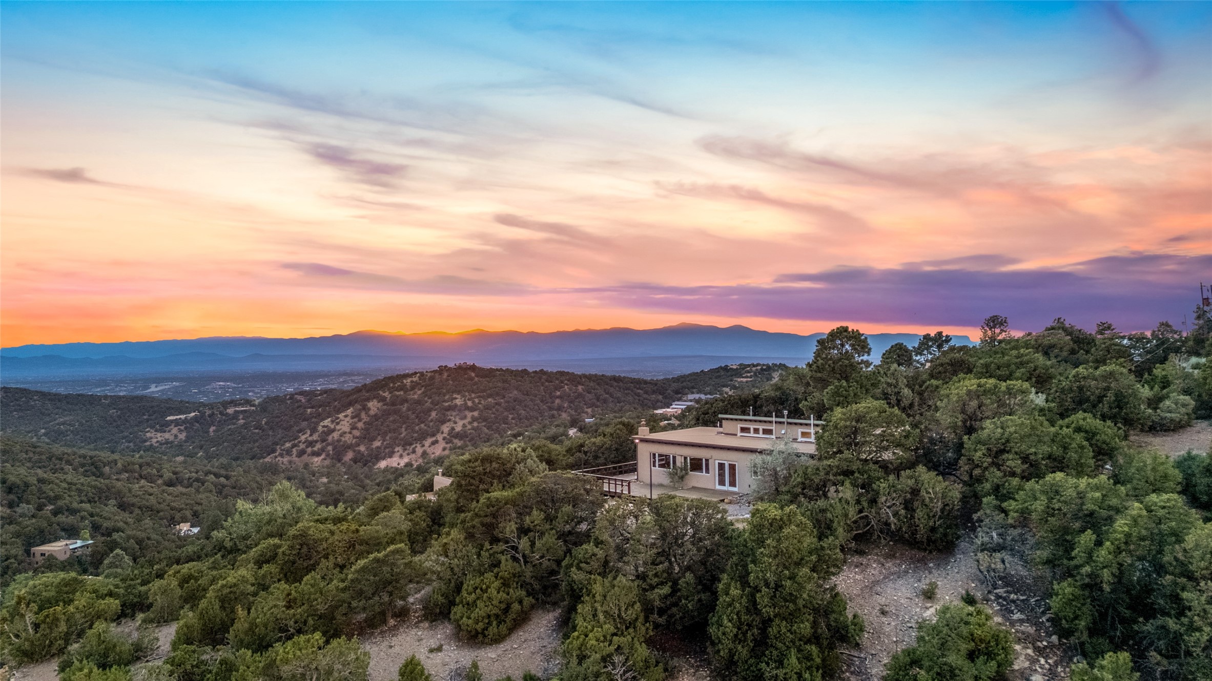 This home has been a successful rental property for many years and also offers an excellent opportunity for a long-term residence. Nestled among the pions with sweeping views of the valley and Sangre de Cristo Mountains, it provides a rare blend of privacy and convenience--just 10 minutes from the Plaza yet peacefully removed.Inside, custom fireplaces and quality finishes bring warmth and elegance throughout. The main residence connects seamlessly to an attached casita, ideal for guests, extended stays, or flexible living. Outdoor spaces invite you to enjoy dramatic light and stunning sunsets, making this home a true Santa Fe retreat.