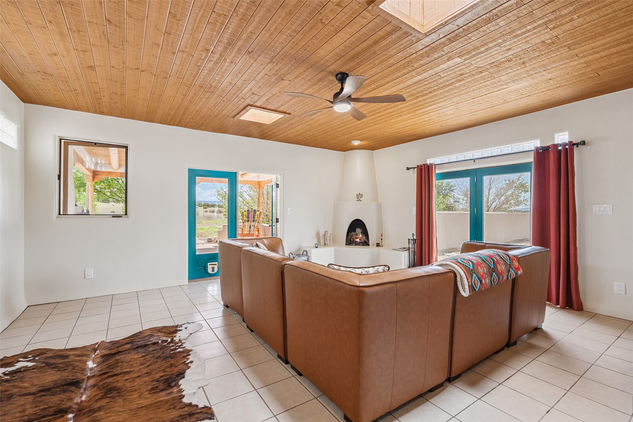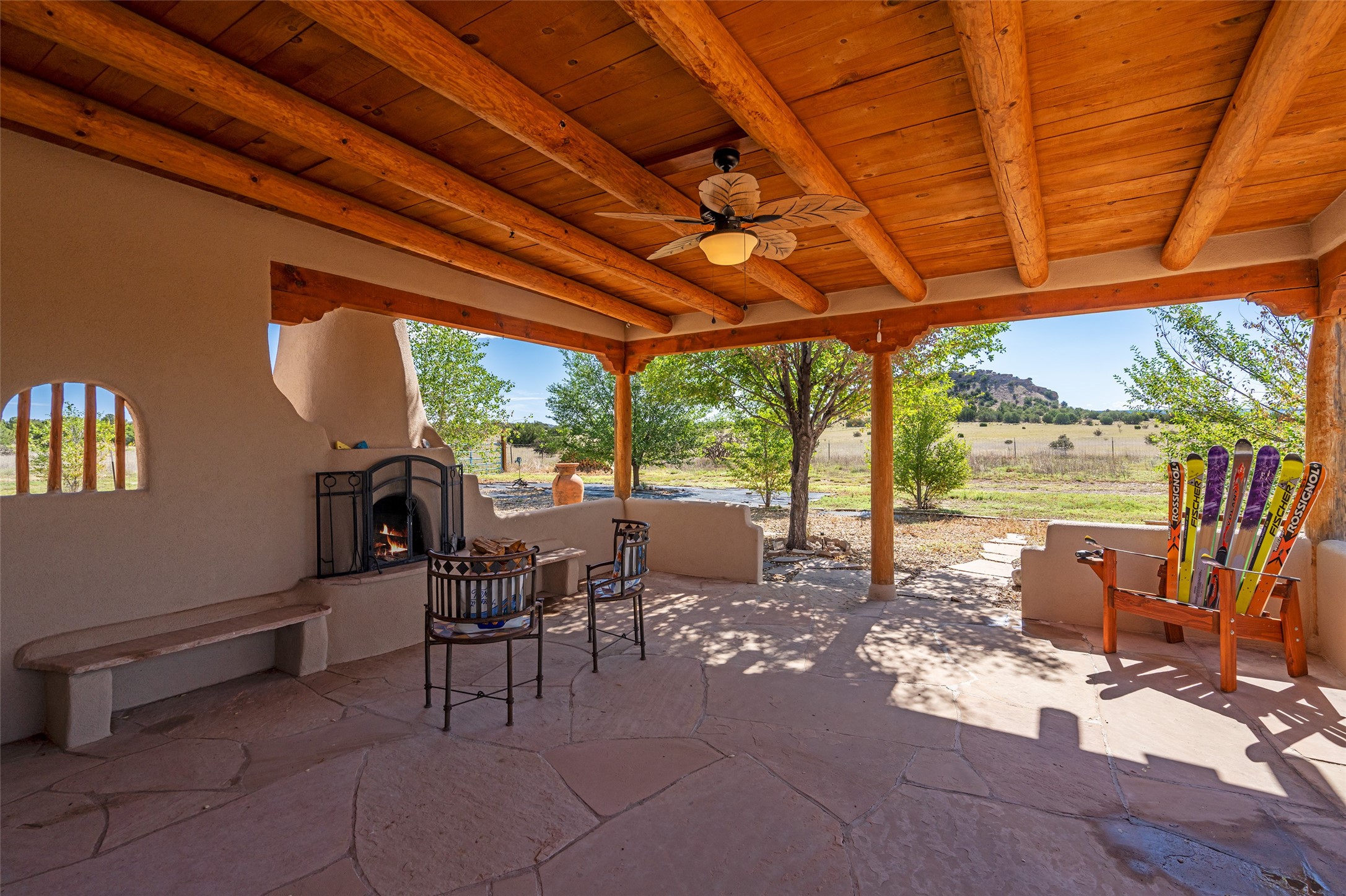 Centrally located between Los Alamos, Santa Fe, and Taos, this spacious 4-bed, 4-bath home on 5 acres offers peaceful family living in the heart of Medanales. With horses welcome and Abiquiu Lake and national forest lands just minutes away, it's an ideal setting for those who love space, nature, and quiet. Inside, classic Southwestern style shines through with brick floors, beamed ceilings, multiple wood stoves, two kiva fireplaces, and cozy radiant heat. With newly remodeled custom baths featuring walk-in showers, a generous kitchen, separate dining room, and a dedicated office, this home perfectly suited for both family life and remote work. Multiple courtyards provide serene outdoor living spaces, while a large covered portal with a Kiva fireplace invites year-round enjoyment. Sweeping mountain views complete this exceptional property--offering a private, charming retreat with room to roam.