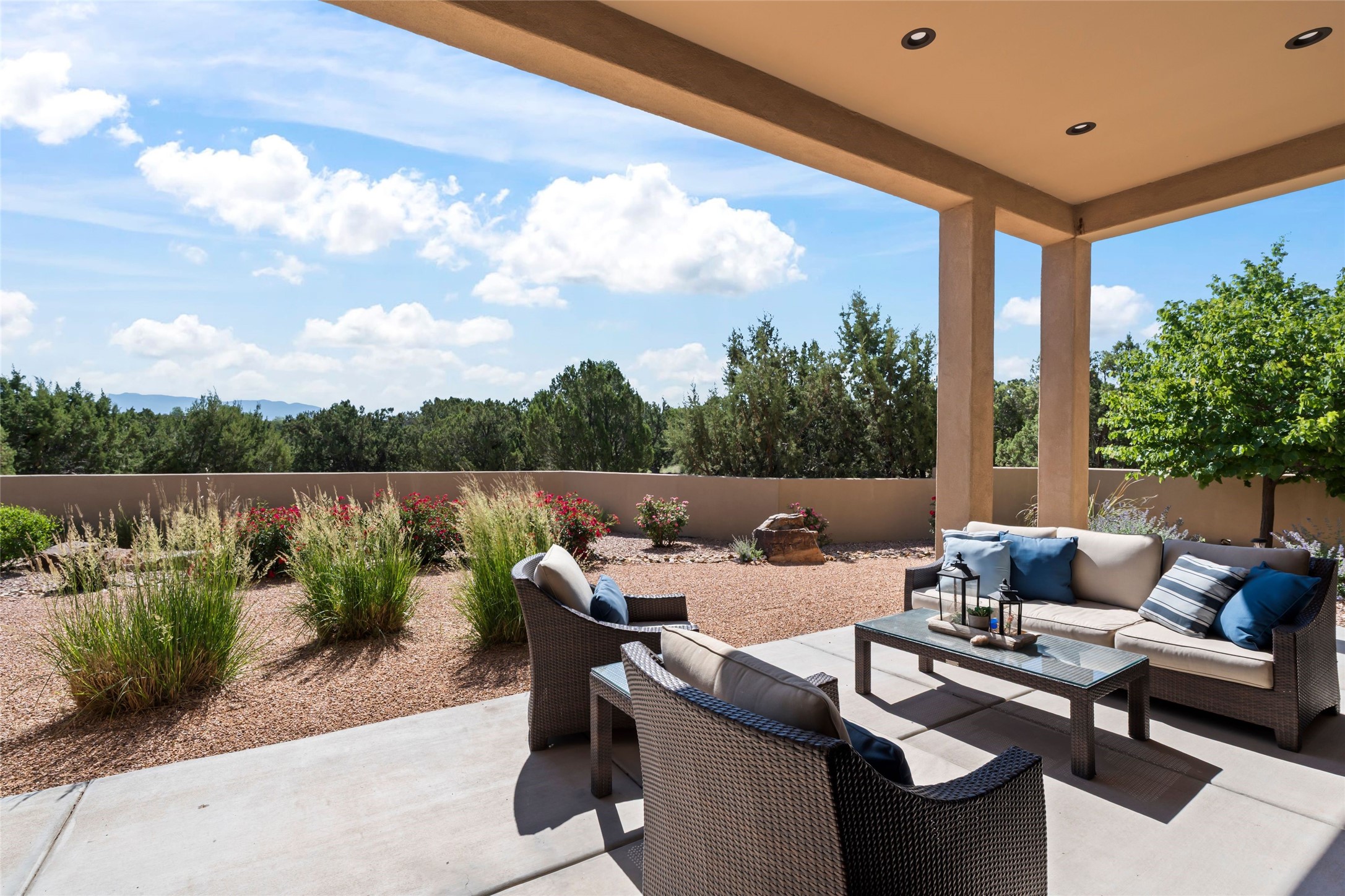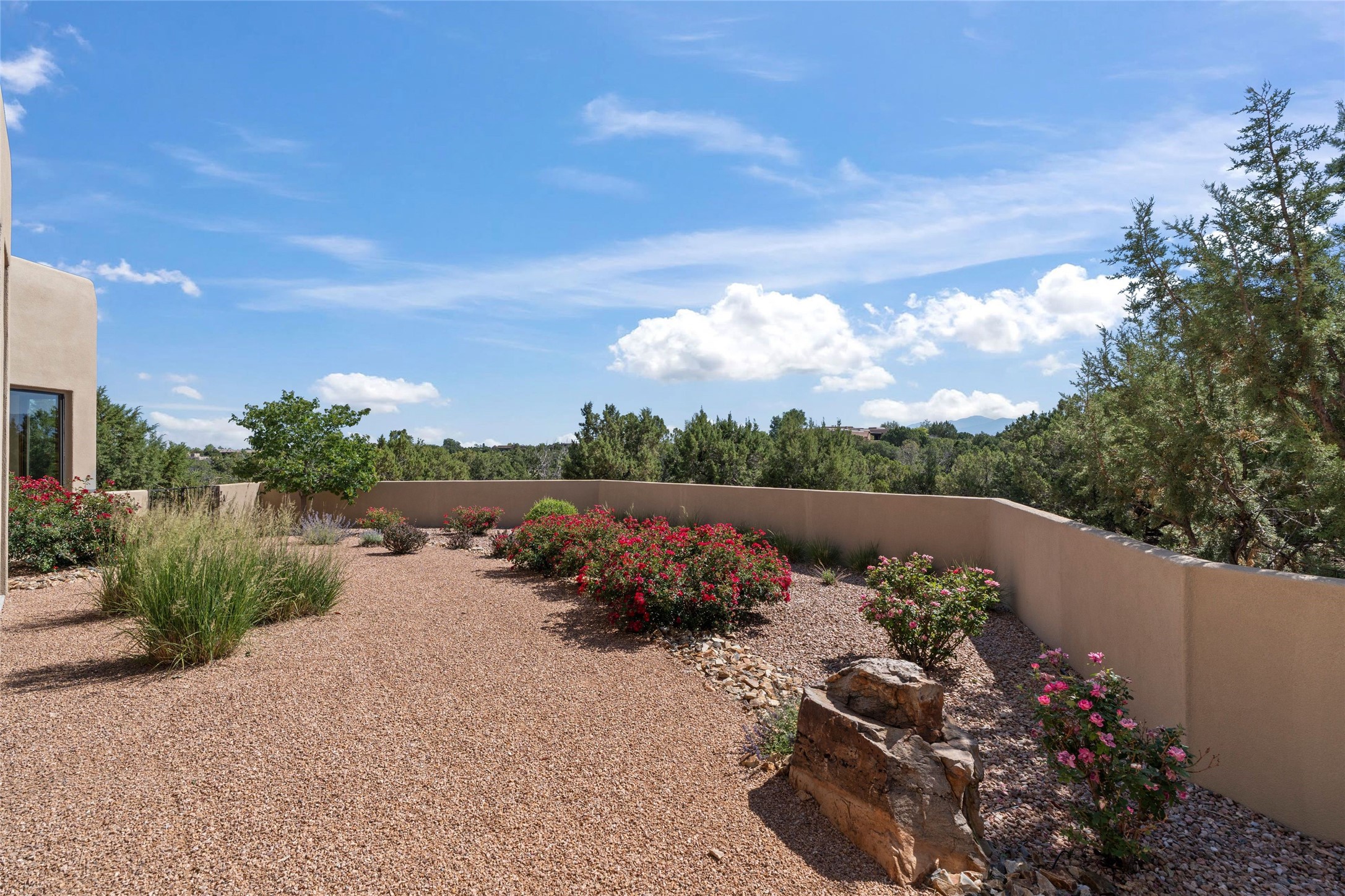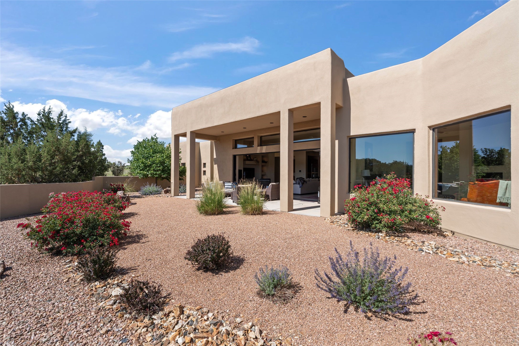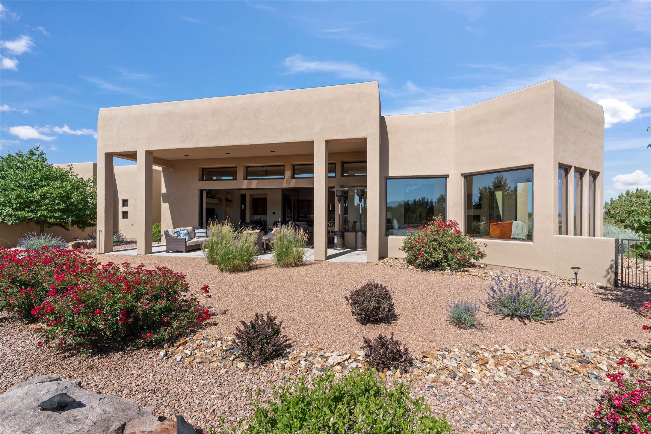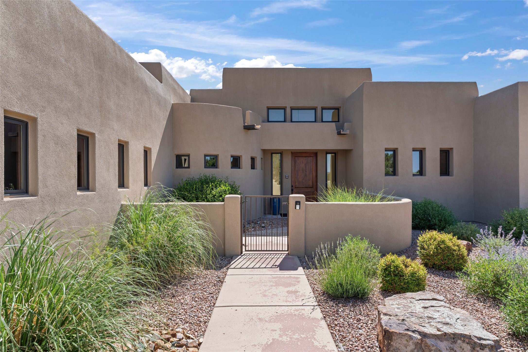 This contemporary Pueblo-style 3-bedroom residence located on nearly 2 acres in Las Campanas offers both elegant design and a setting selected to maximize the views and privacy. Built in 2016, the single level floorpan is ideal with two guest suites and an office opposite the house from a generous primary bedroom. The main living area is replete with 15-foot ceilings and nearly floor-to-ceiling glass doors that frame the dynamic panorama of the Sangre de Cristo Mountains. When the doors are pocketed fully into the wall, the dramatic, open concept living/dining/kitchen area flows seamlessly into a large portal and beautifully planted walled courtyard. This is a house built to enjoy a perfect summer evening. The sleek and modern kitchen includes an ample walk-in pantry, Jenn-Aire stainless steel appliances, a 6-burner gas cooktop and a bar level eat-in counter. The airy master bedroom suite captures mountain views to be enjoyed in a secluded sitting area with a raised hearth fireplace. The primary bathroom and closet are spacious and refined. With a 3-car garage, a private lot, no steps, a thoughtful floor plan and modern amenities, 63 Thundercloud lacks for nothing.