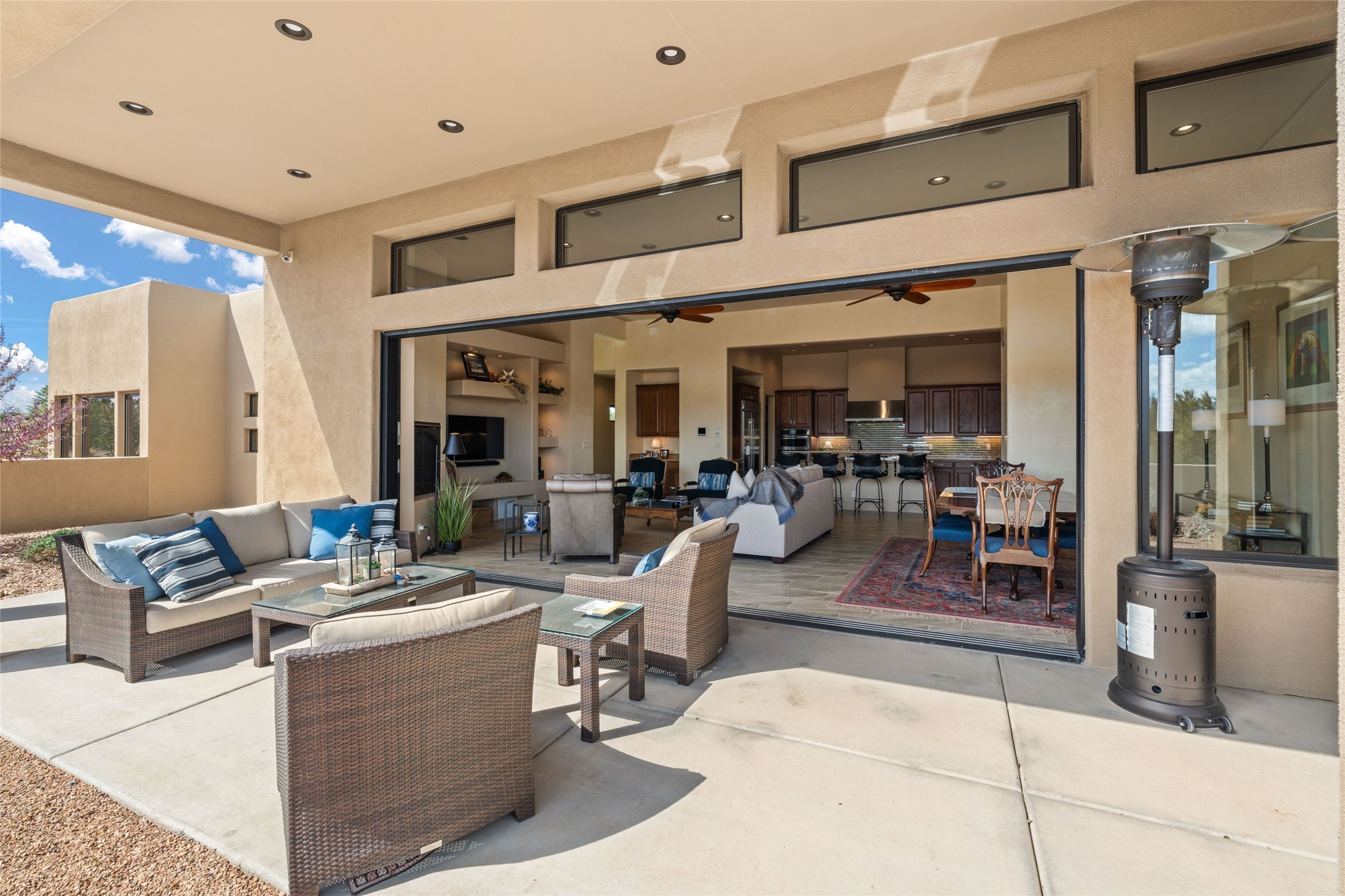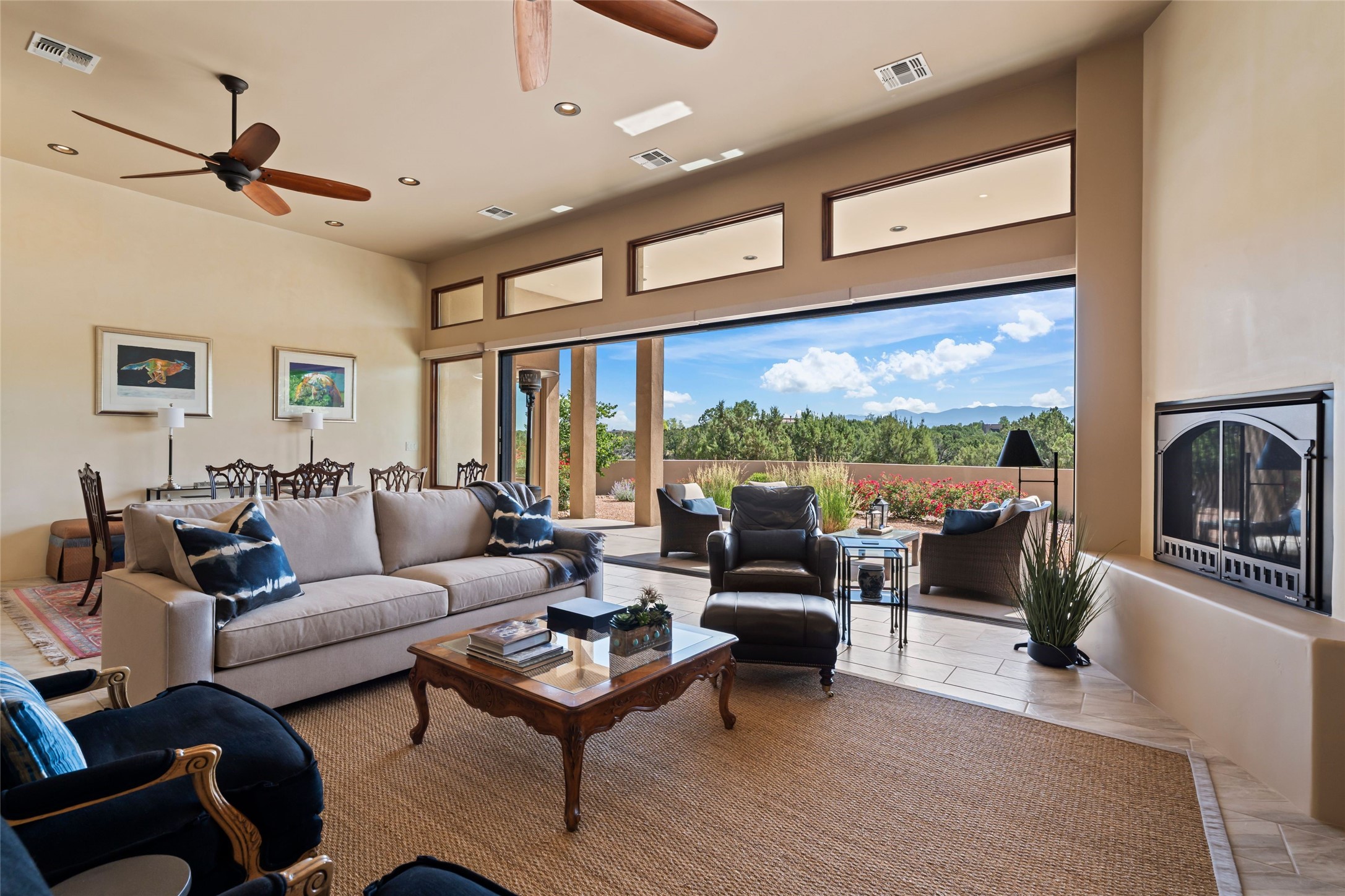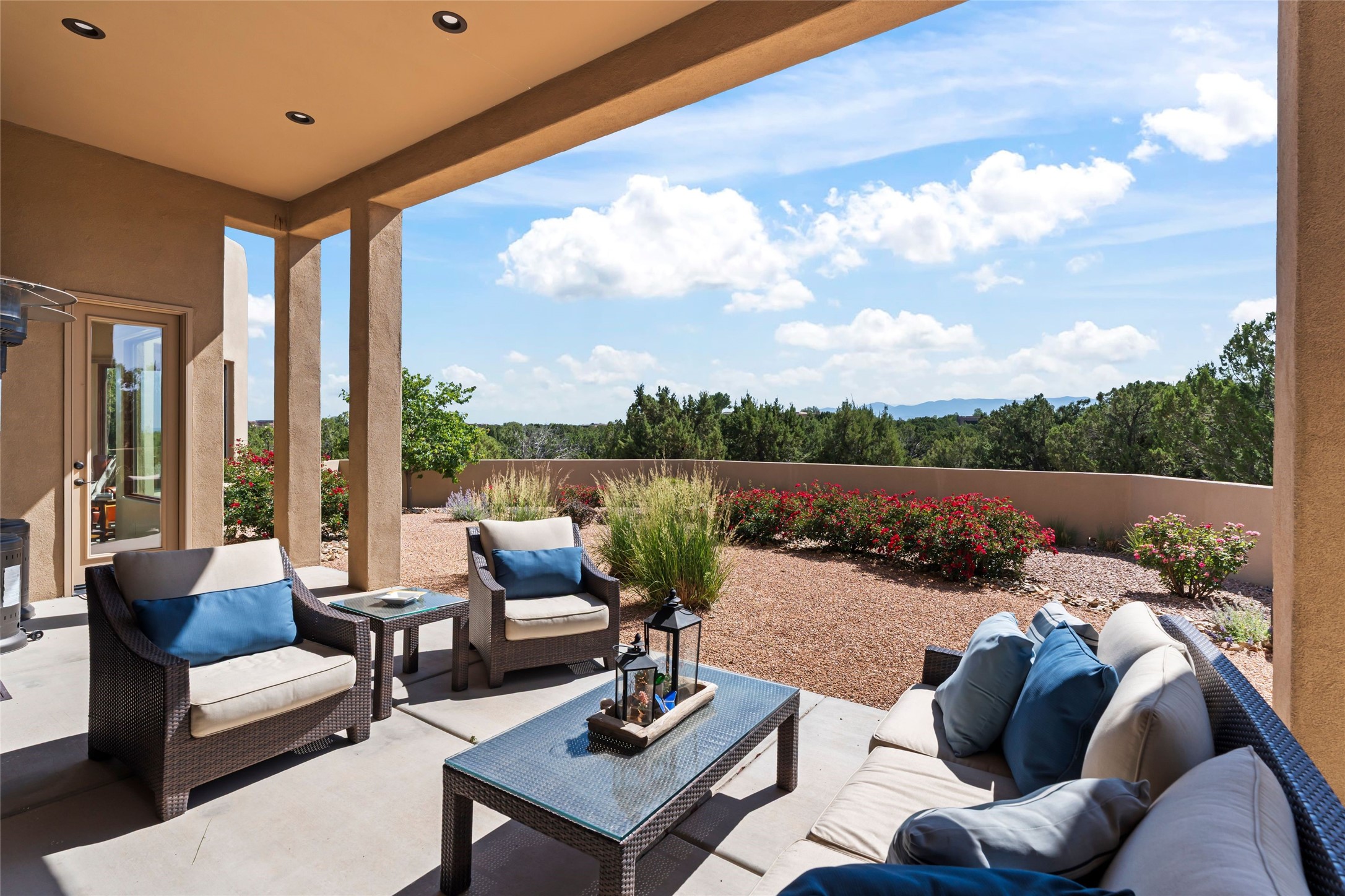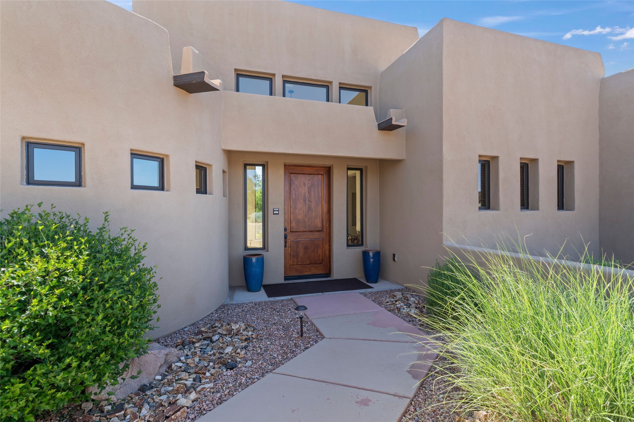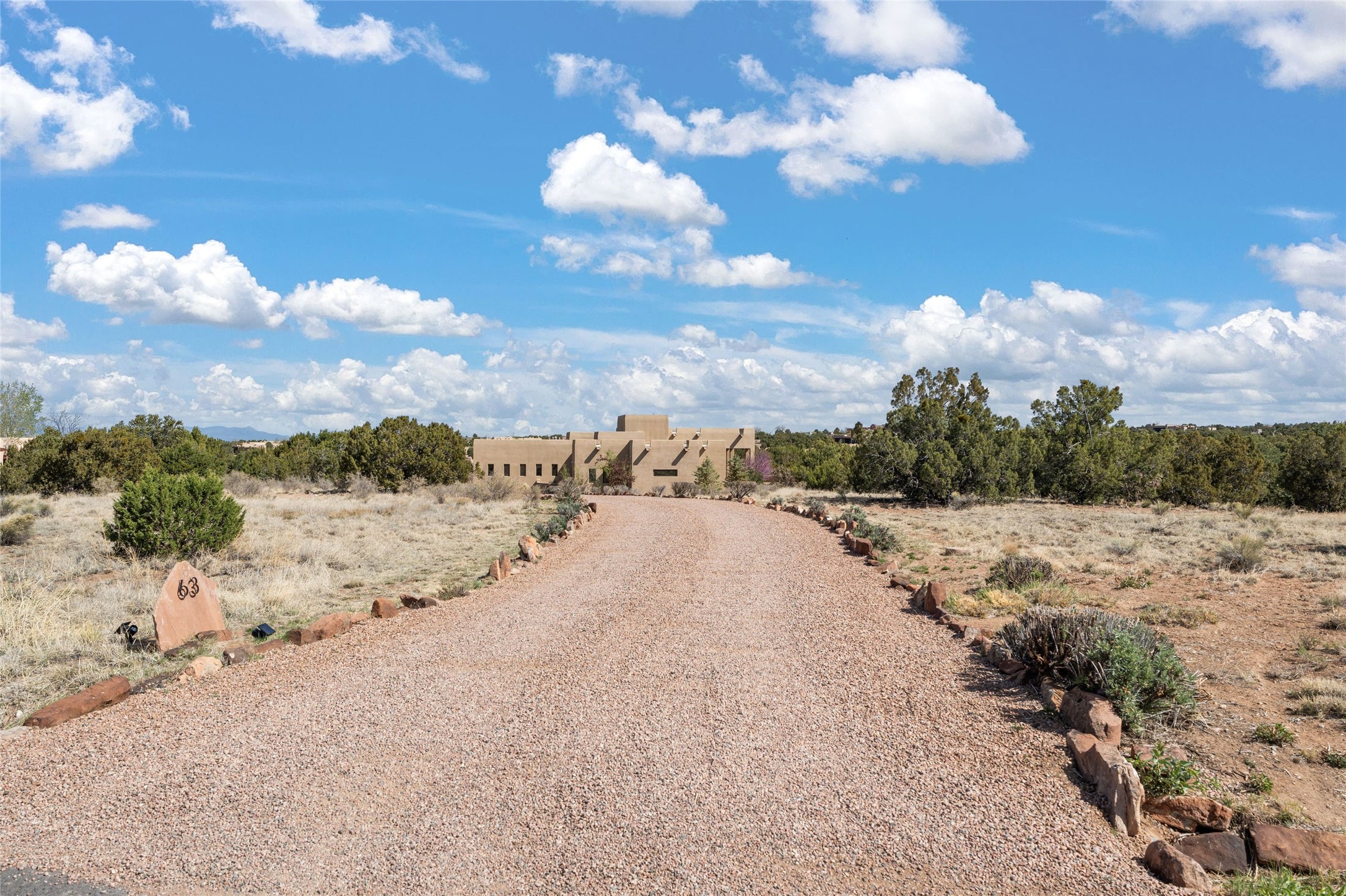 This contemporary Pueblo-style 3-bedroom residence located on nearly 2 acres in Las Campanas offers both elegant design and a setting selected to maximize the views and privacy. Built in 2016, the single level floorpan is ideal with two guest suites and an office opposite the house from a generous primary bedroom. The main living area is replete with 15-foot ceilings and nearly floor-to-ceiling glass doors that frame the dynamic panorama of the Sangre de Cristo Mountains. When the doors are pocketed fully into the wall, the dramatic, open concept living/dining/kitchen area flows seamlessly into a large portal and beautifully planted walled courtyard. This is a house built to enjoy a perfect summer evening. The sleek and modern kitchen includes an ample walk-in pantry, Jenn-Aire stainless steel appliances, a 6-burner gas cooktop and a bar level eat-in counter. The airy master bedroom suite captures mountain views to be enjoyed in a secluded sitting area with a raised hearth fireplace. The primary bathroom and closet are spacious and refined. With a 3-car garage, a private lot, no steps, a thoughtful floor plan and modern amenities, 63 Thundercloud lacks for nothing.