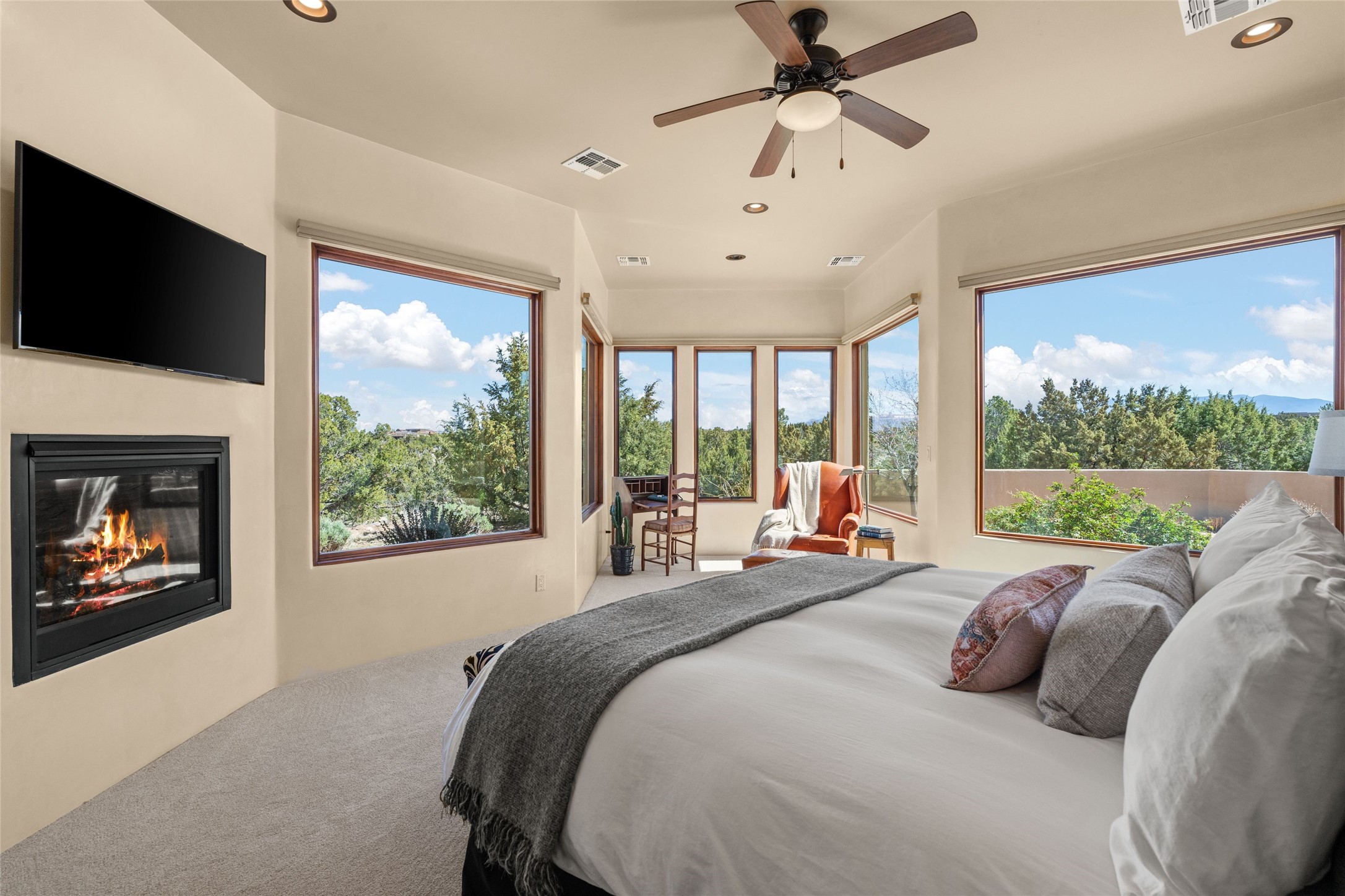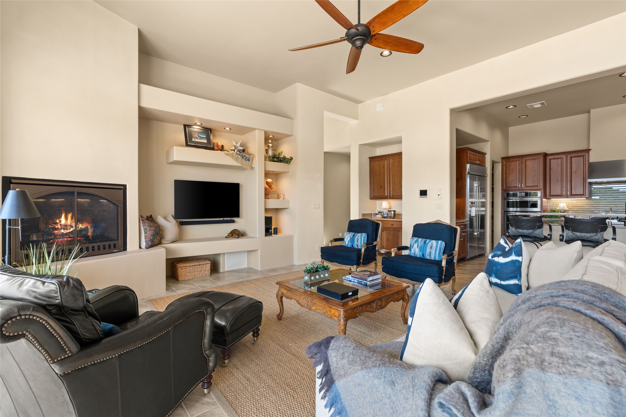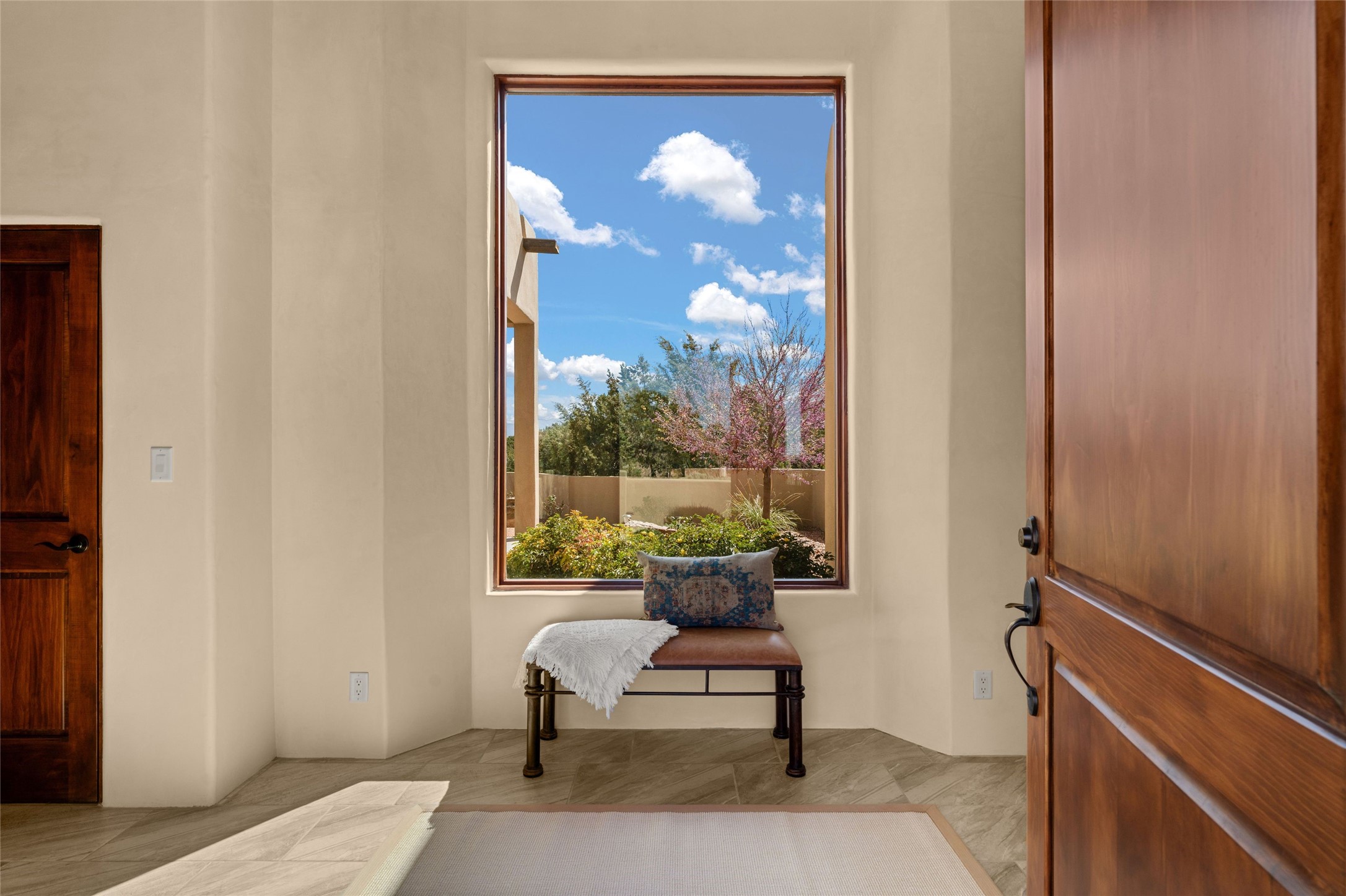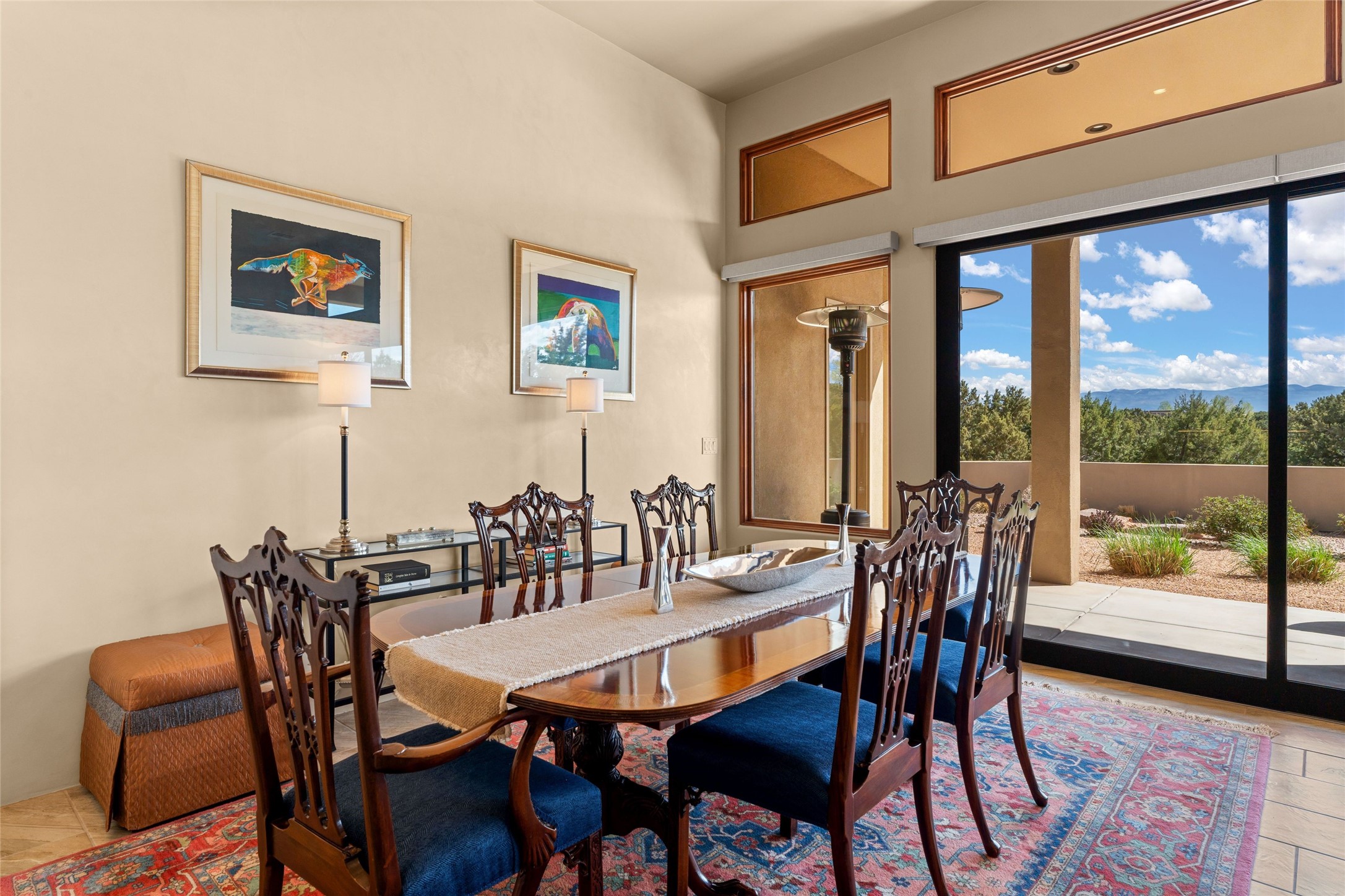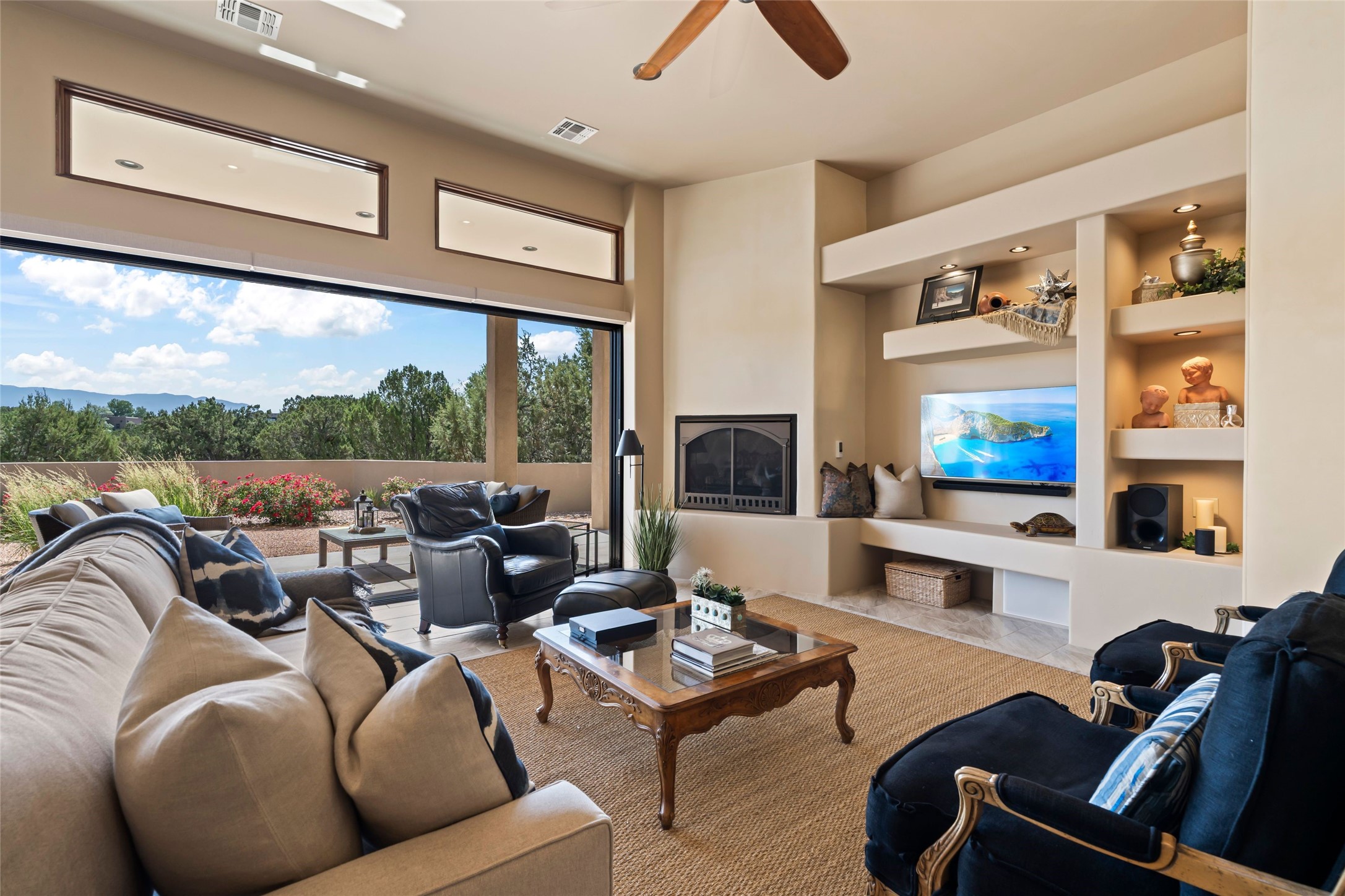 This contemporary Pueblo-style 3-bedroom residence located on nearly 2 acres in Las Campanas offers both elegant design and a setting selected to maximize the views and privacy. Built in 2016, the single level floorpan is ideal with two guest suites and an office opposite the house from a generous primary bedroom. The main living area is replete with 15-foot ceilings and nearly floor-to-ceiling glass doors that frame the dynamic panorama of the Sangre de Cristo Mountains. When the doors are pocketed fully into the wall, the dramatic, open concept living/dining/kitchen area flows seamlessly into a large portal and beautifully planted walled courtyard. This is a house built to enjoy a perfect summer evening. The sleek and modern kitchen includes an ample walk-in pantry, Jenn-Aire stainless steel appliances, a 6-burner gas cooktop and a bar level eat-in counter. The airy master bedroom suite captures mountain views to be enjoyed in a secluded sitting area with a raised hearth fireplace. The primary bathroom and closet are spacious and refined. With a 3-car garage, a private lot, no steps, a thoughtful floor plan and modern amenities, 63 Thundercloud lacks for nothing.