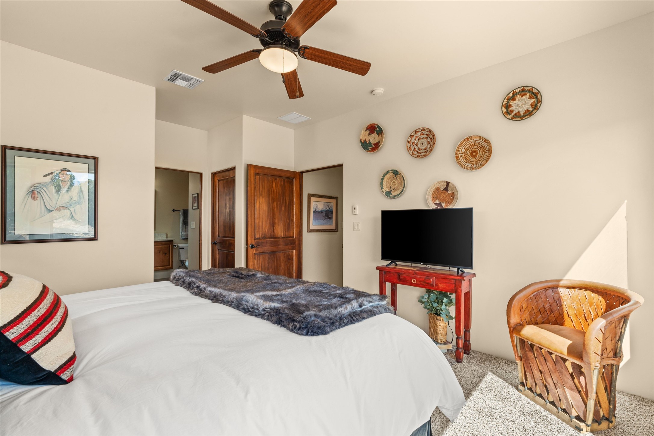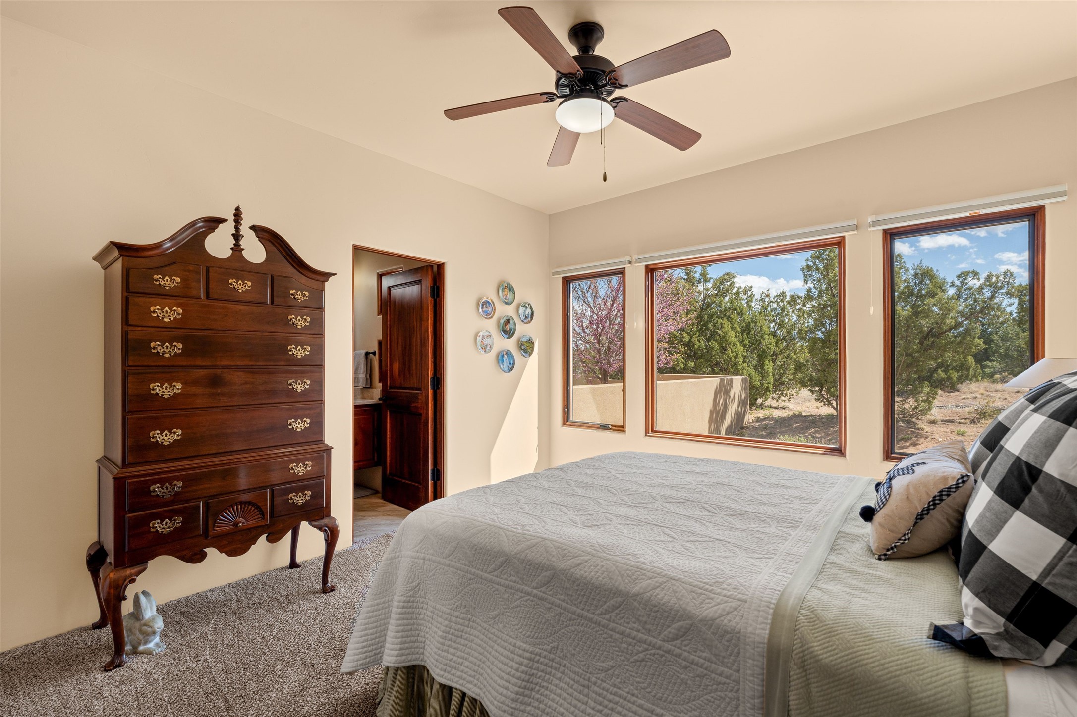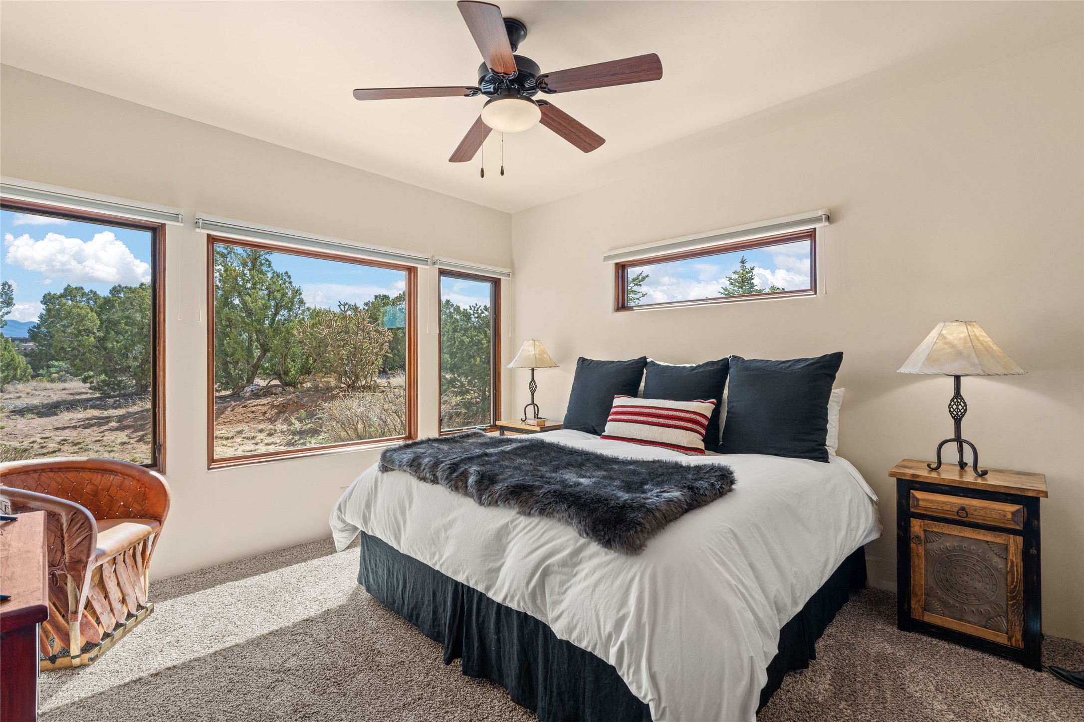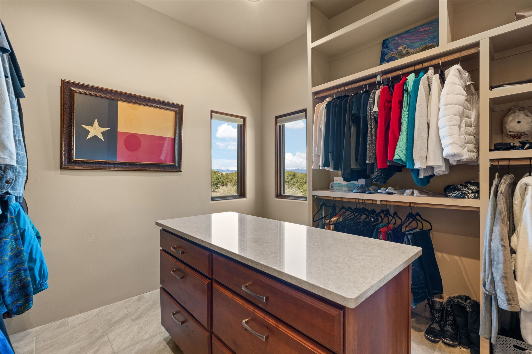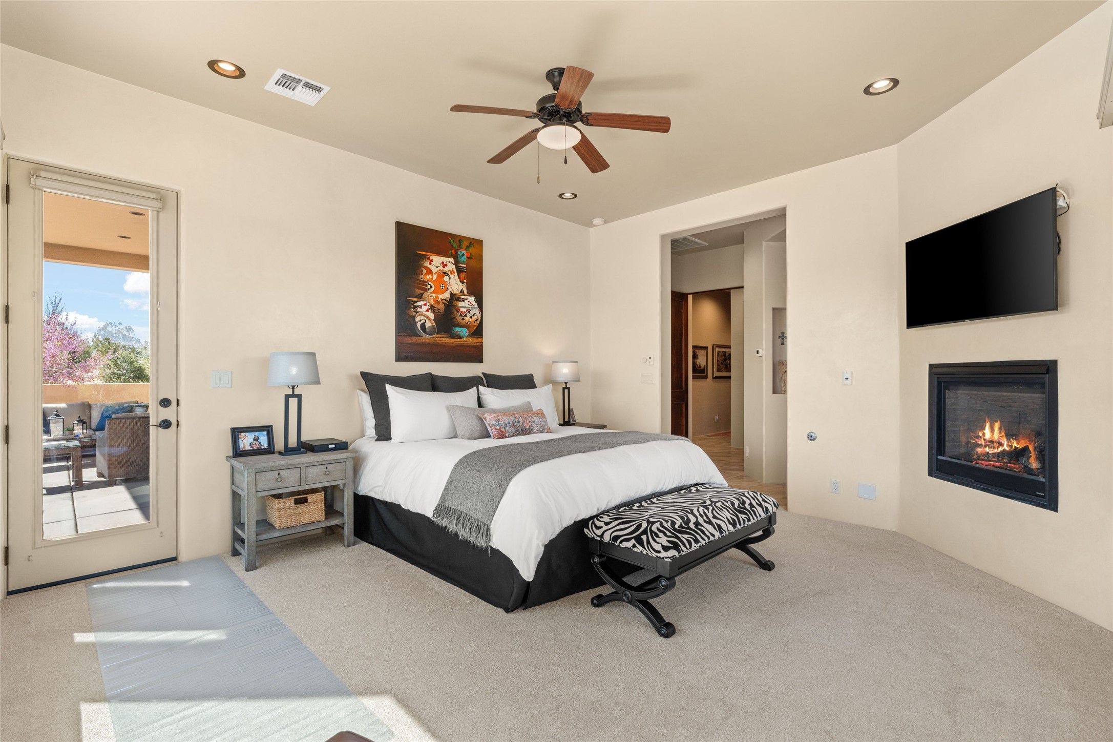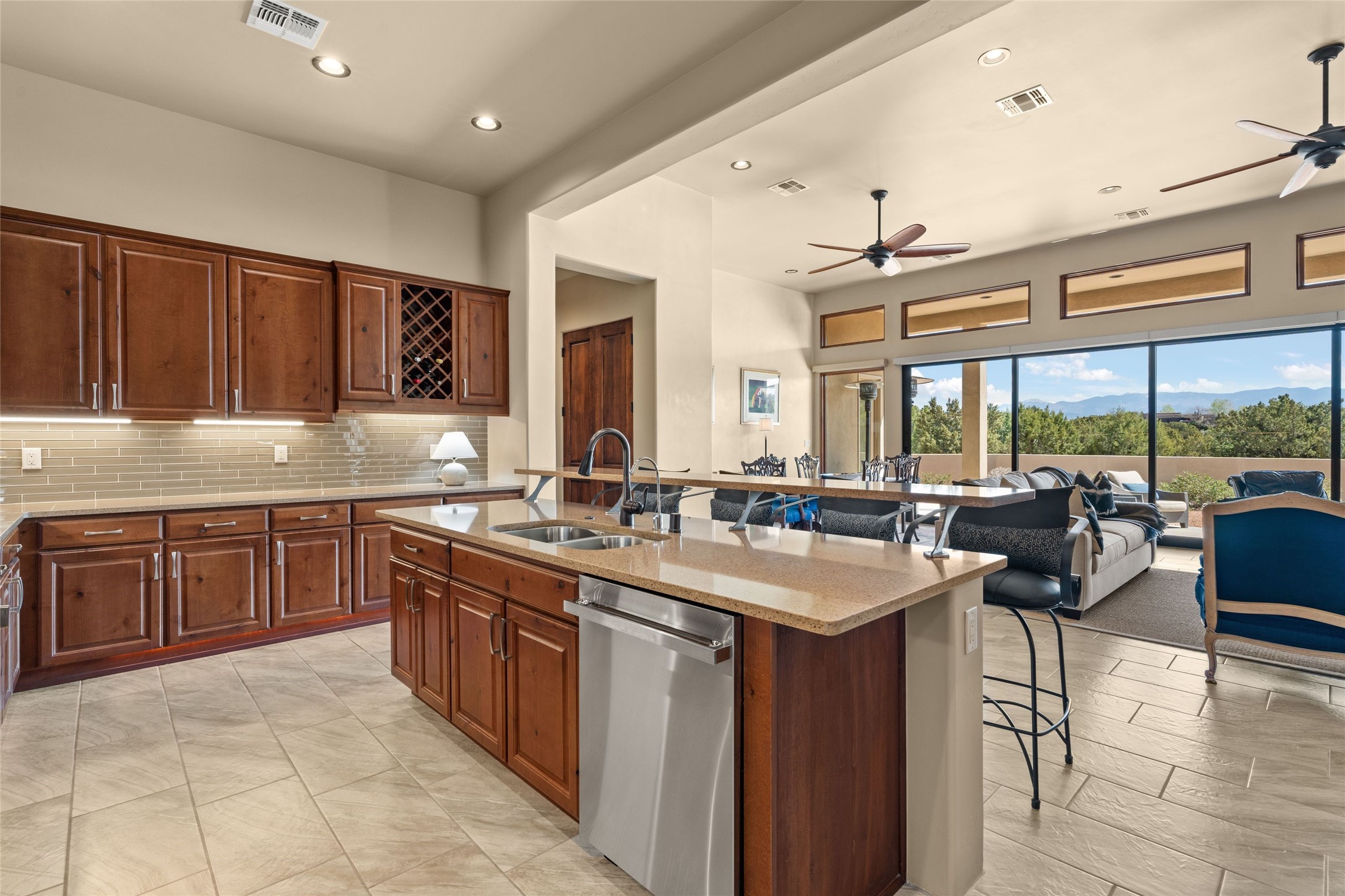 This contemporary Pueblo-style 3-bedroom residence located on nearly 2 acres in Las Campanas offers both elegant design and a setting selected to maximize the views and privacy. Built in 2016, the single level floorpan is ideal with two guest suites and an office opposite the house from a generous primary bedroom. The main living area is replete with 15-foot ceilings and nearly floor-to-ceiling glass doors that frame the dynamic panorama of the Sangre de Cristo Mountains. When the doors are pocketed fully into the wall, the dramatic, open concept living/dining/kitchen area flows seamlessly into a large portal and beautifully planted walled courtyard. This is a house built to enjoy a perfect summer evening. The sleek and modern kitchen includes an ample walk-in pantry, Jenn-Aire stainless steel appliances, a 6-burner gas cooktop and a bar level eat-in counter. The airy master bedroom suite captures mountain views to be enjoyed in a secluded sitting area with a raised hearth fireplace. The primary bathroom and closet are spacious and refined. With a 3-car garage, a private lot, no steps, a thoughtful floor plan and modern amenities, 63 Thundercloud lacks for nothing.