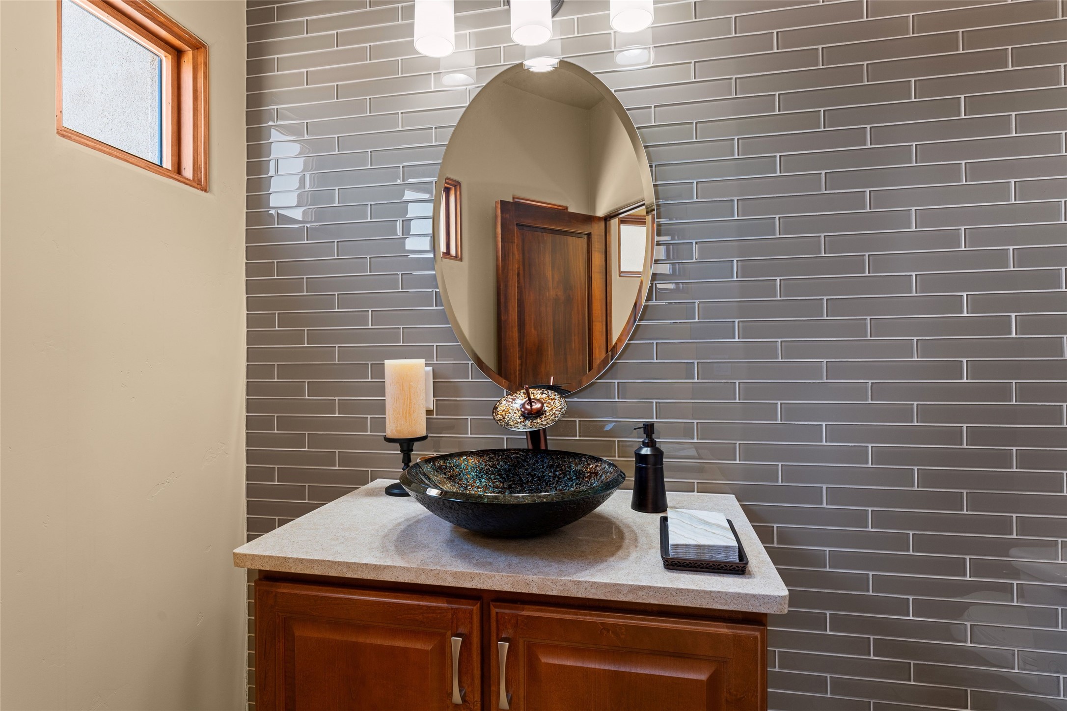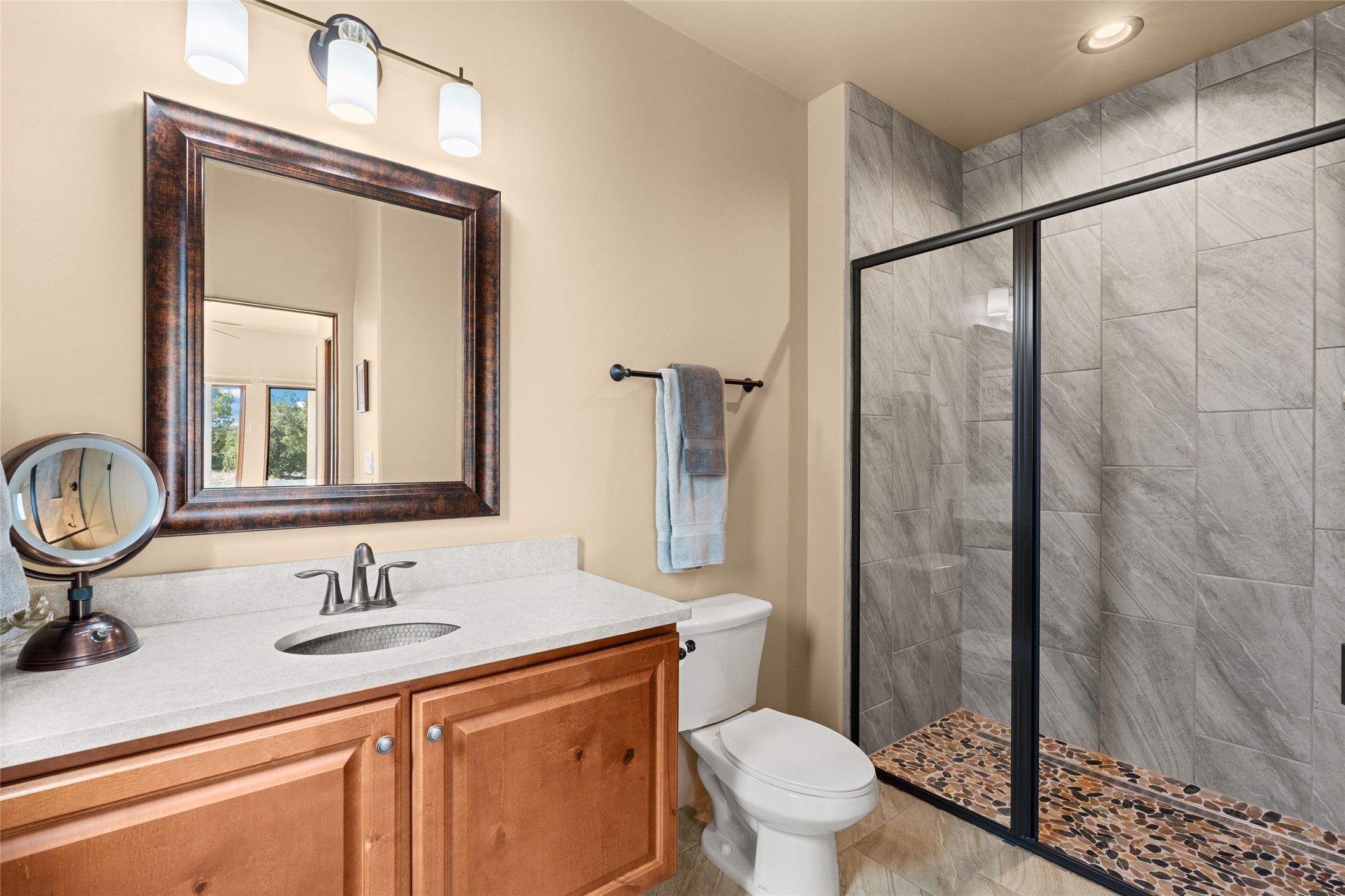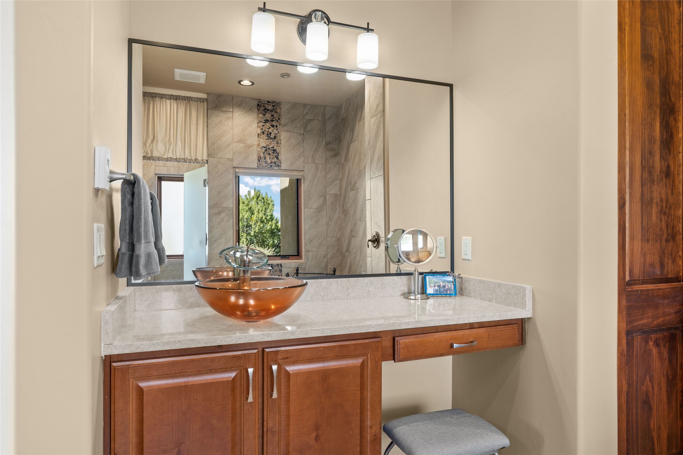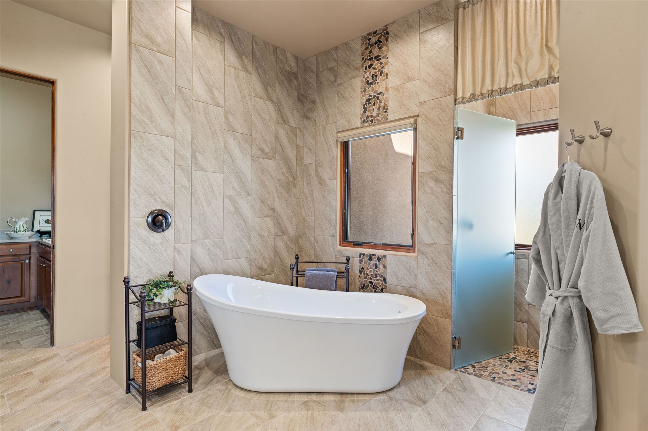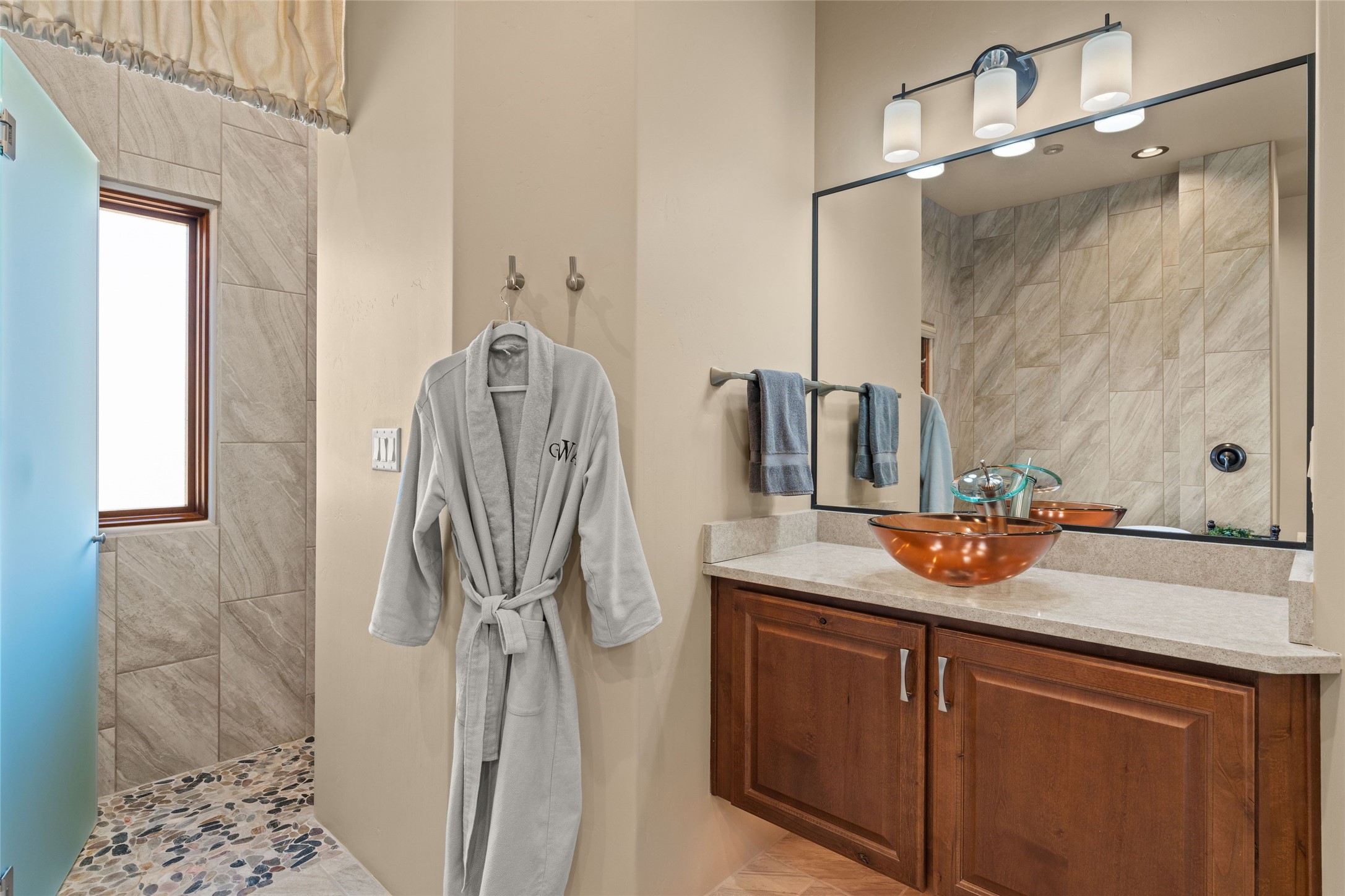 This contemporary Pueblo-style 3-bedroom residence located on nearly 2 acres in Las Campanas offers both elegant design and a setting selected to maximize the views and privacy. Built in 2016, the single level floorpan is ideal with two guest suites and an office opposite the house from a generous primary bedroom. The main living area is replete with 15-foot ceilings and nearly floor-to-ceiling glass doors that frame the dynamic panorama of the Sangre de Cristo Mountains. When the doors are pocketed fully into the wall, the dramatic, open concept living/dining/kitchen area flows seamlessly into a large portal and beautifully planted walled courtyard. This is a house built to enjoy a perfect summer evening. The sleek and modern kitchen includes an ample walk-in pantry, Jenn-Aire stainless steel appliances, a 6-burner gas cooktop and a bar level eat-in counter. The airy master bedroom suite captures mountain views to be enjoyed in a secluded sitting area with a raised hearth fireplace. The primary bathroom and closet are spacious and refined. With a 3-car garage, a private lot, no steps, a thoughtful floor plan and modern amenities, 63 Thundercloud lacks for nothing.