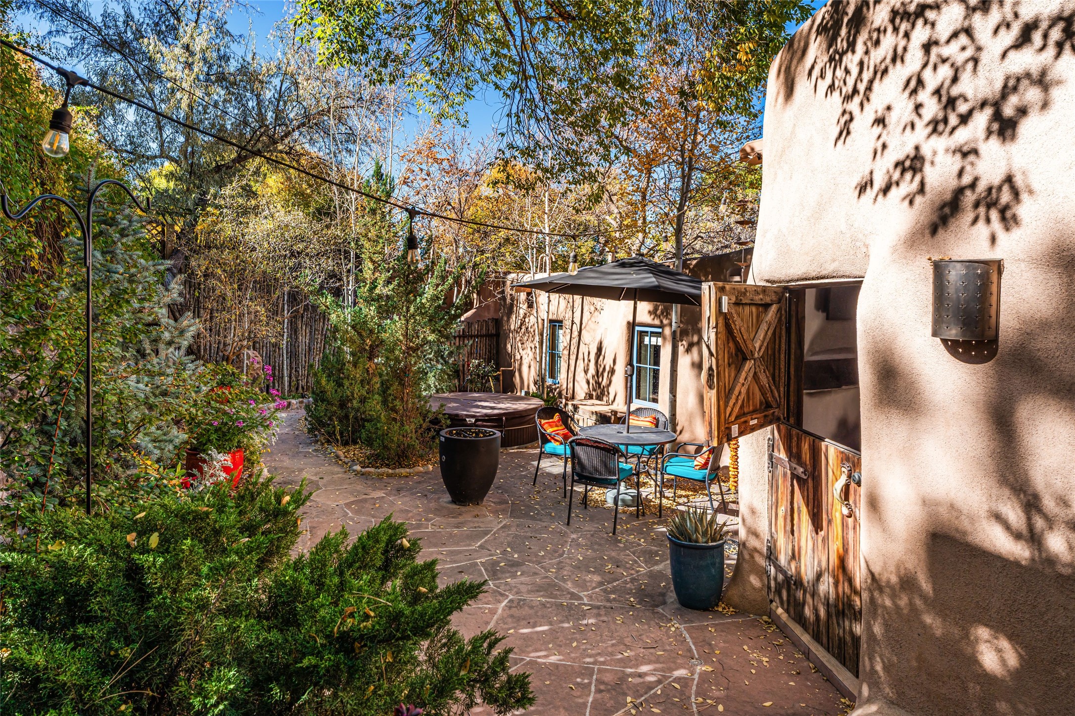 The history of Canyon Road is alive in the artisanal character of these two, Santa Fe classics. This successful Short Term Rental, set on a double lot, offers parking and storage in a desirable setting close to Patrick Smith Park. Each unique residence has been remodeled to a modern standard of comfort yet retains the imprint of its storied past. The back house, said to have started as a stable and tack shop in the early 1800s, has an Acequia Madre address and a dedicated parking spot at the top of a wooden staircase. A flagstone path and patio, with space for dining, a hot tub and a manageable dash of greenery, borders the home. The ceramic artwork of artist and former owner, Patricia Hoback, adds delightful dimension to both properties. The front house, rumored to have been a dance hall in the late 1800s, was Hoback's gallery. Between the two structures is a sheltered patio for alfresco meals and outdoor leisure, a Hoback artwork winking down from the wall. Enjoy the two dwellings for yourself, rent one for offset income, or rent both for maximum investment return. Buyers seeking history, authentic quality, and flexibility in the walkable heart of the Historic Eastside need look no further than this charismatic duet.