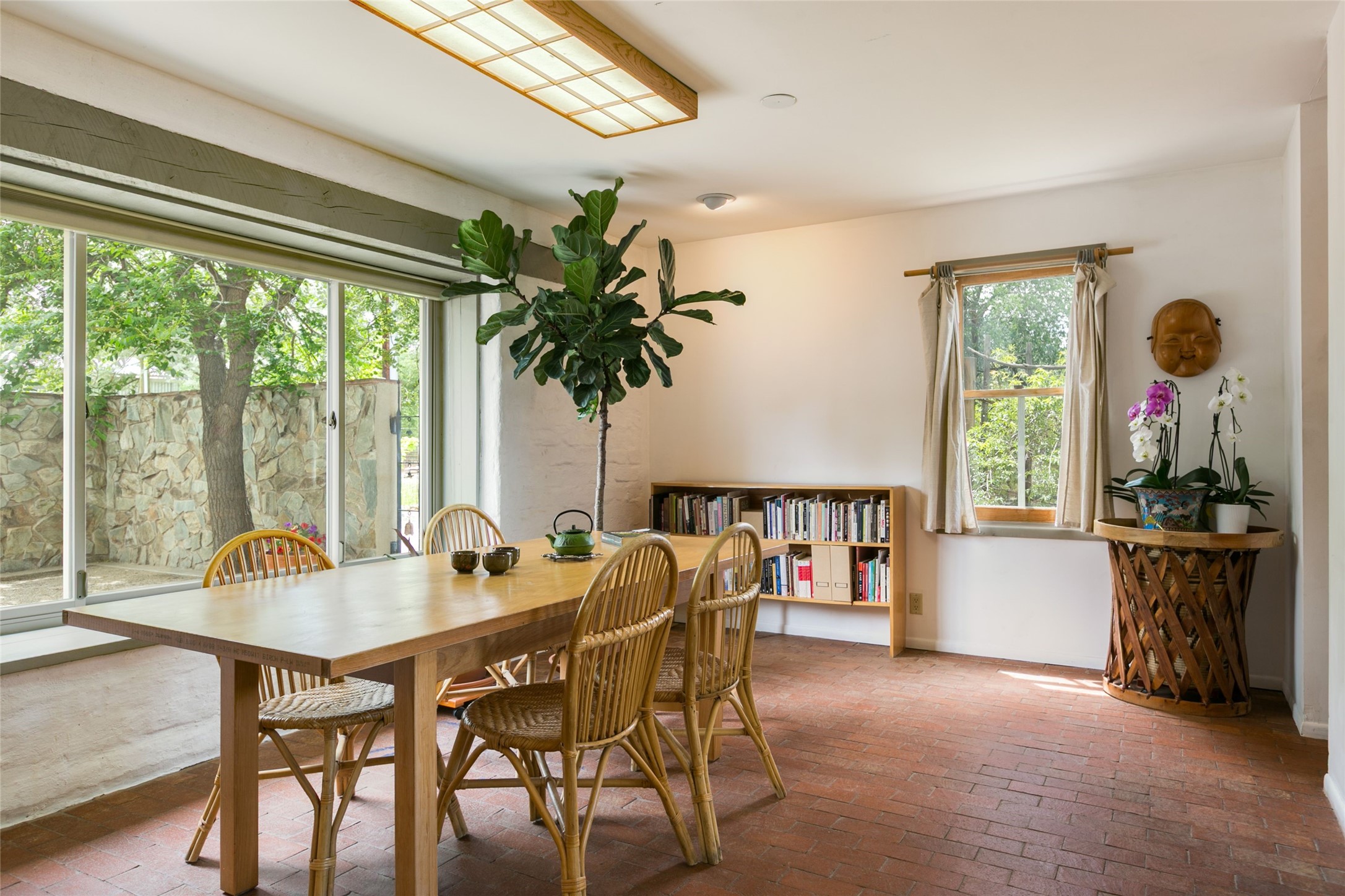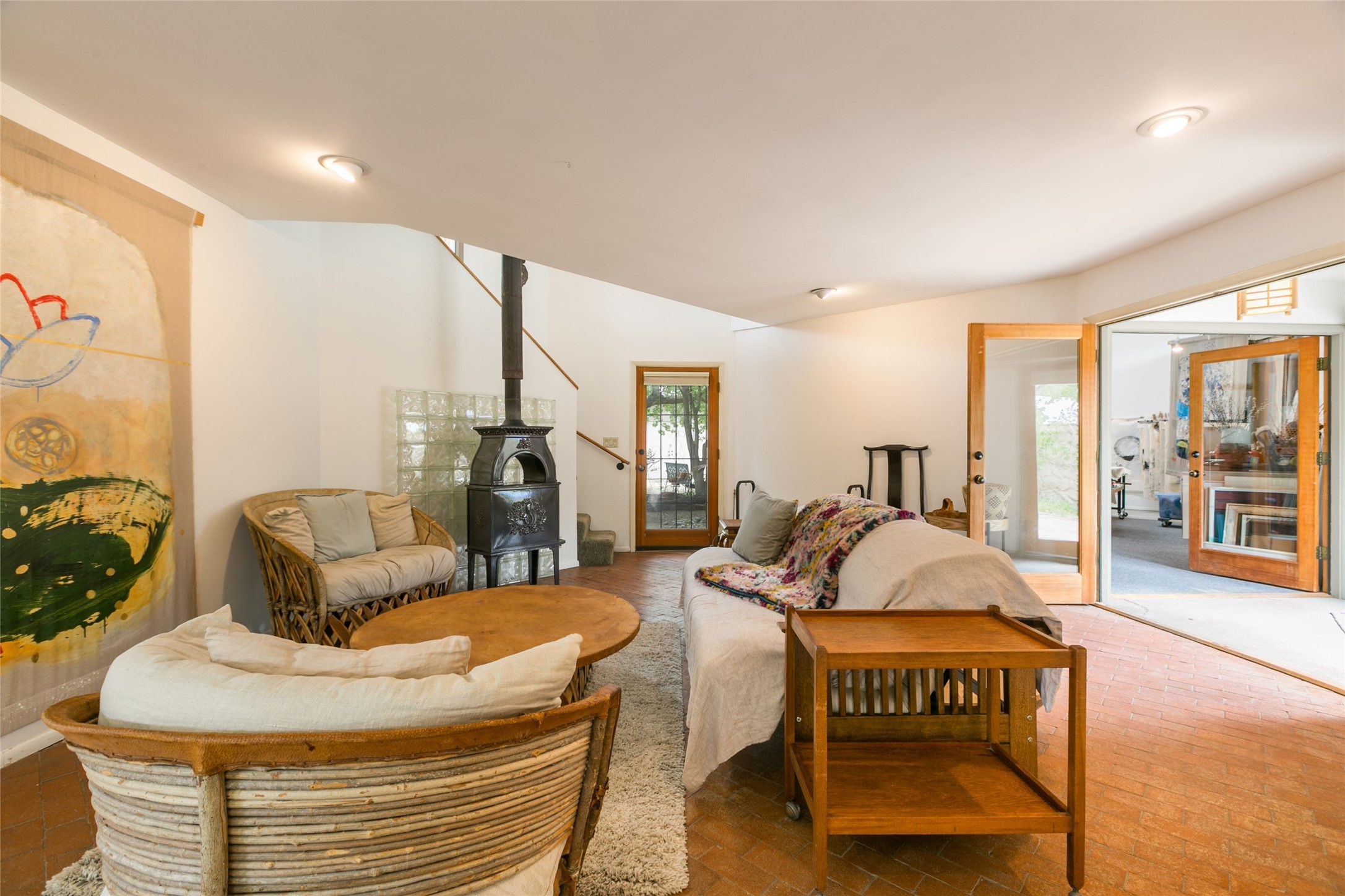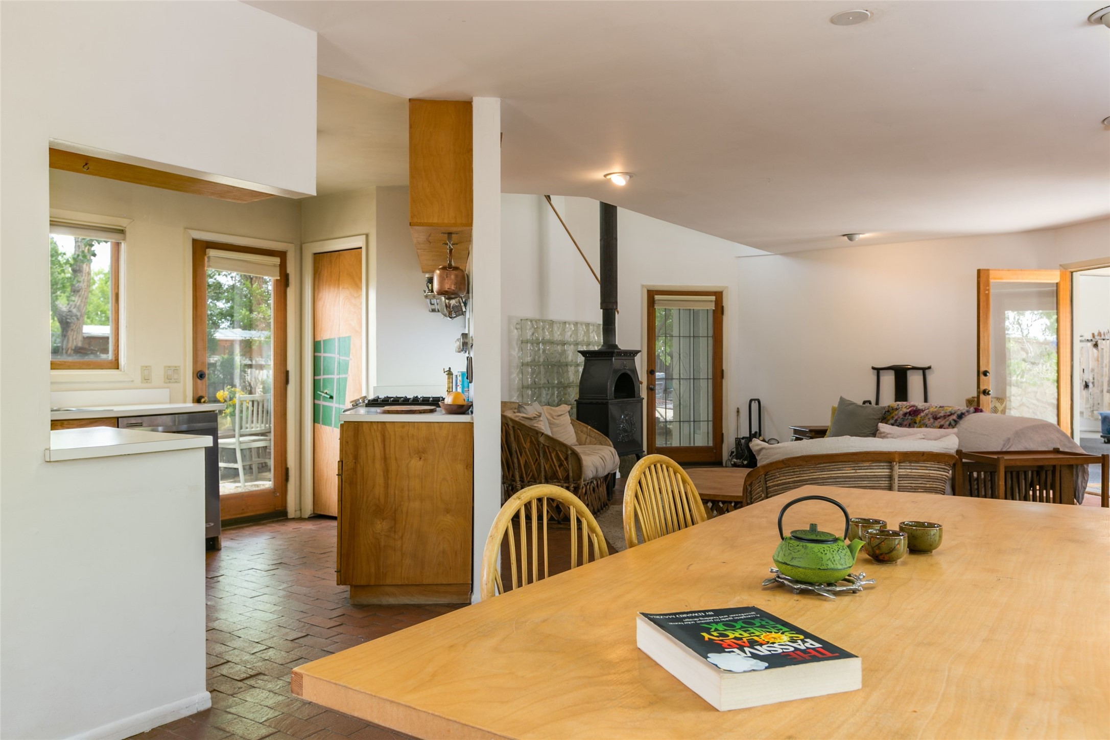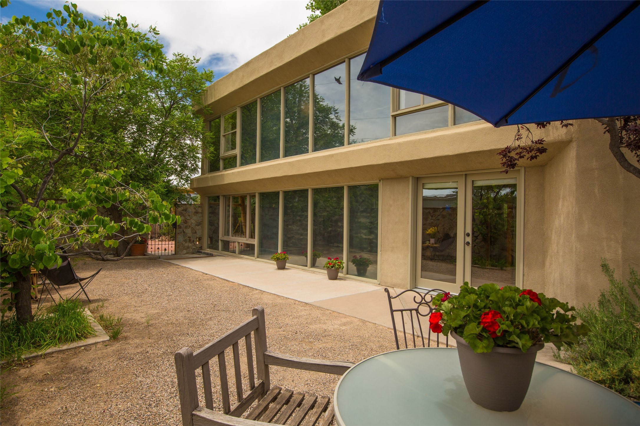 Artist's Sanctuary near the Nature Center, designed in 1982 by renowned solar architects Ed Mazria and Ric Schalk. This unique passive solar adobe home, blends sustainability with artistic inspiration. The thoughtfully positioned adobe Trombe walls keep it warm in winter and cool in summer. A high-efficiency Danish wood stove adds warmth on cold days. The great room has brick floors and opens to the outdoors, while a tucked-away kitchen overlooks mature cottonwoods. The spacious studio offers high ceilings and excellent light--ideal for creative work. Upstairs are two bedrooms and a full bath; the primary includes Japanese shoji screens that open to tranquil Bosque views. This is a one-of-a-kind, peaceful retreat--perfect for those seeking beauty, nature, inspiration and sustainability.