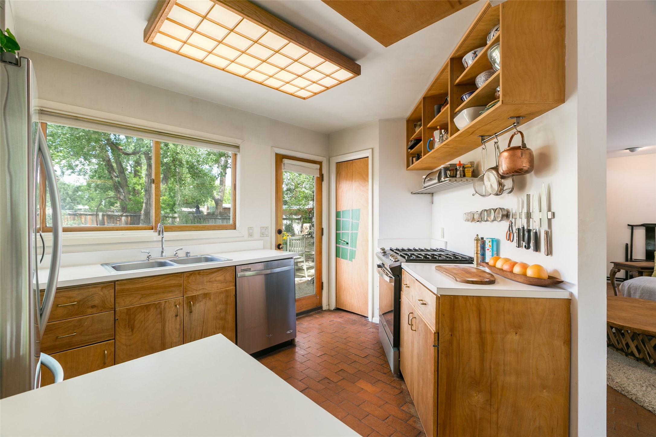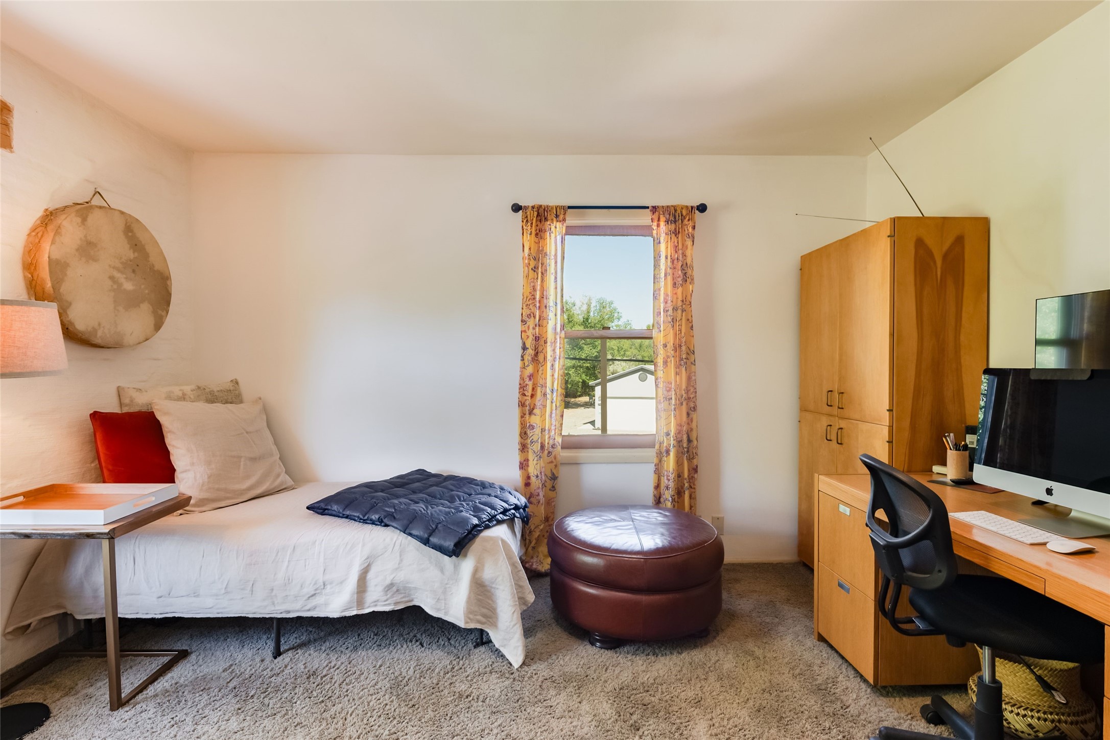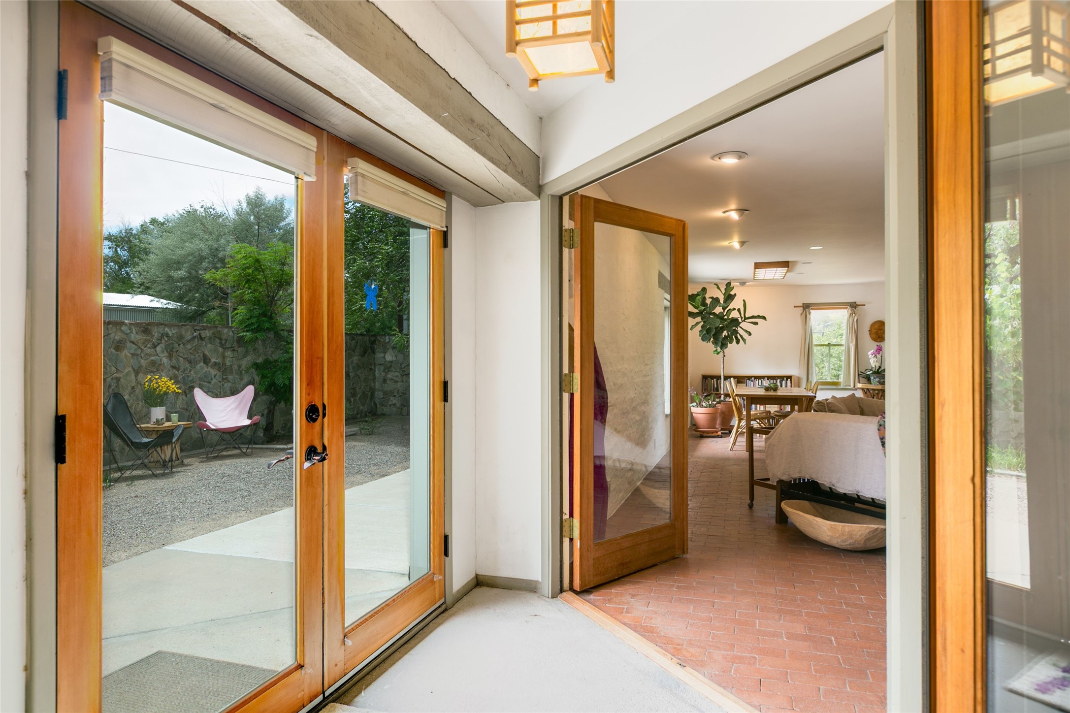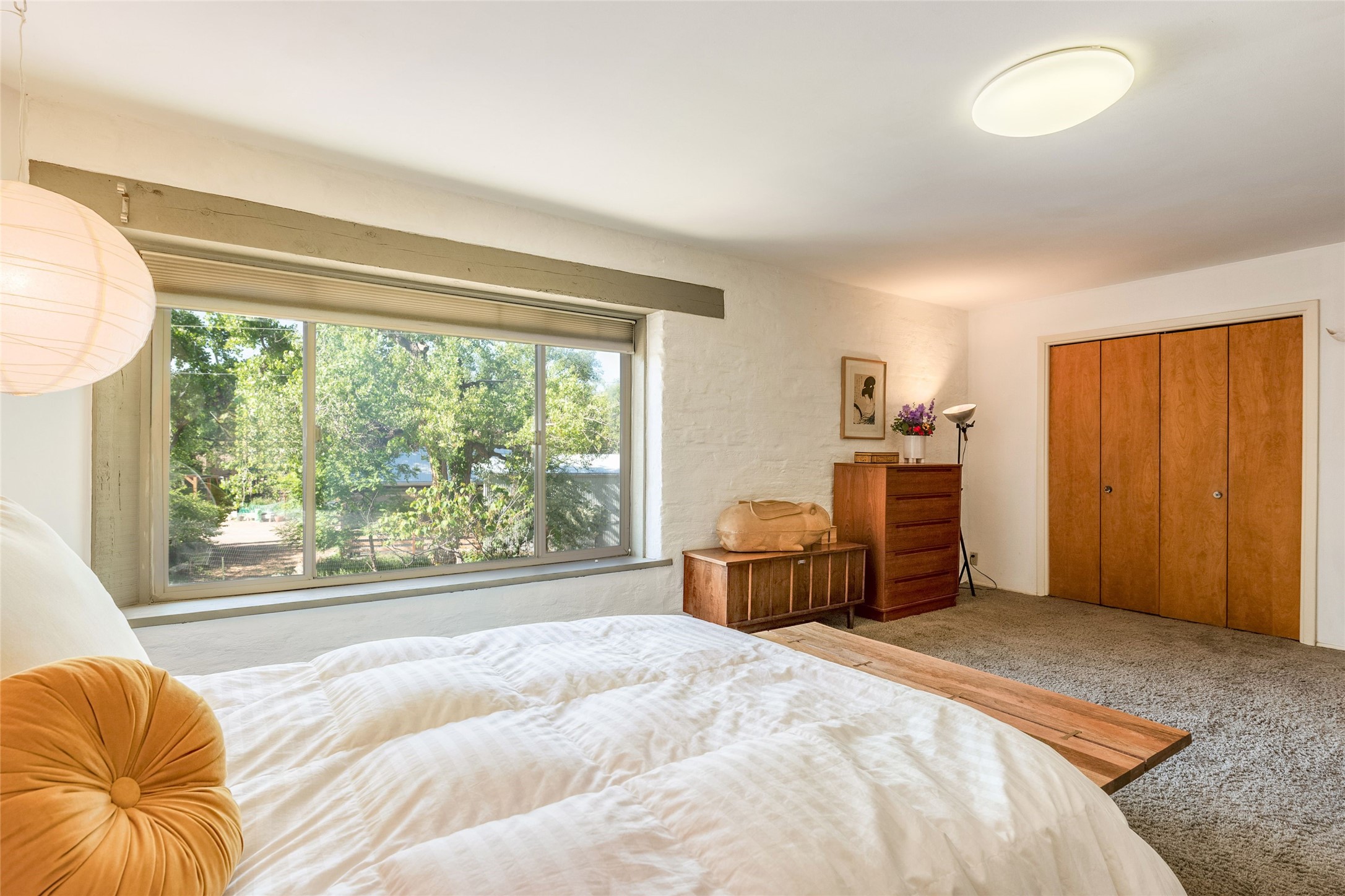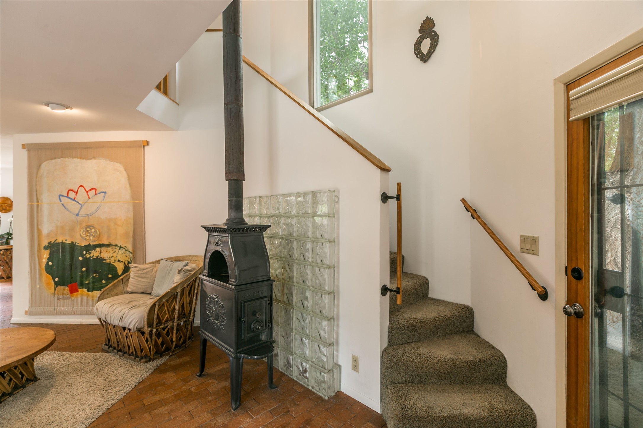 Artist's Sanctuary near the Nature Center, designed in 1982 by renowned solar architects Ed Mazria and Ric Schalk. This unique passive solar adobe home, blends sustainability with artistic inspiration. The thoughtfully positioned adobe Trombe walls keep it warm in winter and cool in summer. A high-efficiency Danish wood stove adds warmth on cold days. The great room has brick floors and opens to the outdoors, while a tucked-away kitchen overlooks mature cottonwoods. The spacious studio offers high ceilings and excellent light--ideal for creative work. Upstairs are two bedrooms and a full bath; the primary includes Japanese shoji screens that open to tranquil Bosque views. This is a one-of-a-kind, peaceful retreat--perfect for those seeking beauty, nature, inspiration and sustainability.