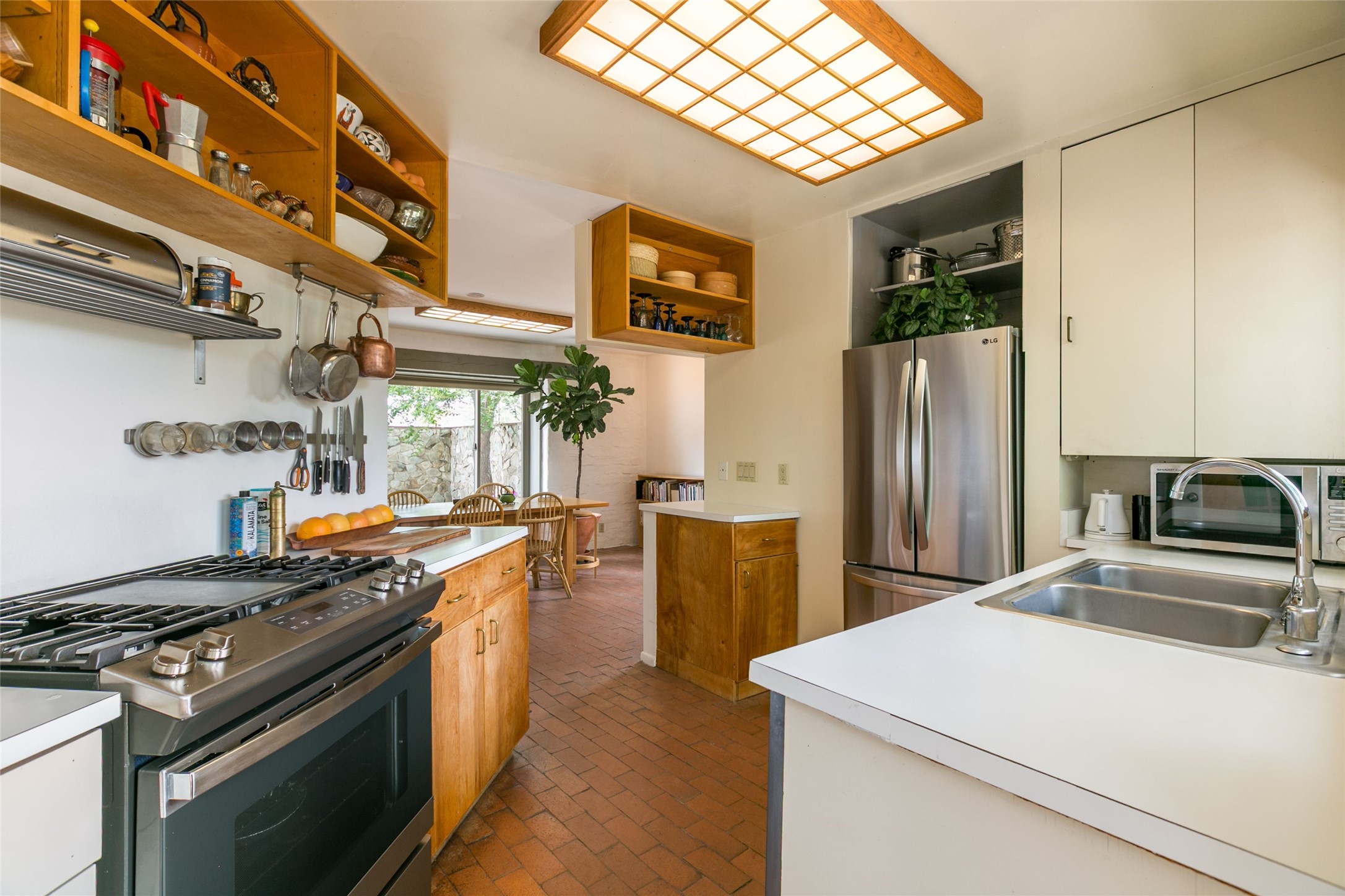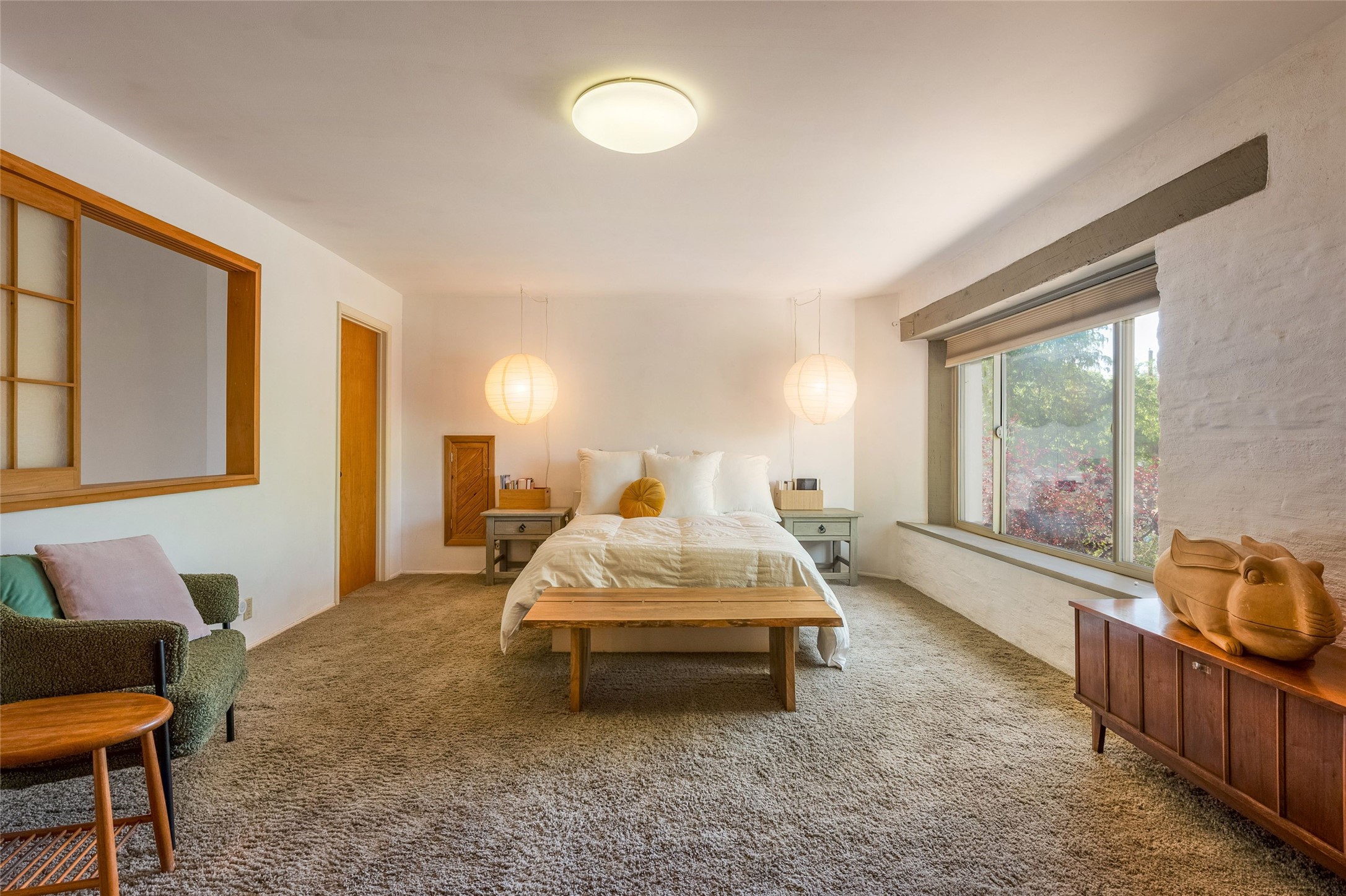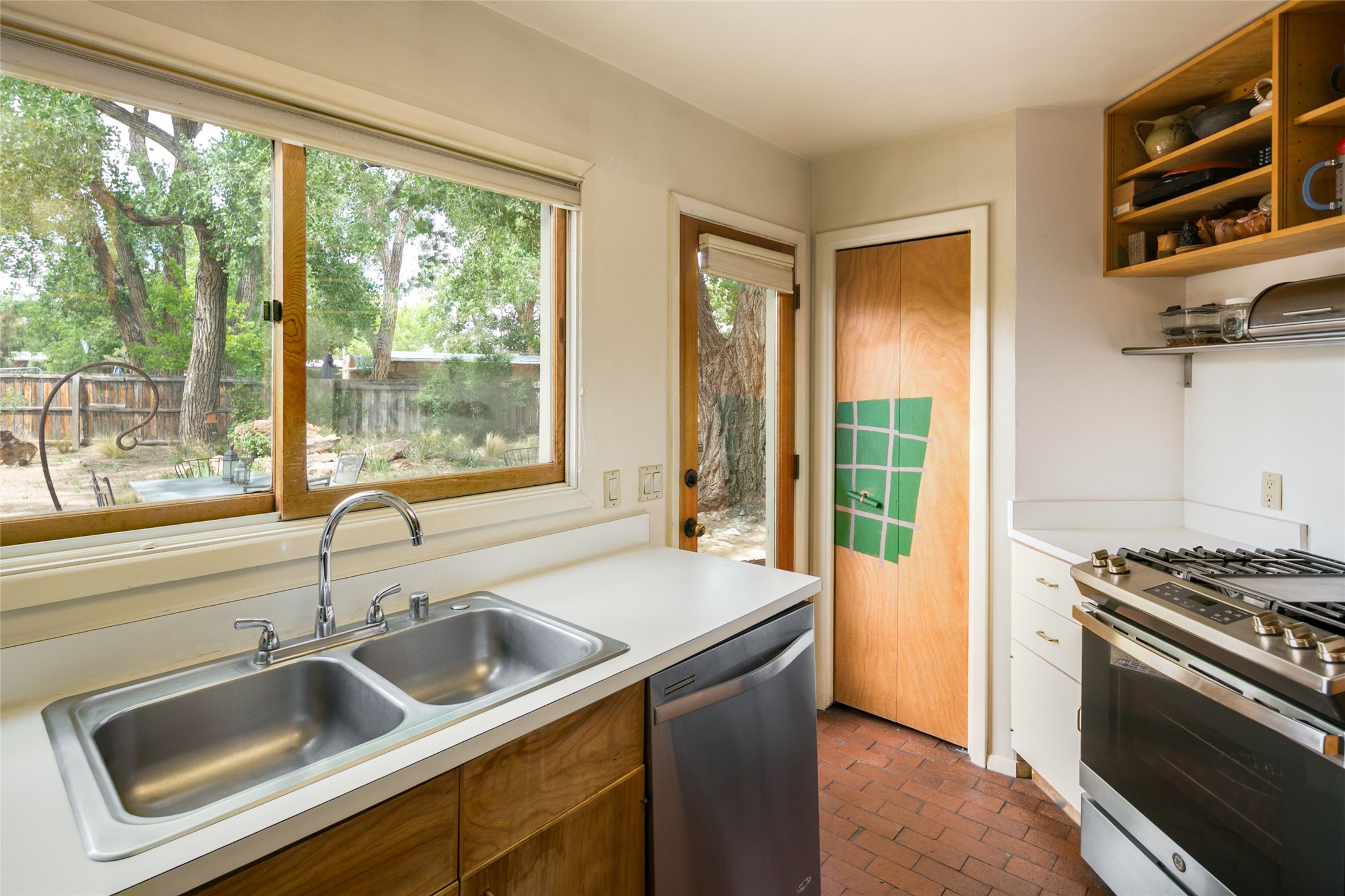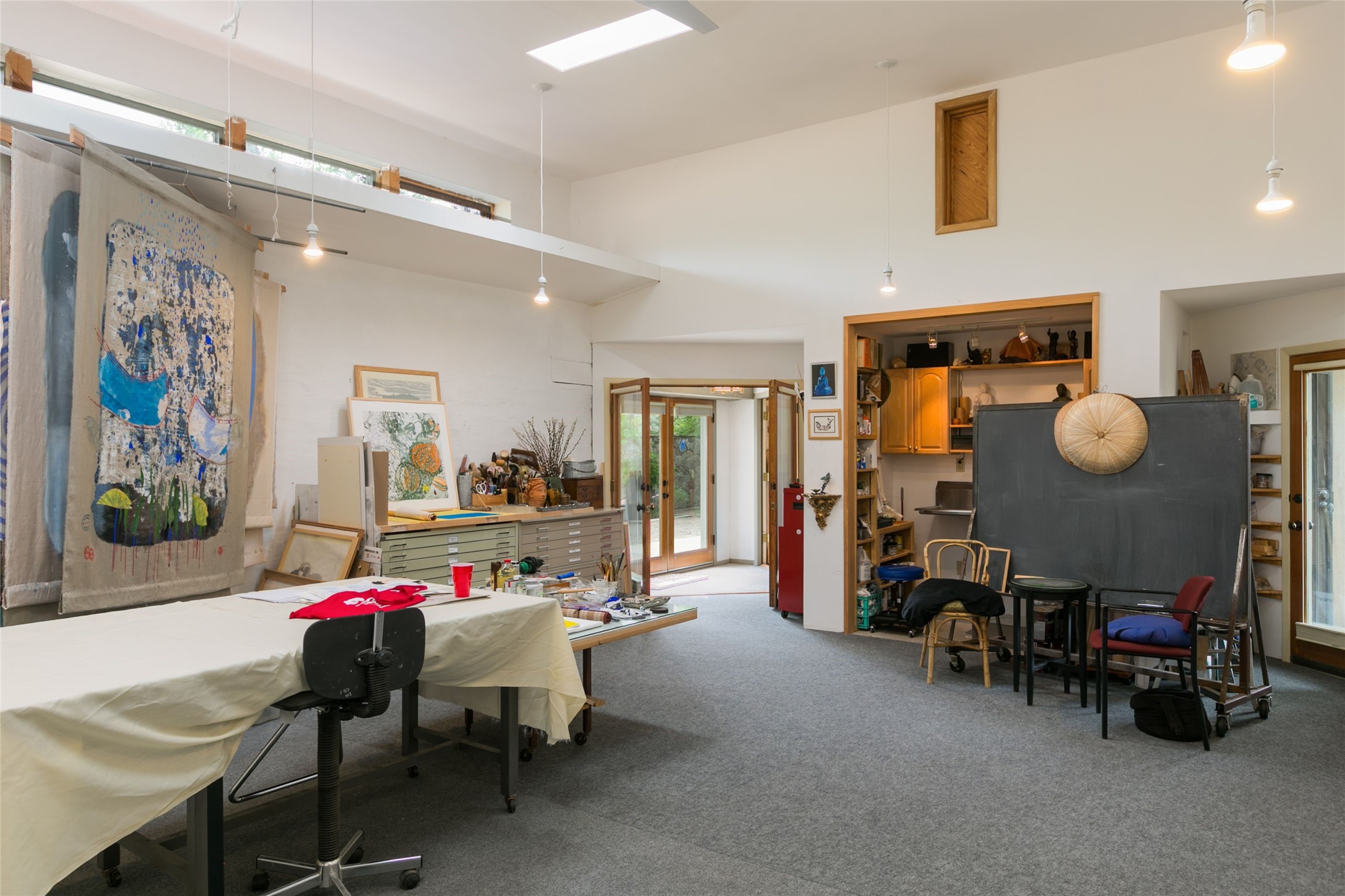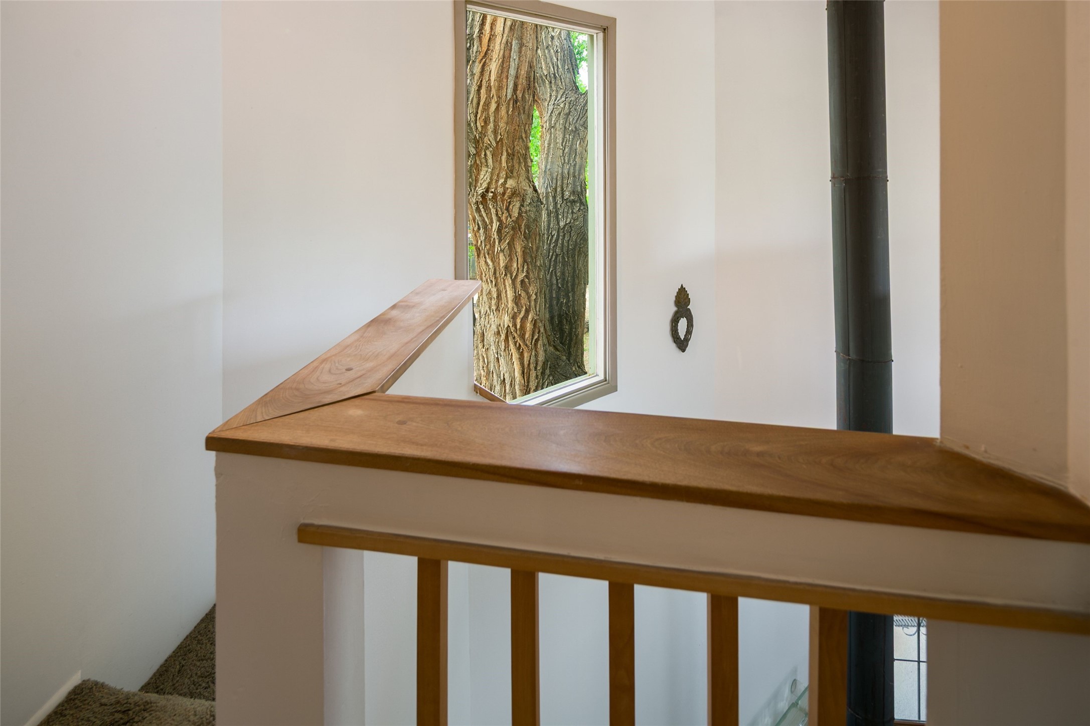 Artist's Sanctuary near the Nature Center, designed in 1982 by renowned solar architects Ed Mazria and Ric Schalk. This unique passive solar adobe home, blends sustainability with artistic inspiration. The thoughtfully positioned adobe Trombe walls keep it warm in winter and cool in summer. A high-efficiency Danish wood stove adds warmth on cold days. The great room has brick floors and opens to the outdoors, while a tucked-away kitchen overlooks mature cottonwoods. The spacious studio offers high ceilings and excellent light--ideal for creative work. Upstairs are two bedrooms and a full bath; the primary includes Japanese shoji screens that open to tranquil Bosque views. This is a one-of-a-kind, peaceful retreat--perfect for those seeking beauty, nature, inspiration and sustainability.