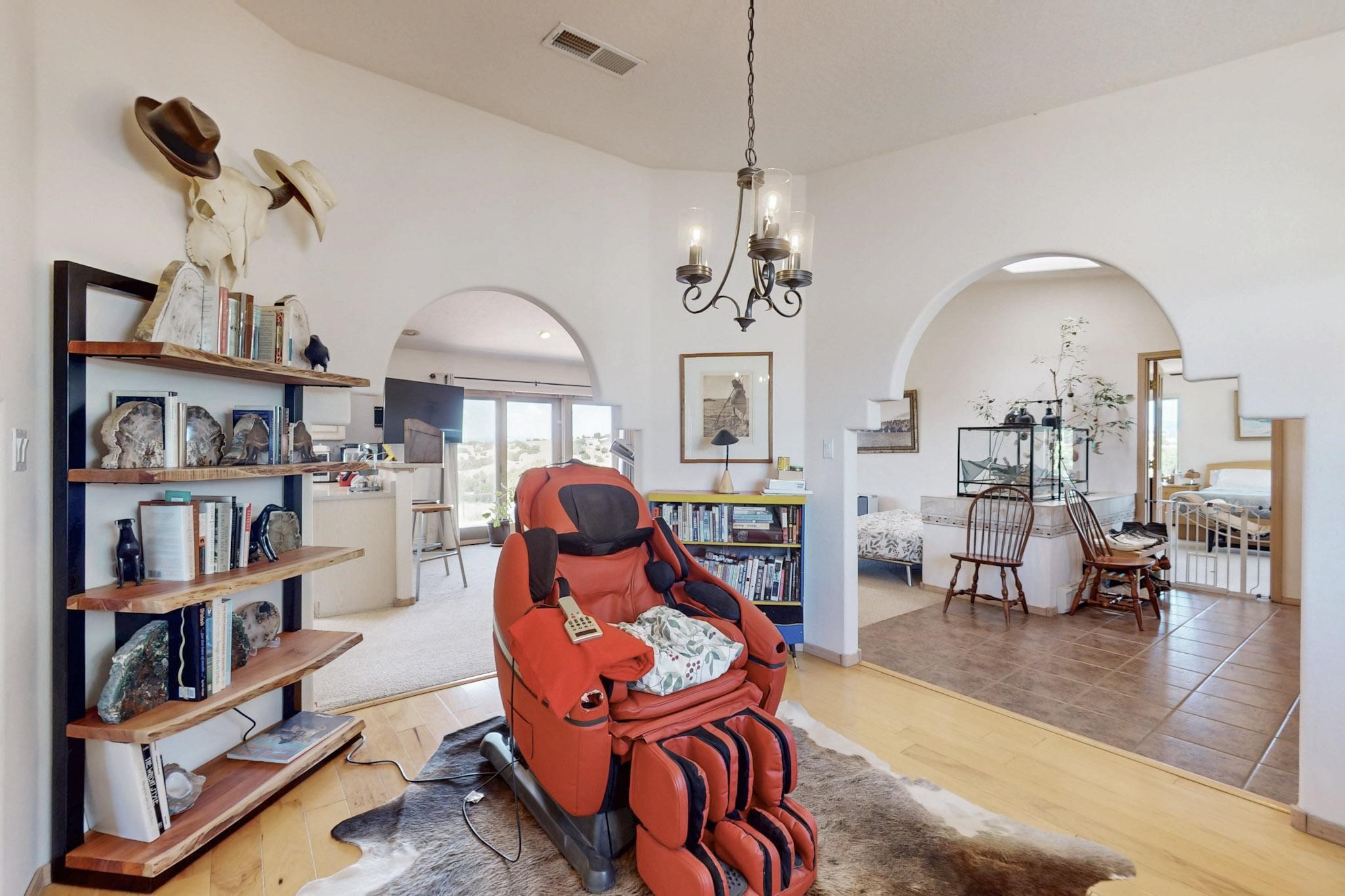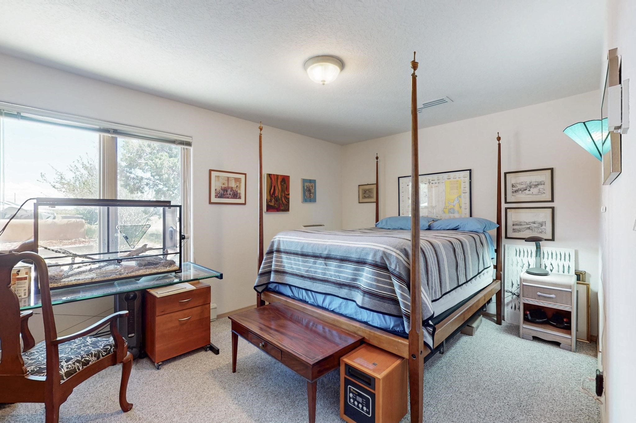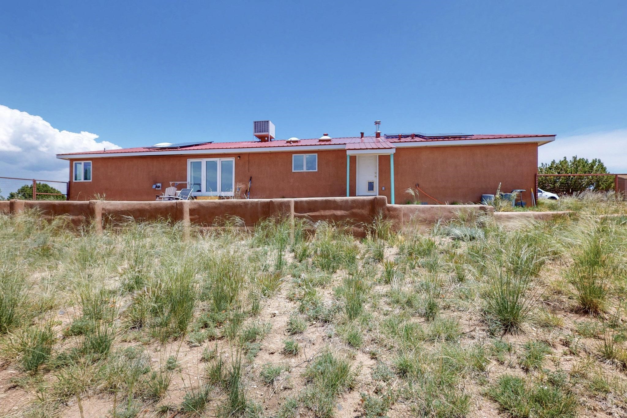 Pre-inspected and in excellent condition! Enjoy sunrises and sunsets on both patios at the Bluebird Ranch! This 2,270 sqft. home has 3 bedrooms, 2 bathrooms and 2 living areas. Larger windows, many skylights and tall ceilings that make it very bright and airy. The property is situated on 12.3 fully fenced acres on a paved road with unobstructed 360 views, fenced for dogs and/or horses or? Spacious and luxurious main BR with ensuite bathroom and huge walk in closet, completely energy efficient; newer, owned solar; NM Surf terrestrial internet service. Private, sweet water well that produces 18 gpm; metal hay barn with attached 7ft. hay corral; storage shed plus wide and tall RV storage barn; close to Bonanza horse Hospital. Many Junipers and no cactus. Make this rural ranch style electric gated property yours! 4 goats resident on the property that maintain the landscaping!!