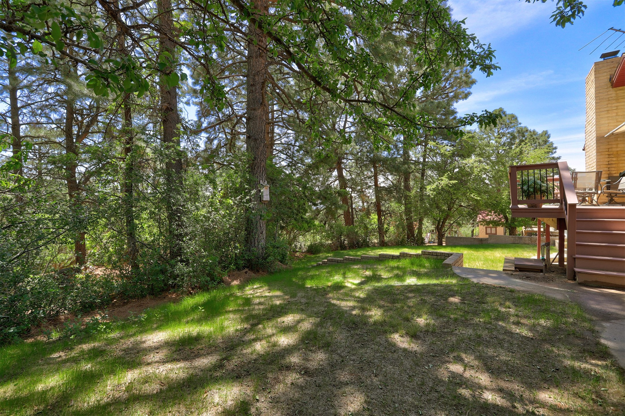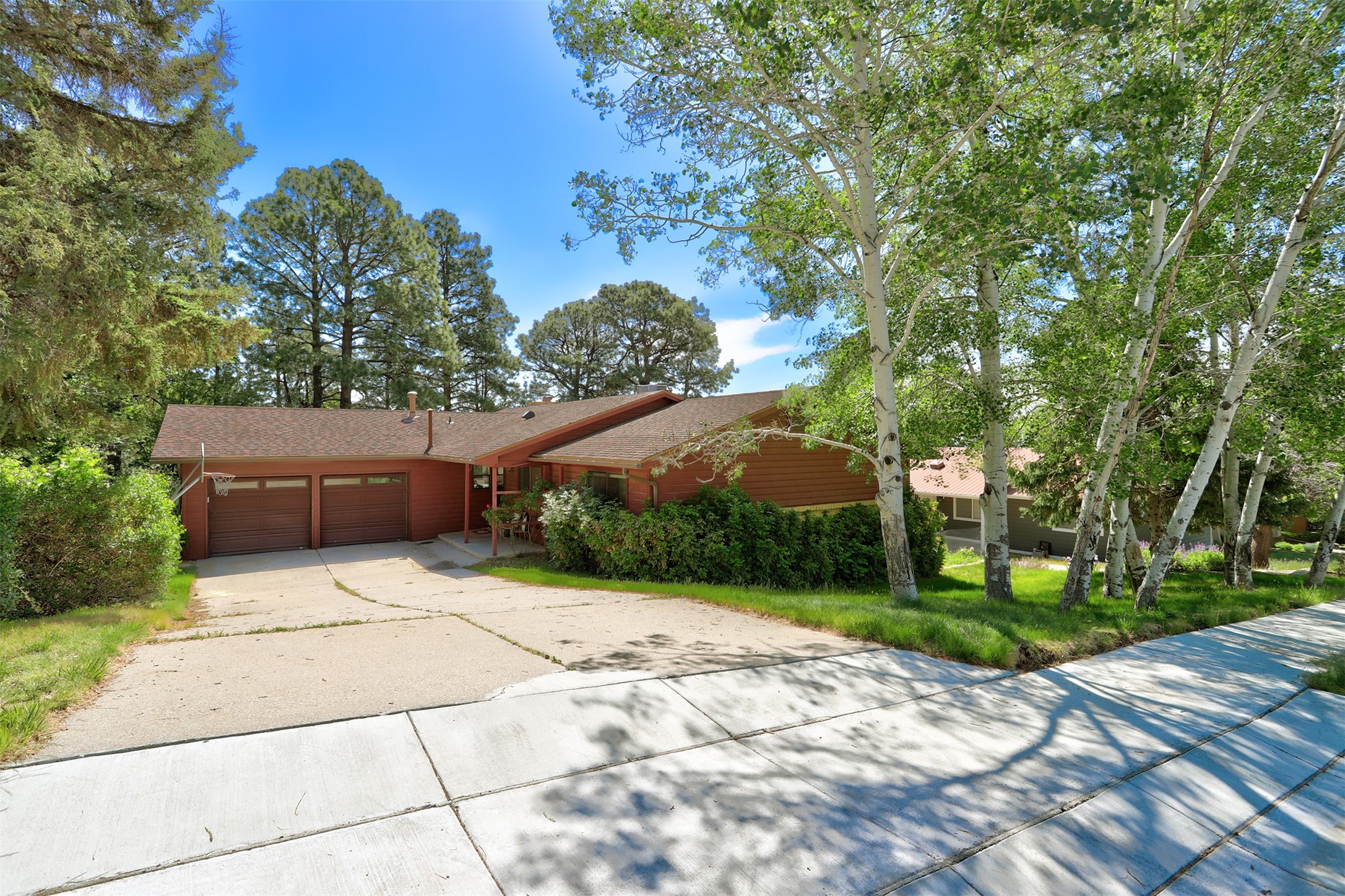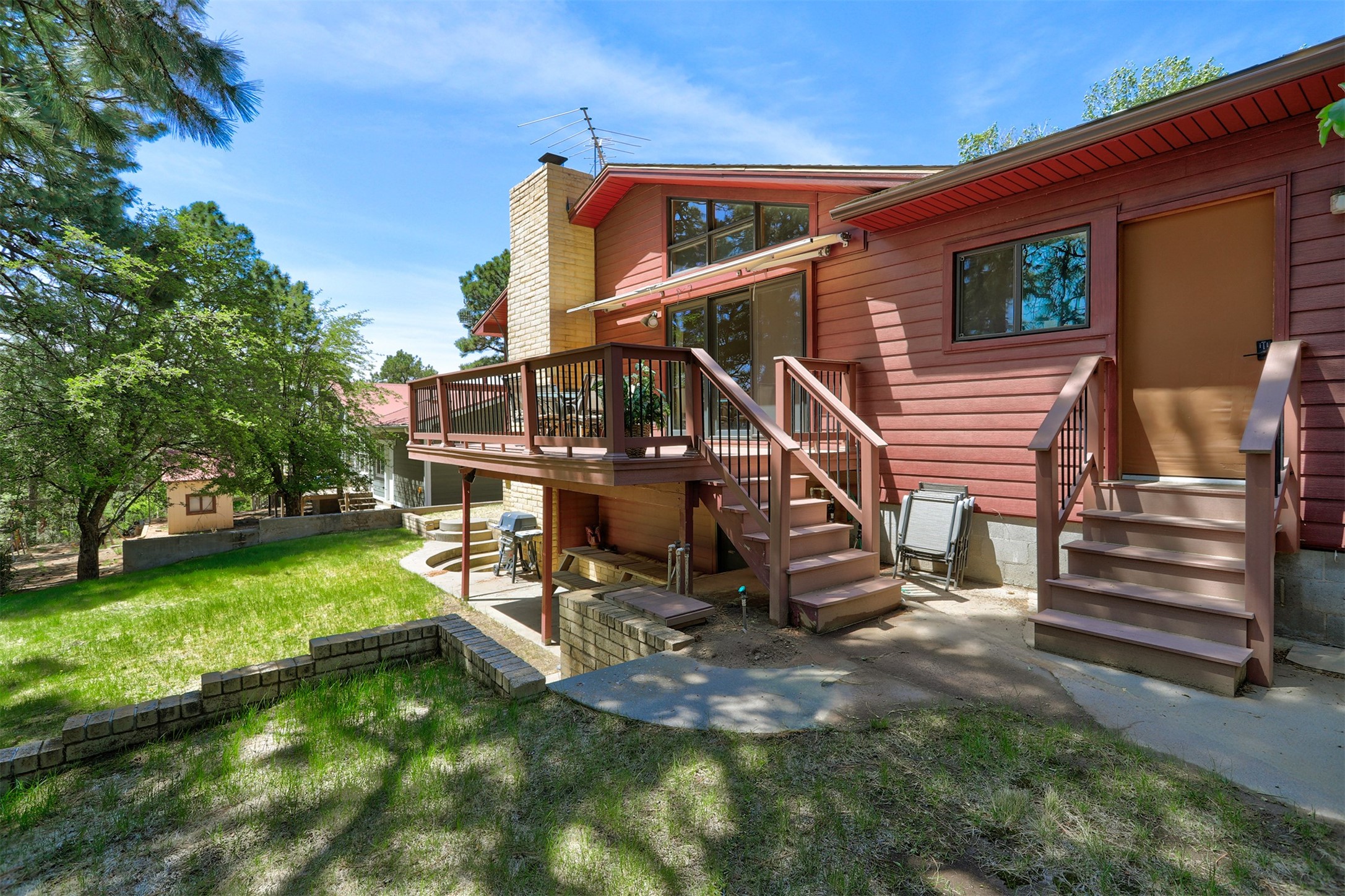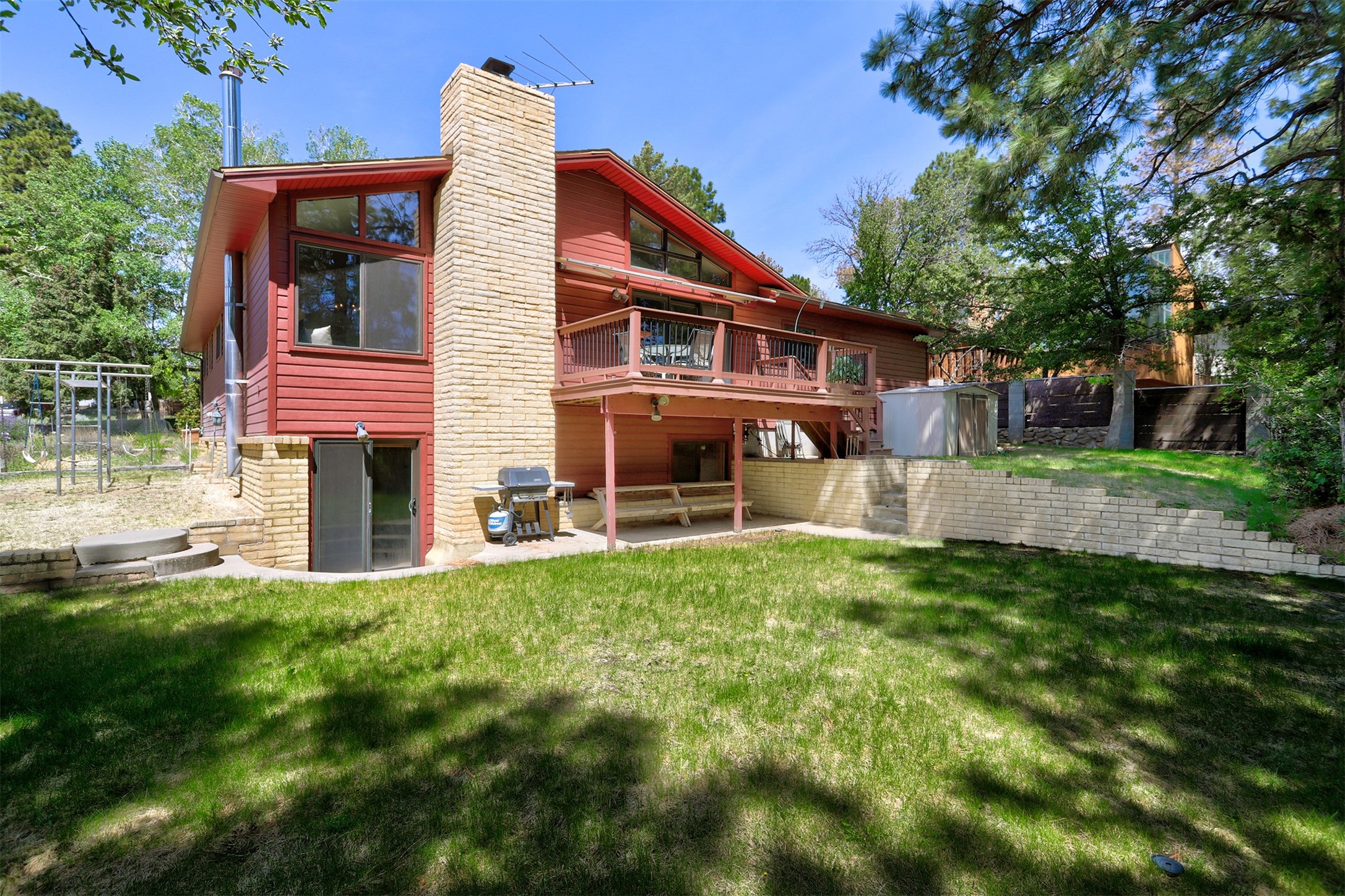 Nestled in the desirable North Mesa neighborhood, this exceptional two-story home offers privacy, natural beauty, and spacious living. Backed directly to the canyon, the property provides an unparalleled sense of peace and open space right from your backyard. The main level welcomes you with a beautifully updated kitchen, featuring maple cabinetry, granite countertops, double ovens, and ample storage perfect for culinary enthusiasts and family gatherings. Just off the dining room, step onto a charming outdoor porch where you can enjoy quiet mornings and evenings with forest views. The living room is a warm and inviting space, anchored by a dramatic floor-to-ceiling moss rock fireplace and framed by large picture windows that showcase the surrounding trees and greenery. This level also includes four comfortable bedrooms, a full hall bathroom, a designated laundry room, and convenient access to the attached two-car garage. Air conditioning keeps this main living area cool and comfortable year-round. Downstairs, you'll find a second expansive family room with striking Philippine mahogany ceilings and a versatile wet bar or kitchenette ideal for entertaining or multi-generational living. Two additional bedrooms provide flexible space, each outfitted with rich Mansonia African walnut cabinetry, and one featuring gorgeous Iroko African teak wall paneling. A large bathroom with double vanities and a jetted tub serves this level. Two spacious storage areas offer plenty of room for organization, one of which was previously used as a workshop. A dedicated wine cellar adds a special touch for collectors and connoisseurs. Outside, the lush, green backyard feels endless as it seamlessly blends into the bordering canyon. Furthermore, metal-clad siding offers durability and low maintenance exterior. With its stunning natural setting and thoughtfully designed interior, this unique property is a true North Mesa gem. Schedule a private showing today.