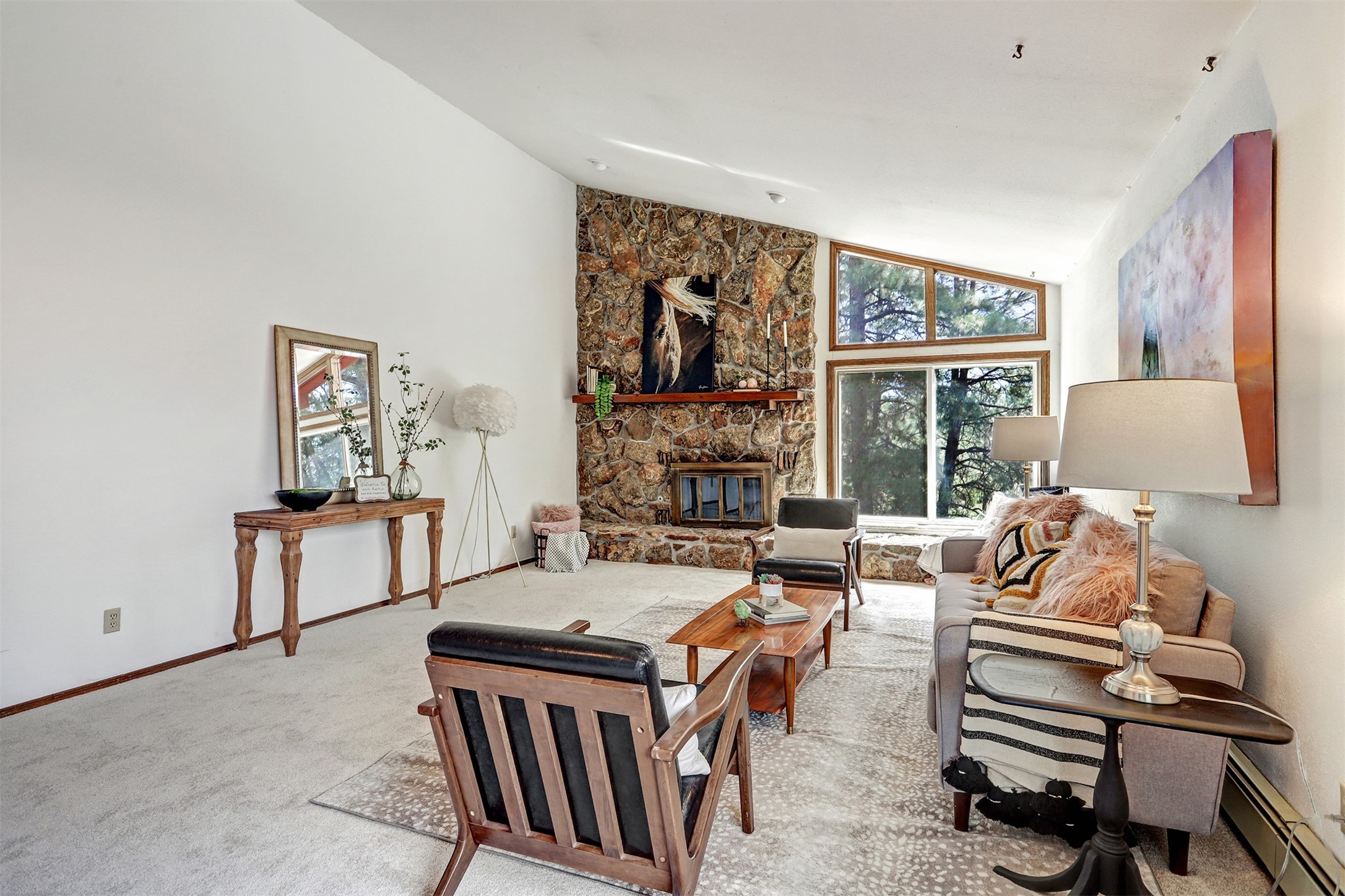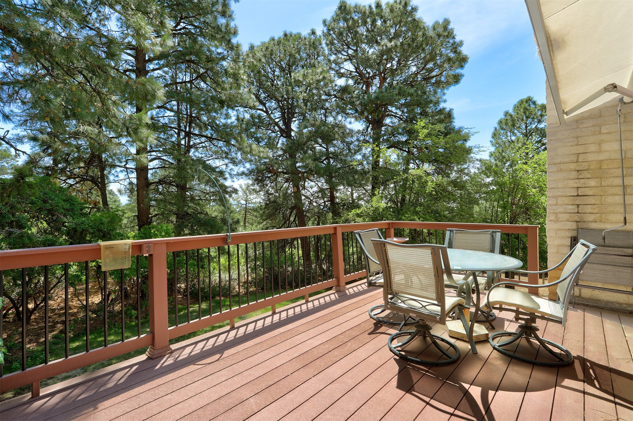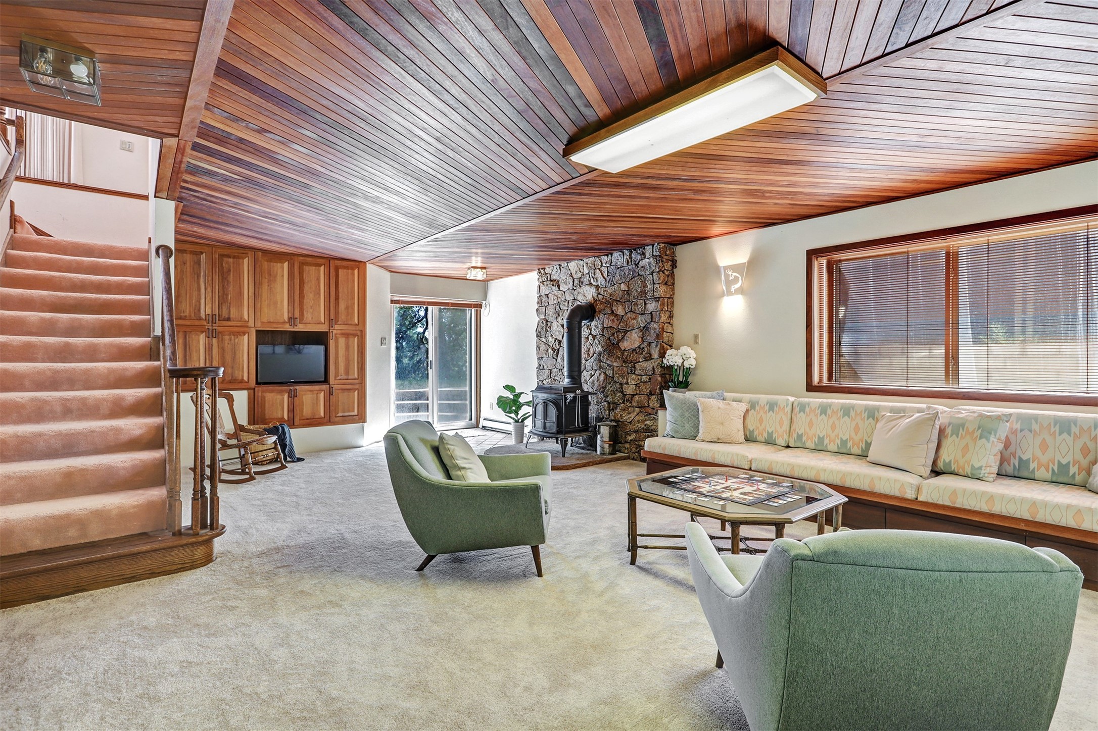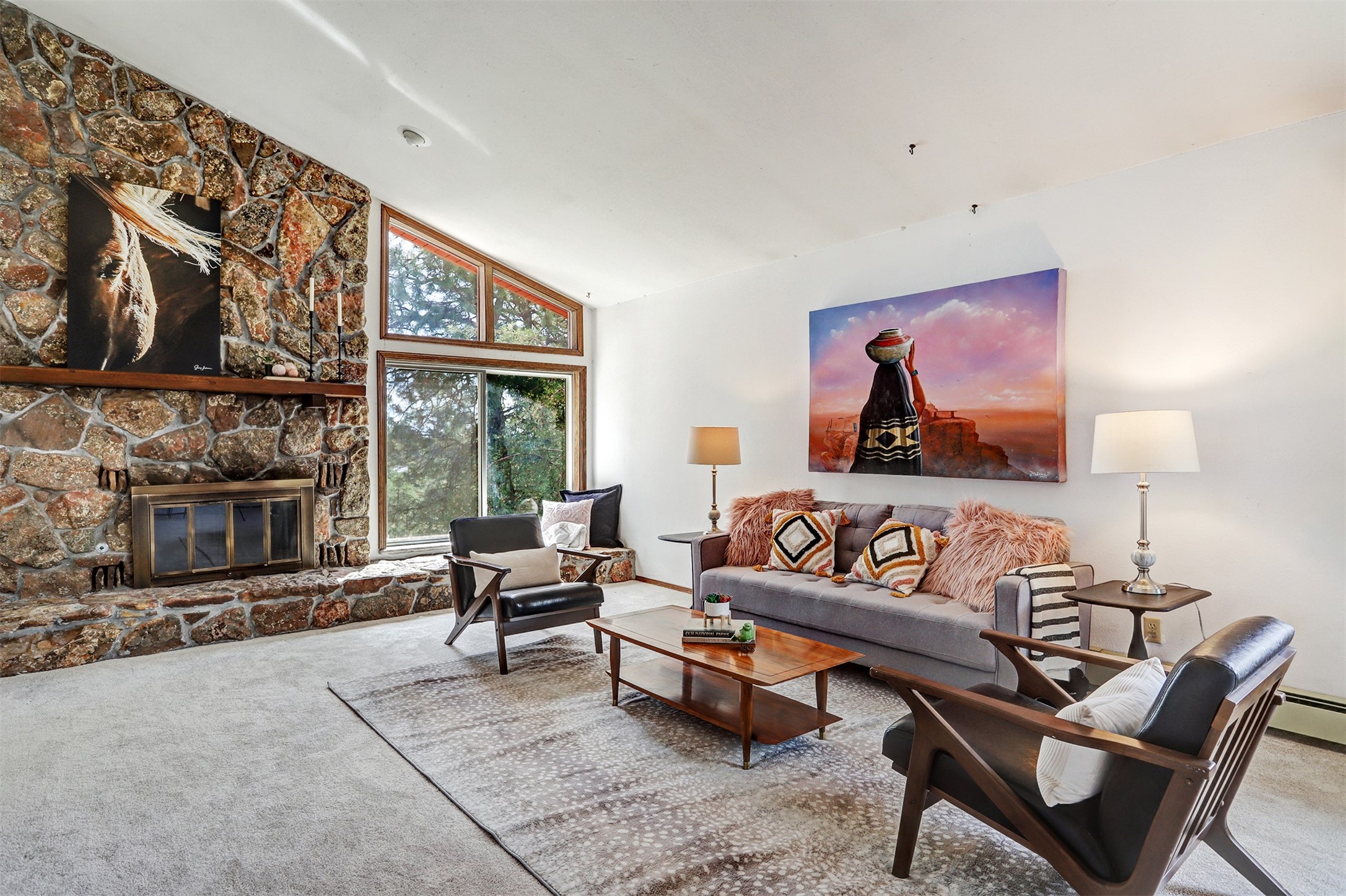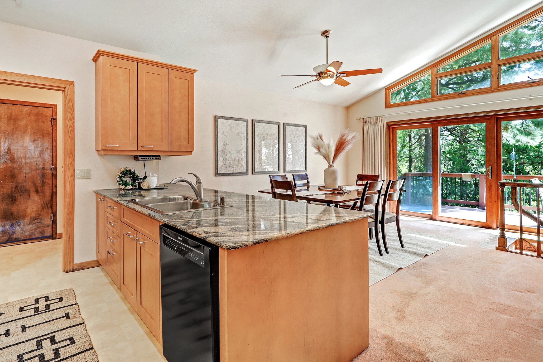 Nestled in the desirable North Mesa neighborhood, this exceptional two-story home offers privacy, natural beauty, and spacious living. Backed directly to the canyon, the property provides an unparalleled sense of peace and open space right from your backyard. The main level welcomes you with a beautifully updated kitchen, featuring maple cabinetry, granite countertops, double ovens, and ample storage perfect for culinary enthusiasts and family gatherings. Just off the dining room, step onto a charming outdoor porch where you can enjoy quiet mornings and evenings with forest views. The living room is a warm and inviting space, anchored by a dramatic floor-to-ceiling moss rock fireplace and framed by large picture windows that showcase the surrounding trees and greenery. This level also includes four comfortable bedrooms, a full hall bathroom, a designated laundry room, and convenient access to the attached two-car garage. Air conditioning keeps this main living area cool and comfortable year-round. Downstairs, you'll find a second expansive family room with striking Philippine mahogany ceilings and a versatile wet bar or kitchenette ideal for entertaining or multi-generational living. Two additional bedrooms provide flexible space, each outfitted with rich Mansonia African walnut cabinetry, and one featuring gorgeous Iroko African teak wall paneling. A large bathroom with double vanities and a jetted tub serves this level. Two spacious storage areas offer plenty of room for organization, one of which was previously used as a workshop. A dedicated wine cellar adds a special touch for collectors and connoisseurs. Outside, the lush, green backyard feels endless as it seamlessly blends into the bordering canyon. Furthermore, metal-clad siding offers durability and low maintenance exterior. With its stunning natural setting and thoughtfully designed interior, this unique property is a true North Mesa gem. Schedule a private showing today.