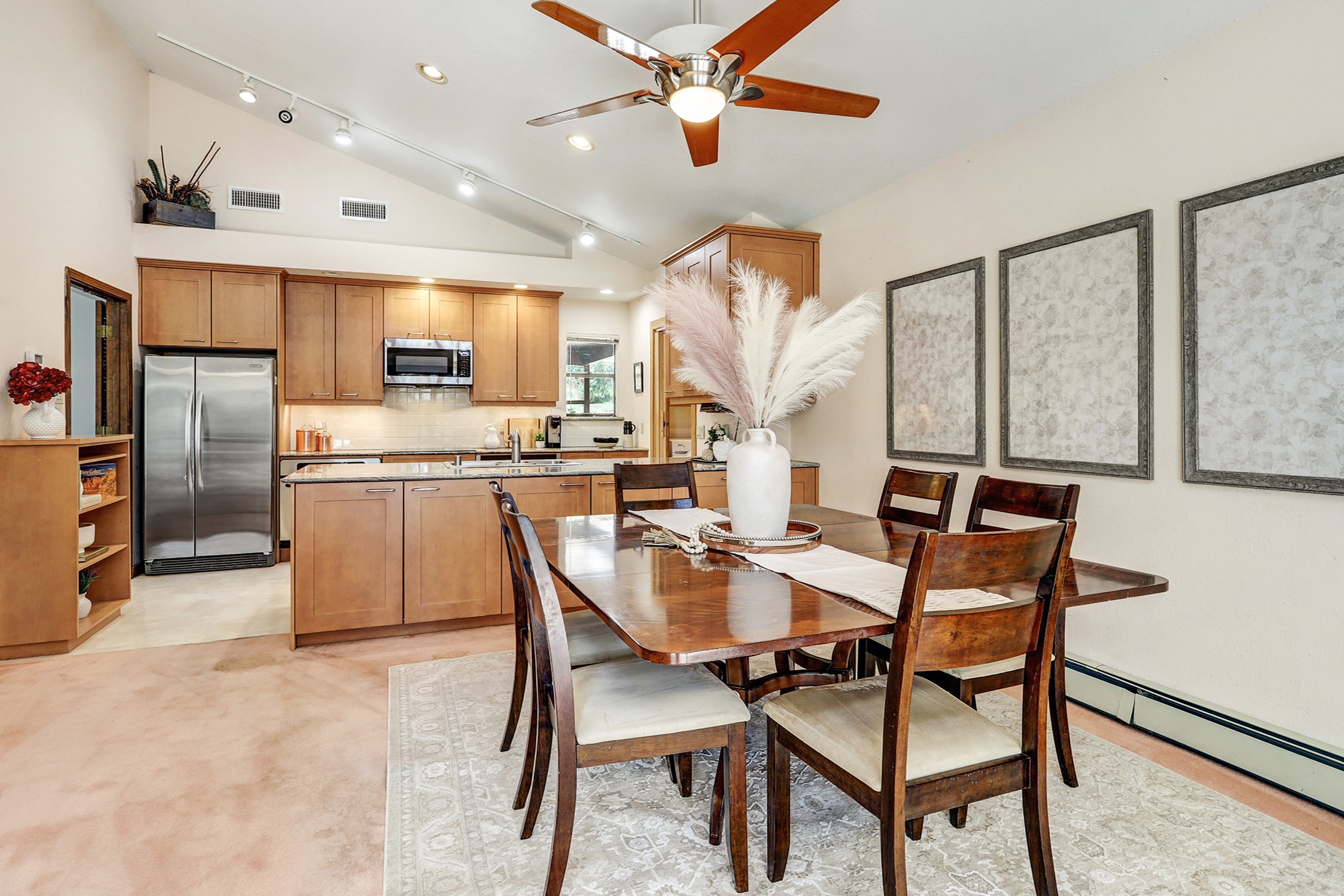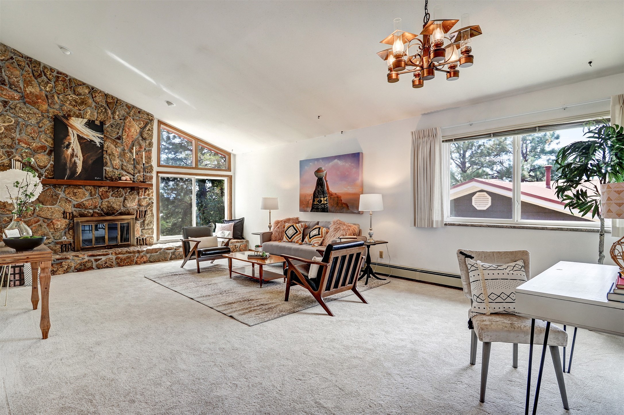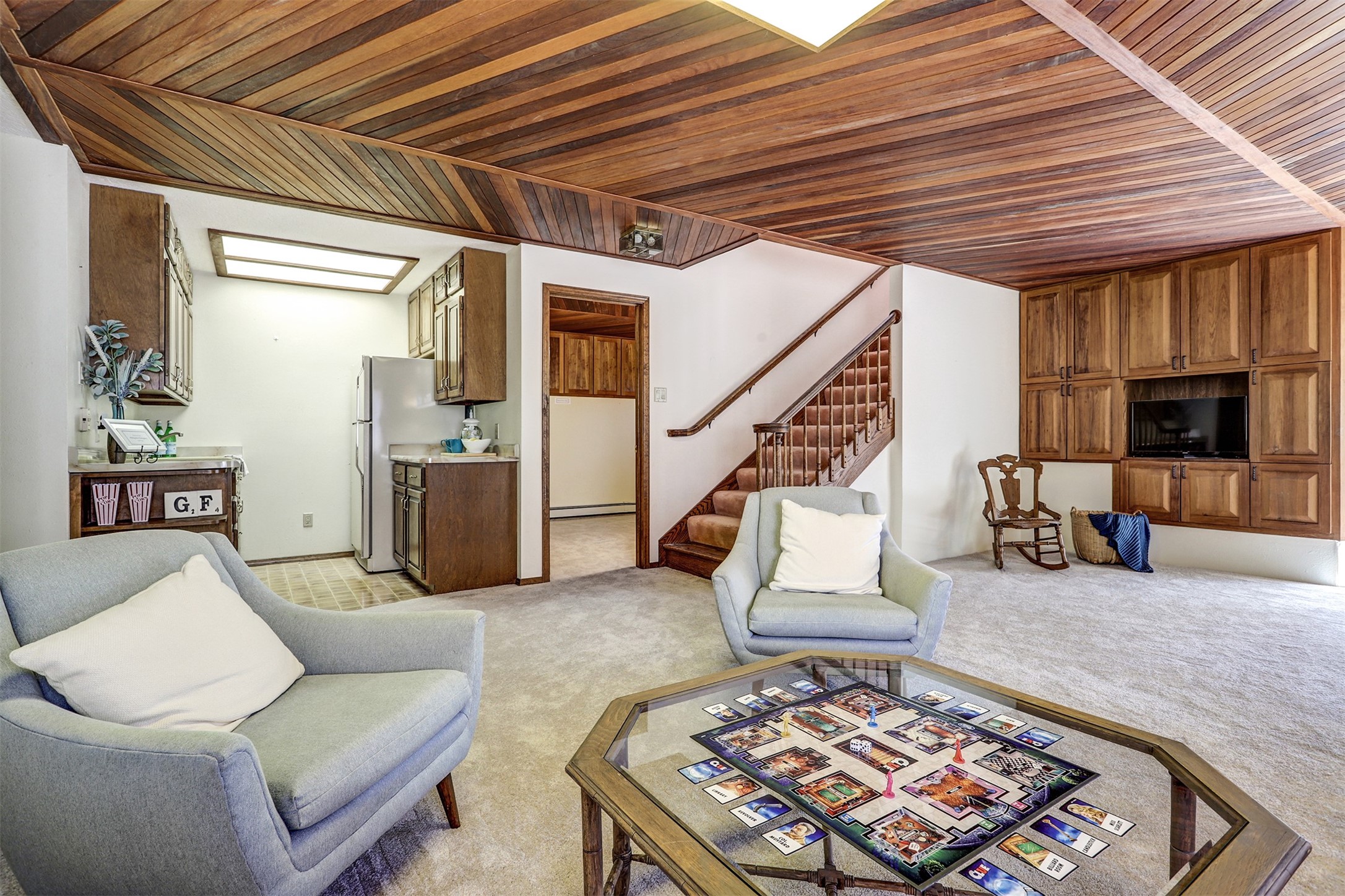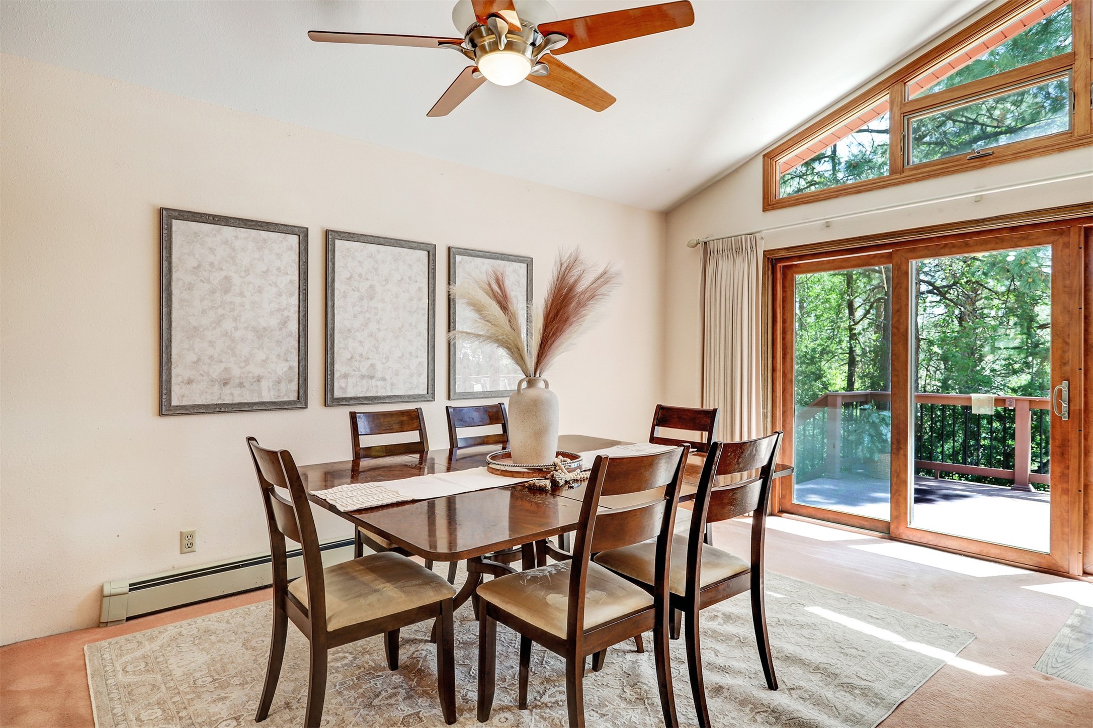 Nestled in the desirable North Mesa neighborhood, this exceptional two-story home offers privacy, natural beauty, and spacious living. Backed directly to the canyon, the property provides an unparalleled sense of peace and open space right from your backyard. The main level welcomes you with a beautifully updated kitchen, featuring maple cabinetry, granite countertops, double ovens, and ample storage perfect for culinary enthusiasts and family gatherings. Just off the dining room, step onto a charming outdoor porch where you can enjoy quiet mornings and evenings with forest views. The living room is a warm and inviting space, anchored by a dramatic floor-to-ceiling moss rock fireplace and framed by large picture windows that showcase the surrounding trees and greenery. This level also includes four comfortable bedrooms, a full hall bathroom, a designated laundry room, and convenient access to the attached two-car garage. Air conditioning keeps this main living area cool and comfortable year-round. Downstairs, you'll find a second expansive family room with striking Philippine mahogany ceilings and a versatile wet bar or kitchenette ideal for entertaining or multi-generational living. Two additional bedrooms provide flexible space, each outfitted with rich Mansonia African walnut cabinetry, and one featuring gorgeous Iroko African teak wall paneling. A large bathroom with double vanities and a jetted tub serves this level. Two spacious storage areas offer plenty of room for organization, one of which was previously used as a workshop. A dedicated wine cellar adds a special touch for collectors and connoisseurs. Outside, the lush, green backyard feels endless as it seamlessly blends into the bordering canyon. Furthermore, metal-clad siding offers durability and low maintenance exterior. With its stunning natural setting and thoughtfully designed interior, this unique property is a true North Mesa gem. Schedule a private showing today.