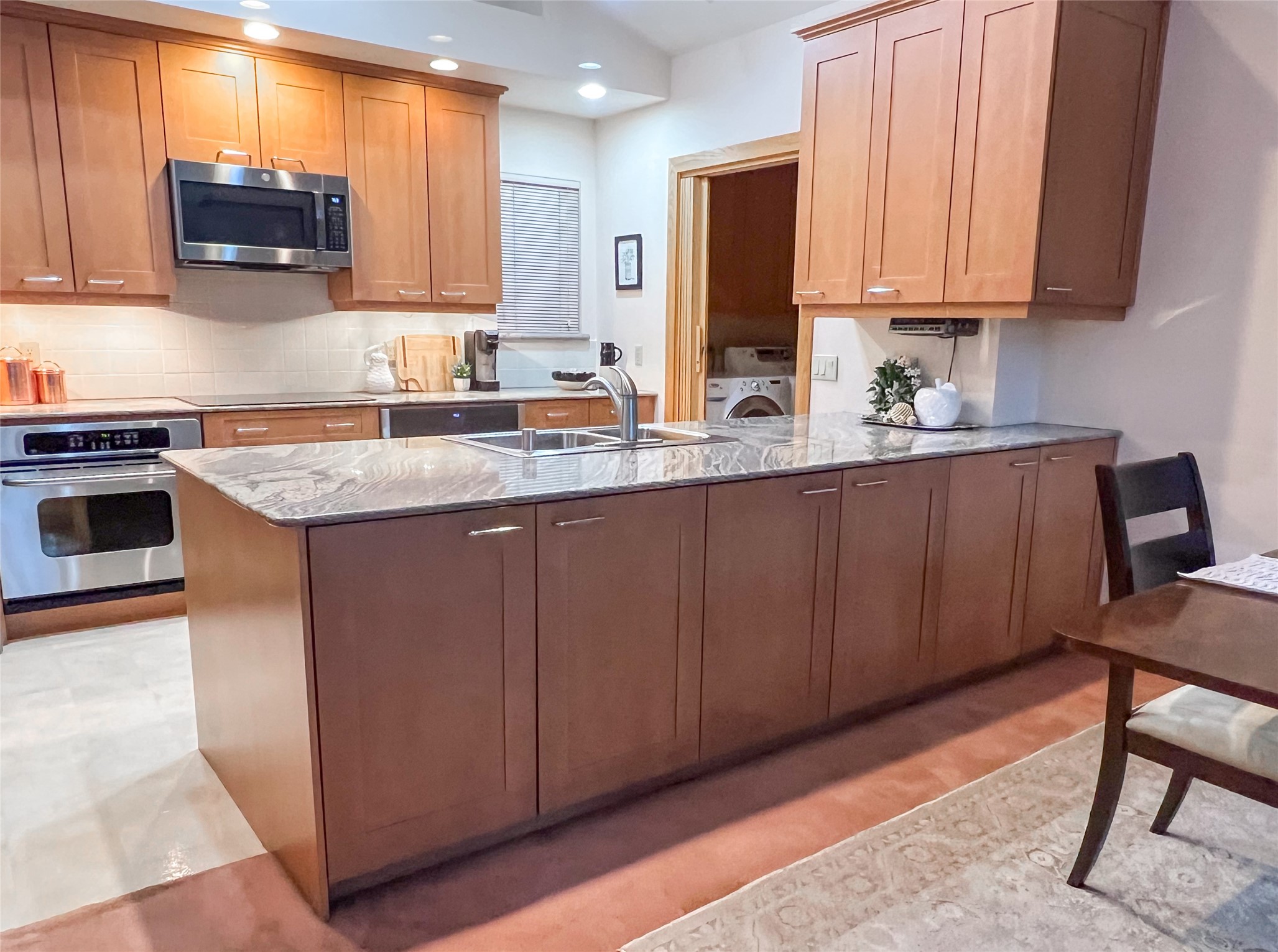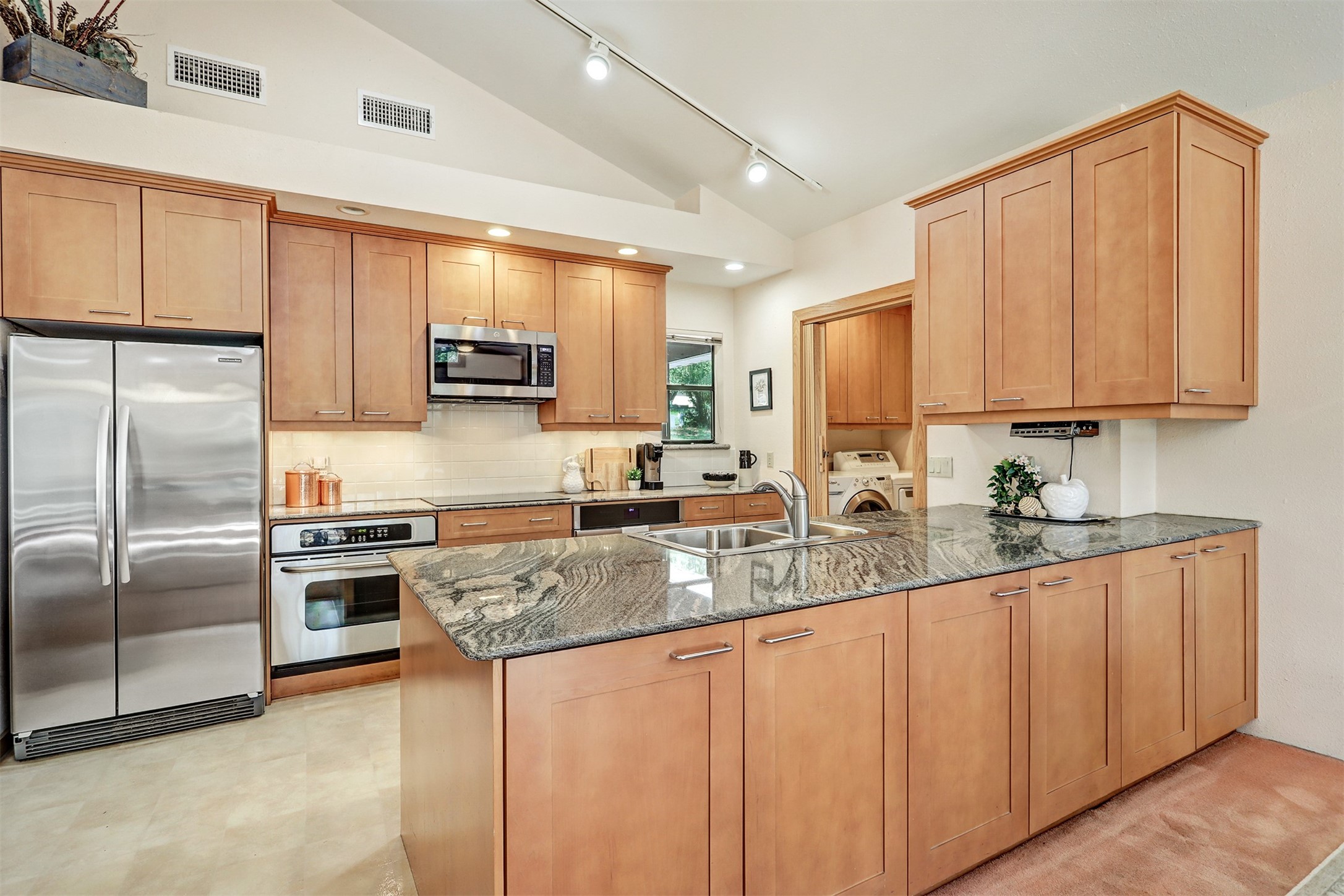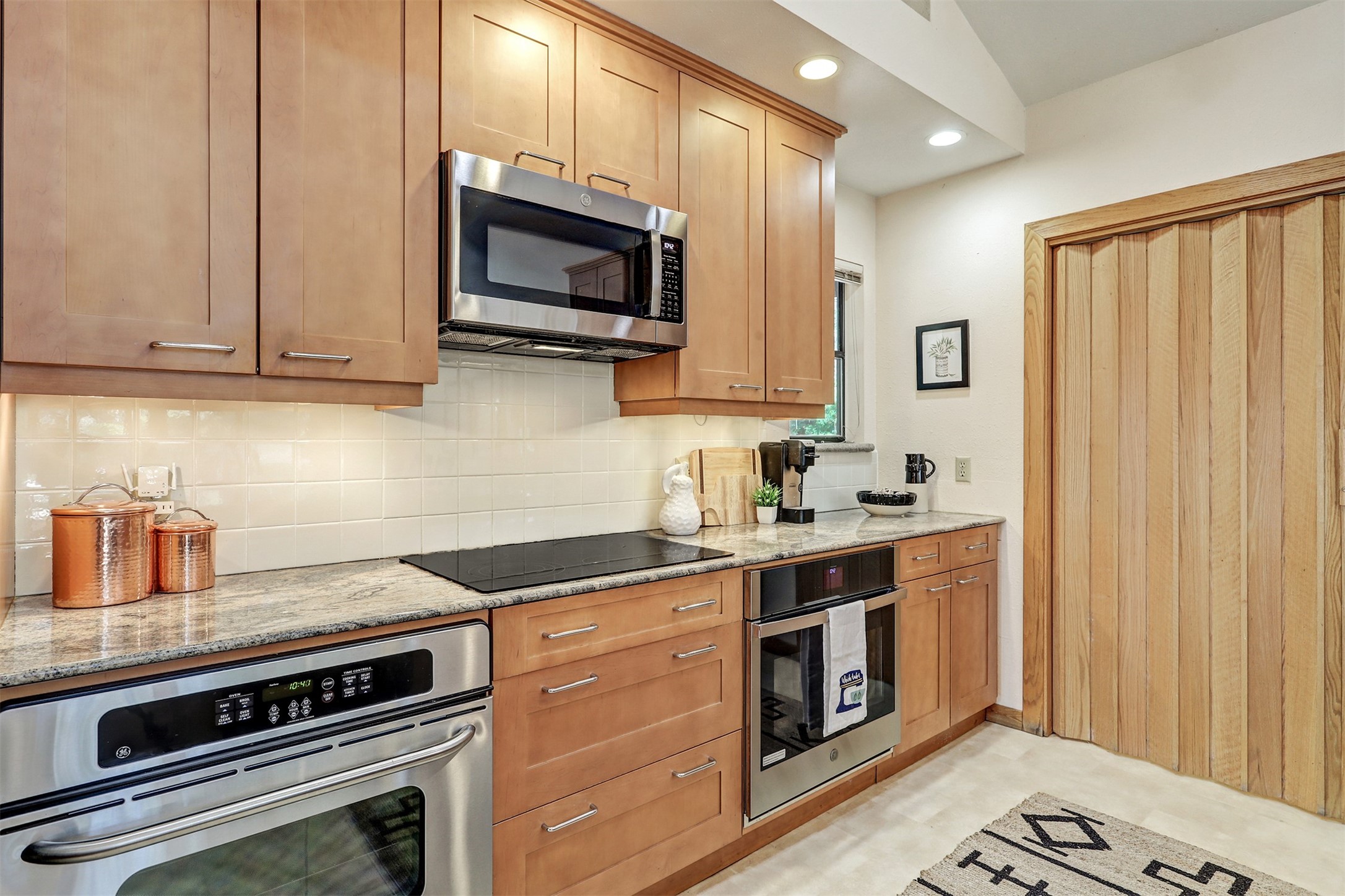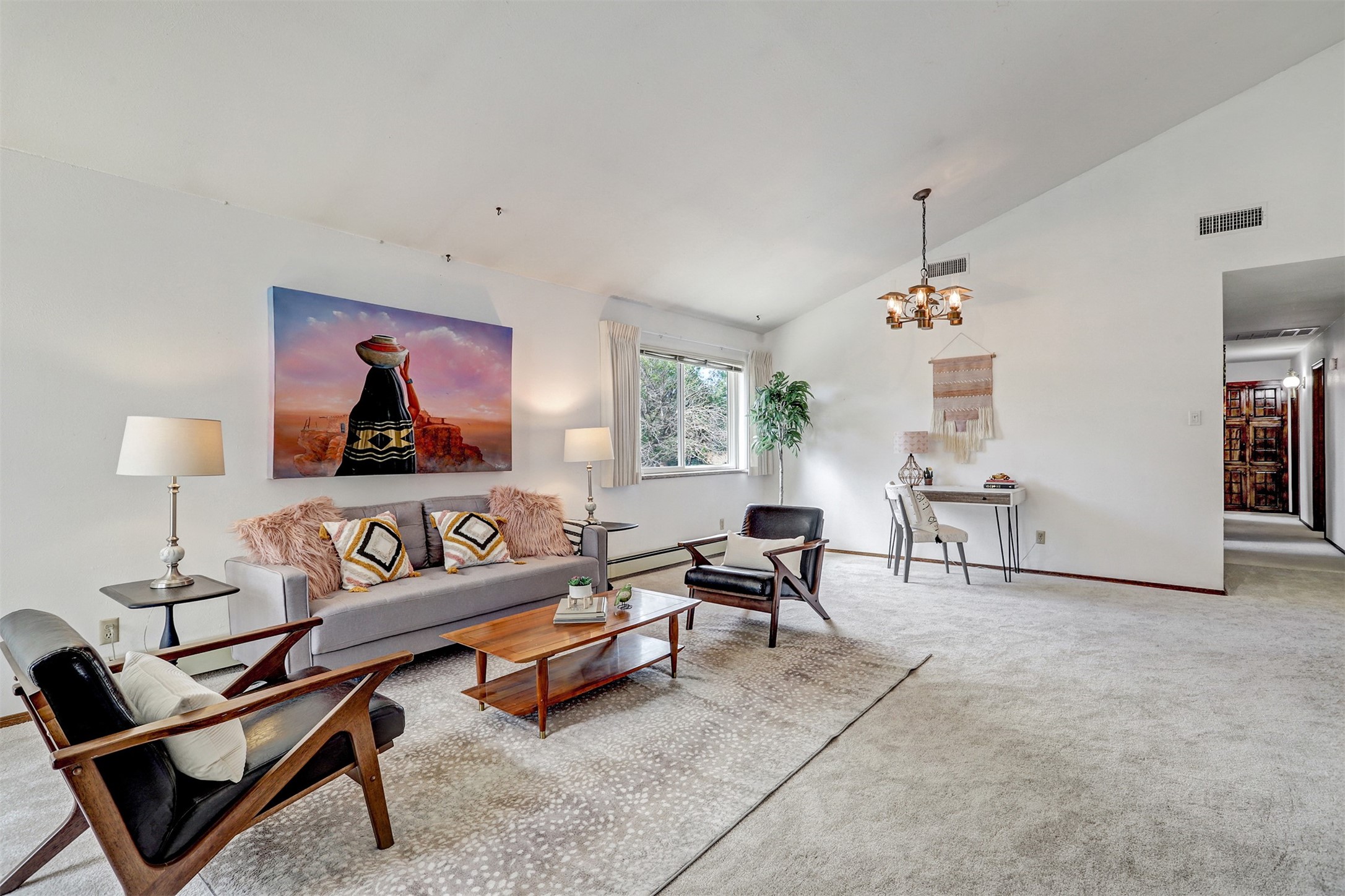 Nestled in the desirable North Mesa neighborhood, this exceptional two-story home offers privacy, natural beauty, and spacious living. Backed directly to the canyon, the property provides an unparalleled sense of peace and open space right from your backyard. The main level welcomes you with a beautifully updated kitchen, featuring maple cabinetry, granite countertops, double ovens, and ample storage perfect for culinary enthusiasts and family gatherings. Just off the dining room, step onto a charming outdoor porch where you can enjoy quiet mornings and evenings with forest views. The living room is a warm and inviting space, anchored by a dramatic floor-to-ceiling moss rock fireplace and framed by large picture windows that showcase the surrounding trees and greenery. This level also includes four comfortable bedrooms, a full hall bathroom, a designated laundry room, and convenient access to the attached two-car garage. Air conditioning keeps this main living area cool and comfortable year-round. Downstairs, you'll find a second expansive family room with striking Philippine mahogany ceilings and a versatile wet bar or kitchenette ideal for entertaining or multi-generational living. Two additional bedrooms provide flexible space, each outfitted with rich Mansonia African walnut cabinetry, and one featuring gorgeous Iroko African teak wall paneling. A large bathroom with double vanities and a jetted tub serves this level. Two spacious storage areas offer plenty of room for organization, one of which was previously used as a workshop. A dedicated wine cellar adds a special touch for collectors and connoisseurs. Outside, the lush, green backyard feels endless as it seamlessly blends into the bordering canyon. Furthermore, metal-clad siding offers durability and low maintenance exterior. With its stunning natural setting and thoughtfully designed interior, this unique property is a true North Mesa gem. Schedule a private showing today.