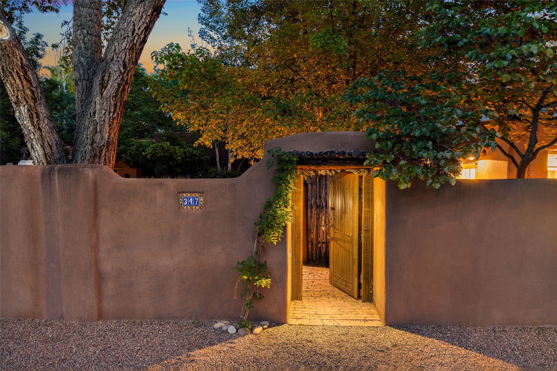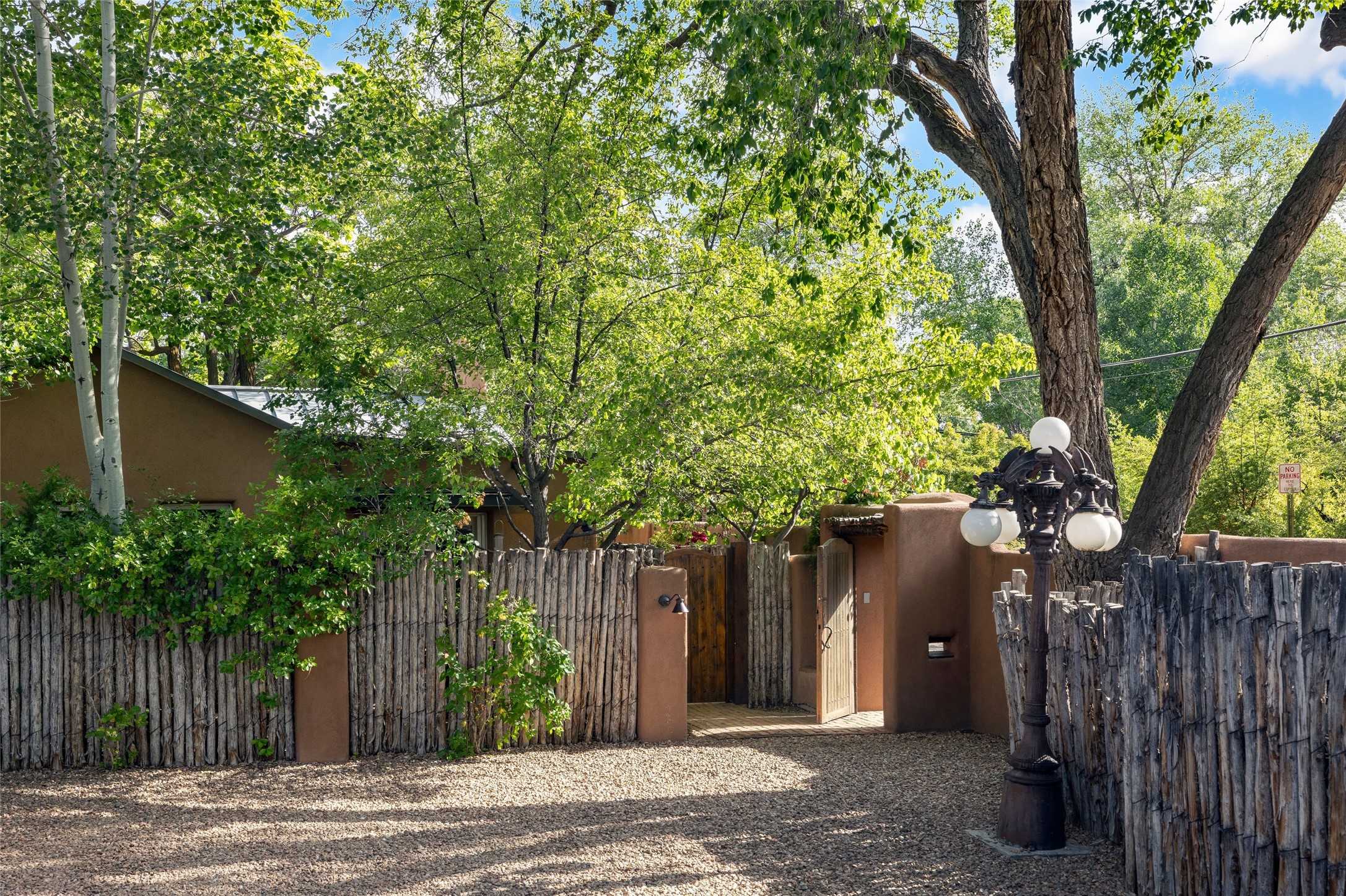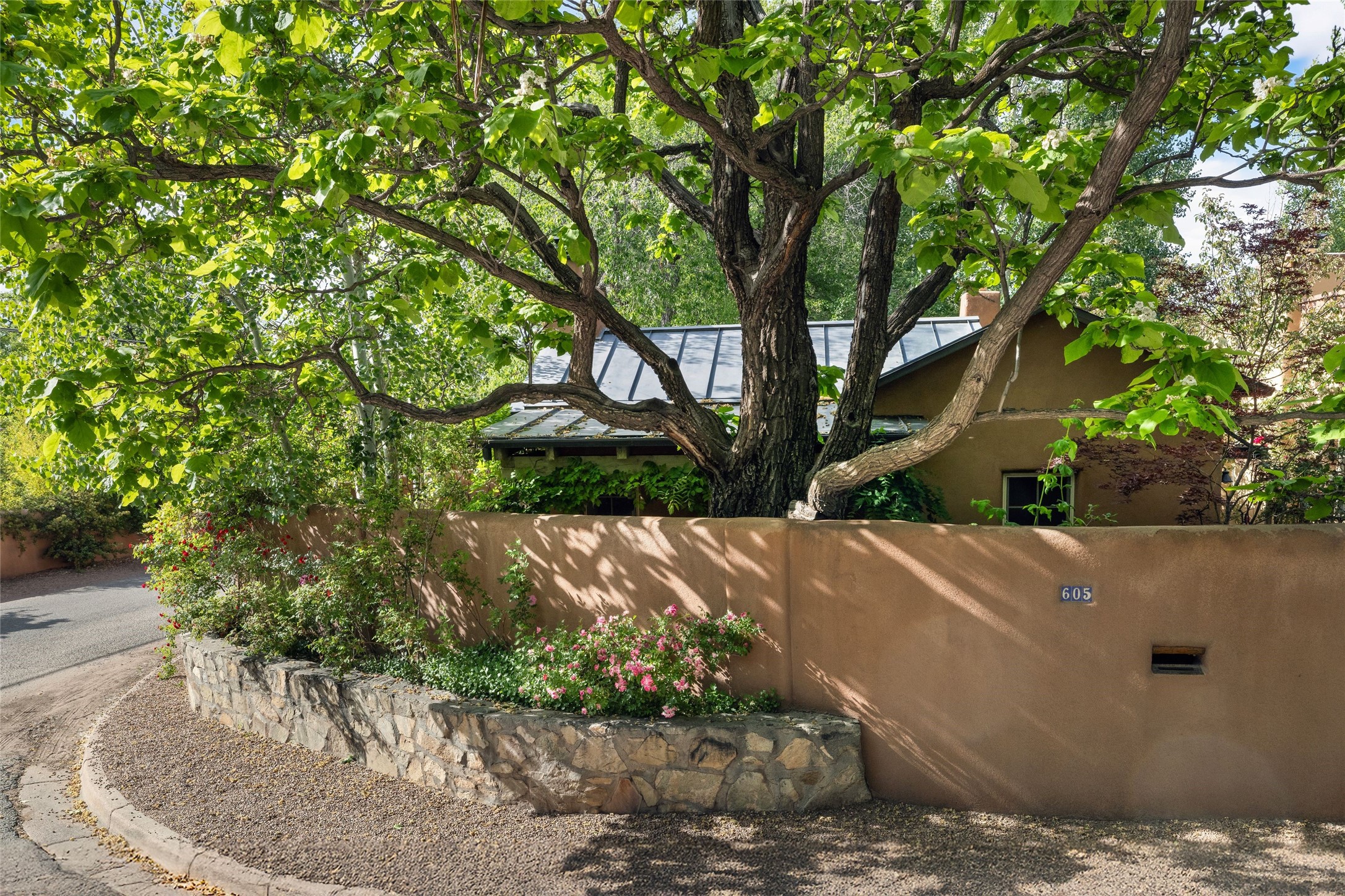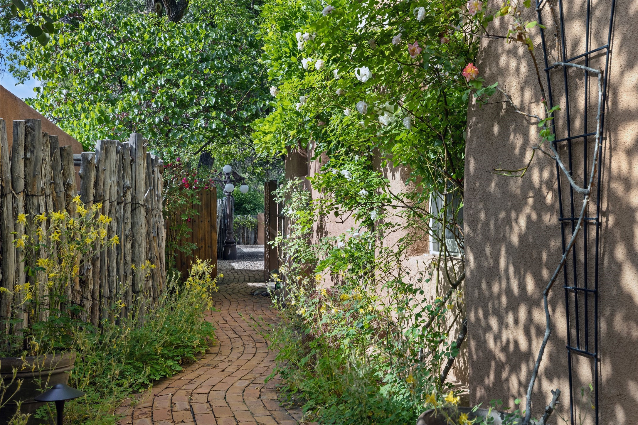 Experience the ultimate Santa Fe lifestyle, on one of the most iconic streets in all of Santa Fe, built by the famed, Sharon Woods. This extremely rare Historic Eastside home excites and impresses with modern architecture and lush, surround vibrant landscape and fountains, just steps away from the world class galleries and restaurants along Canyon Road and the Santa Fe River. Enter through the private, custom hand-carved electric gate, meander through the private pathway fountains, to this magical retreat. Built in 2008, this beautifully appointed home with soaring ceilings dazzles with soft natural light throughout and captivating design features. Ideal as the perfect lock and leave Santa Fe retreat, or as a primary home, 605 Acequia Madre has never been offered for sale since completion and is truly a rare offering. Design highlights include a stunning living room, located directly off the kitchen, with a grand fireplace, pitched ceilings with rich beams and surround view windows. Culinary enthusiasts will appreciate the well-appointed kitchen with custom cabinets, luxury appliances and ample storage which opens to the dining room and the vast outdoor entertainment and dining areas. The elegant primary suite, located on the main level, enjoys a private, fenced garden area with a fountain and an exquisite, spa-like bath with a walk-in closet. The spacious guest suite, located downstairs, offers privacy and a 1/2 bath, with a full bath option located on the main level. The outdoor living experience is one of the finest on the Historic Eastside, with vibrant gardens, multiple patios designed for both grand entertaining and intimate moments. Additional exceptional features include gated parking, a Northern New Mexican-style pitched roof, fully enclosed grounds, creamy plaster walls, and modern features. The property seamlessly blends seclusion with convenience, within the heart of the Historic Eastside and is not to be missed.