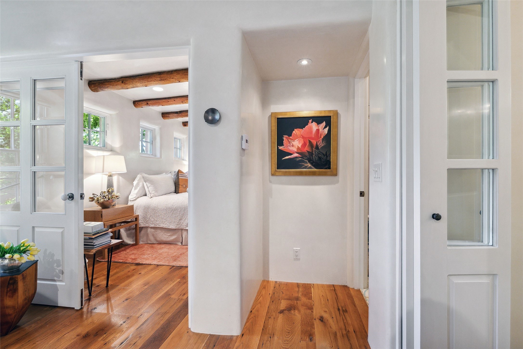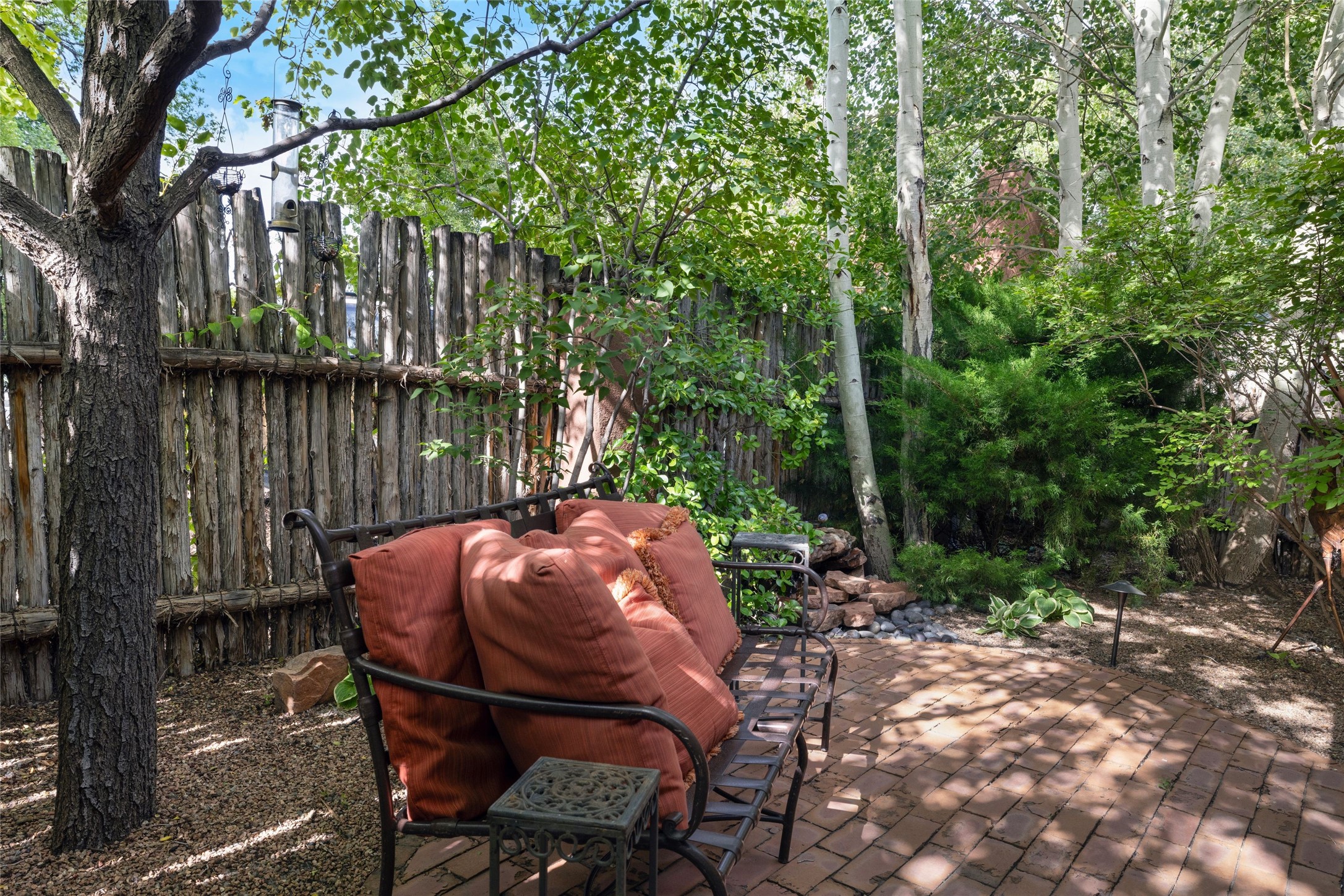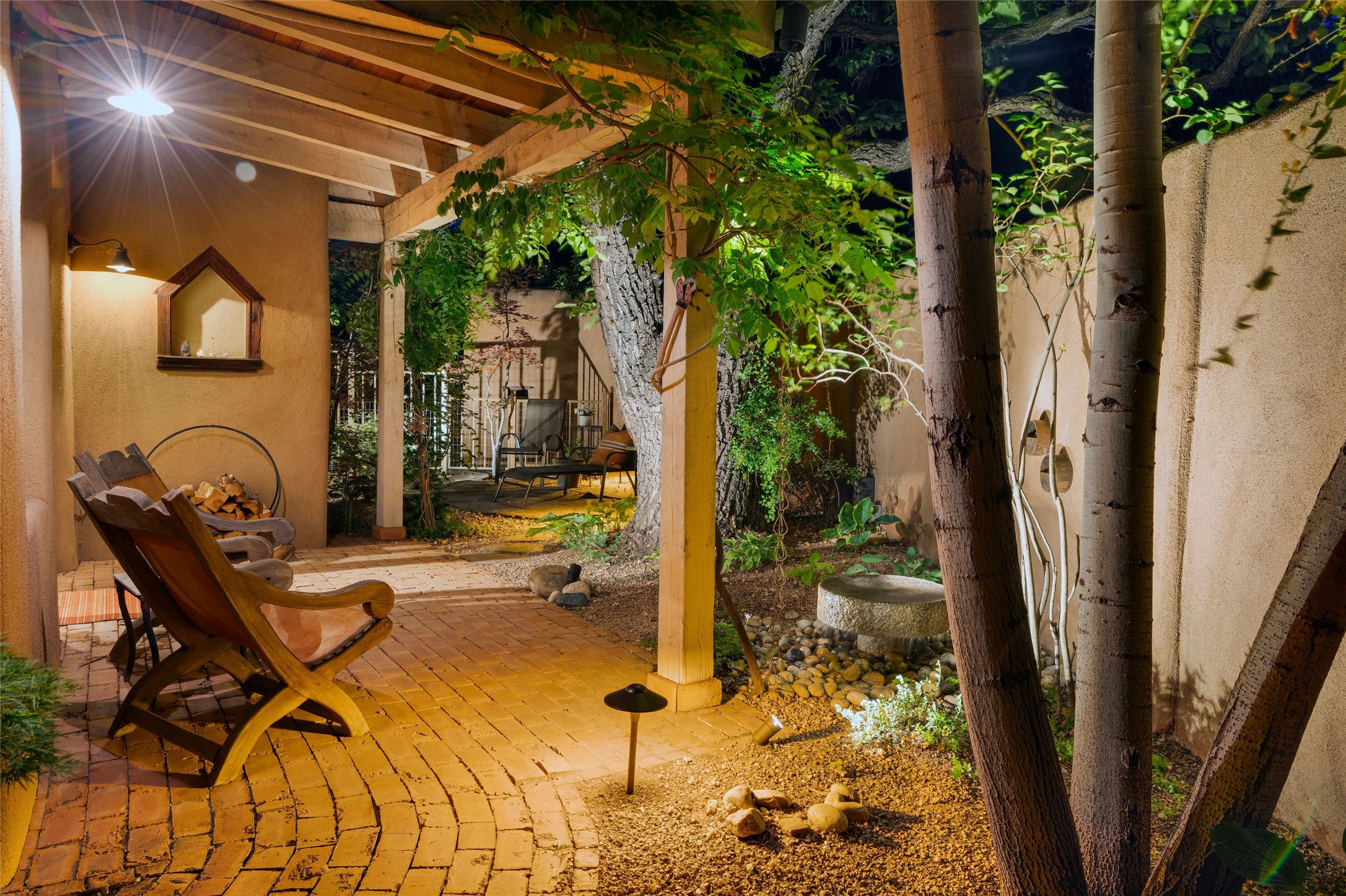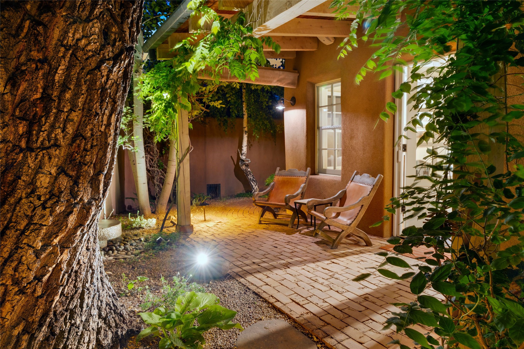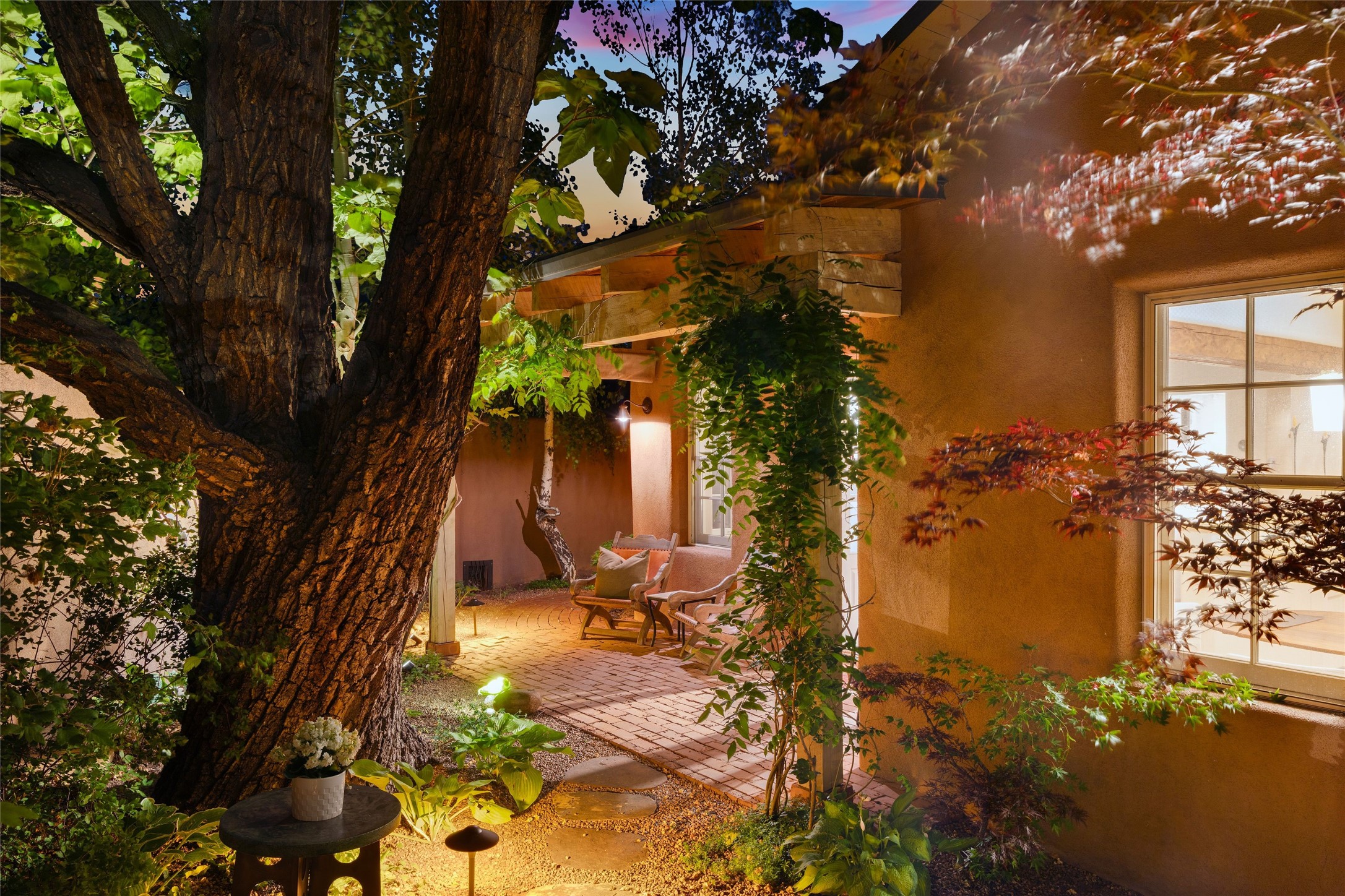 Experience the ultimate Santa Fe lifestyle, on one of the most iconic streets in all of Santa Fe, built by the famed, Sharon Woods. This extremely rare Historic Eastside home excites and impresses with modern architecture and lush, surround vibrant landscape and fountains, just steps away from the world class galleries and restaurants along Canyon Road and the Santa Fe River. Enter through the private, custom hand-carved electric gate, meander through the private pathway fountains, to this magical retreat. Built in 2008, this beautifully appointed home with soaring ceilings dazzles with soft natural light throughout and captivating design features. Ideal as the perfect lock and leave Santa Fe retreat, or as a primary home, 605 Acequia Madre has never been offered for sale since completion and is truly a rare offering. Design highlights include a stunning living room, located directly off the kitchen, with a grand fireplace, pitched ceilings with rich beams and surround view windows. Culinary enthusiasts will appreciate the well-appointed kitchen with custom cabinets, luxury appliances and ample storage which opens to the dining room and the vast outdoor entertainment and dining areas. The elegant primary suite, located on the main level, enjoys a private, fenced garden area with a fountain and an exquisite, spa-like bath with a walk-in closet. The spacious guest suite, located downstairs, offers privacy and a 1/2 bath, with a full bath option located on the main level. The outdoor living experience is one of the finest on the Historic Eastside, with vibrant gardens, multiple patios designed for both grand entertaining and intimate moments. Additional exceptional features include gated parking, a Northern New Mexican-style pitched roof, fully enclosed grounds, creamy plaster walls, and modern features. The property seamlessly blends seclusion with convenience, within the heart of the Historic Eastside and is not to be missed.