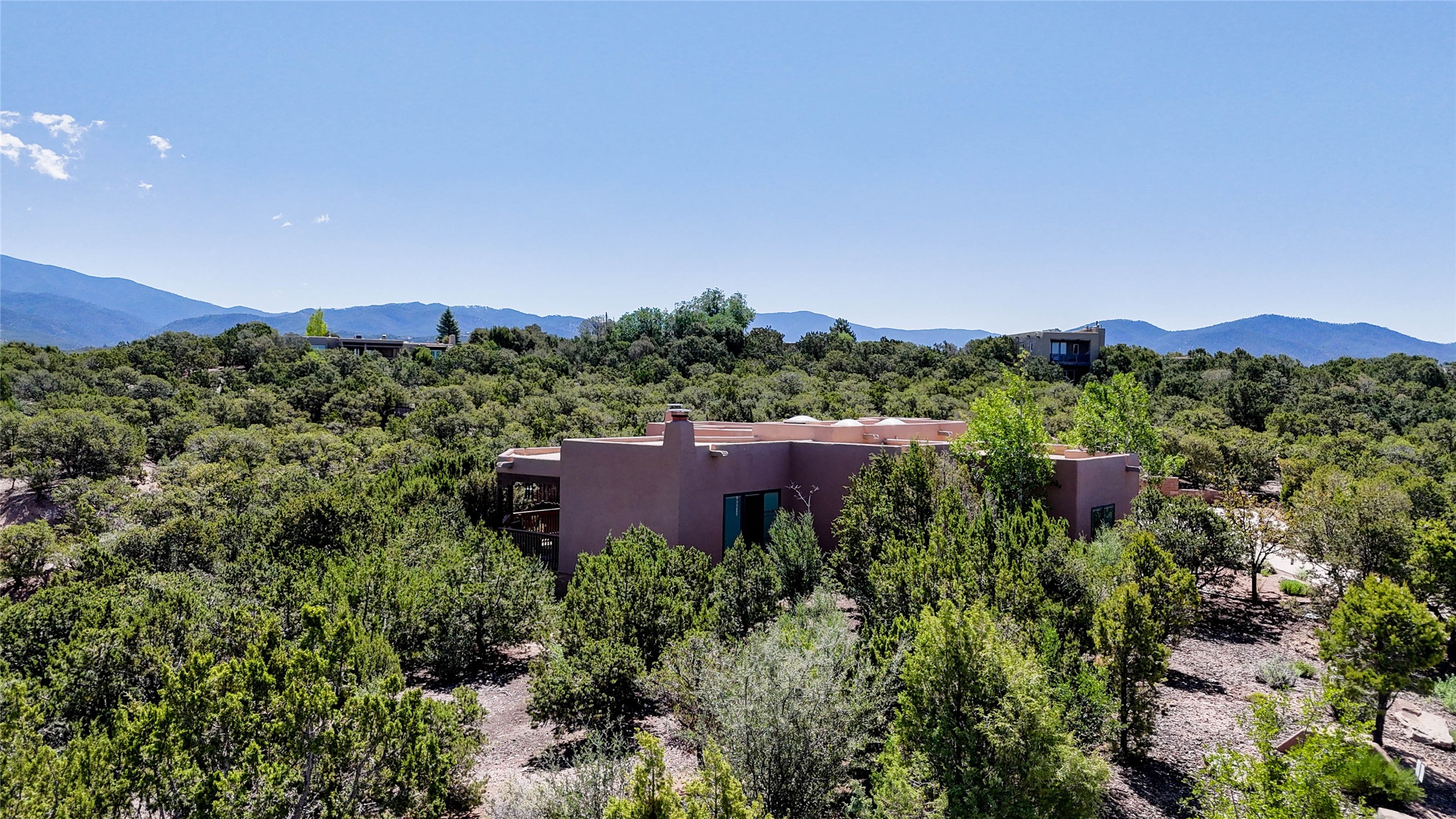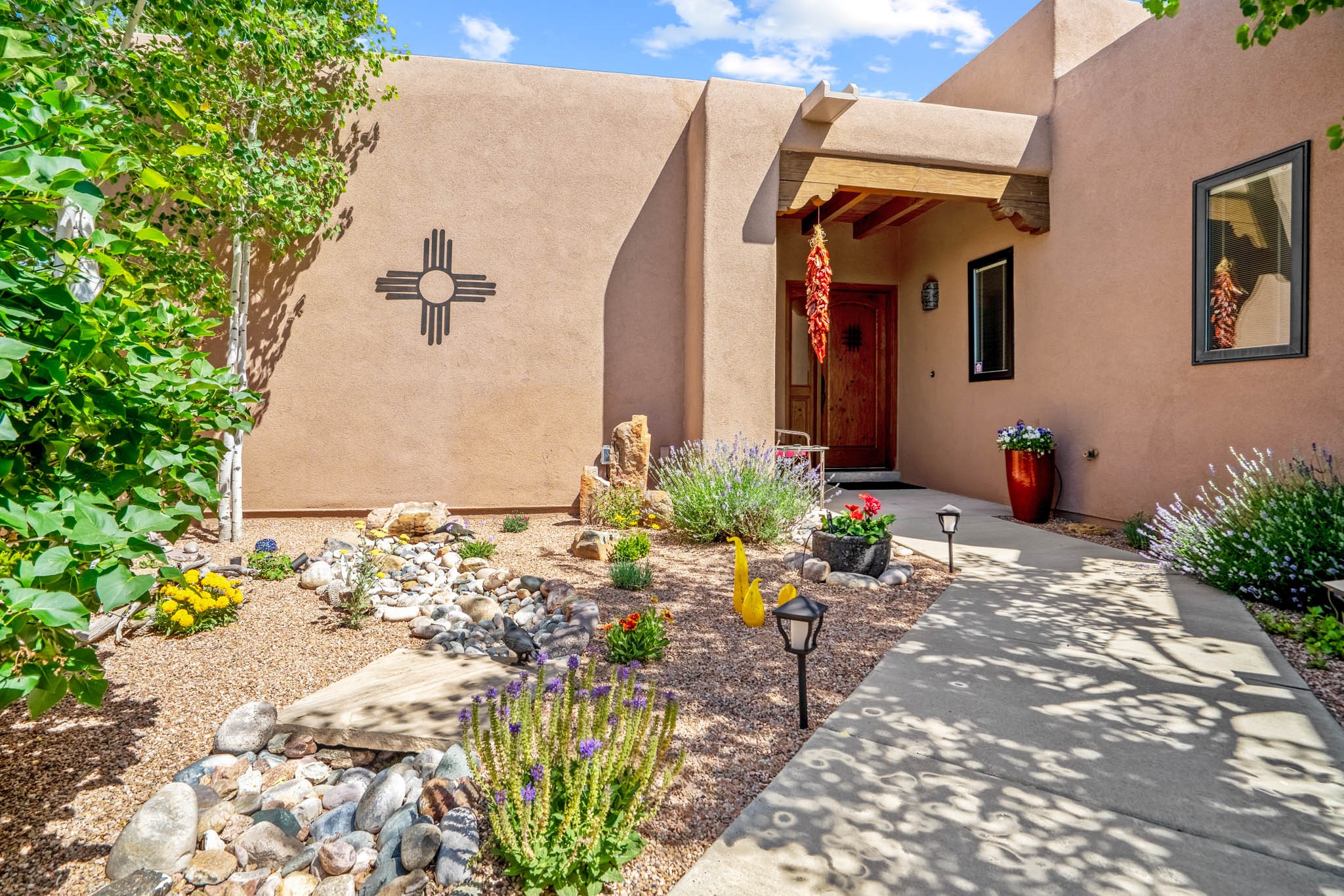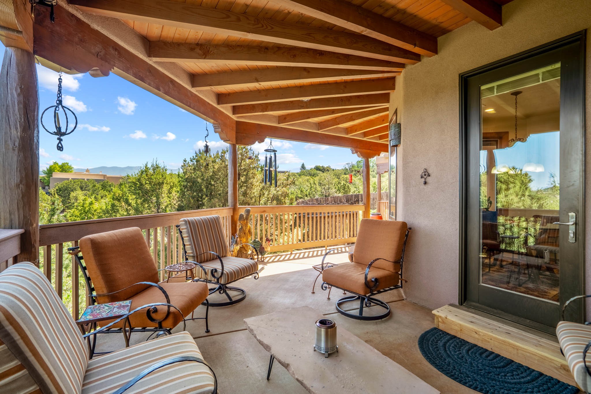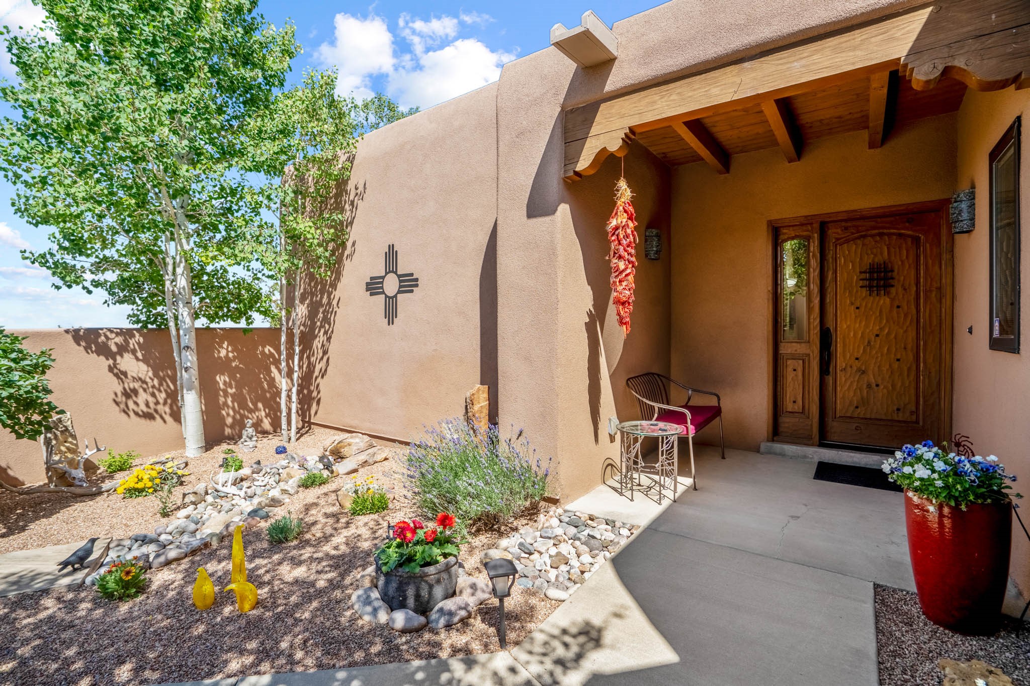 Perched on nearly 2 acres at the peak of Las Estrellas, this elegant 3-bedroom, 3-bathroom home offers sweeping views of the Sangre de Cristo Mountains and the serene lifestyle Santa Fe is known for. Just minutes from the historic Plaza, this 2771sq.ft. residence, built in 2007 by Beverly Chapman and lovely maintained by it's owners, is move in ready and full of timeless charm. Designed with both comfort and entertaining in mind, the home features a gracious floor plan with a formal dining room, living room and a cozy den anchored by a traditional Kiva fireplaces. The gourmet kitchen is a chef's dream, outfitted with high-end appliances, granite countertops and abundant storage. Additional highlights include a generous 3 car garage with built-in storage and thoughtful finishes throughout that reflect the understated elegance of Santa Fe living.