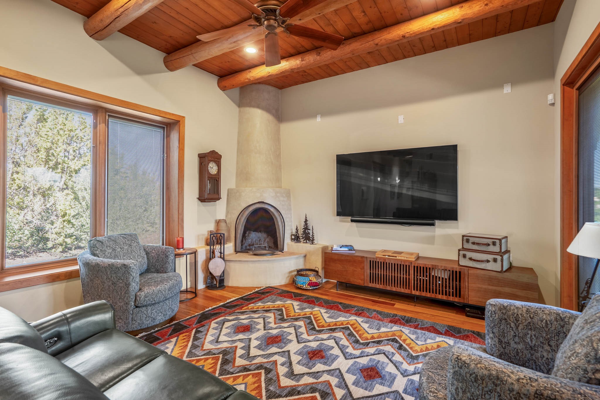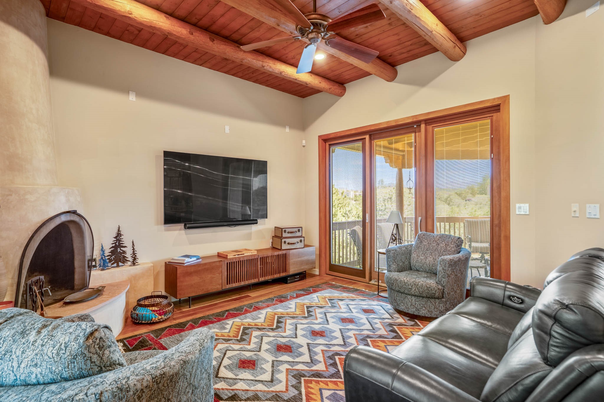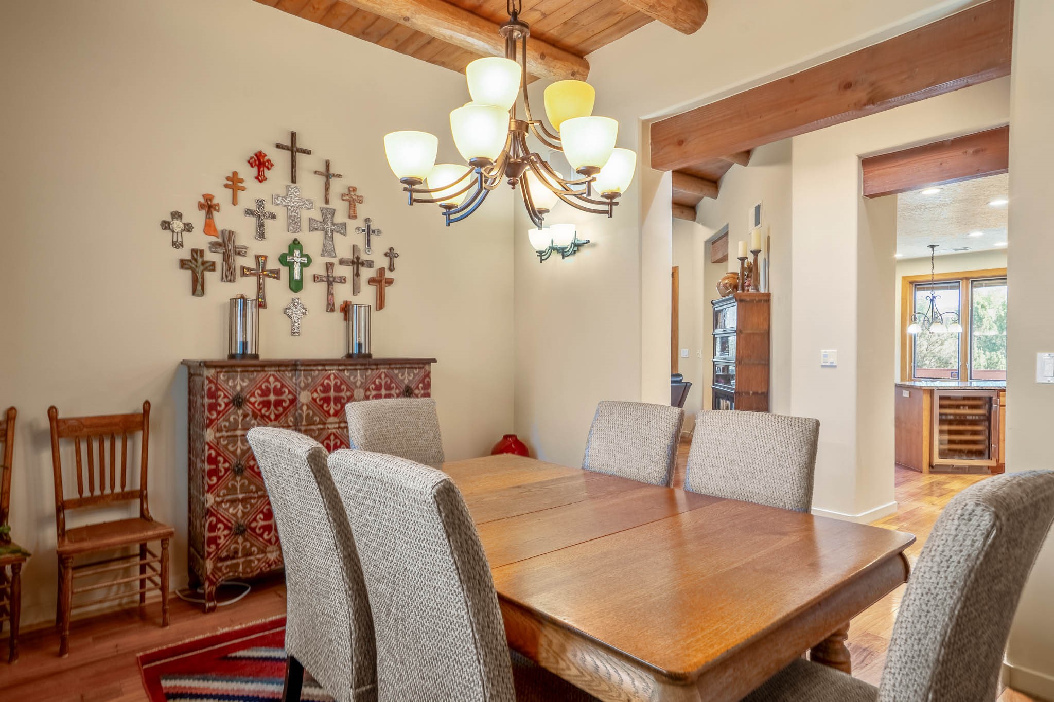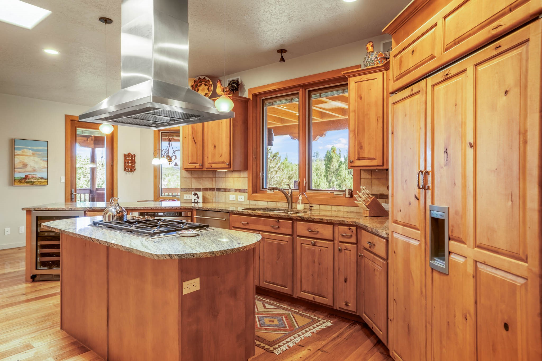 Perched on nearly 2 acres at the peak of Las Estrellas, this elegant 3-bedroom, 3-bathroom home offers sweeping views of the Sangre de Cristo Mountains and the serene lifestyle Santa Fe is known for. Just minutes from the historic Plaza, this 2771sq.ft. residence, built in 2007 by Beverly Chapman and lovely maintained by it's owners, is move in ready and full of timeless charm. Designed with both comfort and entertaining in mind, the home features a gracious floor plan with a formal dining room, living room and a cozy den anchored by a traditional Kiva fireplaces. The gourmet kitchen is a chef's dream, outfitted with high-end appliances, granite countertops and abundant storage. Additional highlights include a generous 3 car garage with built-in storage and thoughtful finishes throughout that reflect the understated elegance of Santa Fe living.