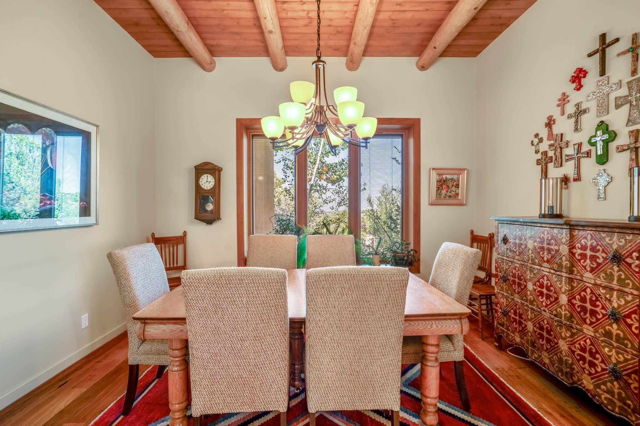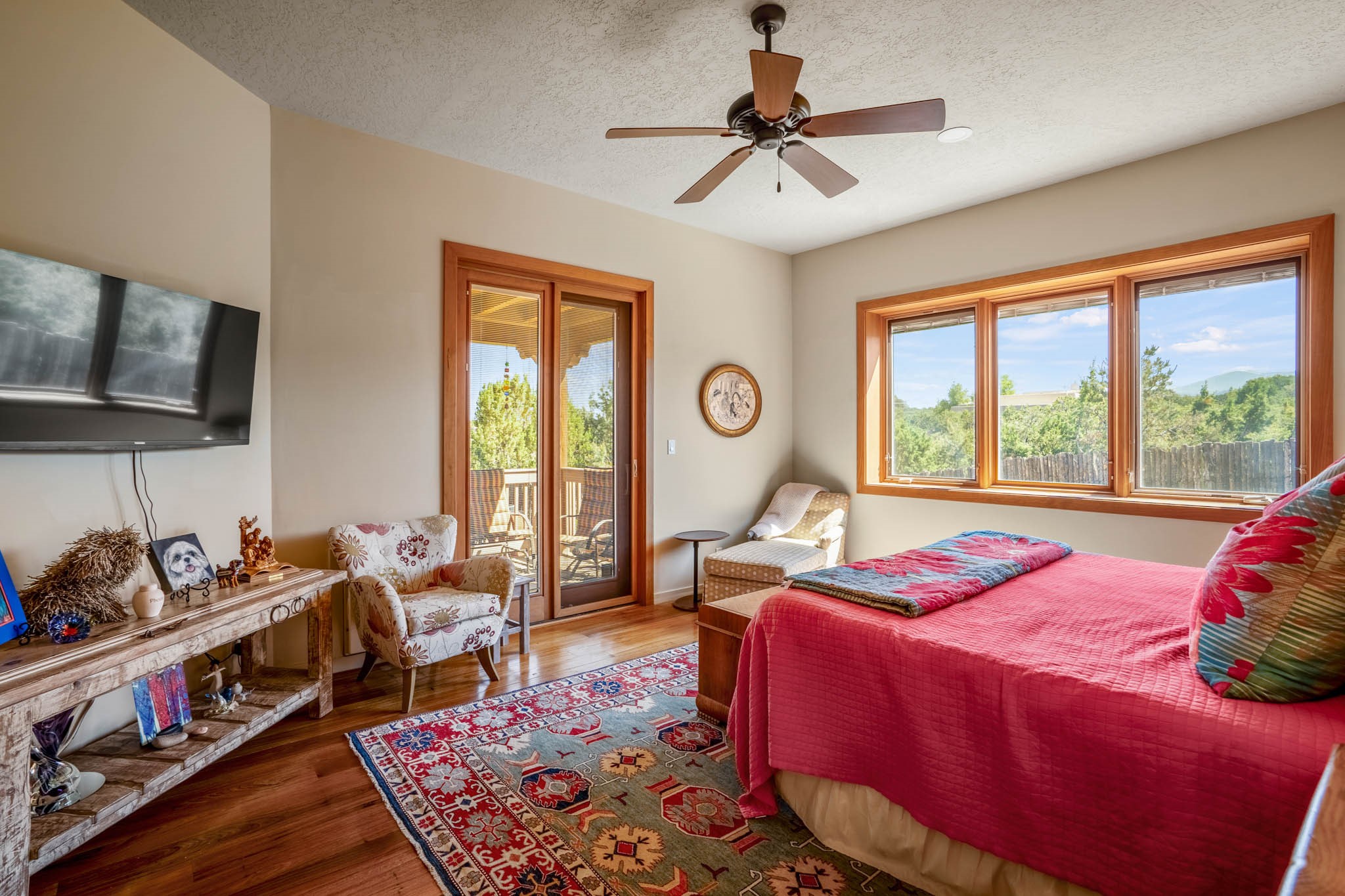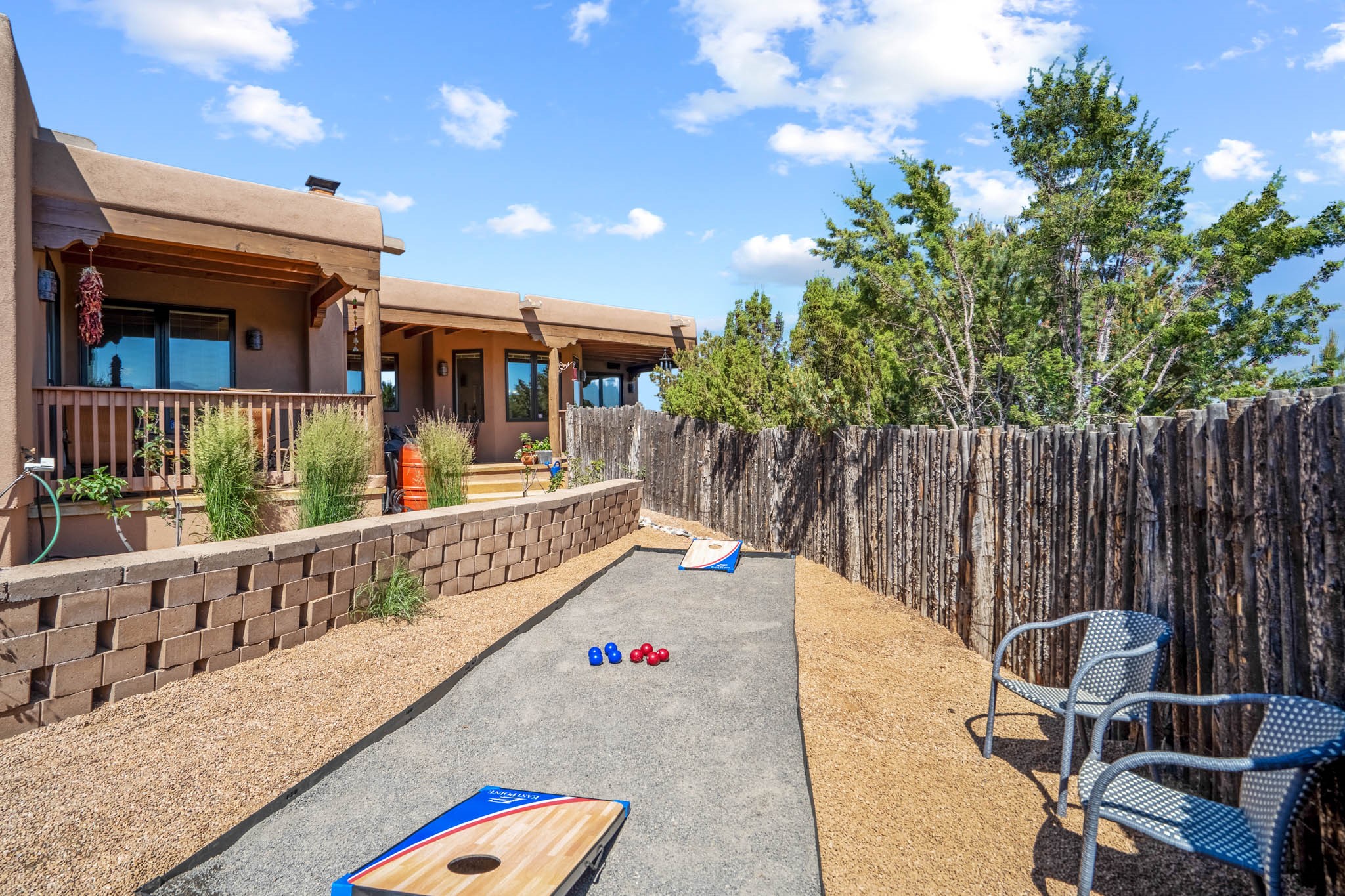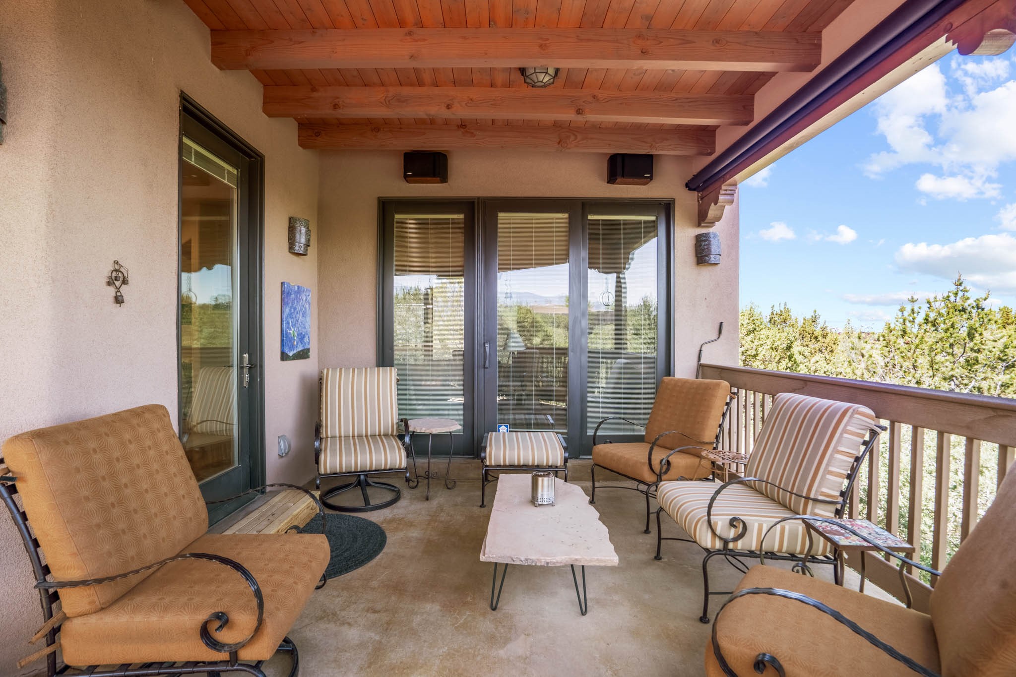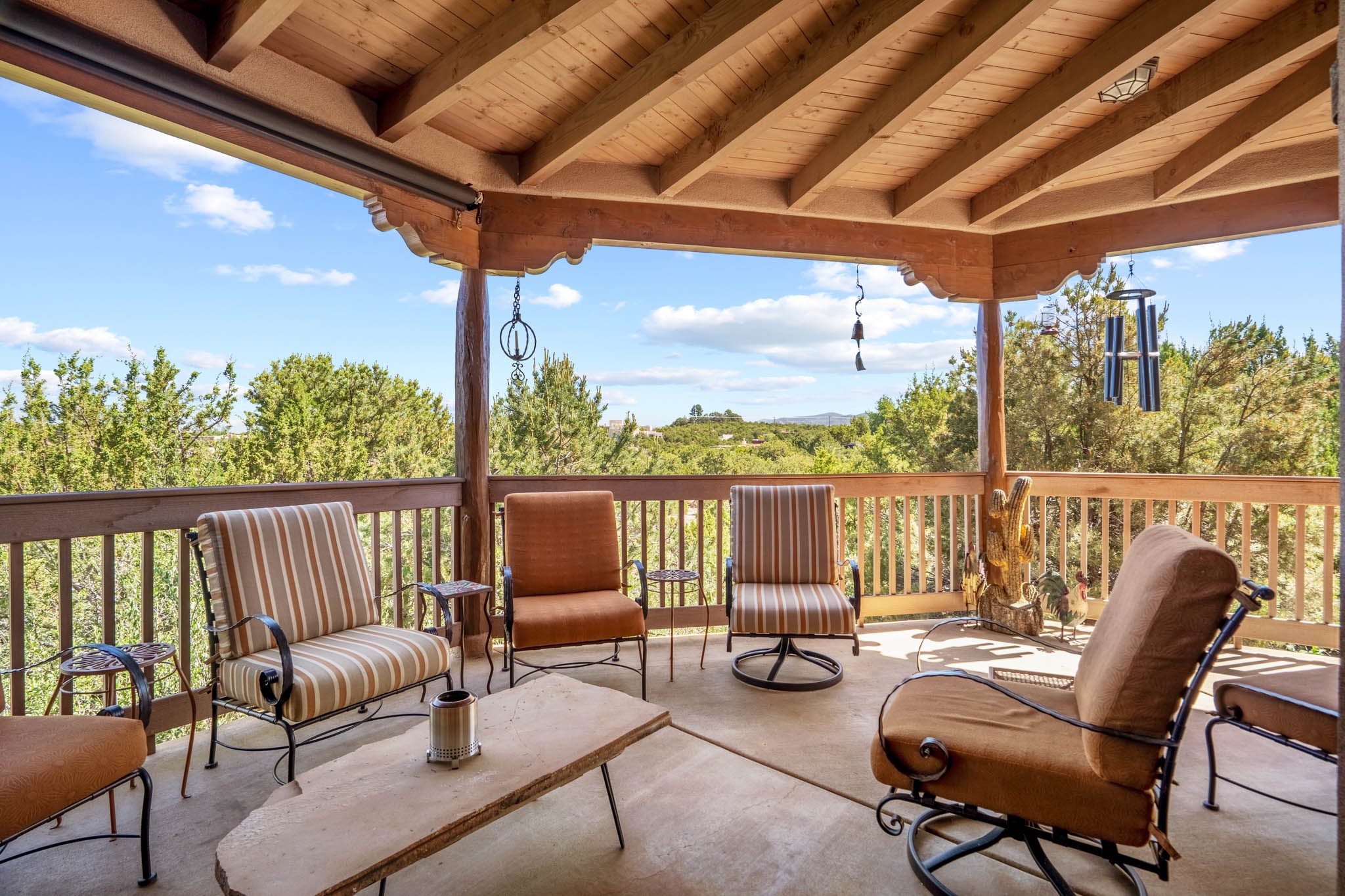 Perched on nearly 2 acres at the peak of Las Estrellas, this elegant 3-bedroom, 3-bathroom home offers sweeping views of the Sangre de Cristo Mountains and the serene lifestyle Santa Fe is known for. Just minutes from the historic Plaza, this 2771sq.ft. residence, built in 2007 by Beverly Chapman and lovely maintained by it's owners, is move in ready and full of timeless charm. Designed with both comfort and entertaining in mind, the home features a gracious floor plan with a formal dining room, living room and a cozy den anchored by a traditional Kiva fireplaces. The gourmet kitchen is a chef's dream, outfitted with high-end appliances, granite countertops and abundant storage. Additional highlights include a generous 3 car garage with built-in storage and thoughtful finishes throughout that reflect the understated elegance of Santa Fe living.