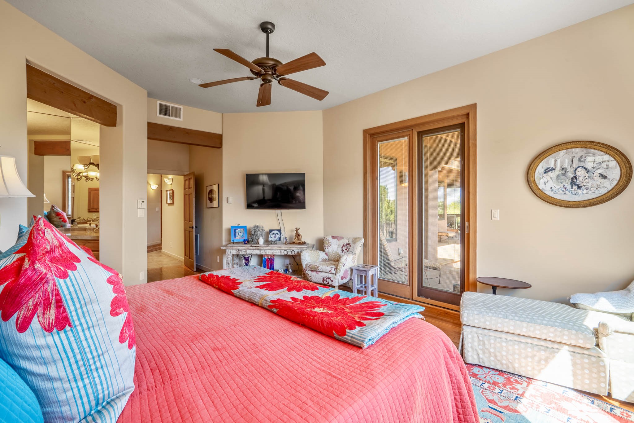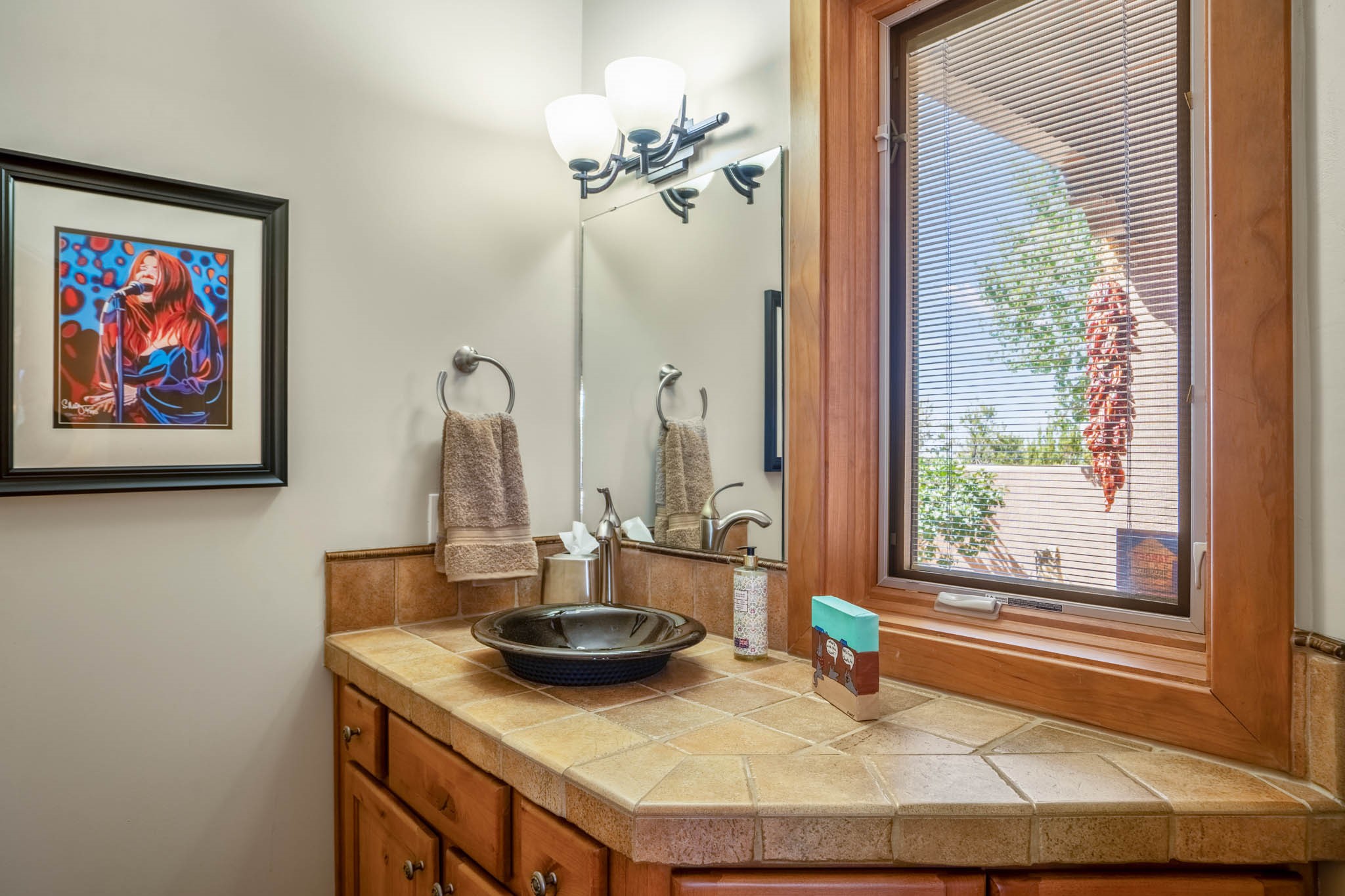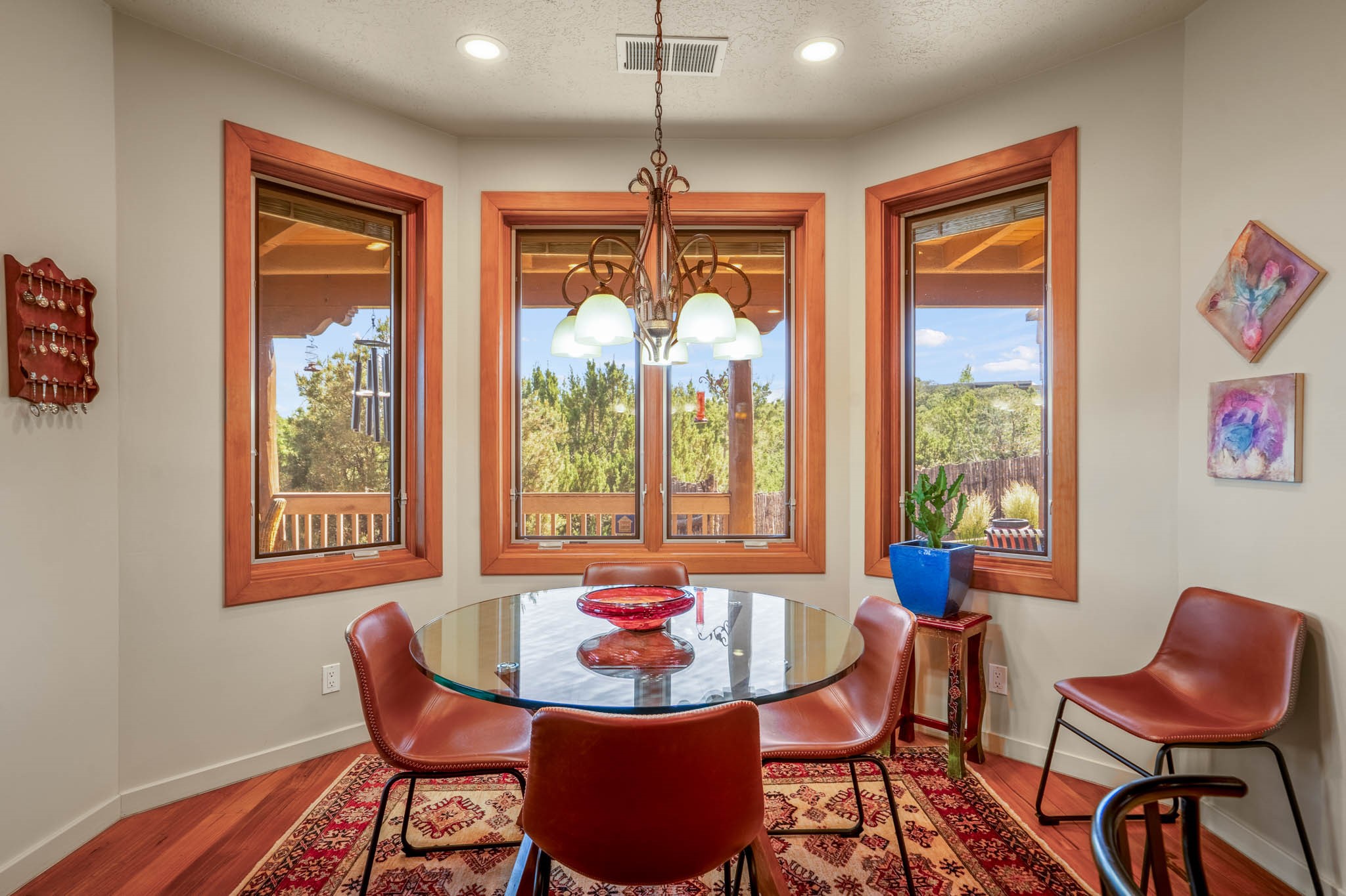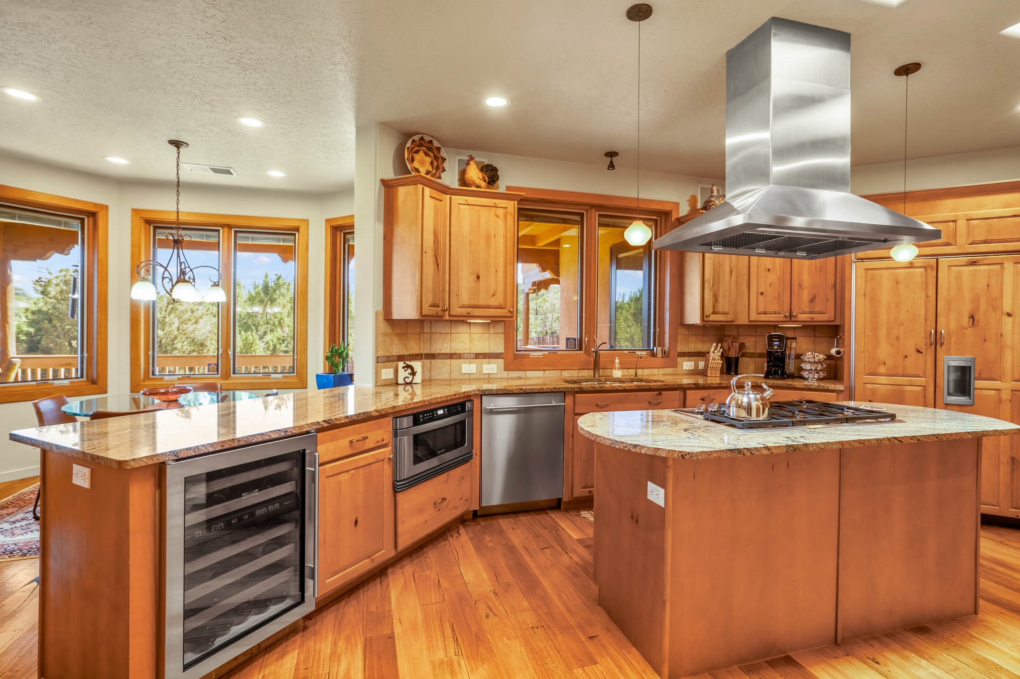Perched on nearly 2 acres at the peak of Las Estrellas, this elegant 3-bedroom, 3-bathroom home offers sweeping views of the Sangre de Cristo Mountains and the serene lifestyle Santa Fe is known for. Just minutes from the historic Plaza, this 2771sq.ft. residence, built in 2007 by Beverly Chapman and lovely maintained by it's owners, is move in ready and full of timeless charm. Designed with both comfort and entertaining in mind, the home features a gracious floor plan with a formal dining room, living room and a cozy den anchored by a traditional Kiva fireplaces. The gourmet kitchen is a chef's dream, outfitted with high-end appliances, granite countertops and abundant storage. Additional highlights include a generous 3 car garage with built-in storage and thoughtful finishes throughout that reflect the understated elegance of Santa Fe living.