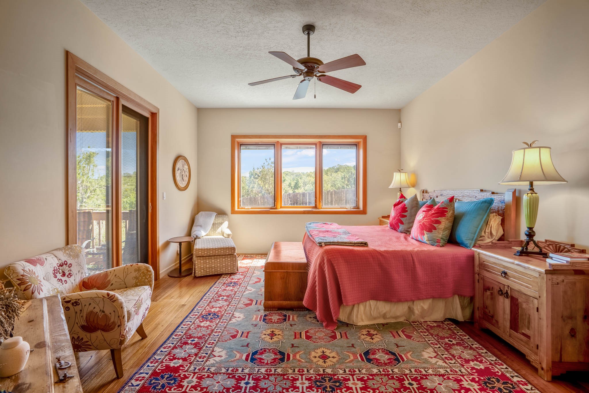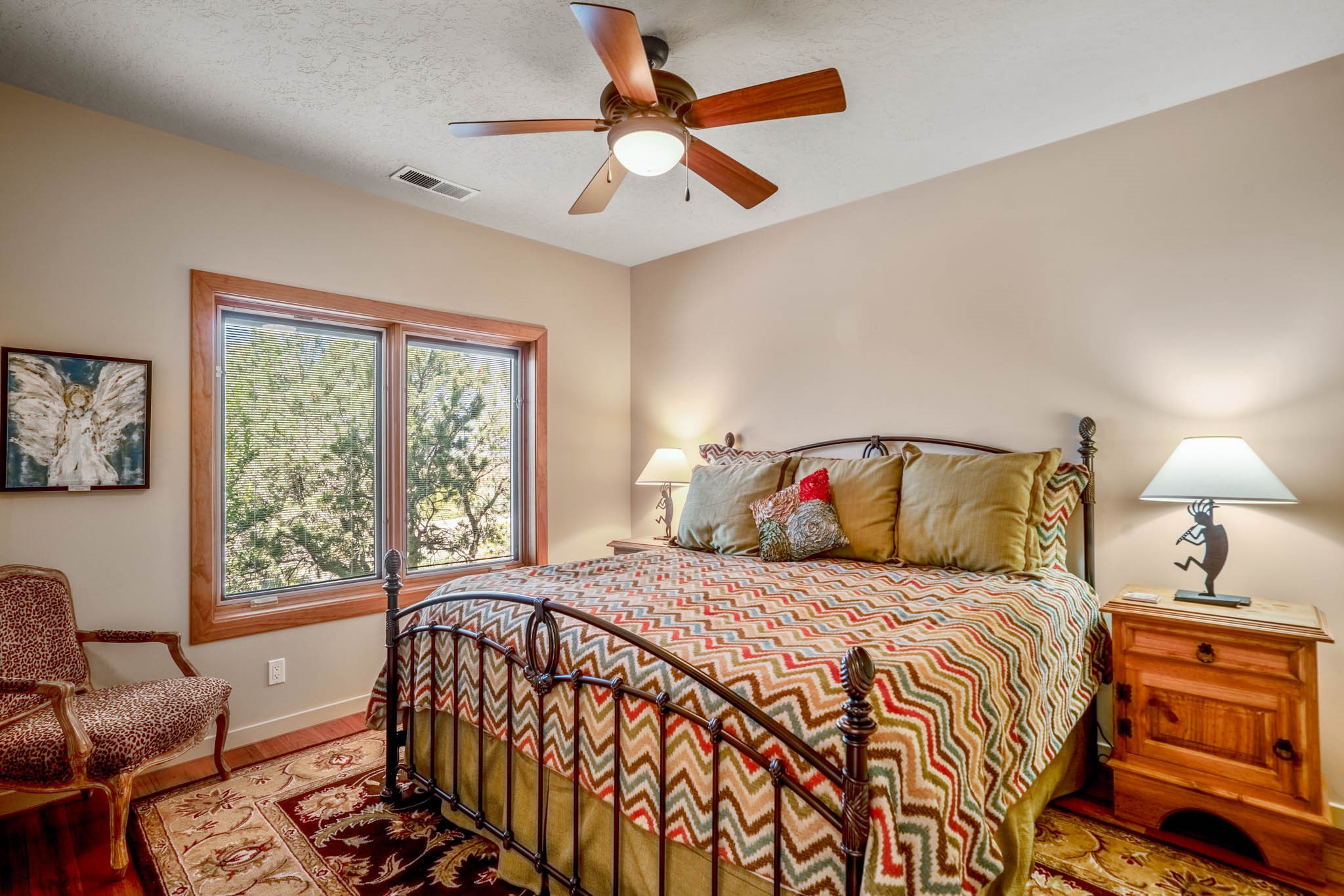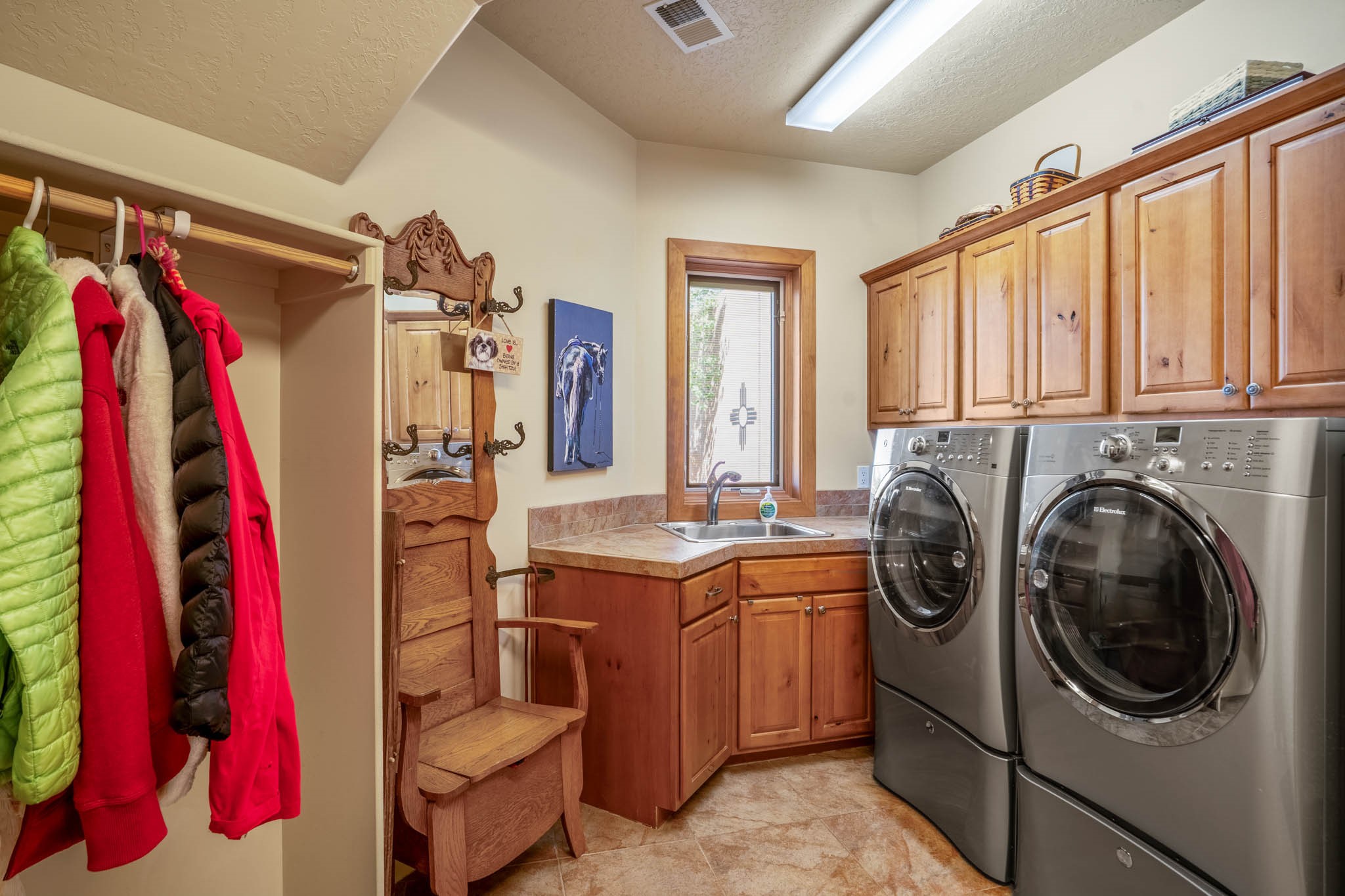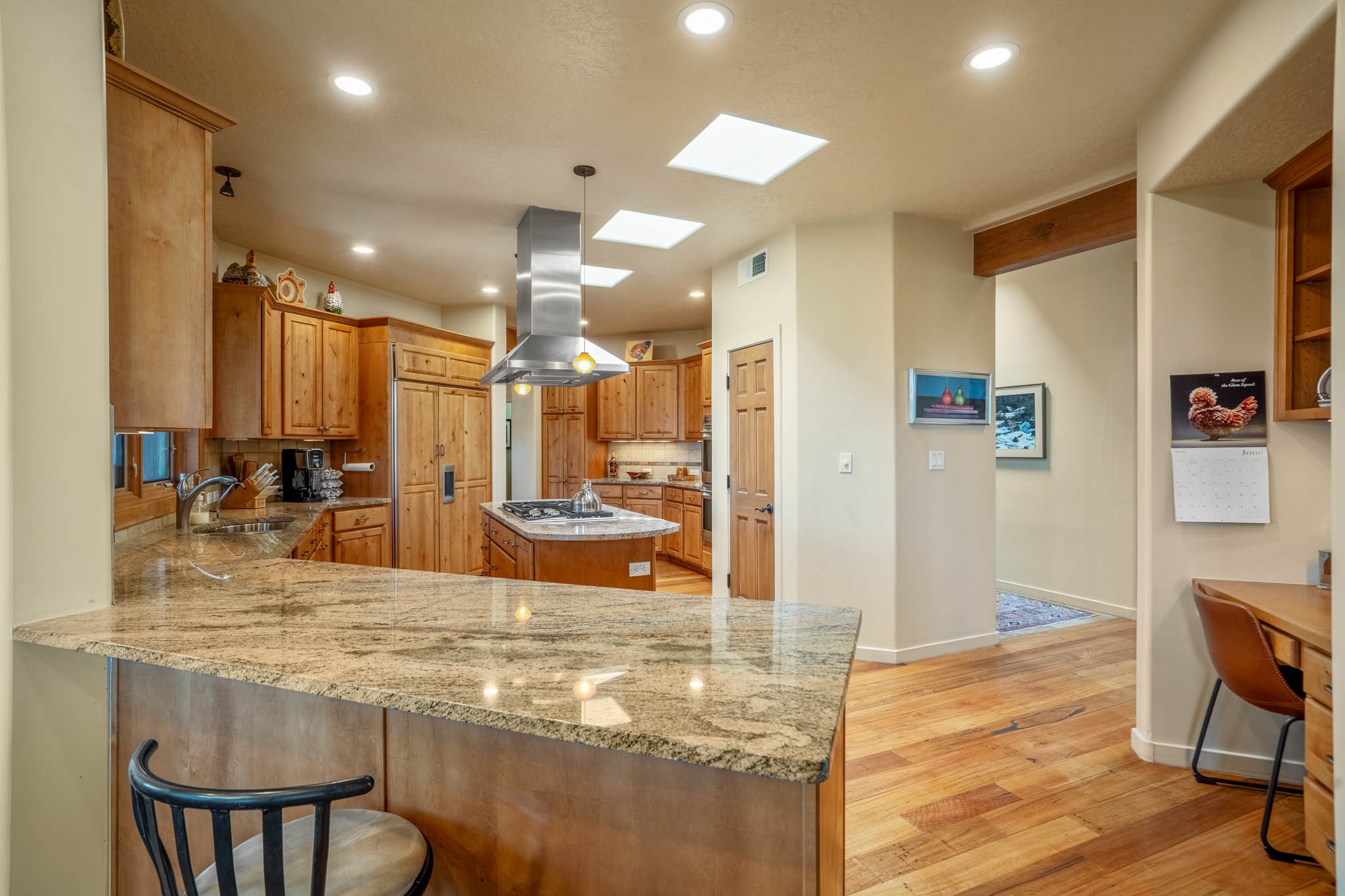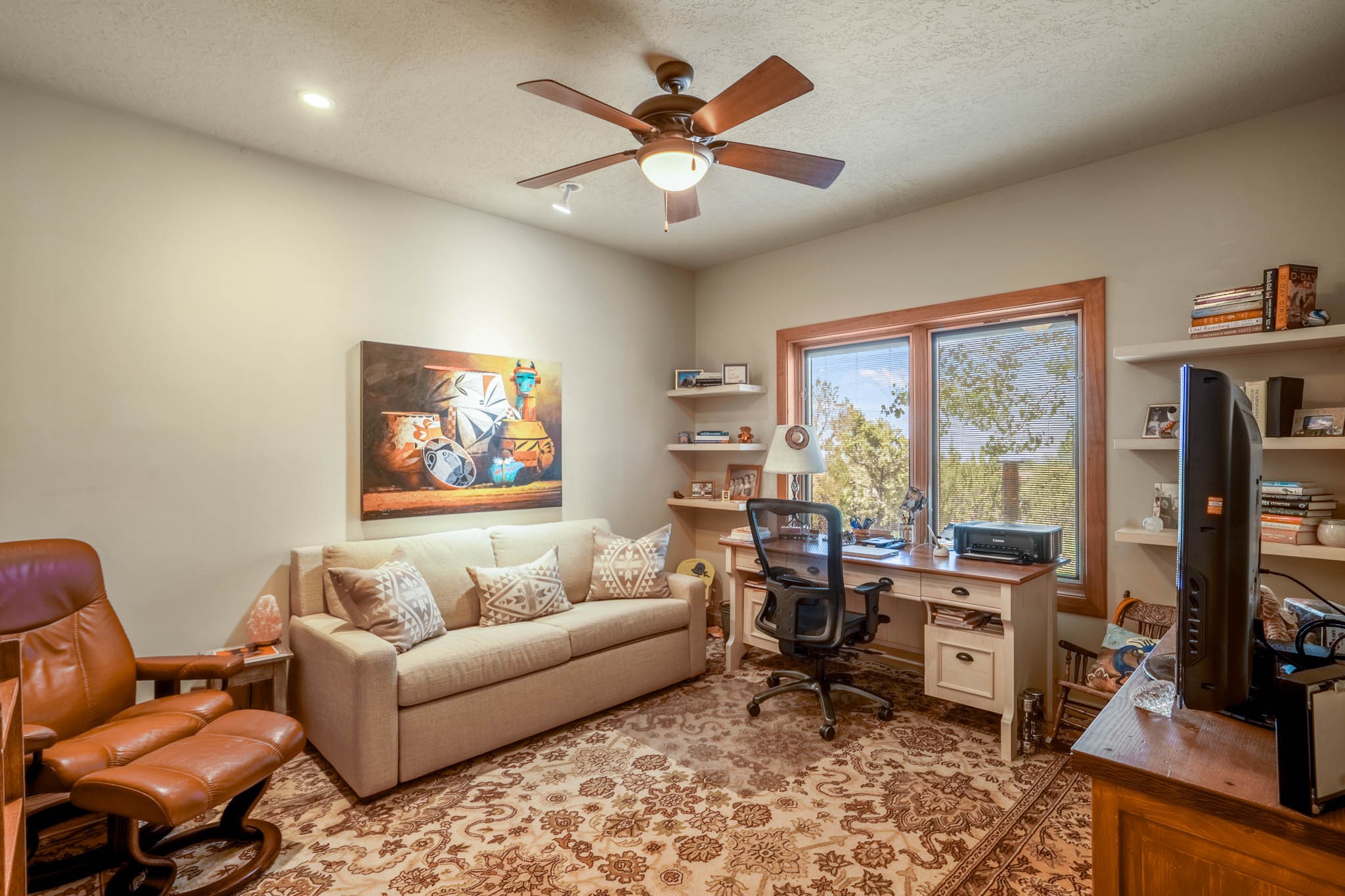 Perched on nearly 2 acres at the peak of Las Estrellas, this elegant 3-bedroom, 3-bathroom home offers sweeping views of the Sangre de Cristo Mountains and the serene lifestyle Santa Fe is known for. Just minutes from the historic Plaza, this 2771sq.ft. residence, built in 2007 by Beverly Chapman and lovely maintained by it's owners, is move in ready and full of timeless charm. Designed with both comfort and entertaining in mind, the home features a gracious floor plan with a formal dining room, living room and a cozy den anchored by a traditional Kiva fireplaces. The gourmet kitchen is a chef's dream, outfitted with high-end appliances, granite countertops and abundant storage. Additional highlights include a generous 3 car garage with built-in storage and thoughtful finishes throughout that reflect the understated elegance of Santa Fe living.