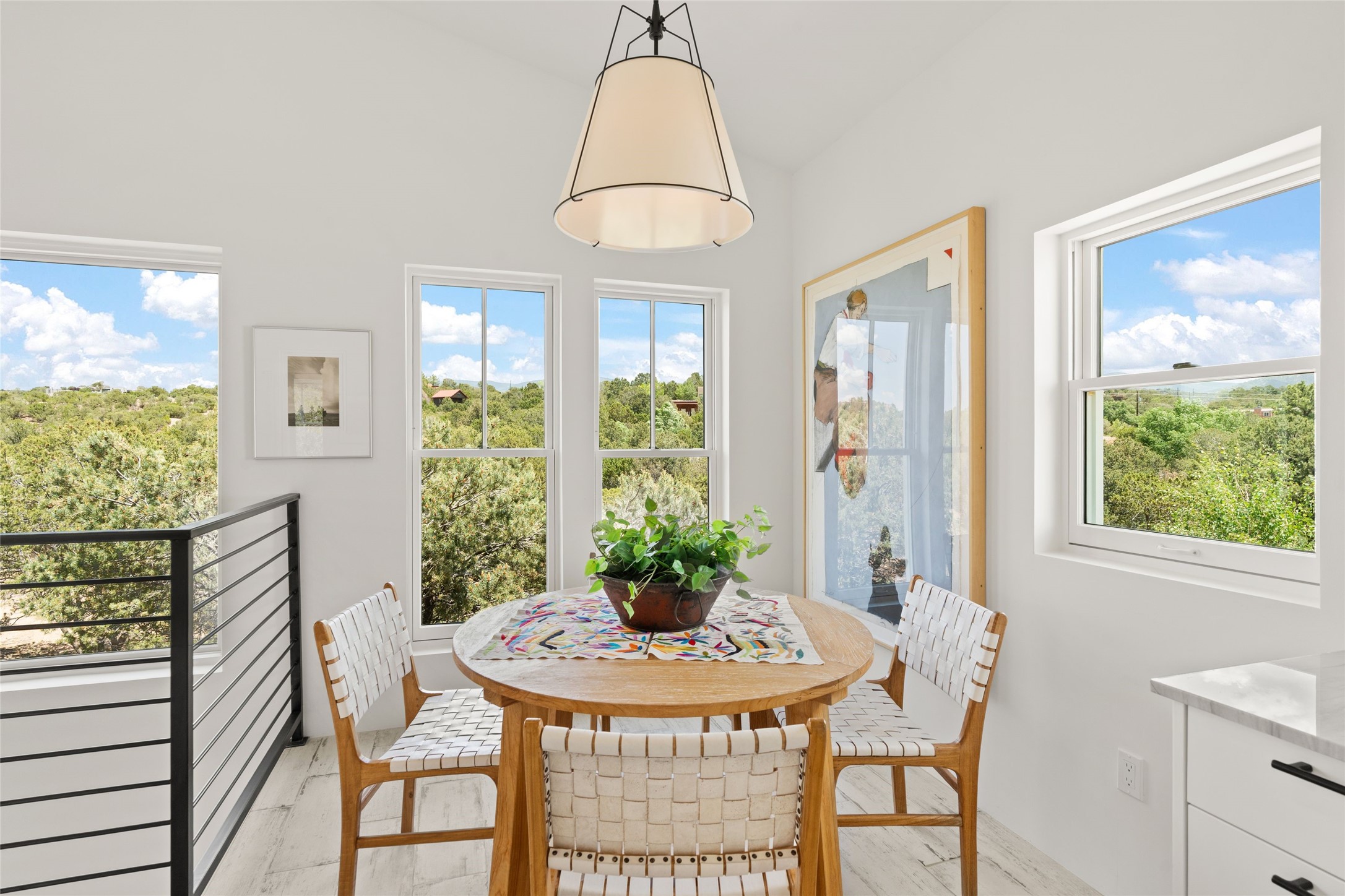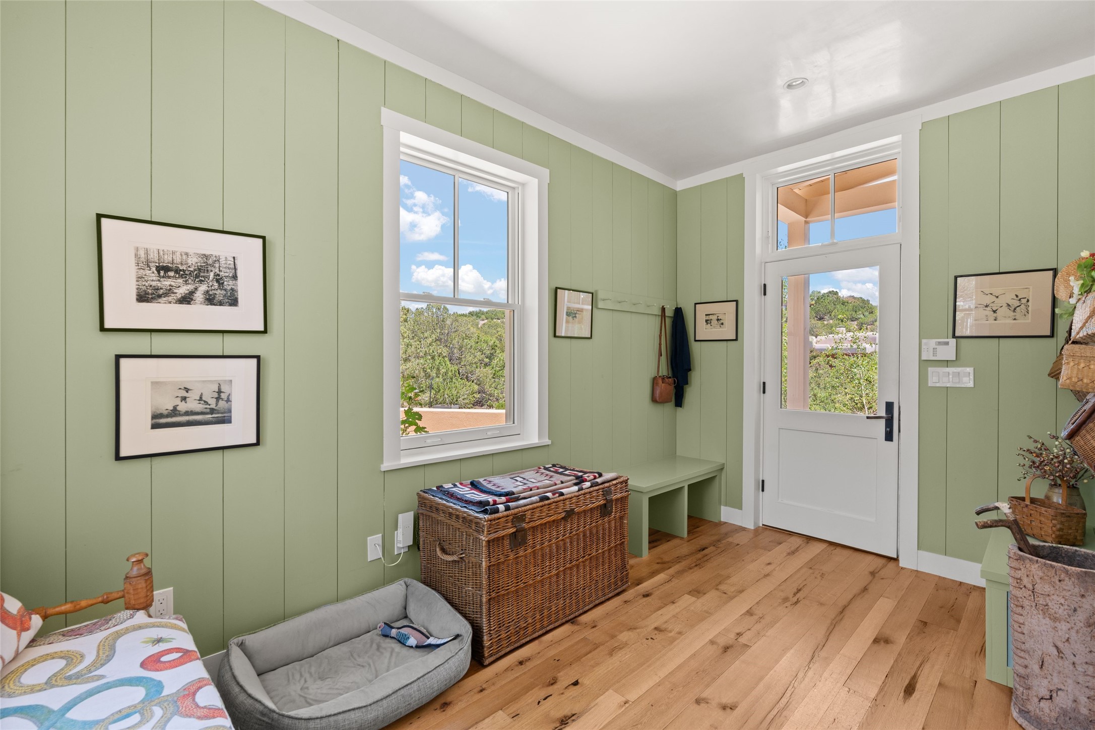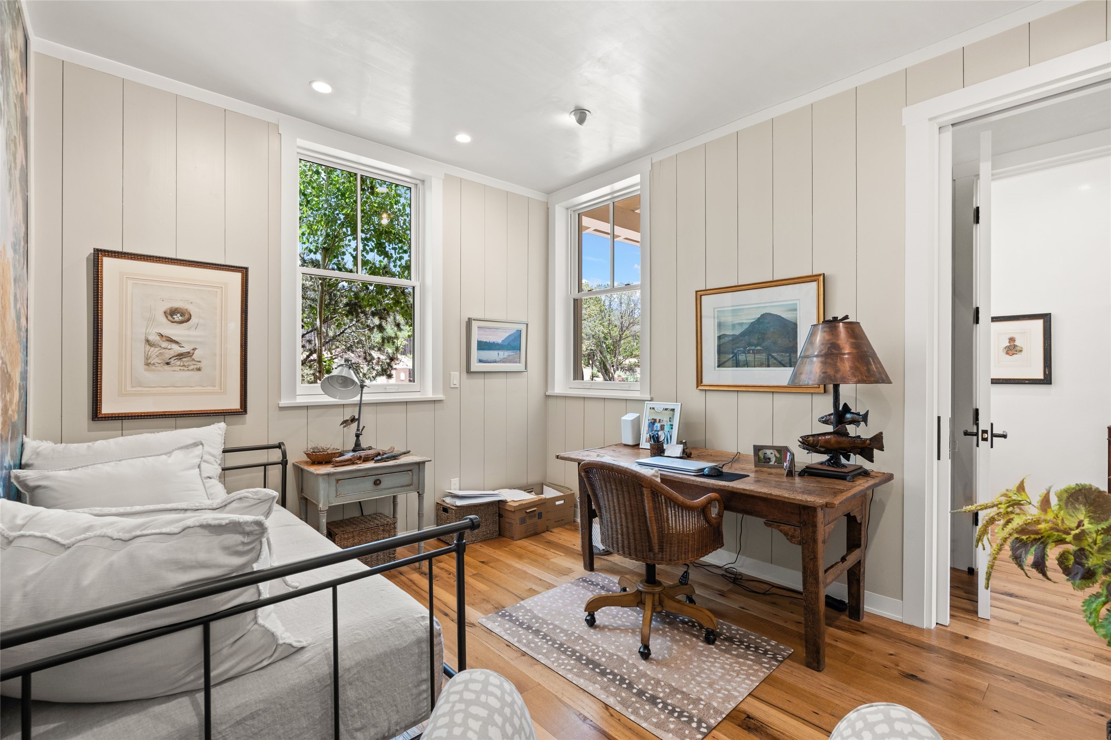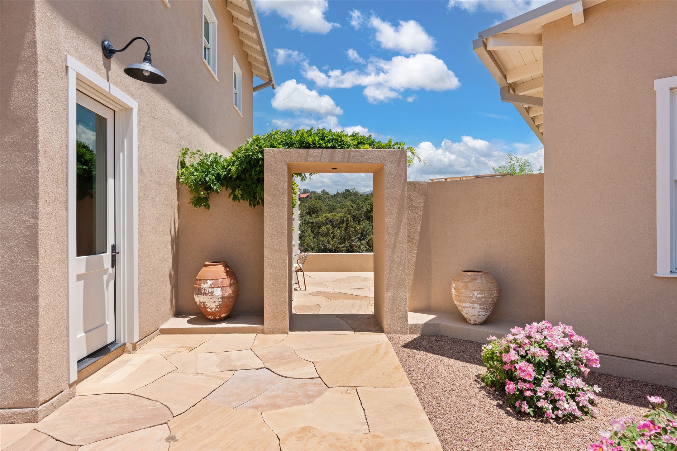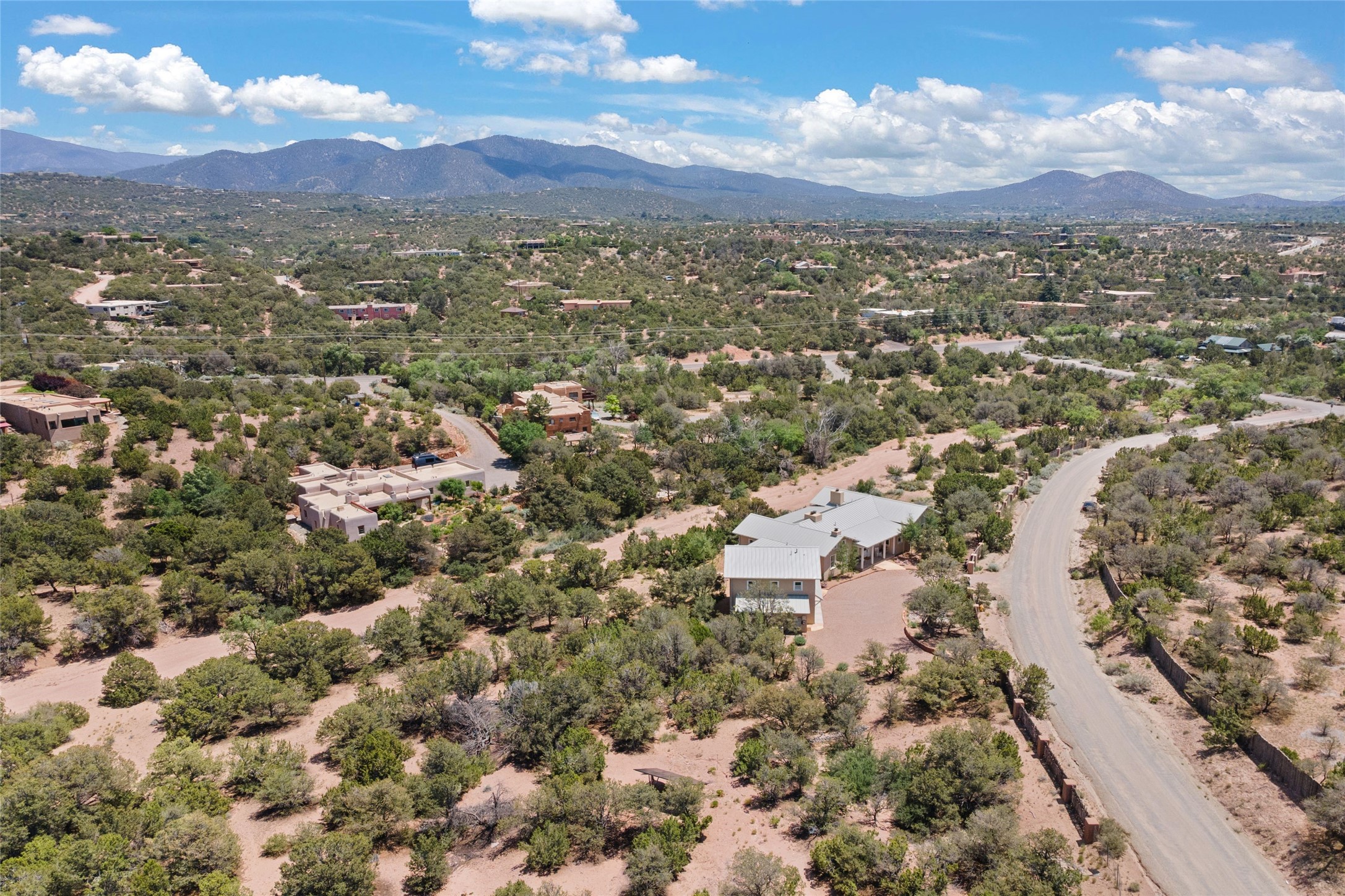 A masterpiece in Design and Location- Nestled in a premier address, this property s a gem that harmoniously blends sophisticated construction with natural beauty. Meticulously built by award winning Woods Construction, the home exudes exceptional craftsmanship, offering elegant yet comfortable living experience. Step inside to discover a space that is as gracious as it is inviting. The interior design showcases an array of unique details including: reclaimed oak floors, stunning ship-lath walls, and smooth diamond plaster that add texture and warmth to the home. Soaring ceilings and large picture windows bathe the interior in natural ight, while also framing sweeping views of the mountain desert landscape.The spacious 2 bedroom, 1 1/2 bath main house is a perfect retreat. The primary suite offers both luxury and privacy, featuring an elegant, wood paneled library that separates it from the rest of the home. A second bedroom is a versatile space that lends itself to an office, if needed.Above the detached garage, you will find a generously sized guest apartment with a living room and kitchen and offering superb views of the Sangres. Adjacent to the garage is a climatized workspace, perfect for converting into a wine cellar or studio. Spanning 2.4 acres, this lovely property celebrates the rugged beauty of the surrounding arroyo. The back portal of the main house is a protected spot for year round entertaining. This is more than a home - it is a sanctuary where every detail has been carefully considered to create a special and serene environment.