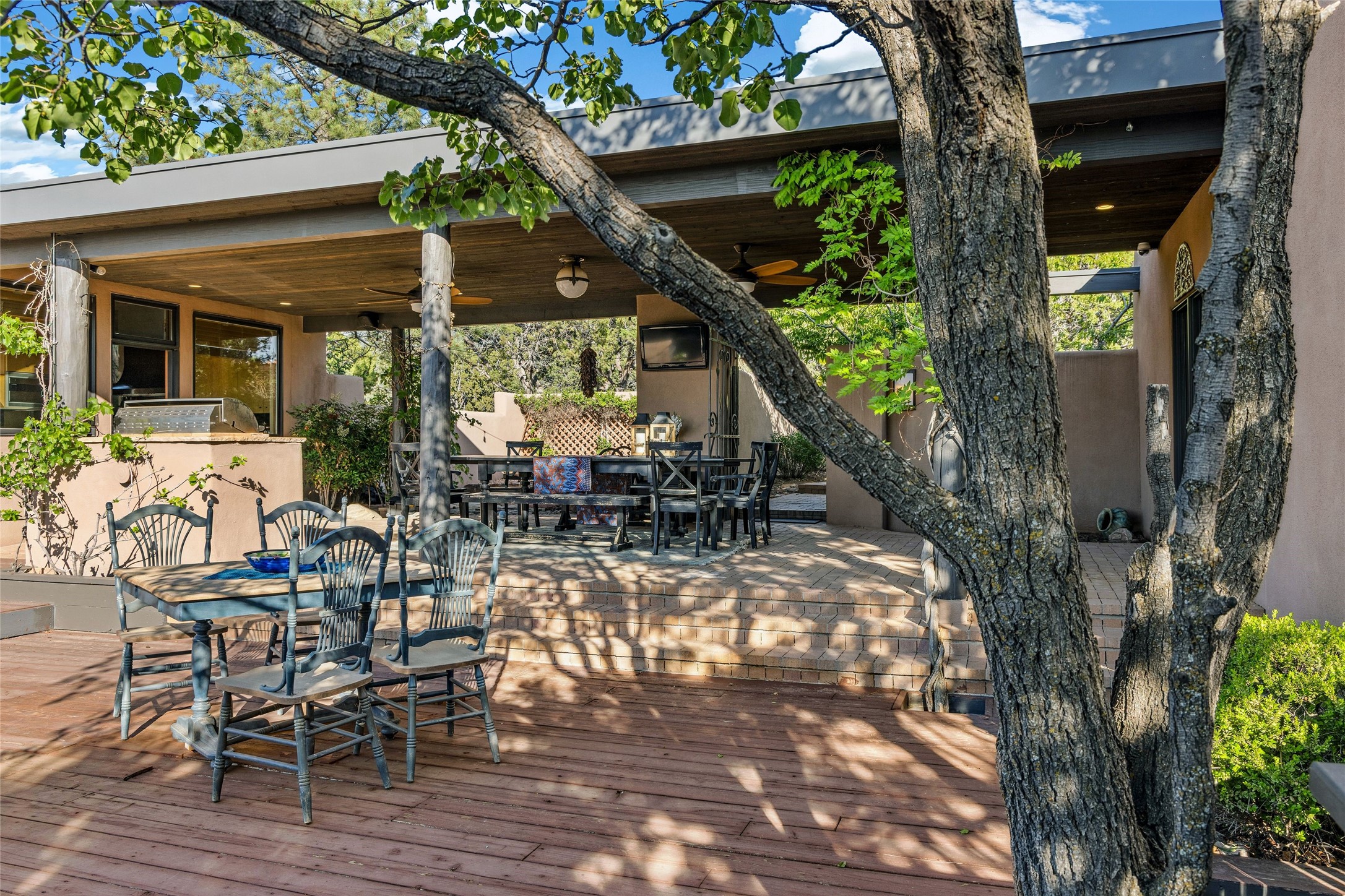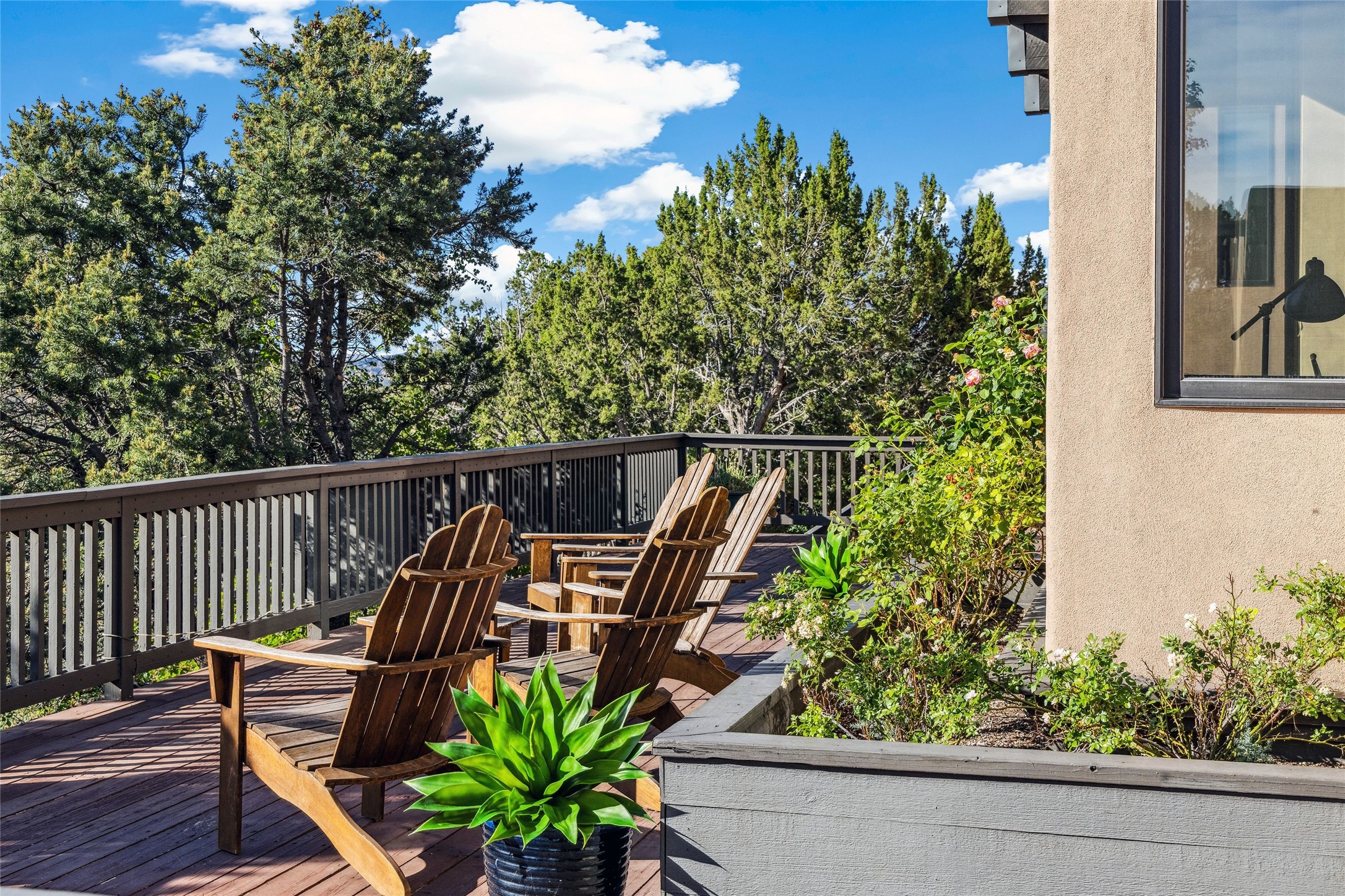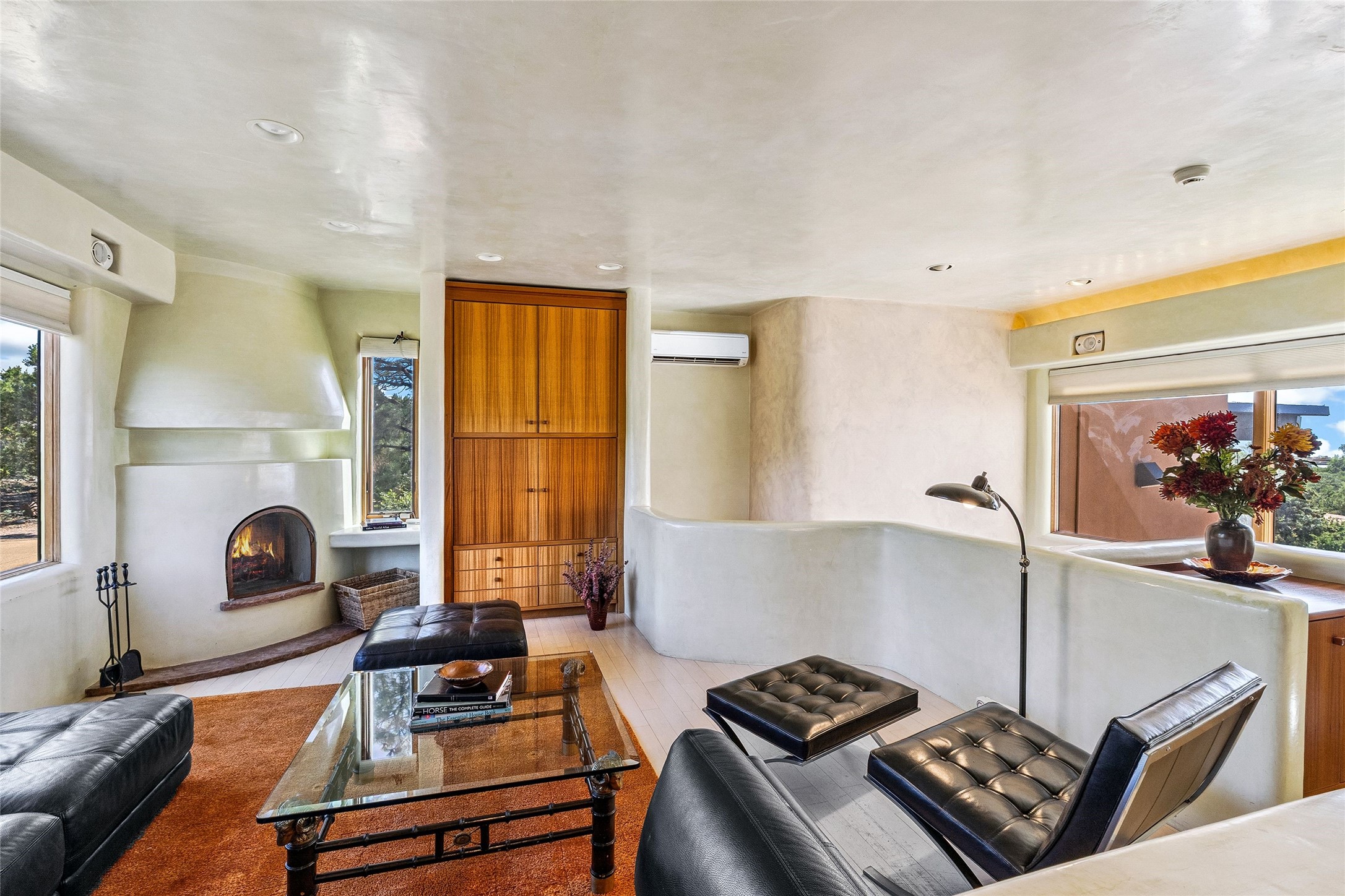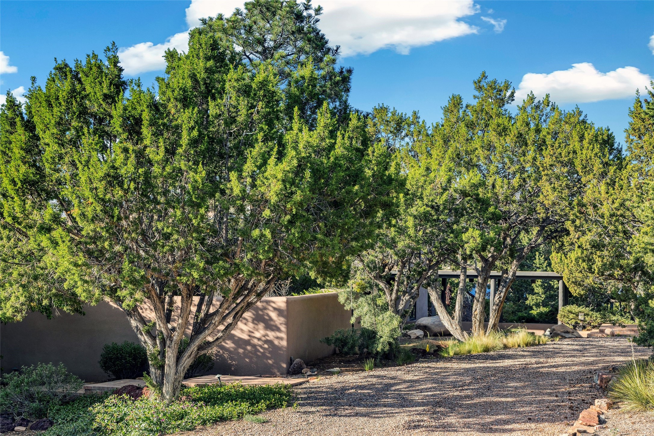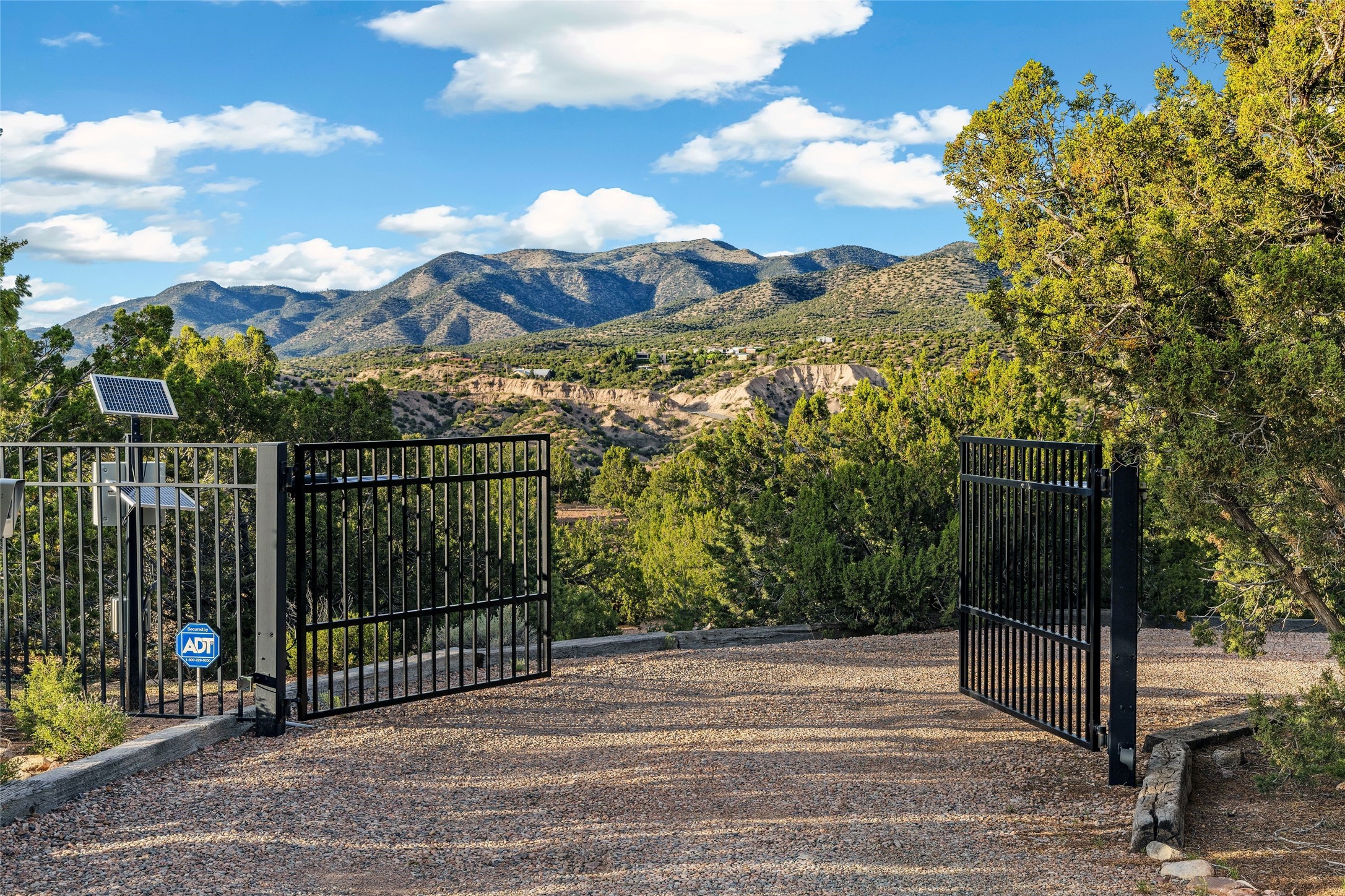 Contemporary Serenity with Panoramic Mountain Views in Vista Redonda: This gated sanctuary sits on 5.08 acres in the sought-after Vista Redonda neighborhood which is perched high on its own mesa. 54 Paseo Encantado offers awe-inspiring vistas of both the rugged Sangre de Cristo range to the east and the dramatic Jemez Mountains to the west--from sunrise to sunset, the views are nothing short of breathtaking.This architect designed 4-bedroom, 3-bath home spans 3,489 square feet and reflects a timeless contemporary design that complements its natural surroundings. With only three owners since its construction in 1973, it retains much of its original character and charm and was carefully maintained and thoughtfully preserved for over 21 years by the current owners. The layout is both functional and inviting. The main level features grand living and dining spaces that flow naturally to multiple outdoor living areas, including a deep covered portal ideal for al fresco dining. Just a few steps above the main floor is the spacious primary suite which includes a second living room with kiva fireplace and bar--perfect for quiet evenings or morning coffee with a view. Below the main level are three guest bedrooms and two baths, creating separation and privacy for family or visitors.The property includes a winding gravel drive, a two-car garage connected to the covered portal, mature native landscaping and ample flat buildable space should one wish to add a casita, guest house, or studio.A large solar array, installed in 2019, brings an added layer of energy efficiency to the property. Located just minutes from the Santa Fe National Forest, Four Seasons Resort Rancho Encantado, the Santa Fe Opera, Tesuque Village Market and approximately 15 minutes to all the cultural amenities of downtown Santa Fe, this rare offering in Vista Redonda is a private retreat with enduring style and soul.