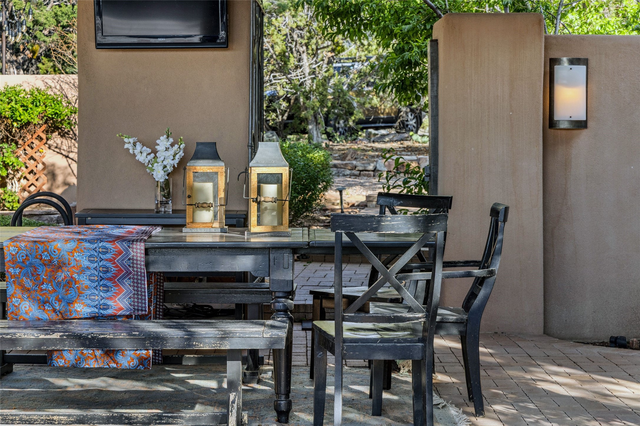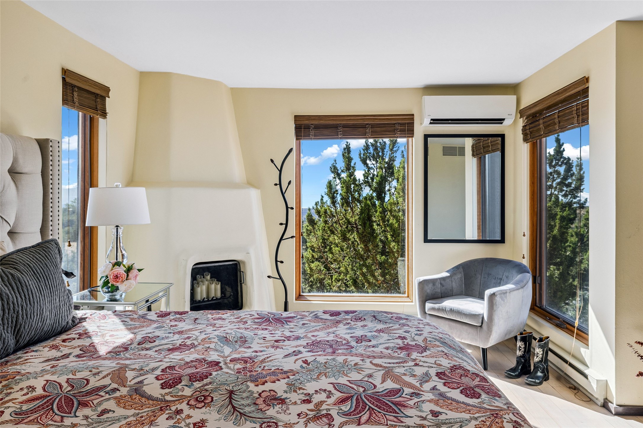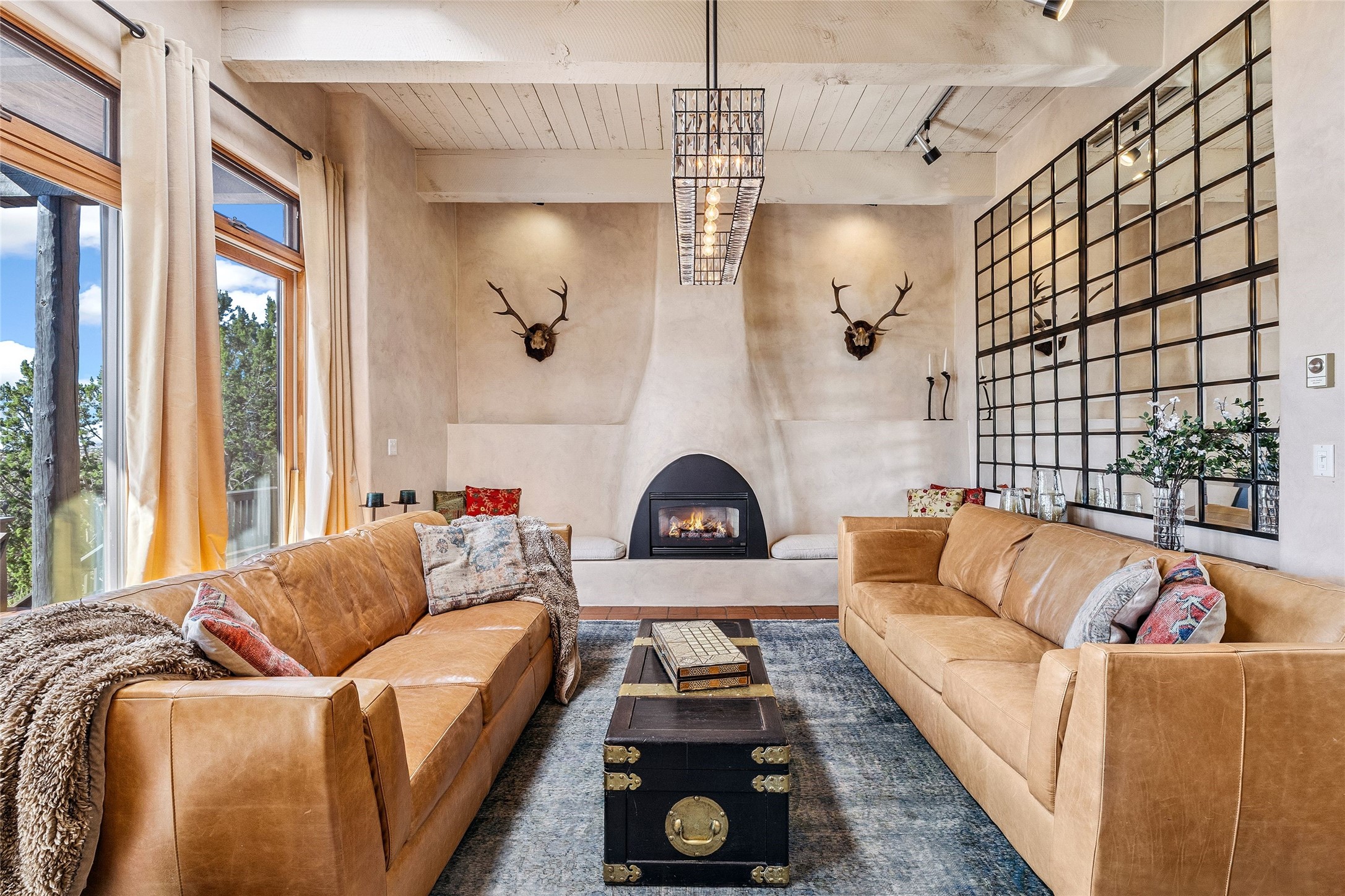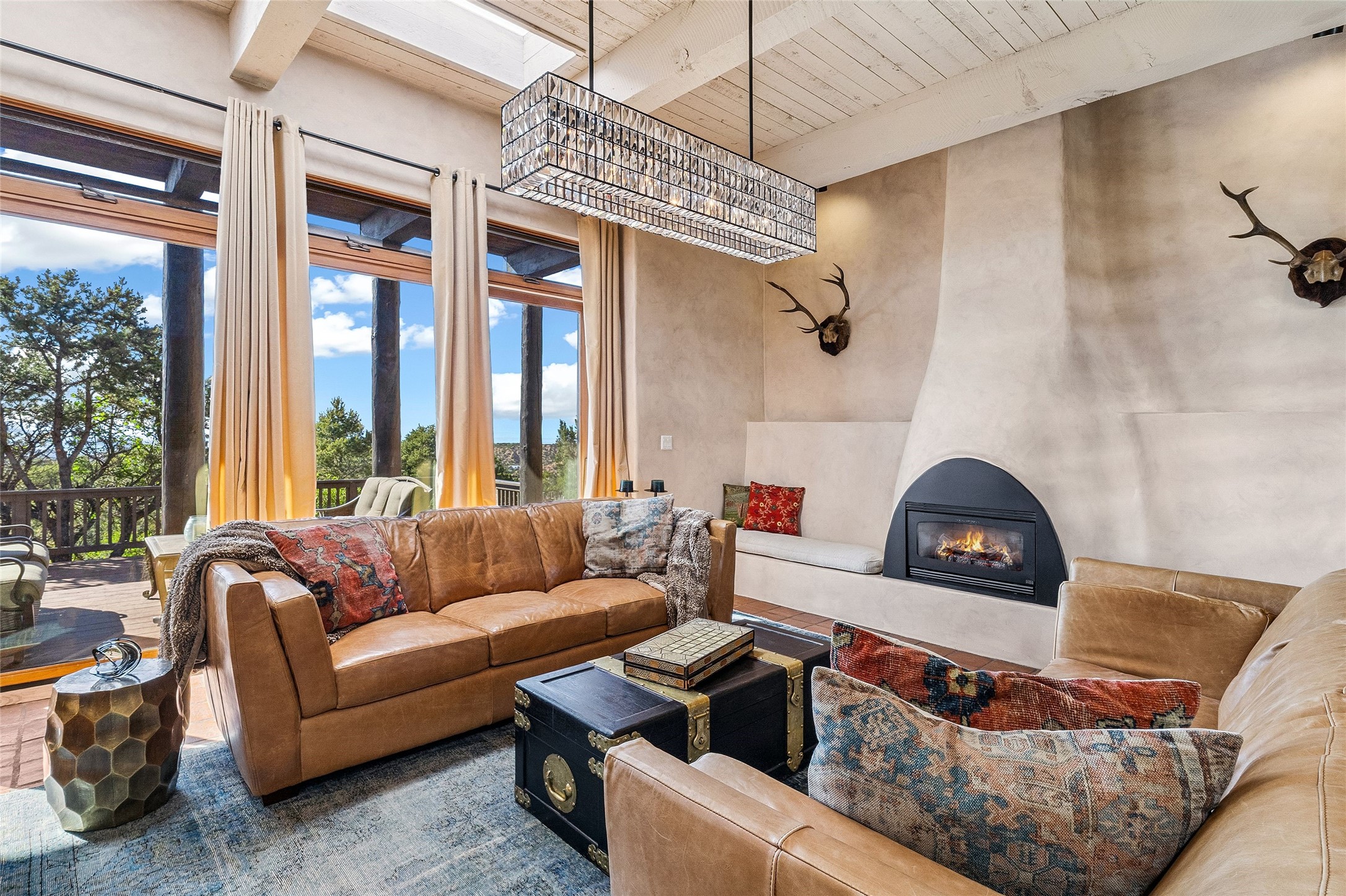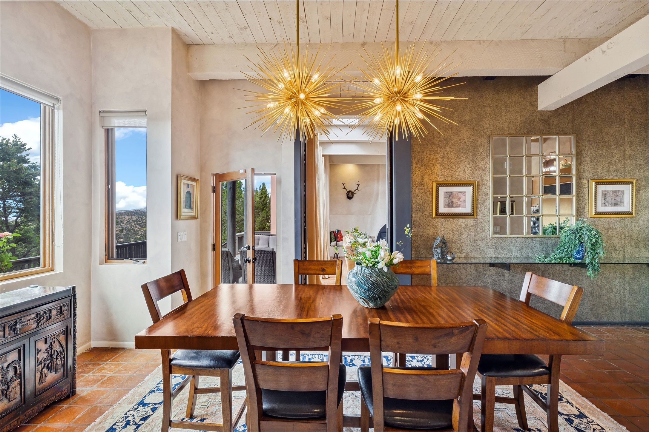 Contemporary Serenity with Panoramic Mountain Views in Vista Redonda: This gated sanctuary sits on 5.08 acres in the sought-after Vista Redonda neighborhood which is perched high on its own mesa. 54 Paseo Encantado offers awe-inspiring vistas of both the rugged Sangre de Cristo range to the east and the dramatic Jemez Mountains to the west--from sunrise to sunset, the views are nothing short of breathtaking.This architect designed 4-bedroom, 3-bath home spans 3,489 square feet and reflects a timeless contemporary design that complements its natural surroundings. With only three owners since its construction in 1973, it retains much of its original character and charm and was carefully maintained and thoughtfully preserved for over 21 years by the current owners. The layout is both functional and inviting. The main level features grand living and dining spaces that flow naturally to multiple outdoor living areas, including a deep covered portal ideal for al fresco dining. Just a few steps above the main floor is the spacious primary suite which includes a second living room with kiva fireplace and bar--perfect for quiet evenings or morning coffee with a view. Below the main level are three guest bedrooms and two baths, creating separation and privacy for family or visitors.The property includes a winding gravel drive, a two-car garage connected to the covered portal, mature native landscaping and ample flat buildable space should one wish to add a casita, guest house, or studio.A large solar array, installed in 2019, brings an added layer of energy efficiency to the property. Located just minutes from the Santa Fe National Forest, Four Seasons Resort Rancho Encantado, the Santa Fe Opera, Tesuque Village Market and approximately 15 minutes to all the cultural amenities of downtown Santa Fe, this rare offering in Vista Redonda is a private retreat with enduring style and soul.