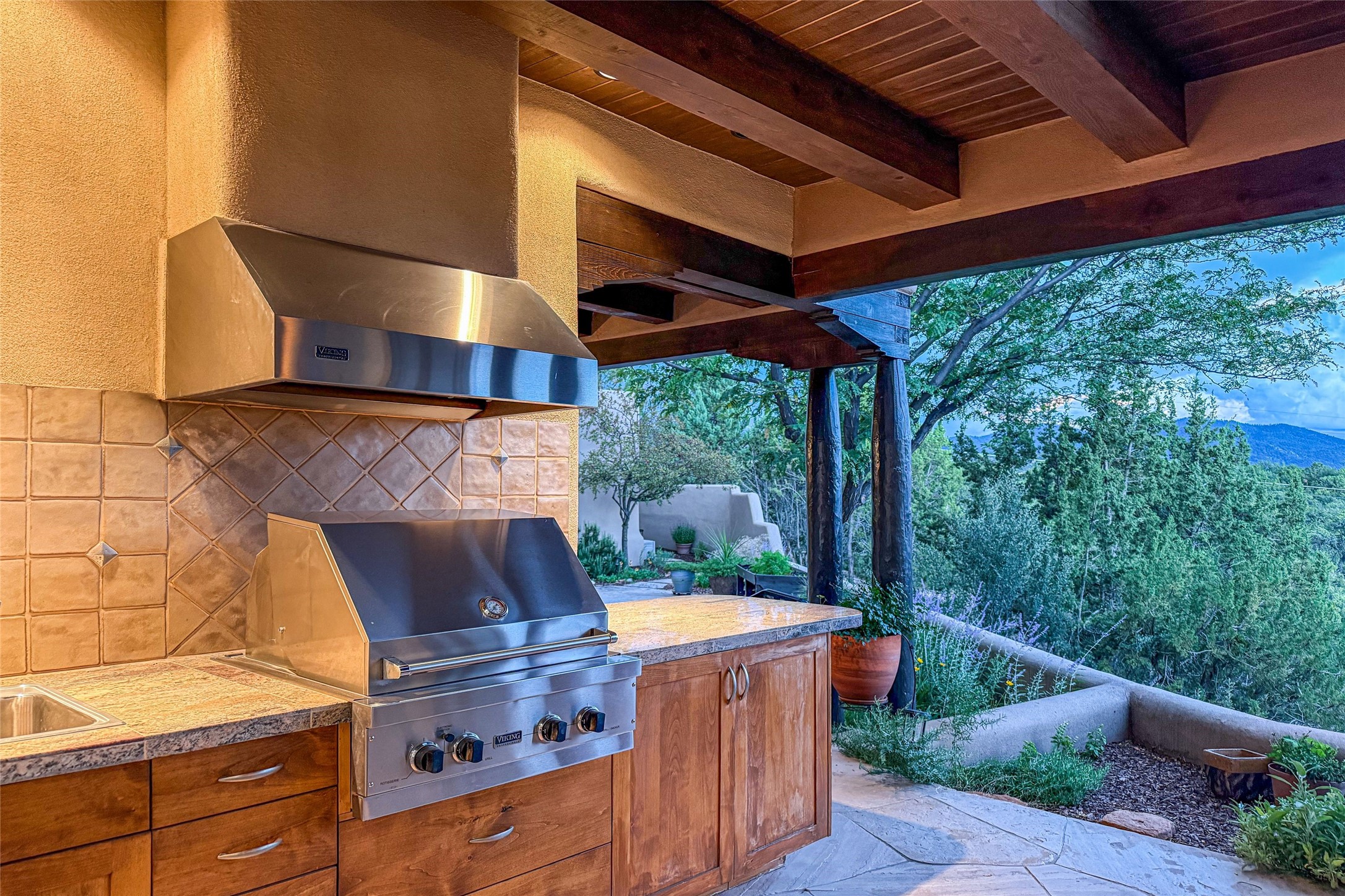 Discover panoramic views and refined details throughout this beautifully crafted pueblo style residence by renowned builder Bruce Thompson. With 3 beds/4 baths (including 2 primary suites) and 4,875 sq. feet, plus elegant finishes like diamond plaster walls and features like ceiling beams and stained glass doorways, this home blends luxury with timeless character. The grand entry reveals soaring ceilings with clerestory windows, and leads into the heart of the home, a grand living room that showcases city and mountain views and is anchored by a stone fireplace. Designed by David Naylor, the kitchen is a chef's dream--fully updated with high-end appliances including Sub-Zero and Wolf, custom cabinetry, skylight, wine refrigerator, reverse osmosis system, large pantry, and a stylish breakfast nook with a gas fireplace. The Taj Royale Ceasarstone counter tops create a luxurious finish. This home features two primary suites. The first, on its own wing and floor, offers great privacy, a spa-like bath retreat and a balcony with sweeping views. A second primary suite on the main floor is a newer addition built by Cricket Roulette and is perfect for guests or multi-generational living. Also private and peaceful, this large suite has direct access to the main portal and is fully handicap accessible, including the large shower. This addition also features a stone alcove for art display, a family room with gas fireplace, and direct access to the outdoor kitchen. The guest bedroom and office, on the other side of the home, share a private courtyard with a tranquil waterfall feature. This home makes living easy with ample storage spaces, walk-in closets, and a cedar closet.Nestled in the picturesque Vista Encantada neighborhood, centrally and conveniently located between downtown and the opera, this home is an inviting blend of artful design and comfort.