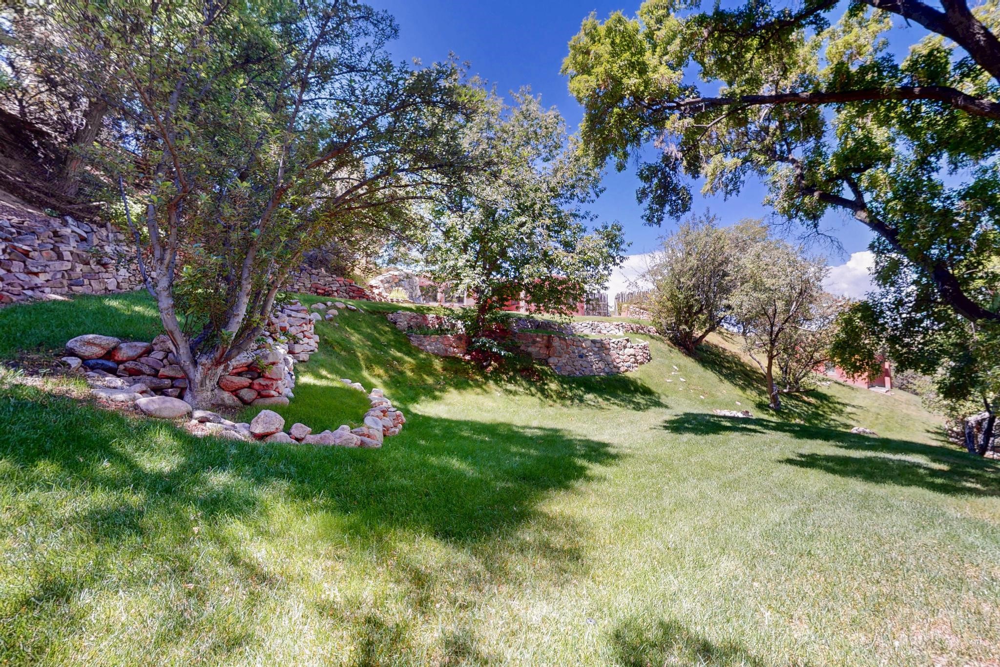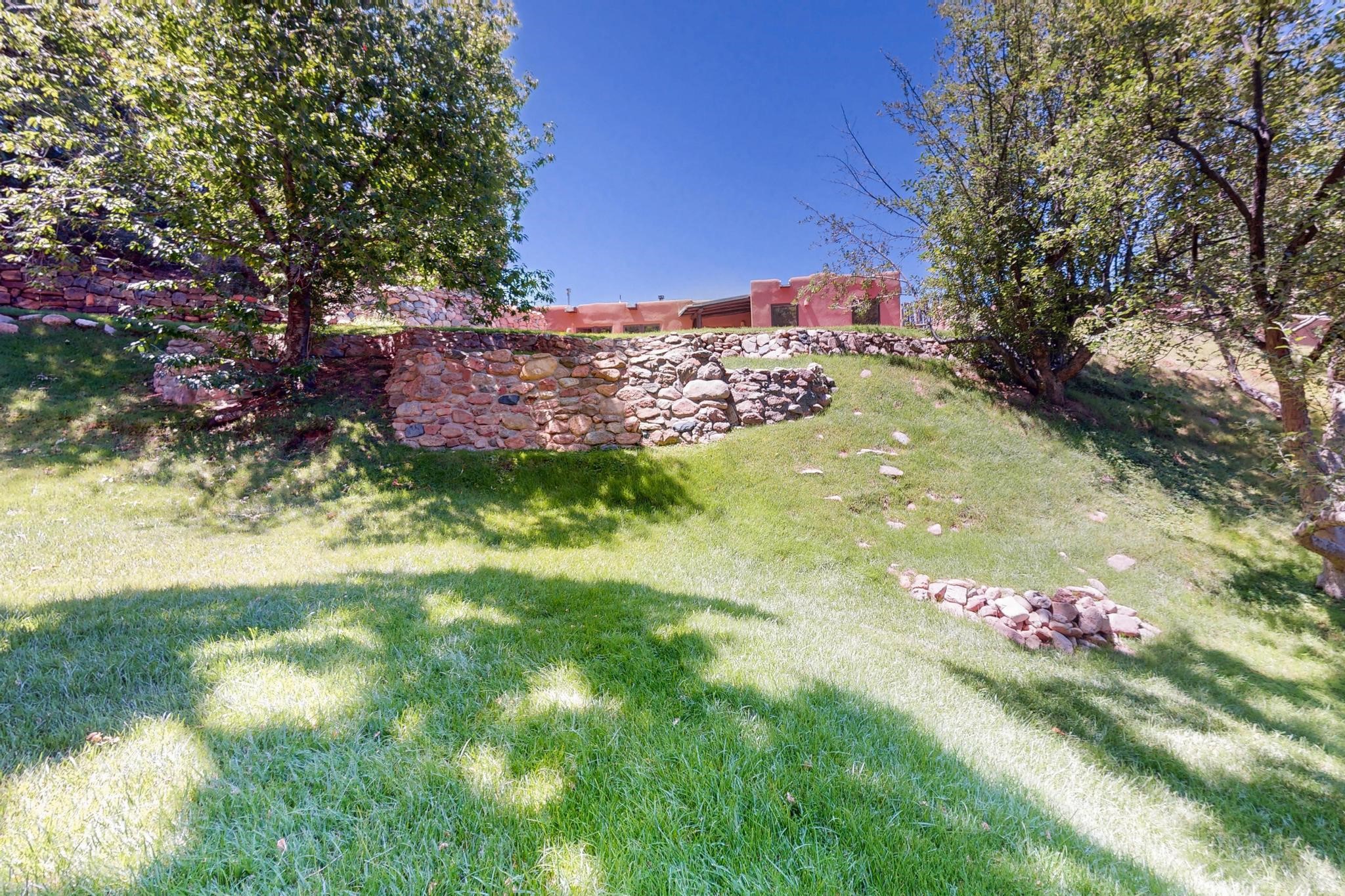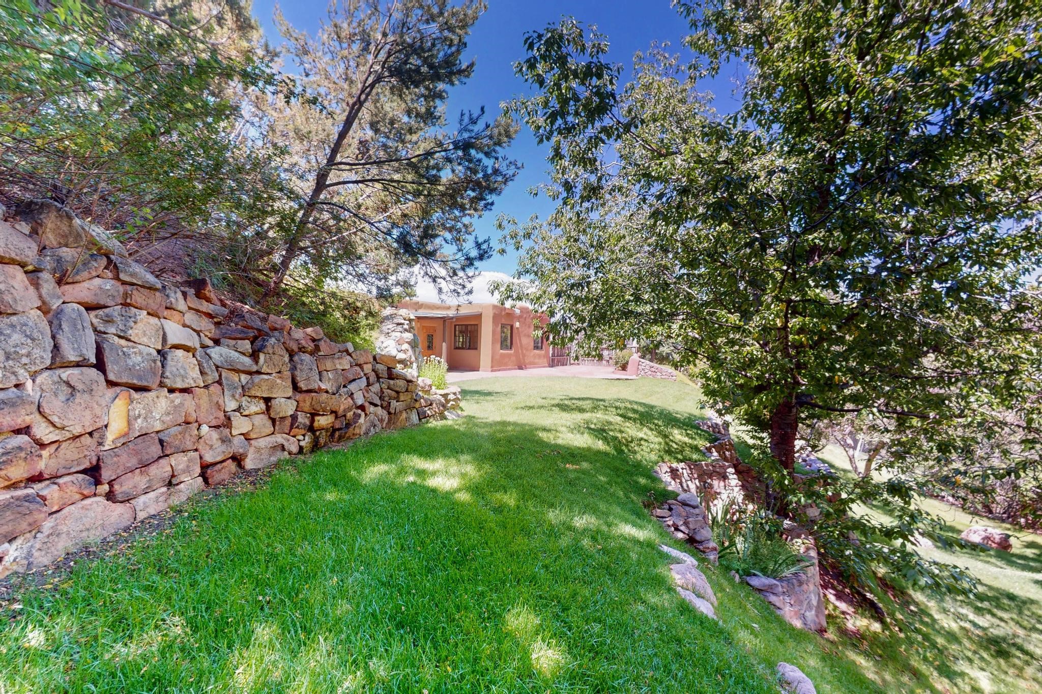 Rare Tesuque Offering & One of the last original Big Tesuque Canyon properties: all adobe and on nearly 9 acres this is a spectacular opportunity! Located at the end of the Canyon and bordering the National Forest, this has unparalleled privacy and quietude. Set in a verdant landscape, this three-bedroom two-bathtwo home is an original, charming adobe pueblo. In addition to this home on the hill, there is an adobe outbuilding which can become a guest house and or studio. There is also a small barn which can be further developed. The home and lovely acreage of sweeping hills, grassy knolls and many fruit trees is irrigated by a private well. Well loved and cared for many years by one family, this is a chance to have an extraordinary piece of beautiful Tesuque. All depictions of furniture are virtually staged.