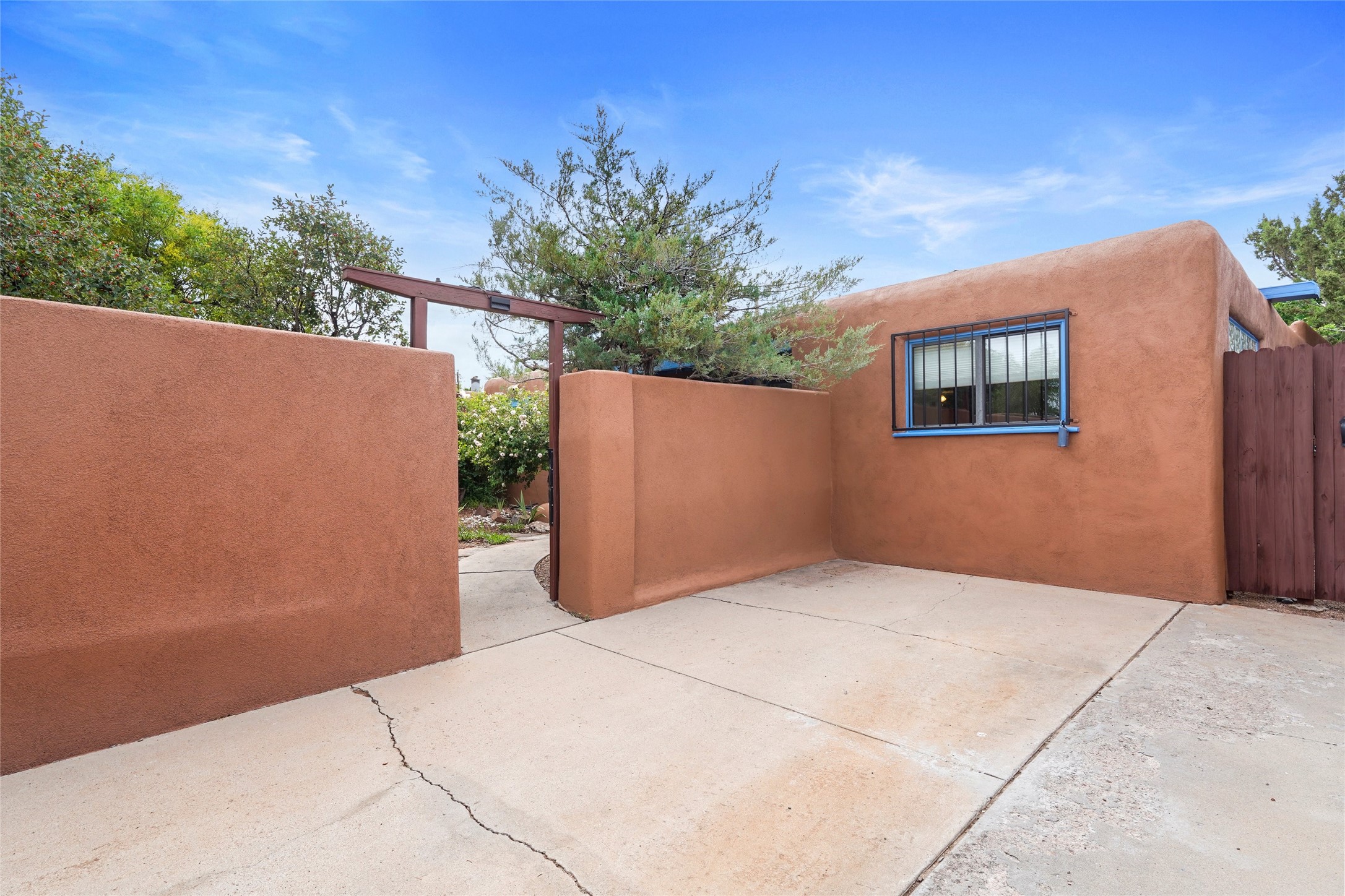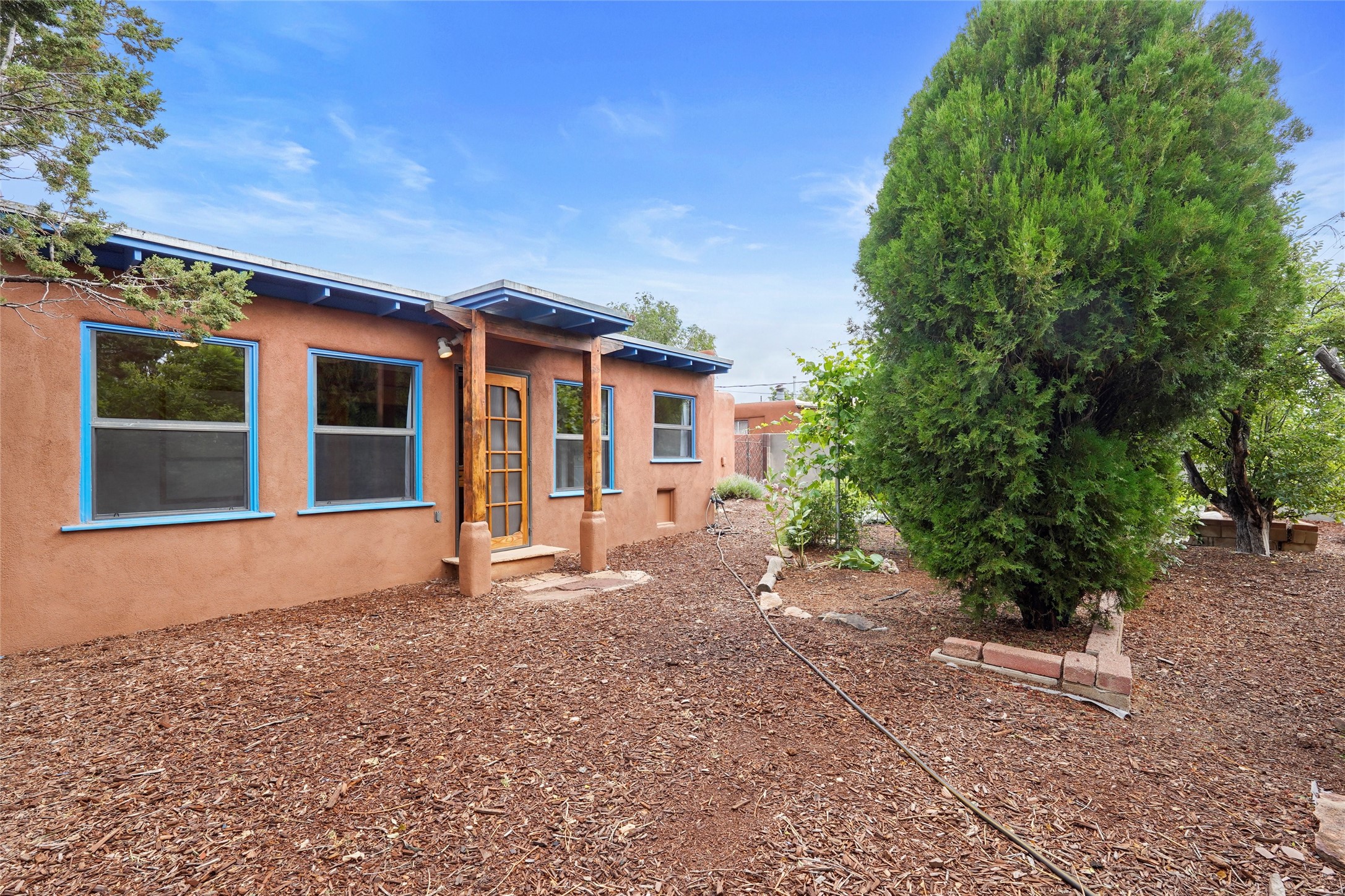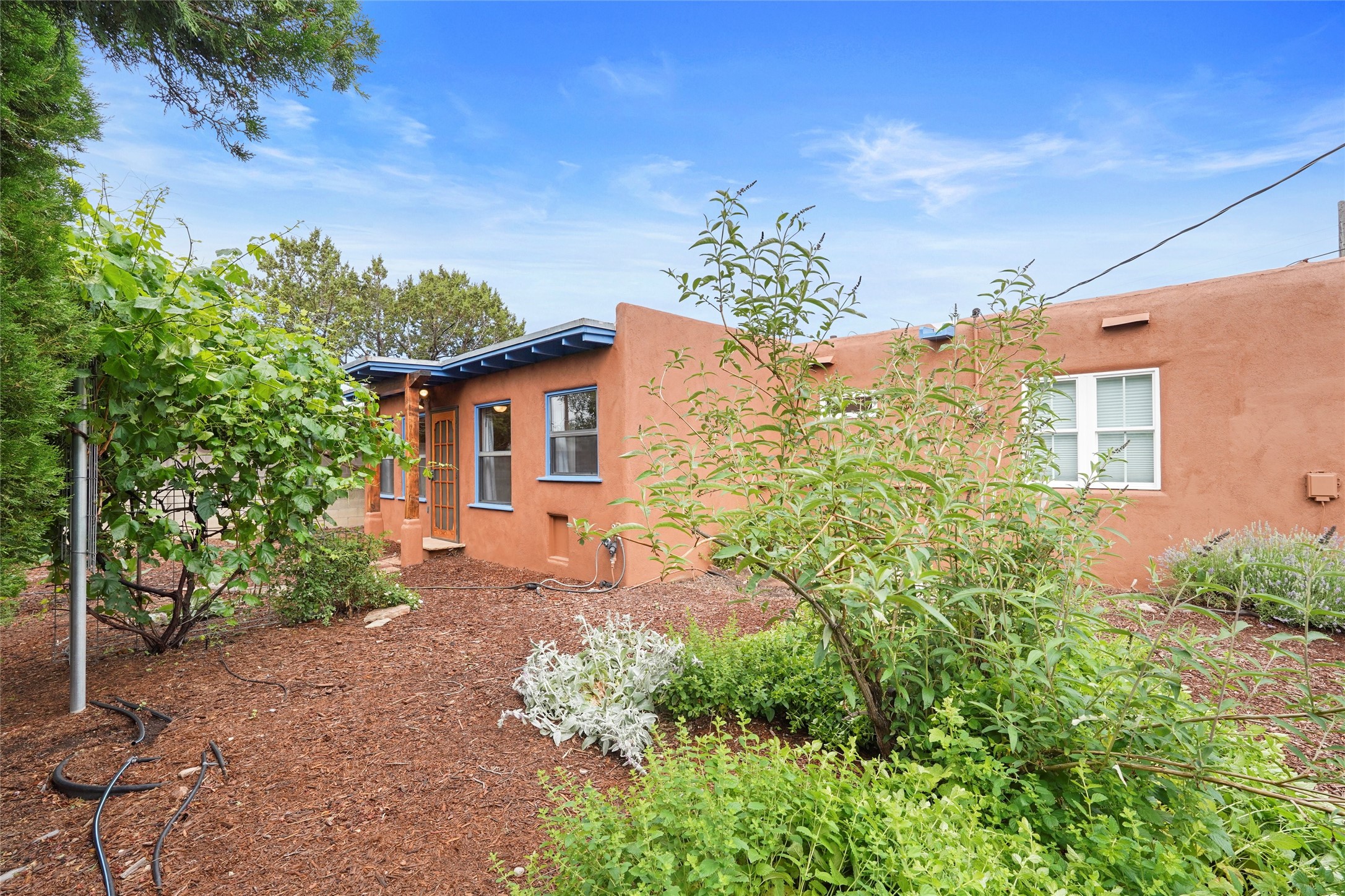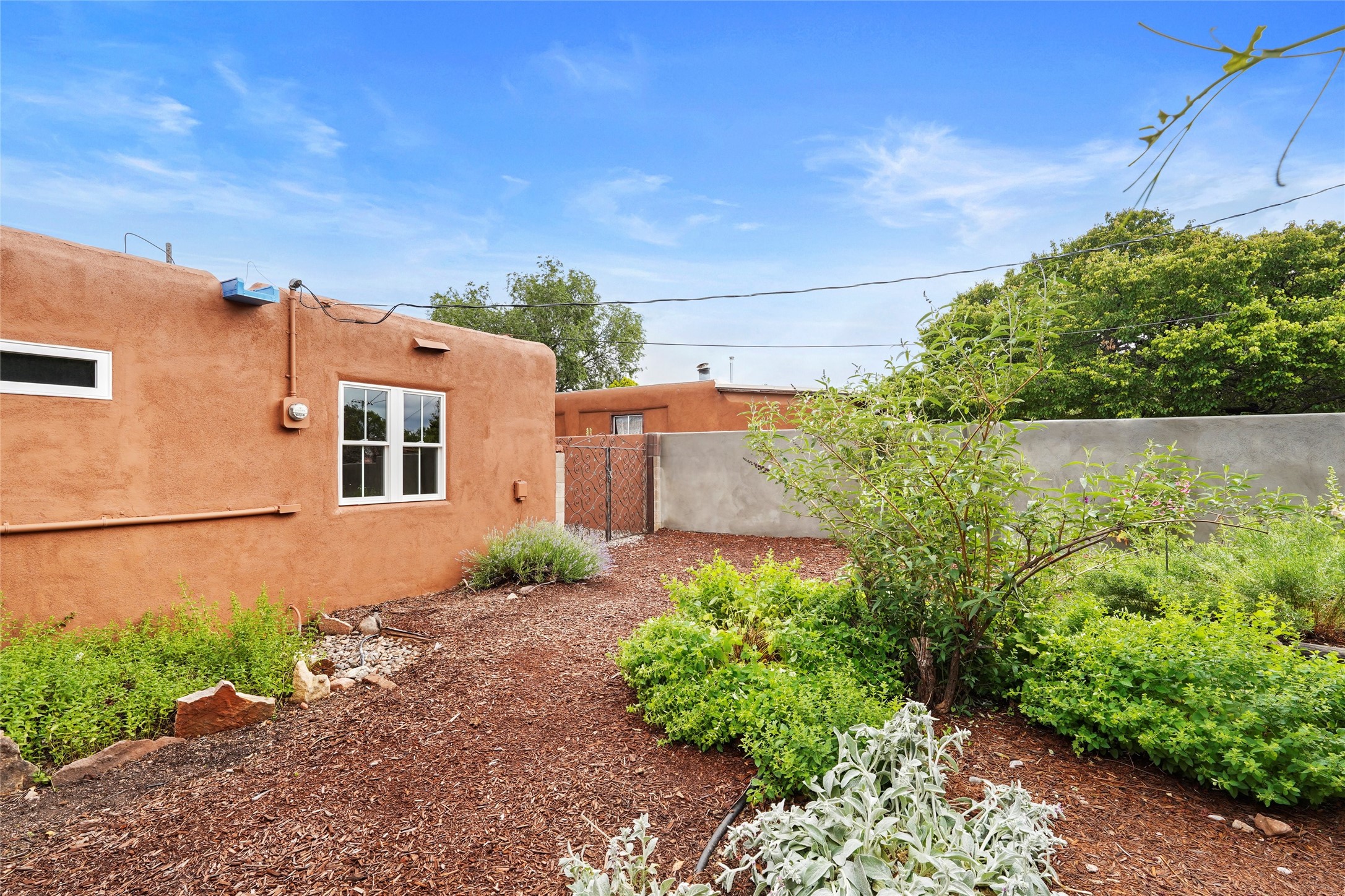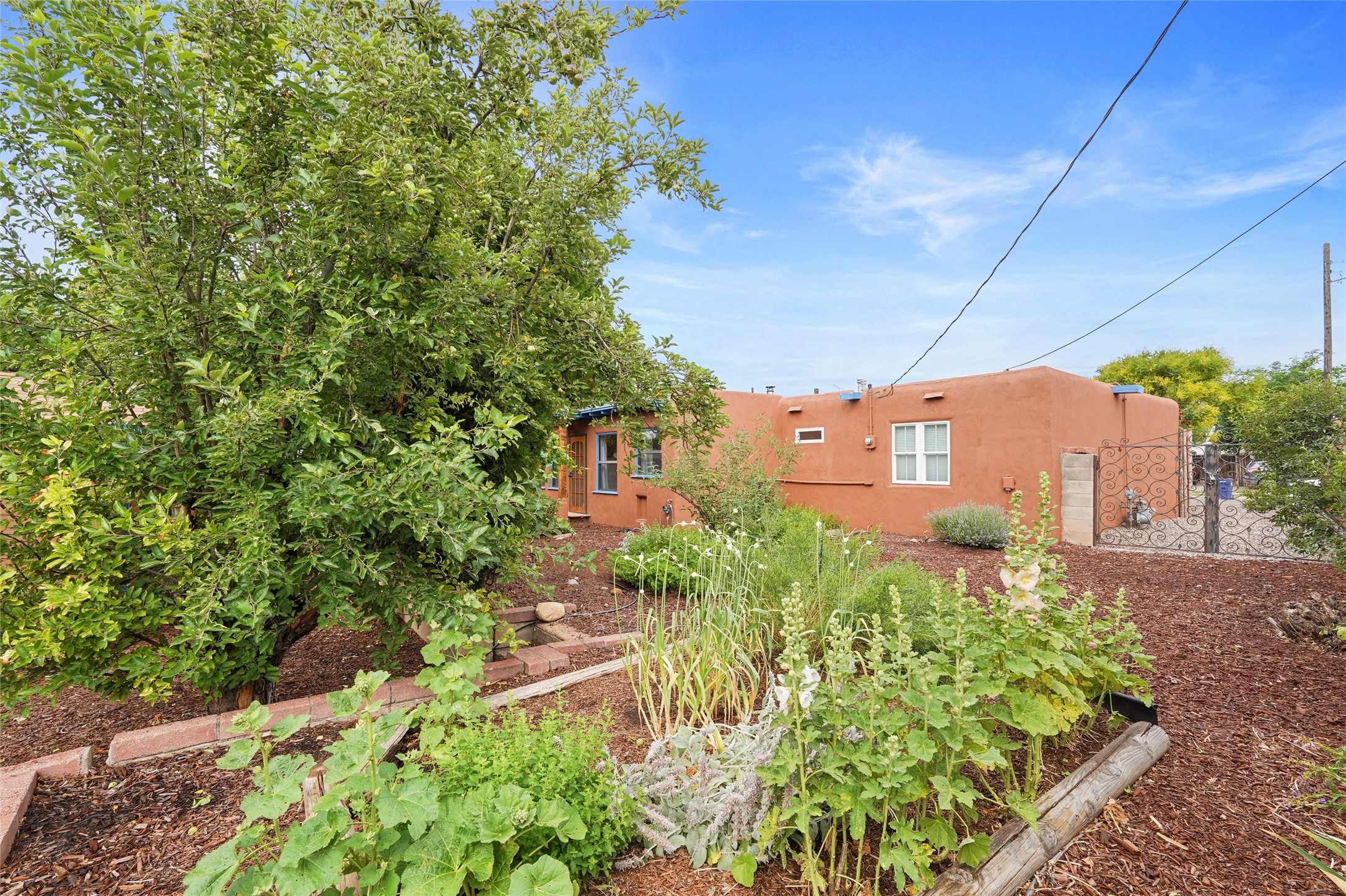 Charming 1,600 sq ft three-bedroom home in the inviting Bellamah neighborhood, steps from schools, parks, bike/walking trails, and the Genoveva Chavez Community Center. This meticulously maintained residence boasts an open-concept living room, carpeted den, dining area, and kitchen featuring custom natural wood cabinets with ample storage. The south-facing living space is accented by elegant wood pillars, beams, and corbels, with large windows flooding the area with natural light and offering views of the lush dream like courtyard. All new paint inside and out. Enjoy cozy winters with a free-standing wood stove, complemented by rich Talavera Saltillo tile throughout. A spacious laundry room adds convenience. Outside, thrive in well-tended organic front and back gardens, with a fully enclosed, expansive backyard. Off-street parking flanks both sides of the front yard, and a lockable shed provides extra storage. Move-in ready, this pristine home awaits its new owner!