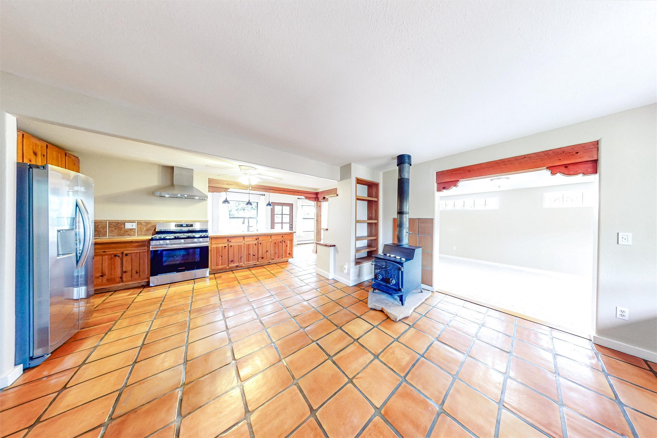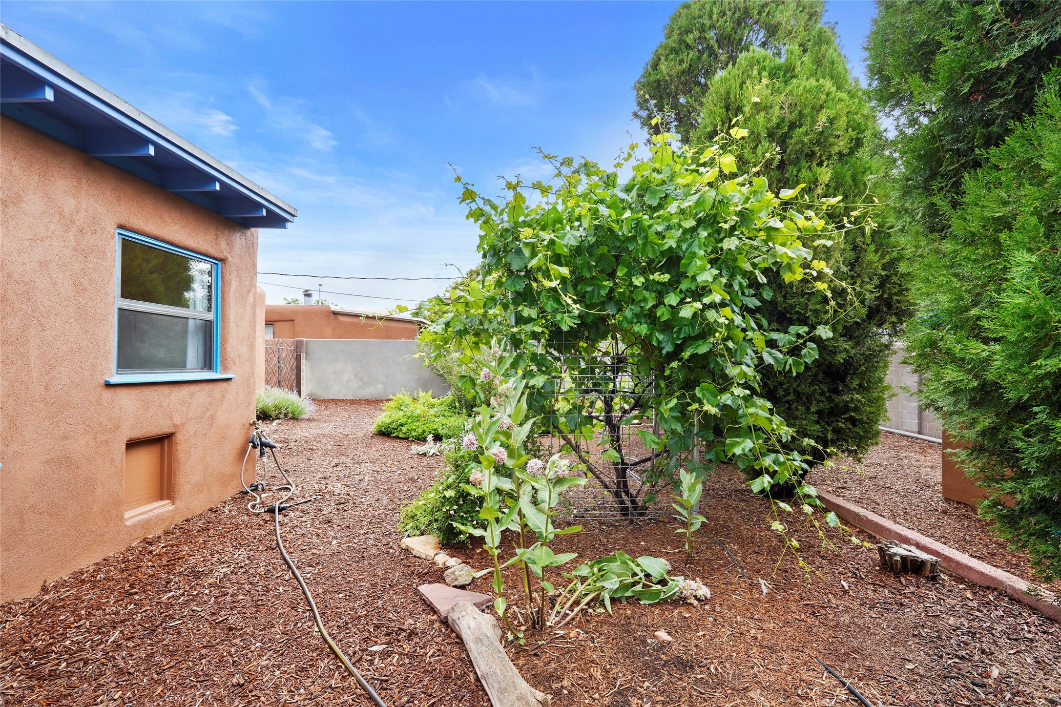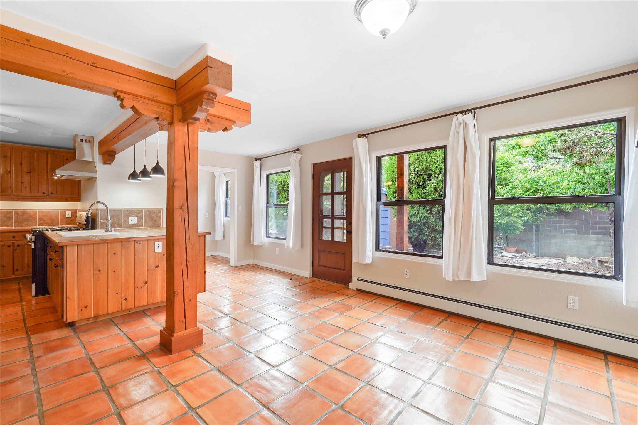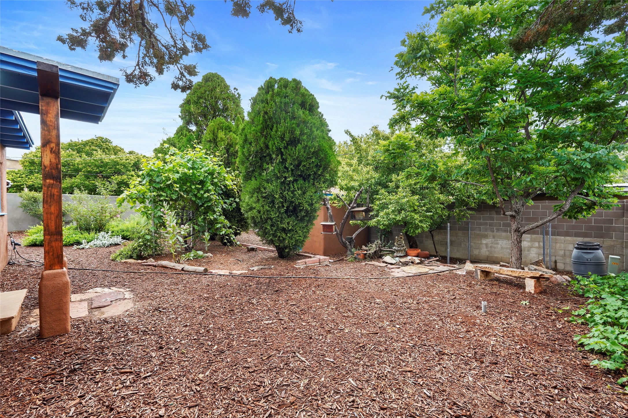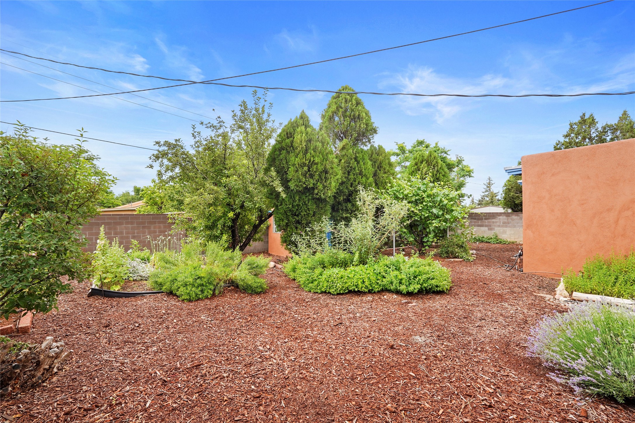 Charming 1,600 sq ft three-bedroom home in the inviting Bellamah neighborhood, steps from schools, parks, bike/walking trails, and the Genoveva Chavez Community Center. This meticulously maintained residence boasts an open-concept living room, carpeted den, dining area, and kitchen featuring custom natural wood cabinets with ample storage. The south-facing living space is accented by elegant wood pillars, beams, and corbels, with large windows flooding the area with natural light and offering views of the lush dream like courtyard. All new paint inside and out. Enjoy cozy winters with a free-standing wood stove, complemented by rich Talavera Saltillo tile throughout. A spacious laundry room adds convenience. Outside, thrive in well-tended organic front and back gardens, with a fully enclosed, expansive backyard. Off-street parking flanks both sides of the front yard, and a lockable shed provides extra storage. Move-in ready, this pristine home awaits its new owner!