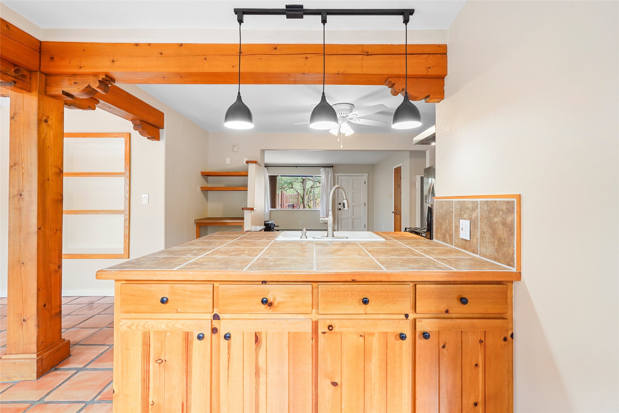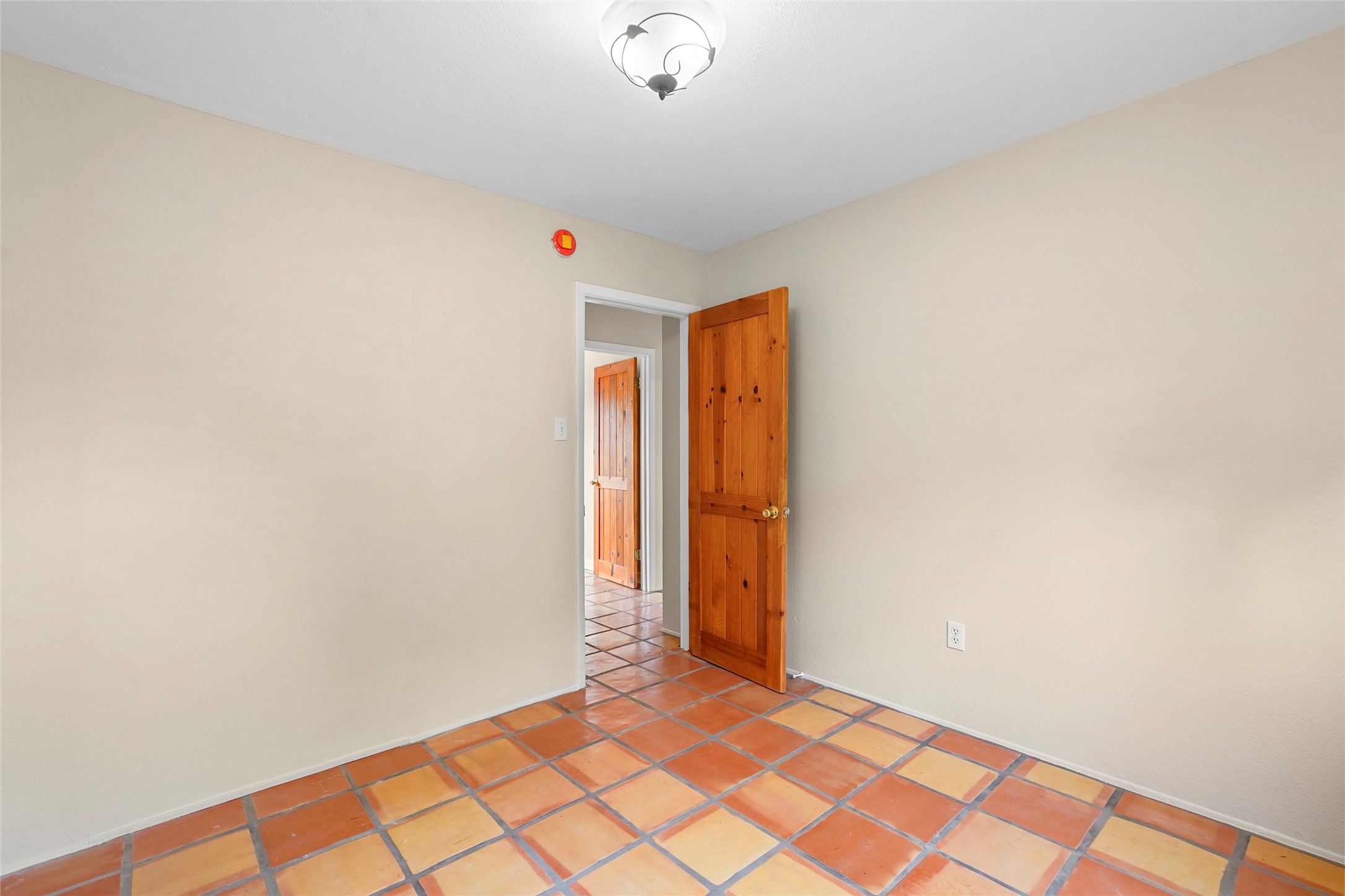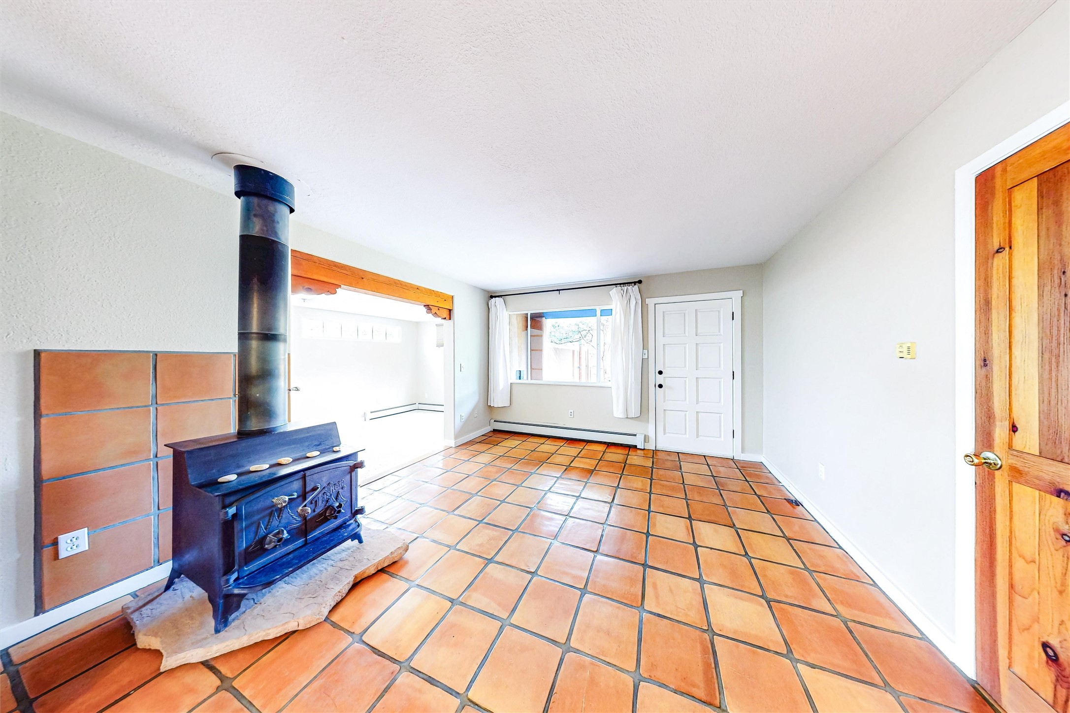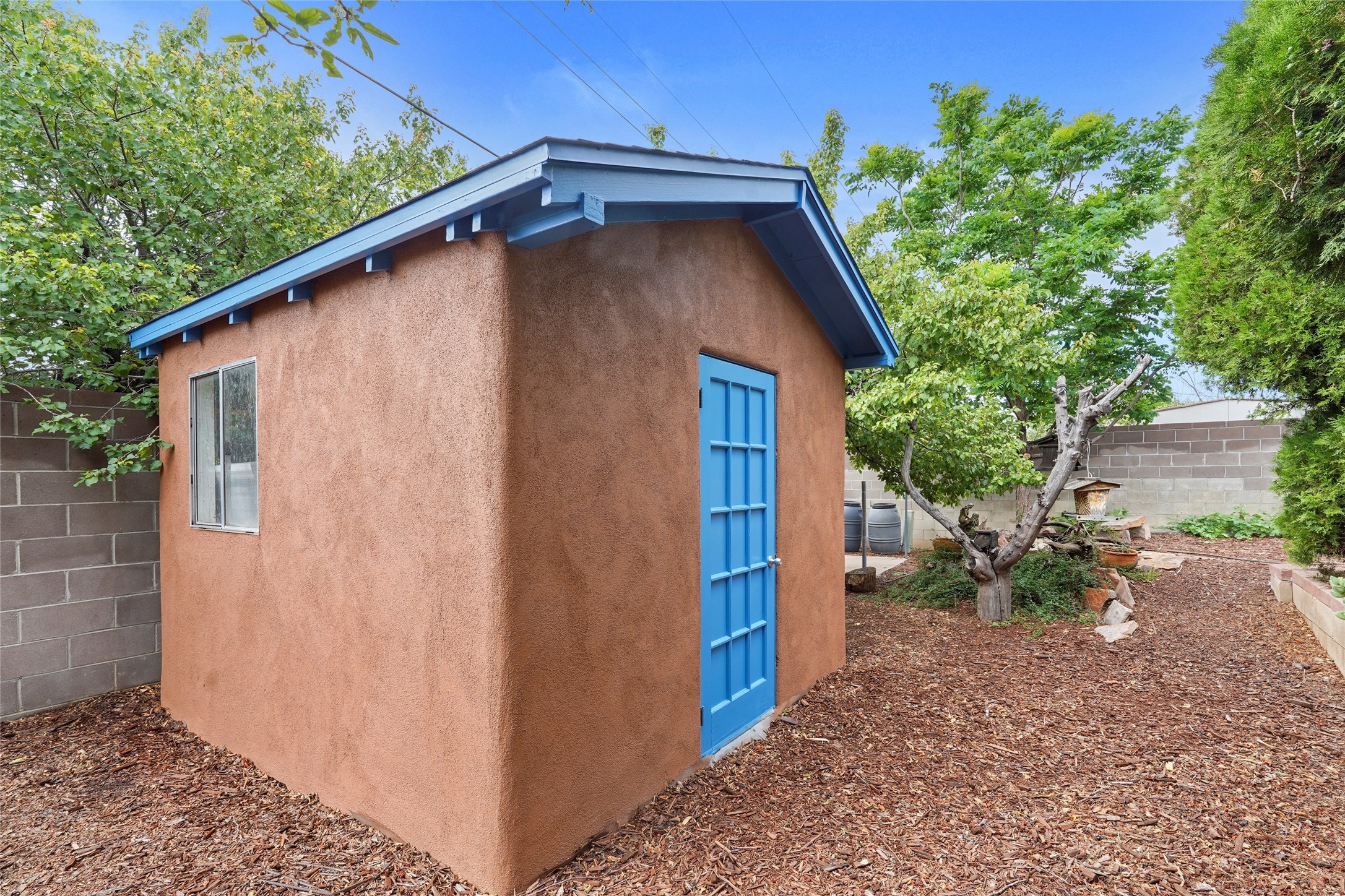 Charming 1,600 sq ft three-bedroom home in the inviting Bellamah neighborhood, steps from schools, parks, bike/walking trails, and the Genoveva Chavez Community Center. This meticulously maintained residence boasts an open-concept living room, carpeted den, dining area, and kitchen featuring custom natural wood cabinets with ample storage. The south-facing living space is accented by elegant wood pillars, beams, and corbels, with large windows flooding the area with natural light and offering views of the lush dream like courtyard. All new paint inside and out. Enjoy cozy winters with a free-standing wood stove, complemented by rich Talavera Saltillo tile throughout. A spacious laundry room adds convenience. Outside, thrive in well-tended organic front and back gardens, with a fully enclosed, expansive backyard. Off-street parking flanks both sides of the front yard, and a lockable shed provides extra storage. Move-in ready, this pristine home awaits its new owner!