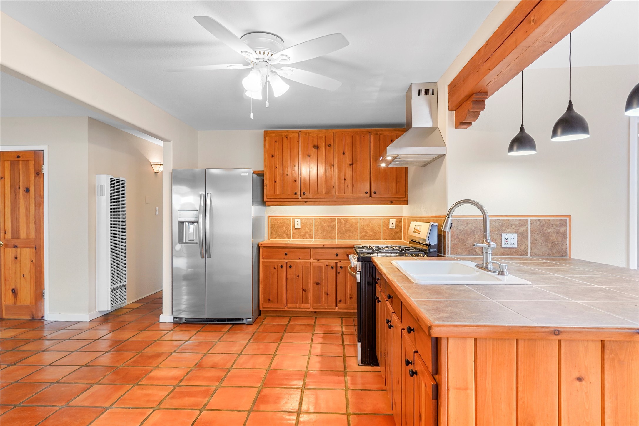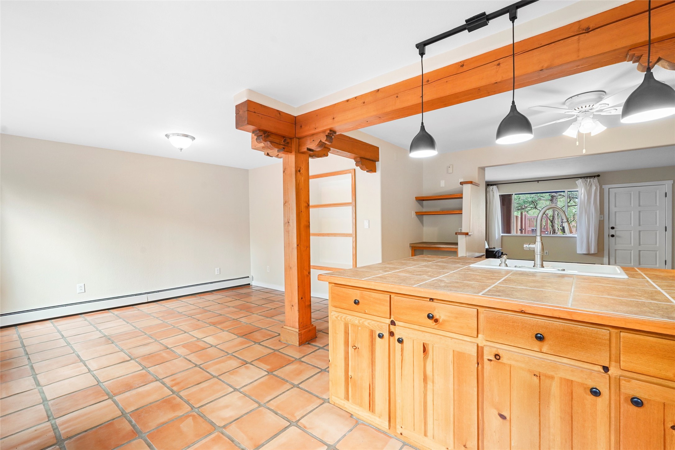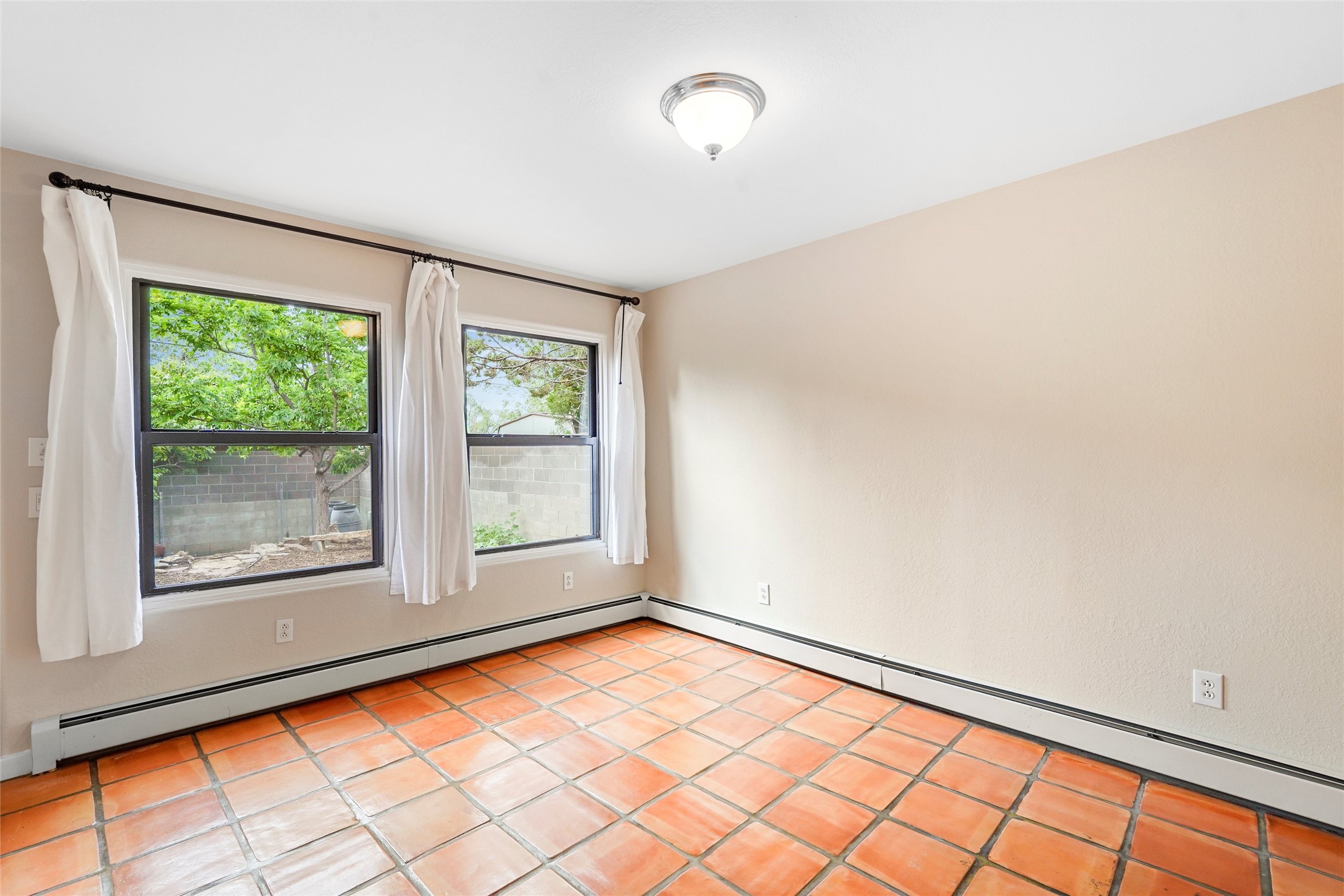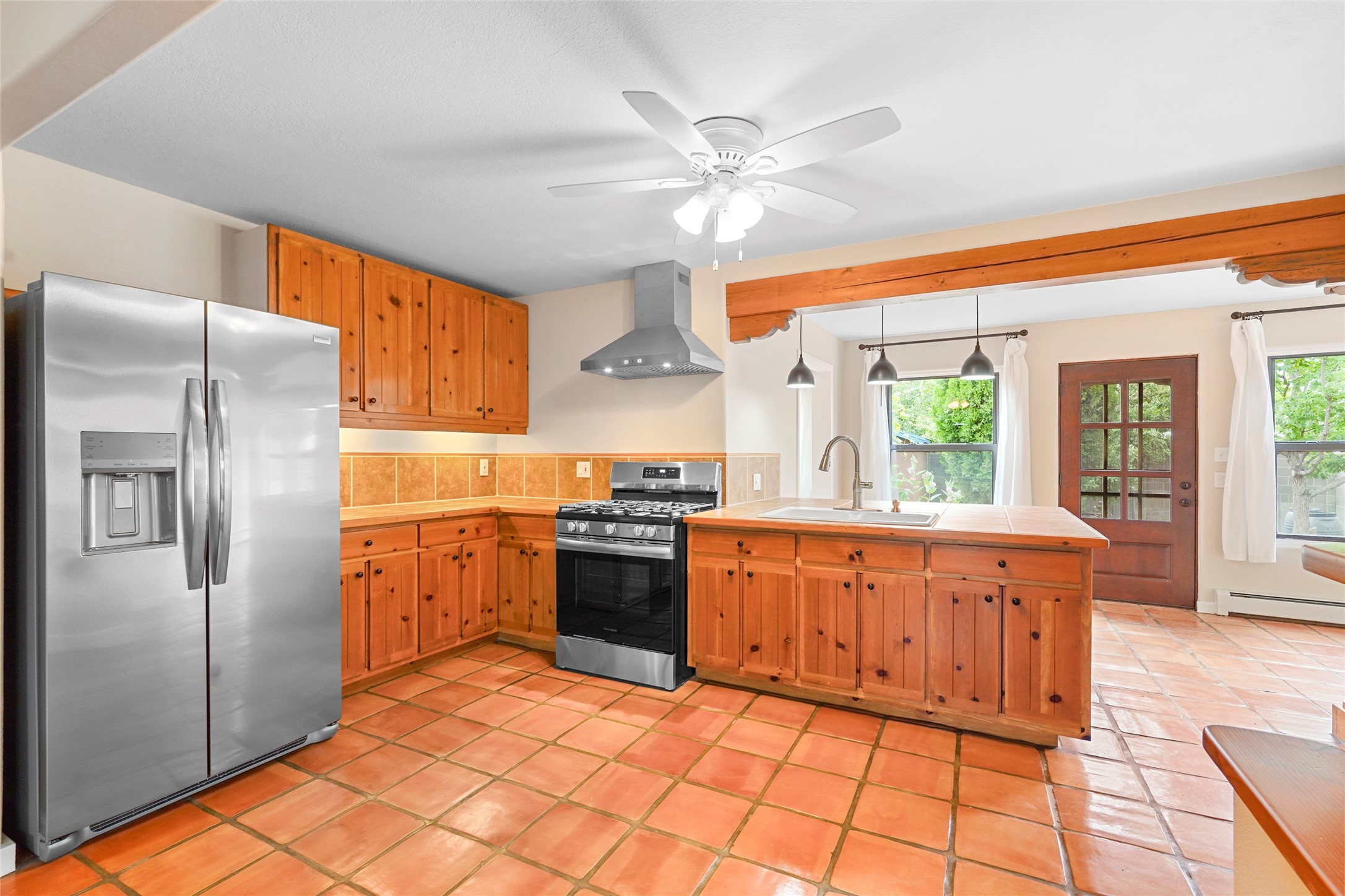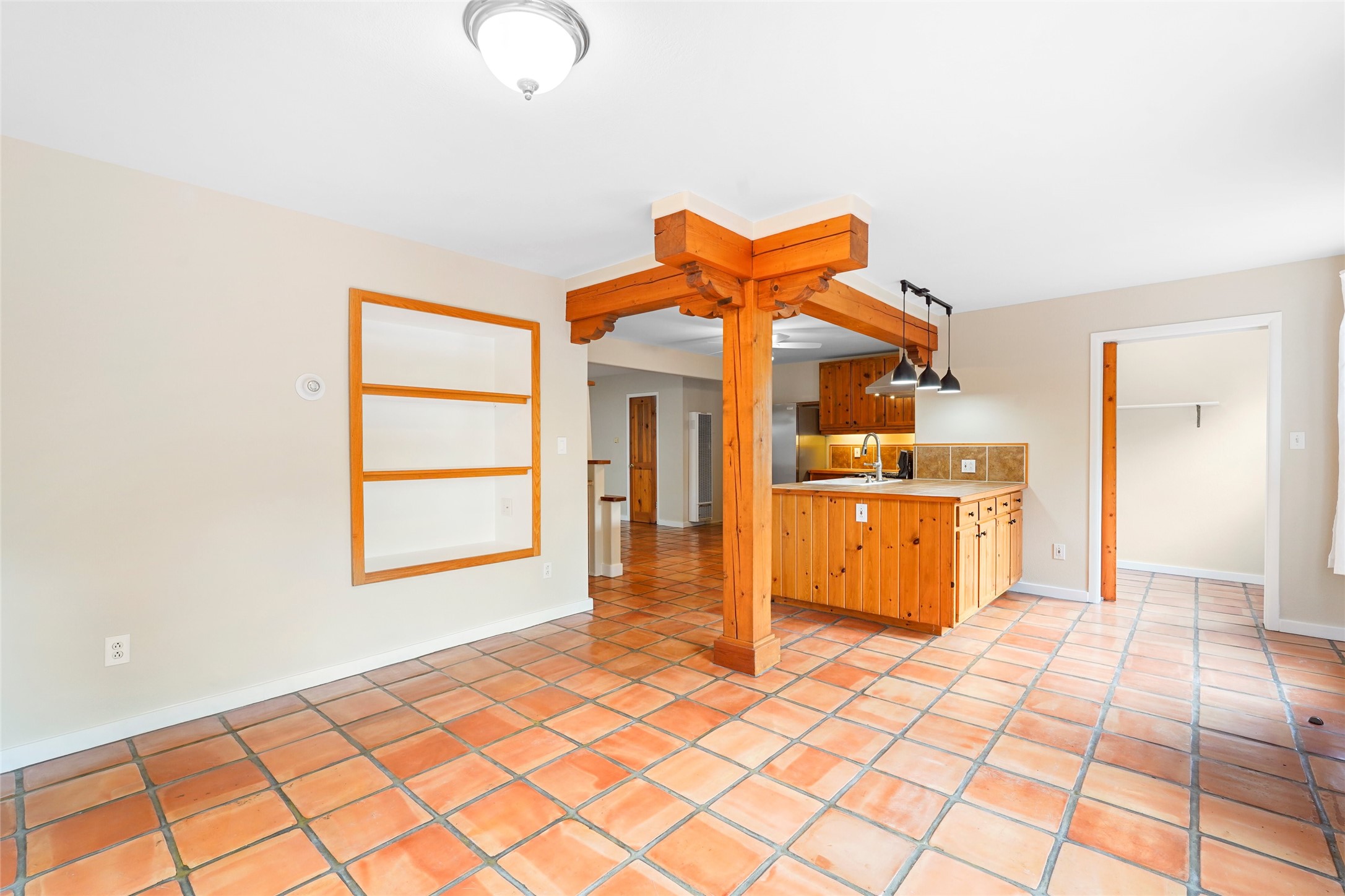 Charming 1,600 sq ft three-bedroom home in the inviting Bellamah neighborhood, steps from schools, parks, bike/walking trails, and the Genoveva Chavez Community Center. This meticulously maintained residence boasts an open-concept living room, carpeted den, dining area, and kitchen featuring custom natural wood cabinets with ample storage. The south-facing living space is accented by elegant wood pillars, beams, and corbels, with large windows flooding the area with natural light and offering views of the lush dream like courtyard. All new paint inside and out. Enjoy cozy winters with a free-standing wood stove, complemented by rich Talavera Saltillo tile throughout. A spacious laundry room adds convenience. Outside, thrive in well-tended organic front and back gardens, with a fully enclosed, expansive backyard. Off-street parking flanks both sides of the front yard, and a lockable shed provides extra storage. Move-in ready, this pristine home awaits its new owner!