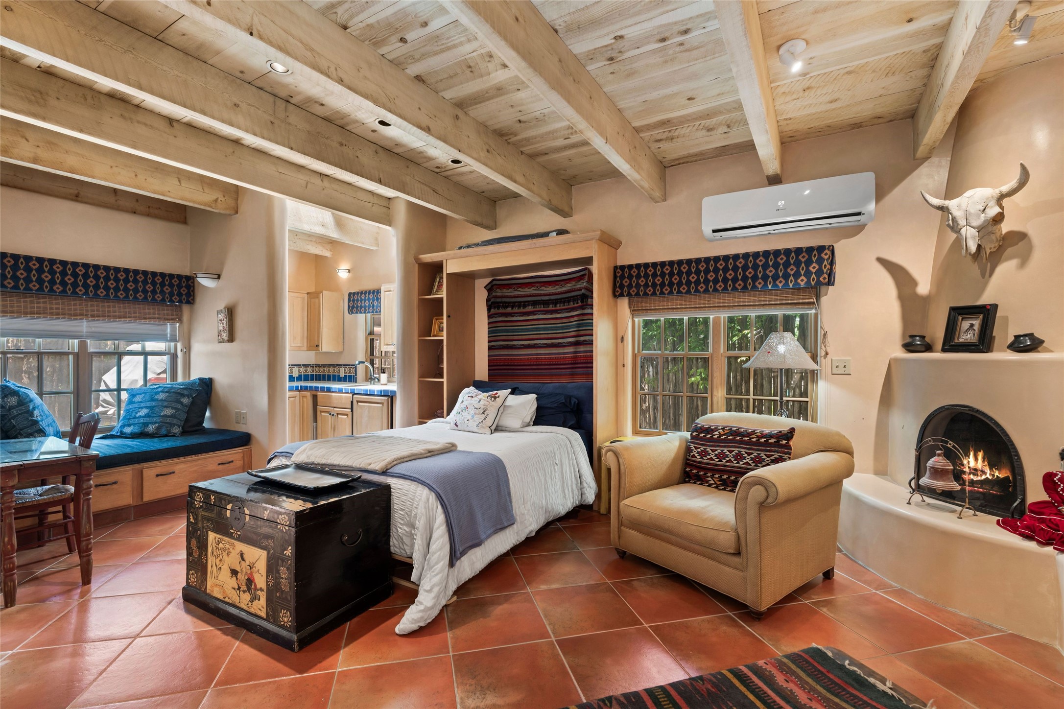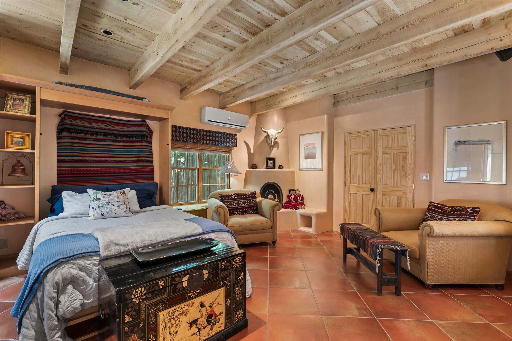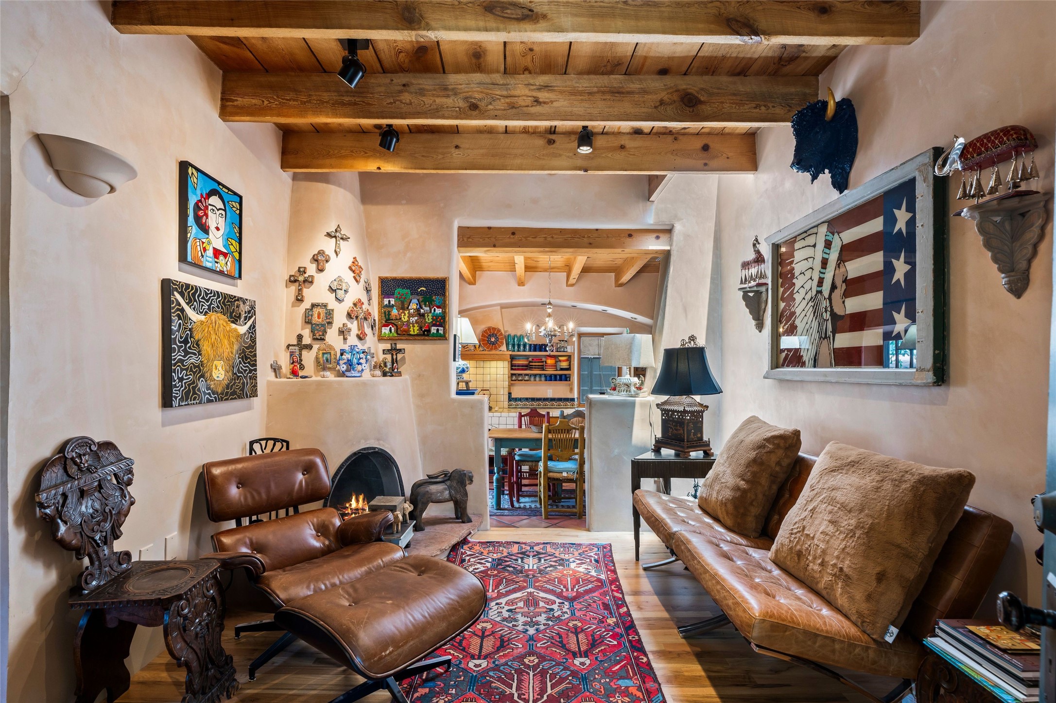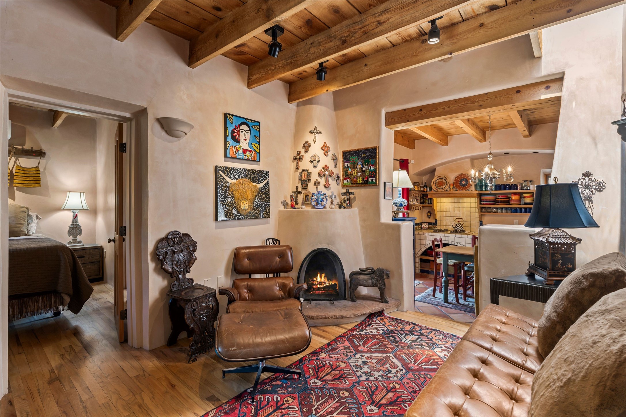 Classic Santa Fe Charm in the Coveted Historic Eastside.Nestled in one of Santa Fe's most historic and desirable neighborhoods, this enchanting residence with a main house and casita, offers timeless appeal. Located on a quiet, tree-lined street, and featuring a lush front garden, this serene property is surrounded by nature and just 5 minutes from the Plaza.The main house features authentic Santa Fe character with warm wood floors, a cozy wood burning Kiva fireplace, and elegant wall-washer and skylight lighting. Two ensuite bedrooms boast beautifully tiled bathrooms and skylights that fill the space with natural light. The kitchen is a true gem, showcasing Saltillo tiles, decorative tile countertops and backsplash, and convenient access to the charming interior courtyard.The interior courtyard is a private oasis, ideal for outdoor dining or relaxing, and connects to a spacious casita. With a kitchenette, this casita can be used independently or as an extension of the main house, creating a large primary suite. It includes generous closets, wood burning kiva fireplace, and inviting banco seating, and spacious bathroom accented with decorative tile. Don't miss this rare opportunity to own a home in one of Santa Fe's most sought-after locations, brimming with historic charm and modern functionality.