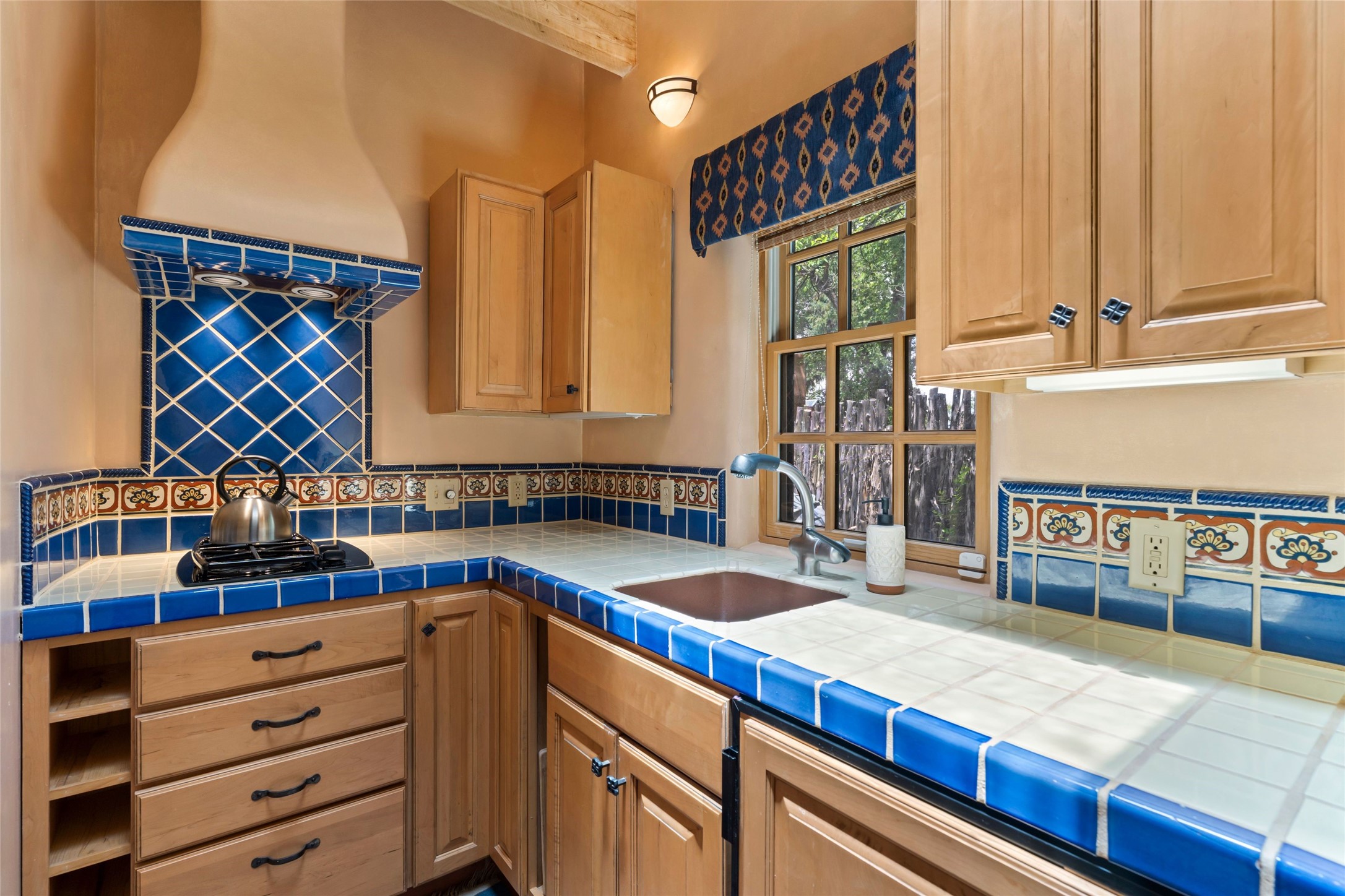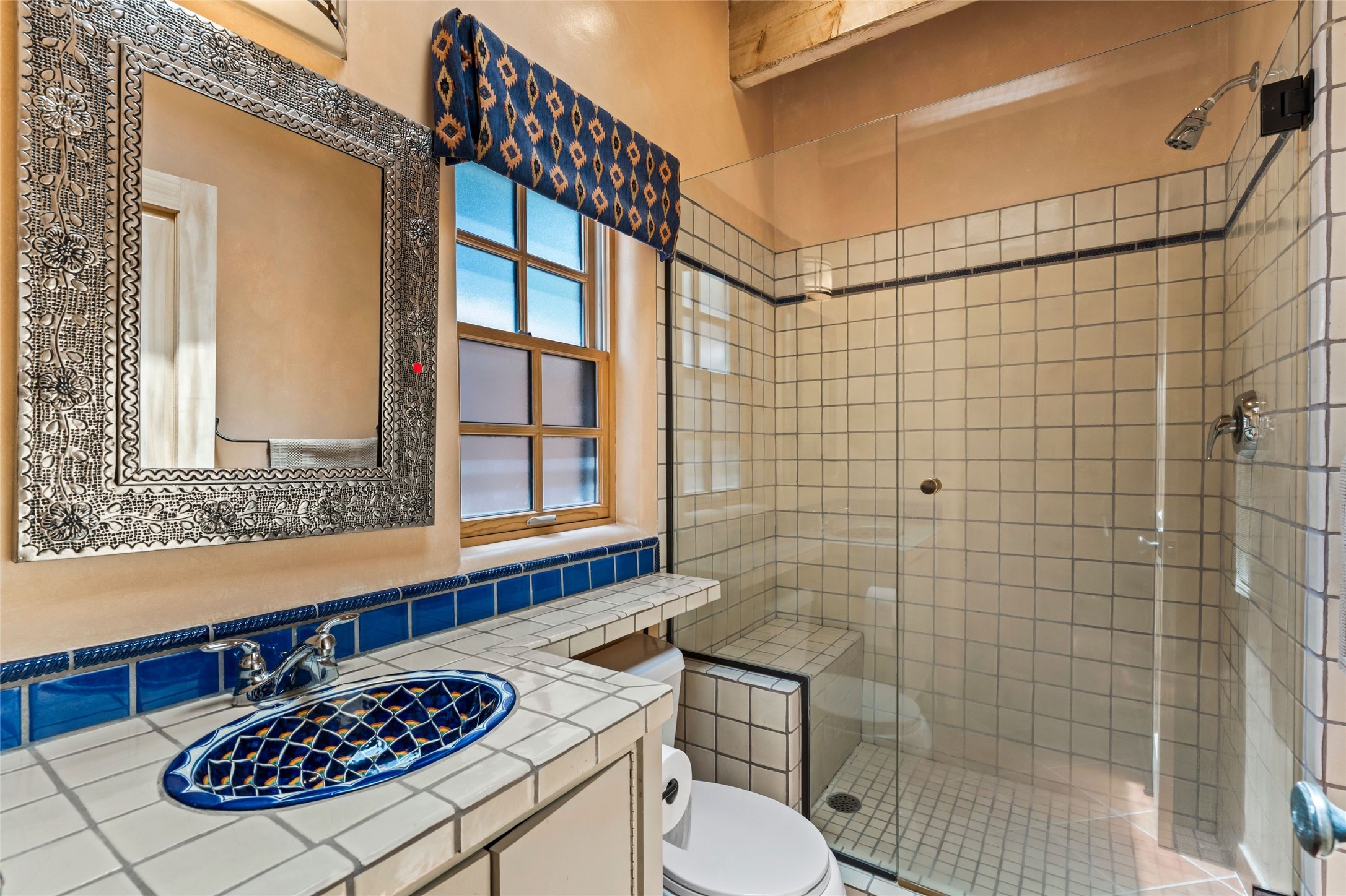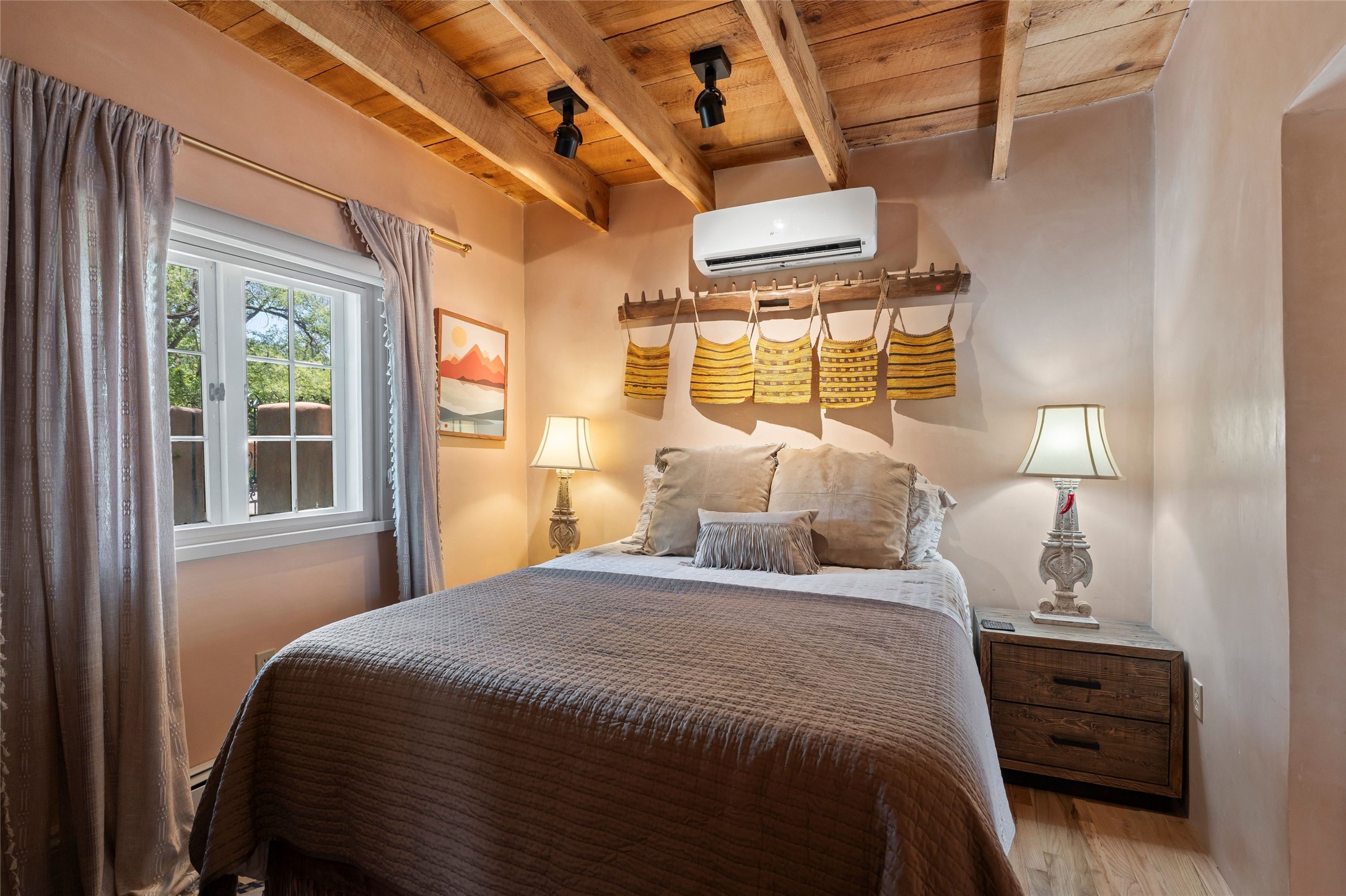 Classic Santa Fe Charm in the Coveted Historic Eastside.Nestled in one of Santa Fe's most historic and desirable neighborhoods, this enchanting residence with a main house and casita, offers timeless appeal. Located on a quiet, tree-lined street, and featuring a lush front garden, this serene property is surrounded by nature and just 5 minutes from the Plaza.The main house features authentic Santa Fe character with warm wood floors, a cozy wood burning Kiva fireplace, and elegant wall-washer and skylight lighting. Two ensuite bedrooms boast beautifully tiled bathrooms and skylights that fill the space with natural light. The kitchen is a true gem, showcasing Saltillo tiles, decorative tile countertops and backsplash, and convenient access to the charming interior courtyard.The interior courtyard is a private oasis, ideal for outdoor dining or relaxing, and connects to a spacious casita. With a kitchenette, this casita can be used independently or as an extension of the main house, creating a large primary suite. It includes generous closets, wood burning kiva fireplace, and inviting banco seating, and spacious bathroom accented with decorative tile. Don't miss this rare opportunity to own a home in one of Santa Fe's most sought-after locations, brimming with historic charm and modern functionality.
