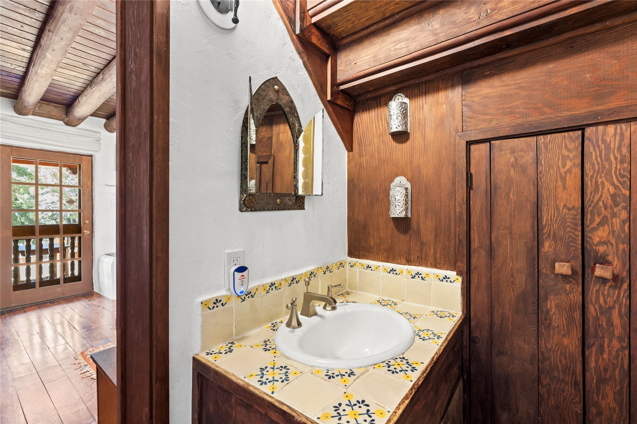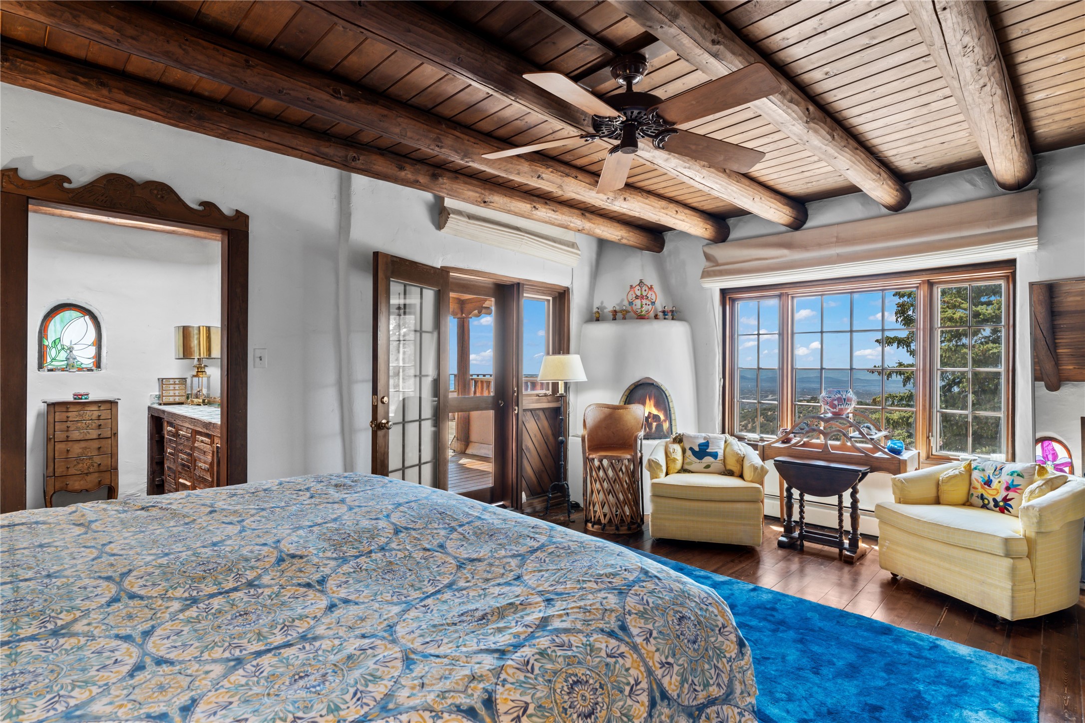 Authentic Vintage Santa Fe with gigantic views of the Sandia mountains all the way north to the Jemez mountains and up to nearly Colorado. | Ideal Short-Term Rental or Mountain Escape. Perched high in the Sangre de Cristo foothills, above and across from 10,000 Waves, this charming Santa Fe mountain home captures the magic of a Santa Fe lodge with all the feel-good vibes in sought-after Hyde Park Estates, perfectly situated between downtown Santa Fe and Ski Santa Fe--an ideal base for outdoor adventures, summer camp-style gatherings, or cozy winter lodge getaways.The best views in Hyde Park Estates, classic thick adobe walls, arched doorways, and hand-carved woodwork create an experiential ambiance. Expansive windows and multiple decks open to panoramic mountain views stretching to Colorado. Watch dramatic storms roll in or unwind to vibrant sunsets. Inside, the flexible floor plan features four bedrooms and three baths, designed for both privacy and connection. Multiple kiva fireplaces, a formal living and dining area, and a penthouse-style owner's suite with sweeping northern views make this home a true mountain sanctuary. Nearly every room opens to outdoor spaces, inviting a seamless indoor-outdoor lifestyle--perfect for entertaining, yoga mornings, or quiet reflection by the fire.The spacious brick patio sets the scene for outdoor dining, stargazing, or a future outdoor kitchen. Mature native landscaping, and stone walls abound. La Casa de la Familia is a paradise. Mature pion trees yield fresh pine nuts, while the automatic irrigation system keeps it all flourishing with ease. With updated appliances, disciplined maintenance, and solar electricity, whether you're looking for a well maintained short-term rental investment, a private family retreat, or a base camp for adventure, 2137 Paseo Ponderosa offers an opportunity to own a piece of Santa Fe's mountain magic. Consistently maintained and in great shape. Check out the video tour!