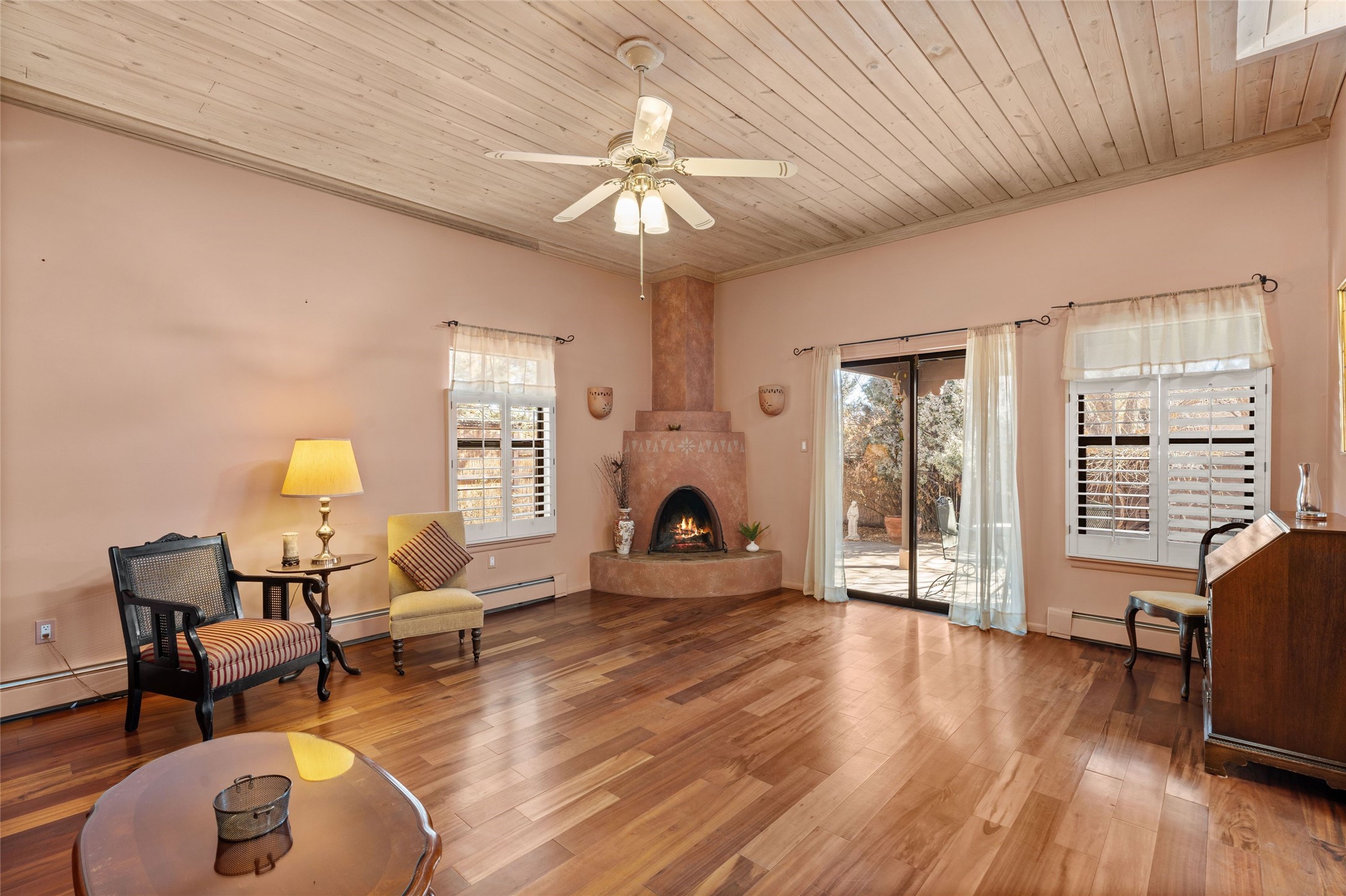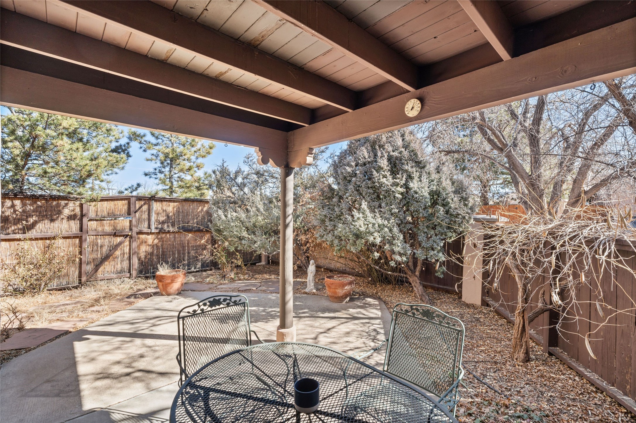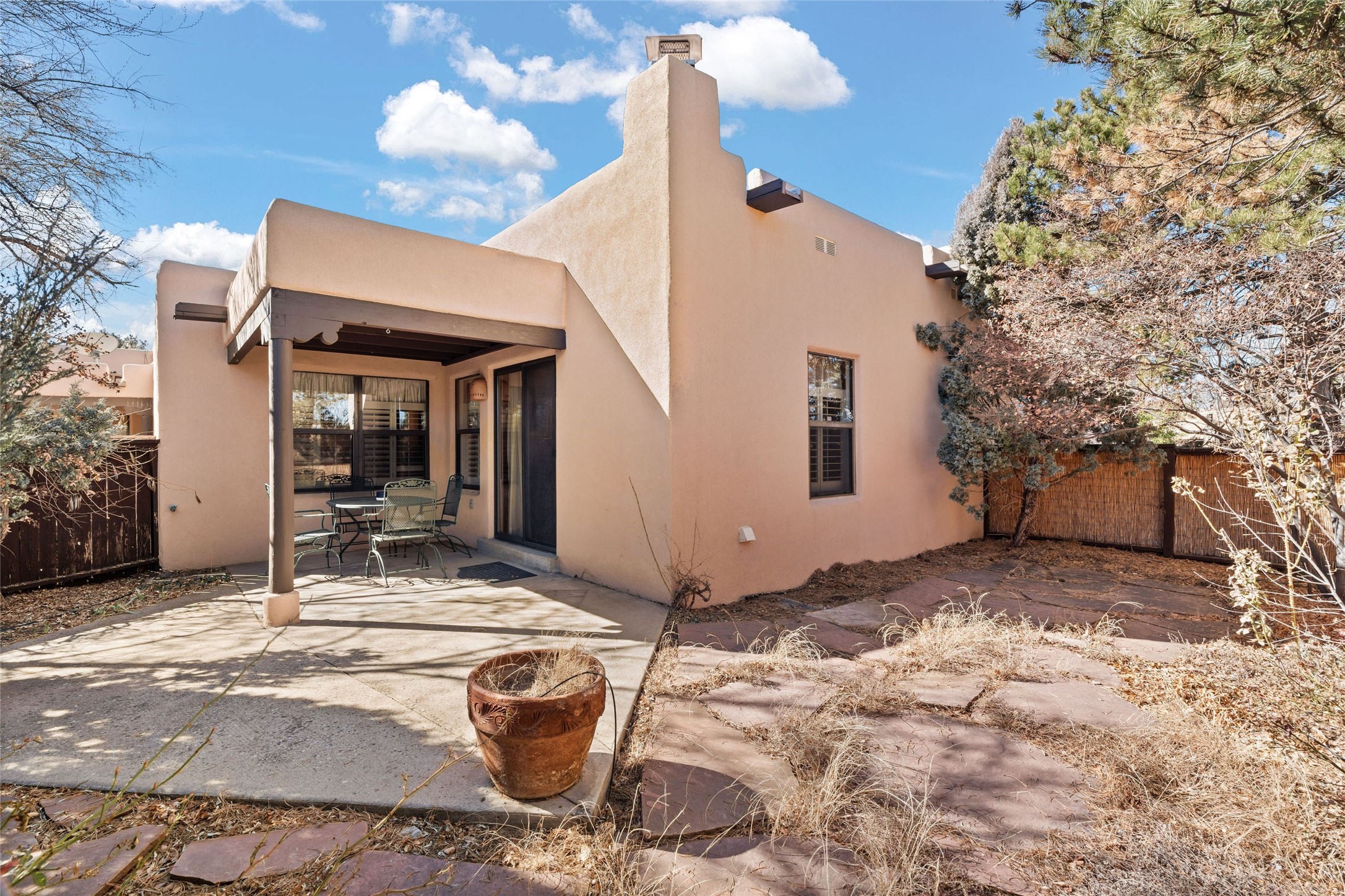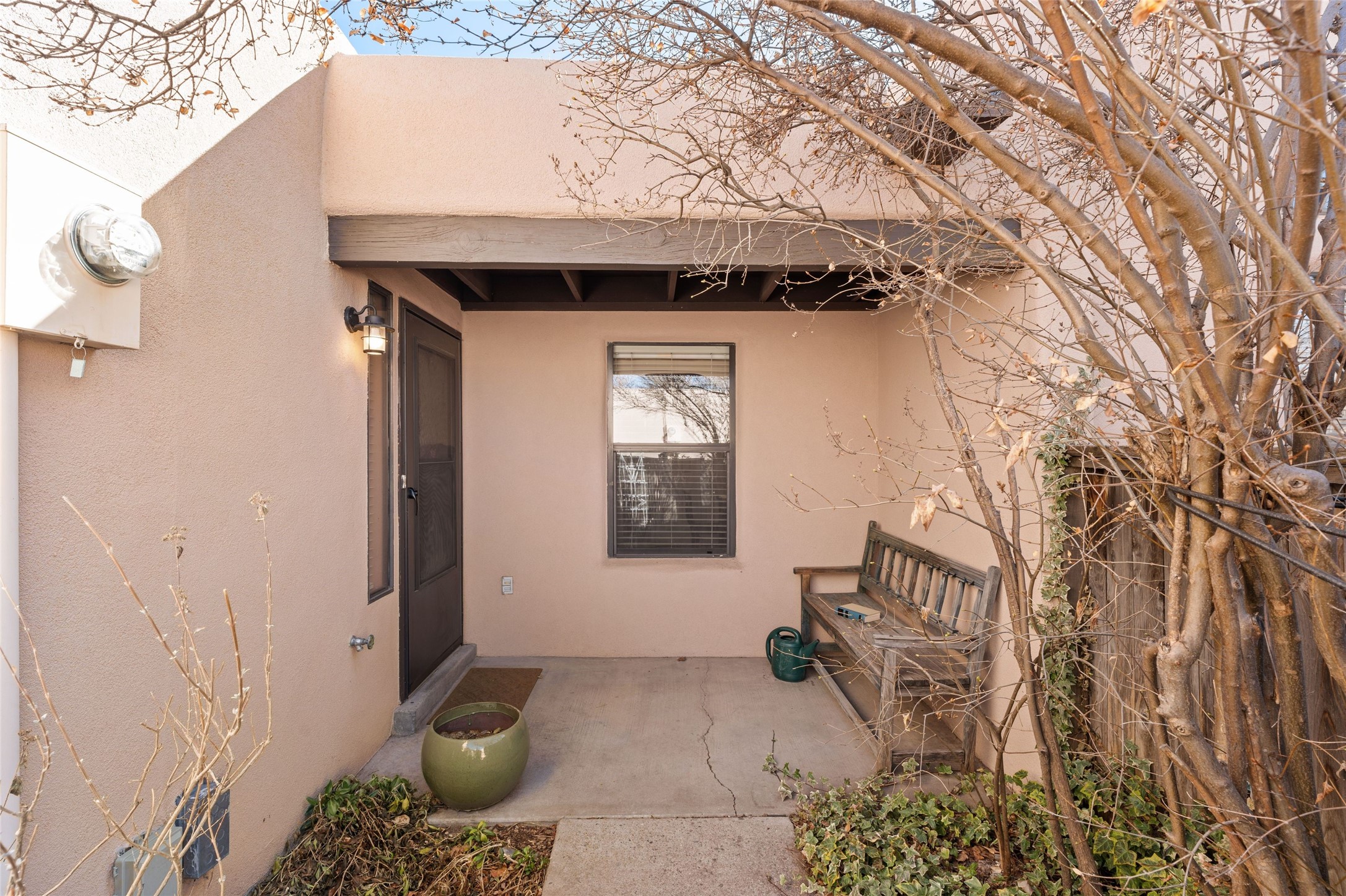 This is an ideal primary or secondary home in Santa Fe. This lovely Park Plaza two-bedroom, two-bath home features hardwood and tile floors, tongue-and-groove (T&G) ceiling finishes in the living room, no interior steps, a courtyard entry, a private backyard, and an upgraded roof with a 10-year warranty. It's centrally located in Santa Fe, offering easy living at its best! It is a charming private property. Do not miss this Park Plaza beauty!