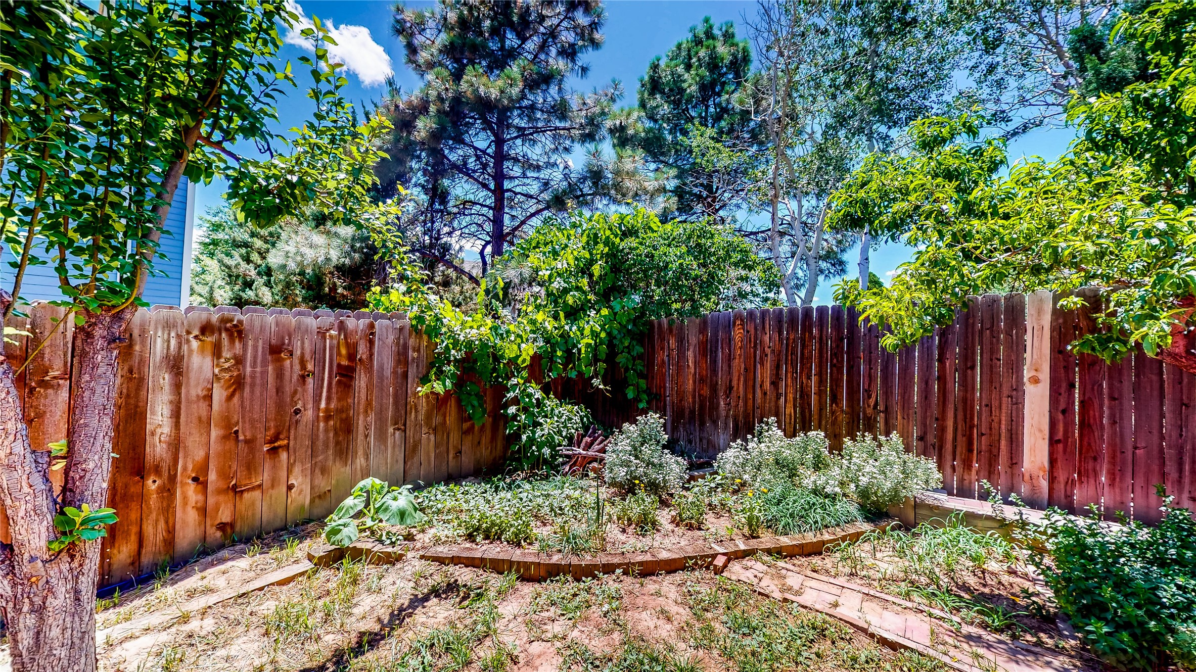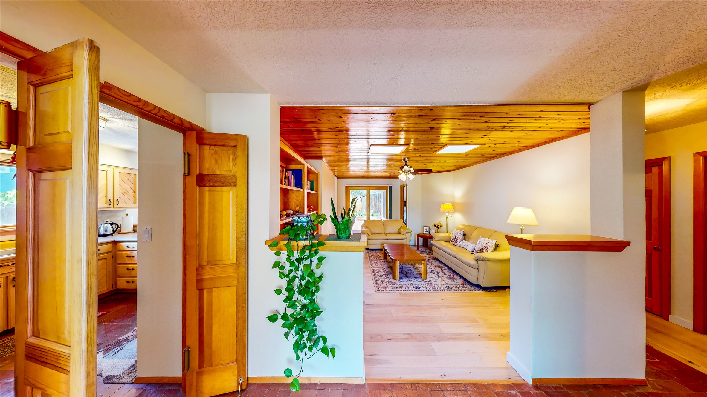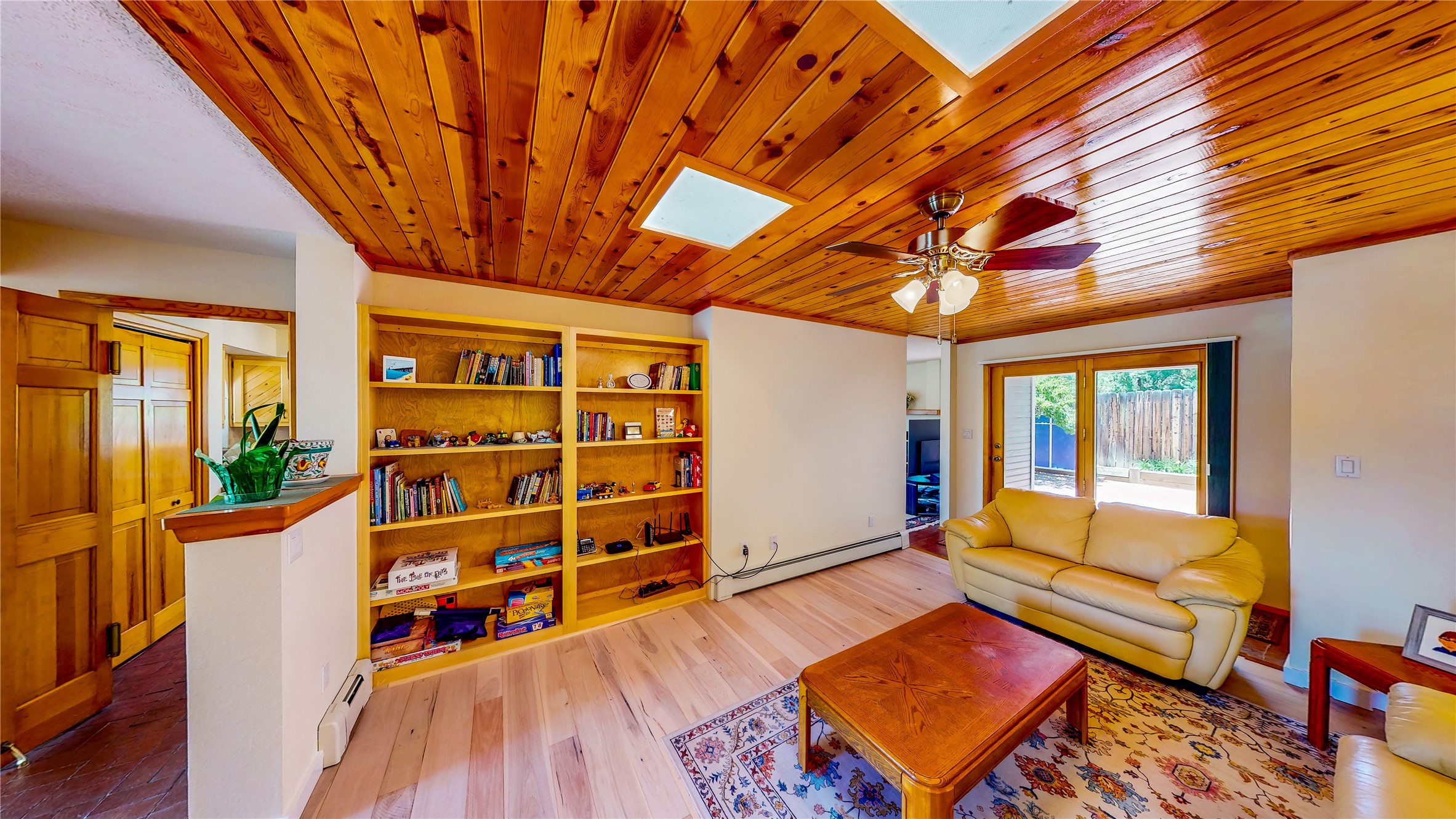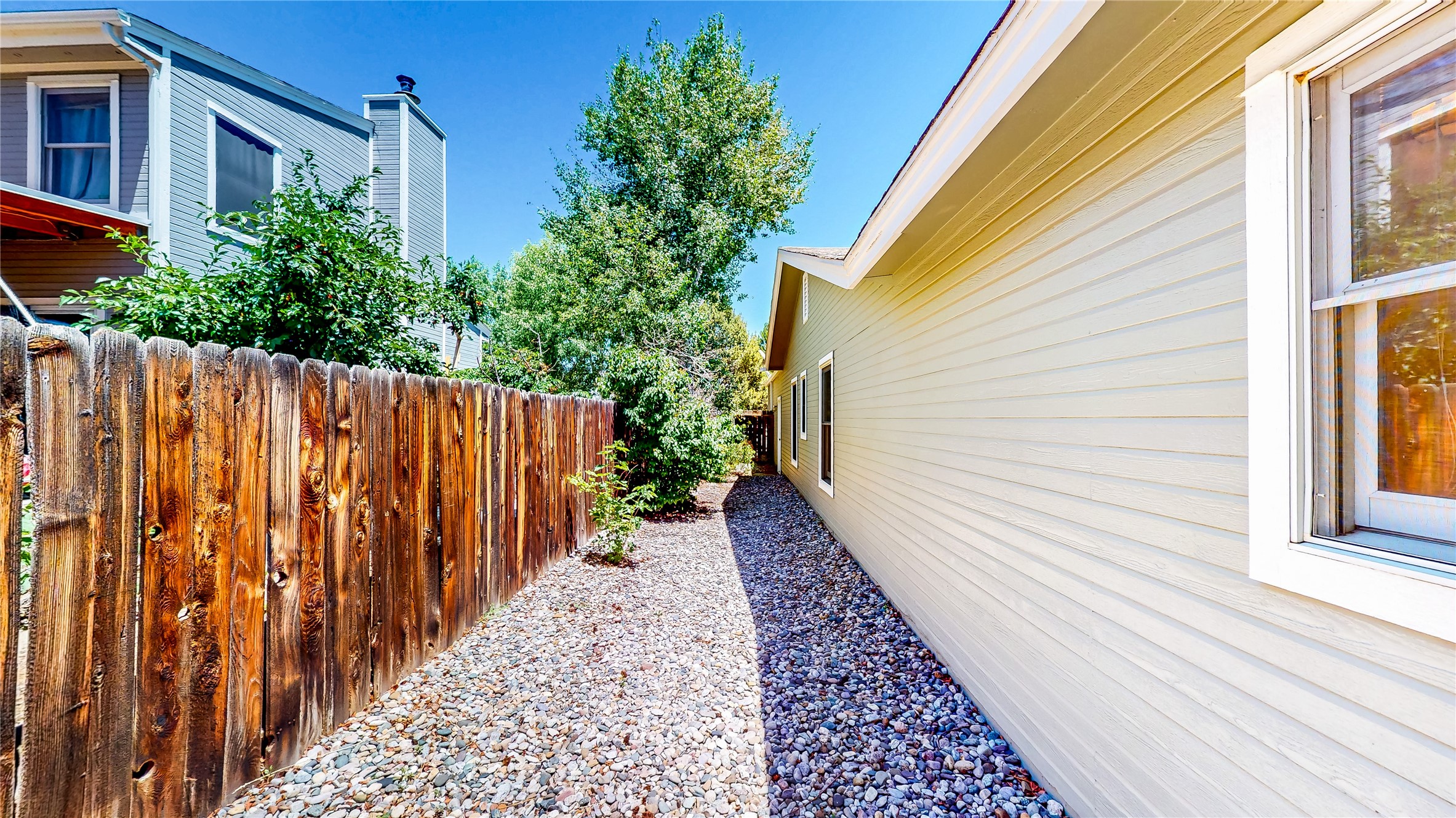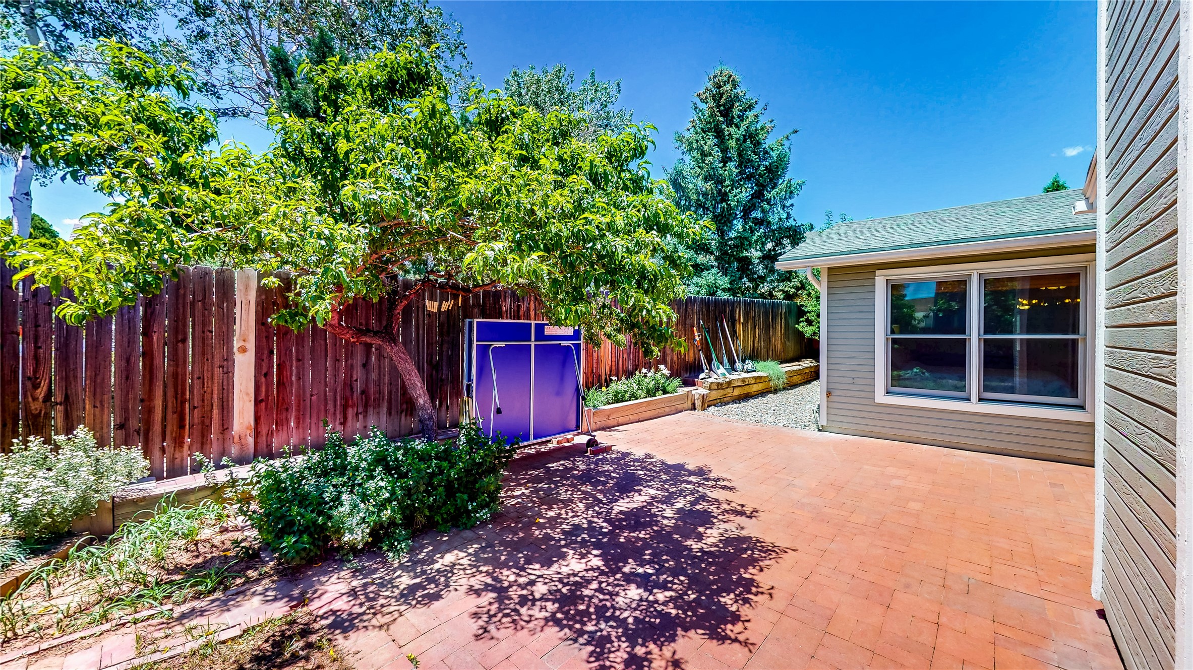 Tucked behind mature shrubs and trees, this charming custom ranch-style home located on a cul-de-sac in North Mesa offers a peaceful sense of privacy and timeless character. A lush front lawn welcomes you to the front entrance, where a brick-floored foyer sets a warm and inviting tone. Just off the entry is a versatile den that could easily serve as a formal dining room, office, or creative space. Straight ahead, the living room features wood plank ceilings with skylights, built-in shelving, and newly installed engineered wood floors that create a cozy yet open atmosphere. Glass doors open to a spacious covered patio and the beautifully landscaped backyard. The kitchen is well-appointed with wood cabinetry, tile backsplash, a pantry, and a peninsula bar top that provides extra seating and connects to the dining/family room. This inviting space centers around a gas fireplace, offering a comfortable spot to gather with family and friends. Down the hallway are two well-sized guest bedrooms and a full guest bathroom with a single sink vanity and a shower/tub combo. A dedicated laundry room provides additional storage and convenient access to the attached two-car garage. The spacious primary en-suite is privately located at the end of the hall for a true retreat, filled with natural light and complete with a large walk-in closet and built-in shelves. The en-suite bathroom includes a single sink vanity, a tub/shower combo in a private toilet closet for added functionality. Step outside to the fully fenced backyard, where mature landscaping, colorful flower beds, vegetable planters, and fruit trees create a lush, serene setting. A large patio offers the ideal space for outdoor dining, entertaining, or simply enjoying the sunshine. Located close to parks, hiking trails, schools, and local horse stables, this North Mesa home is perfect for those seeking both comfort and adventure. Don't miss your opportunity--schedule your private tour today!