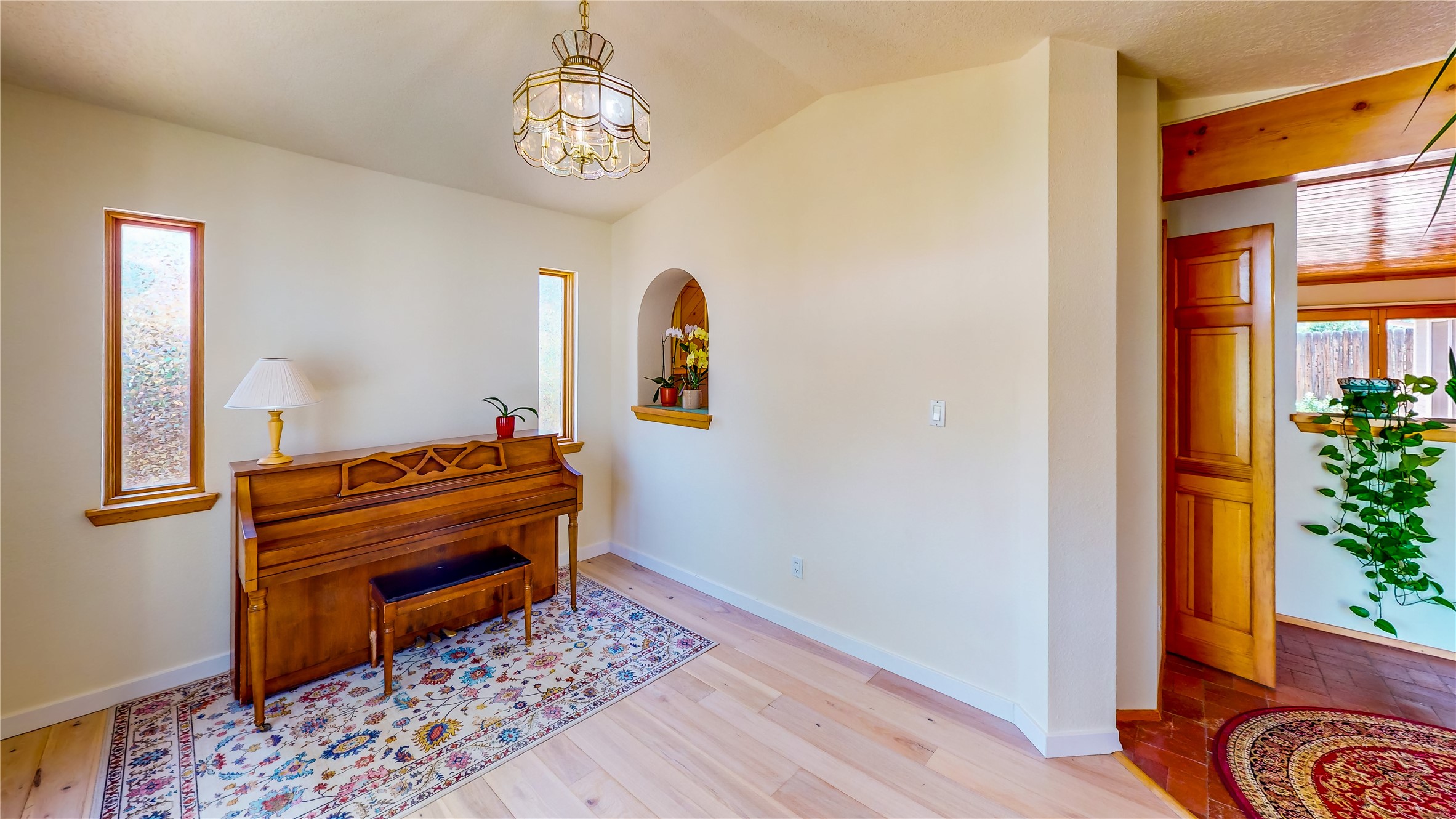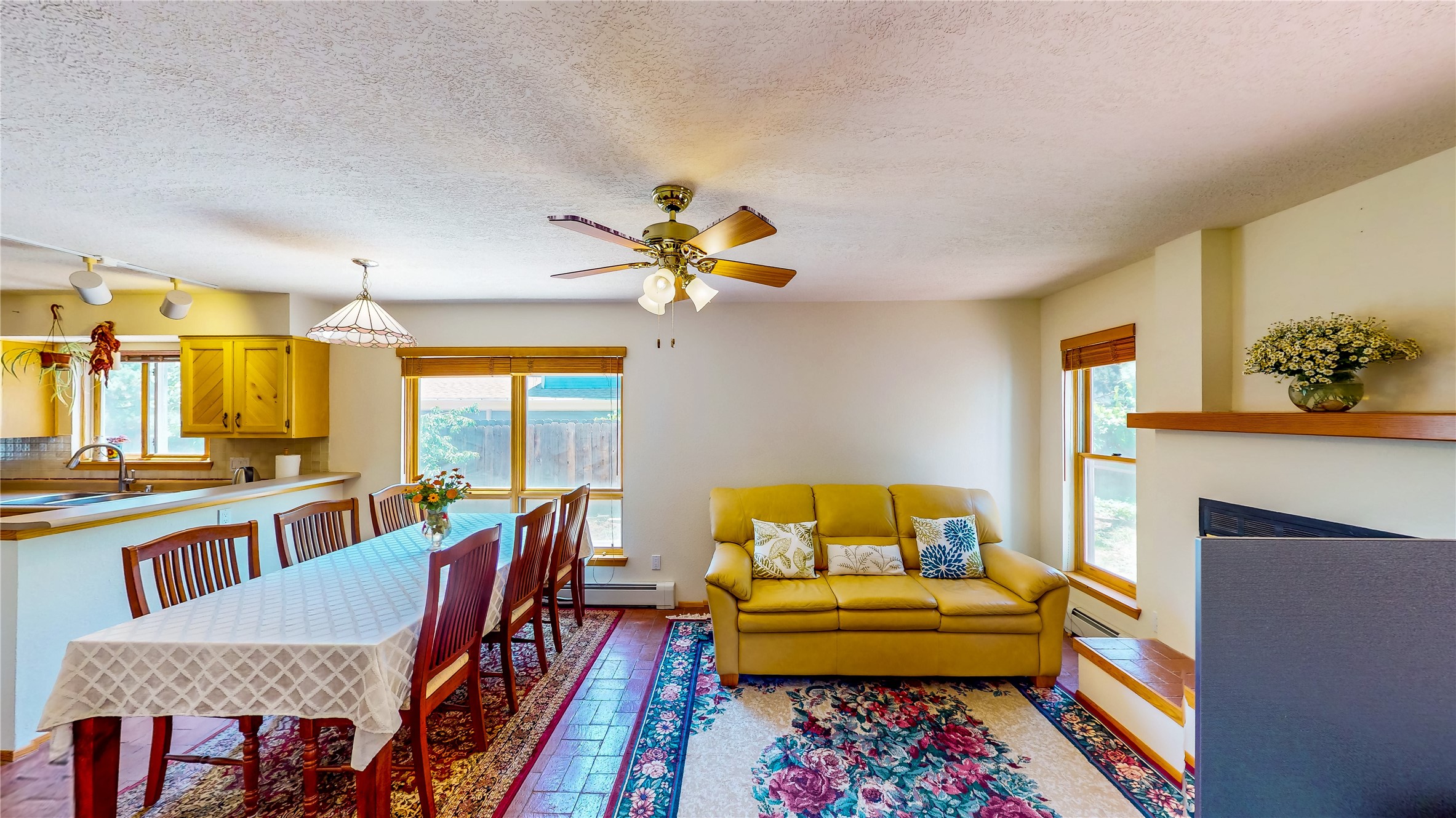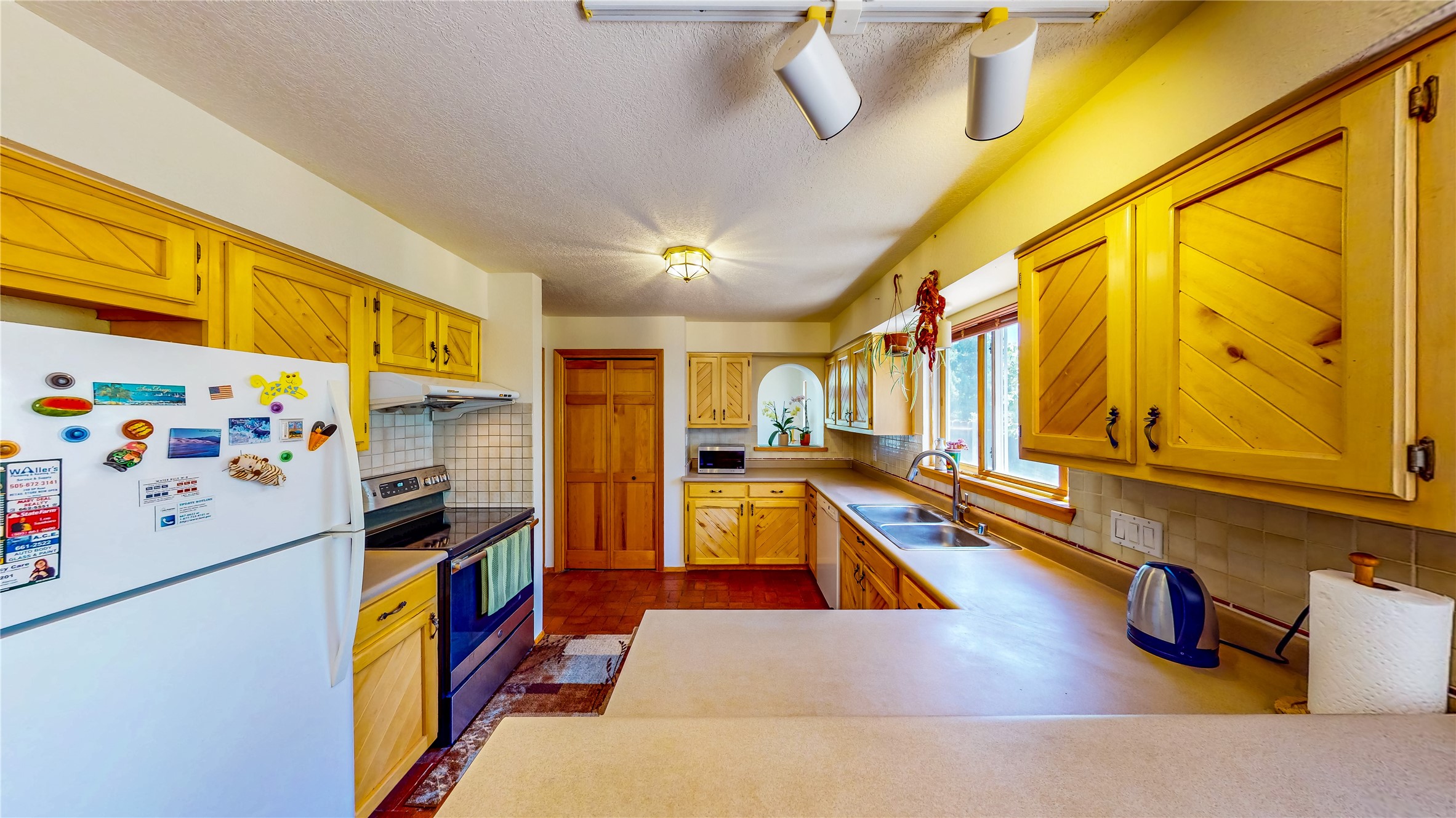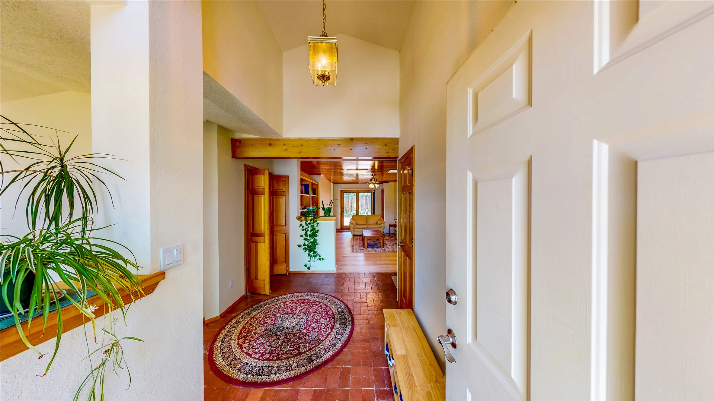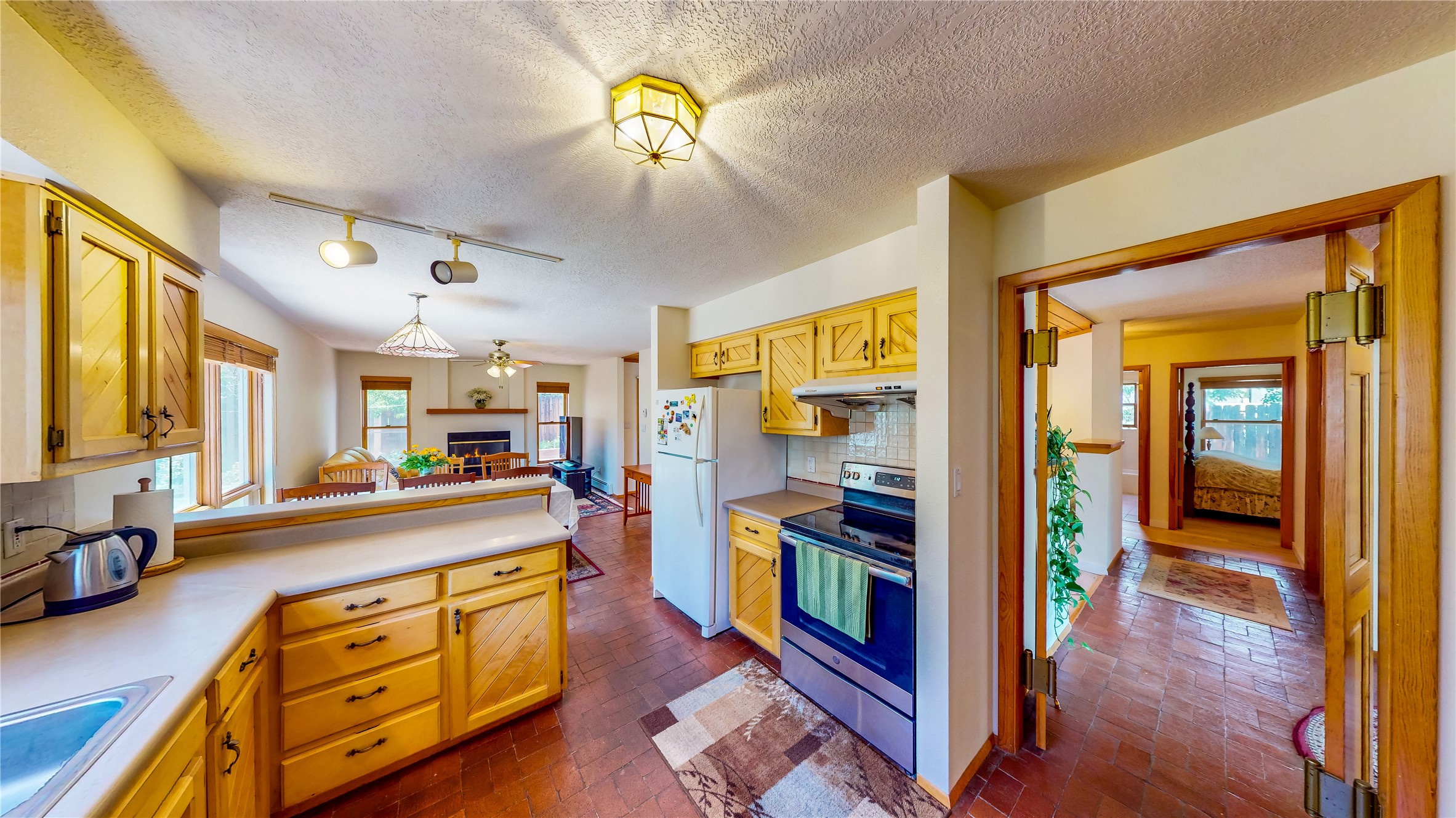 Tucked behind mature shrubs and trees, this charming custom ranch-style home located on a cul-de-sac in North Mesa offers a peaceful sense of privacy and timeless character. A lush front lawn welcomes you to the front entrance, where a brick-floored foyer sets a warm and inviting tone. Just off the entry is a versatile den that could easily serve as a formal dining room, office, or creative space. Straight ahead, the living room features wood plank ceilings with skylights, built-in shelving, and newly installed engineered wood floors that create a cozy yet open atmosphere. Glass doors open to a spacious covered patio and the beautifully landscaped backyard. The kitchen is well-appointed with wood cabinetry, tile backsplash, a pantry, and a peninsula bar top that provides extra seating and connects to the dining/family room. This inviting space centers around a gas fireplace, offering a comfortable spot to gather with family and friends. Down the hallway are two well-sized guest bedrooms and a full guest bathroom with a single sink vanity and a shower/tub combo. A dedicated laundry room provides additional storage and convenient access to the attached two-car garage. The spacious primary en-suite is privately located at the end of the hall for a true retreat, filled with natural light and complete with a large walk-in closet and built-in shelves. The en-suite bathroom includes a single sink vanity, a tub/shower combo in a private toilet closet for added functionality. Step outside to the fully fenced backyard, where mature landscaping, colorful flower beds, vegetable planters, and fruit trees create a lush, serene setting. A large patio offers the ideal space for outdoor dining, entertaining, or simply enjoying the sunshine. Located close to parks, hiking trails, schools, and local horse stables, this North Mesa home is perfect for those seeking both comfort and adventure. Don't miss your opportunity--schedule your private tour today!