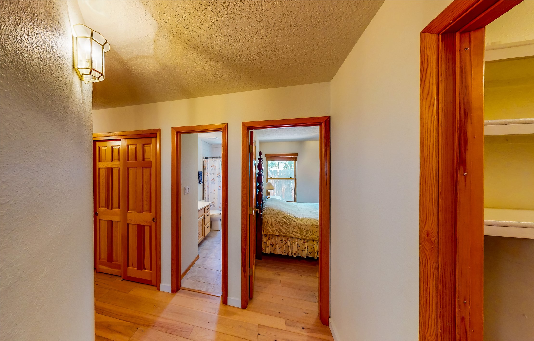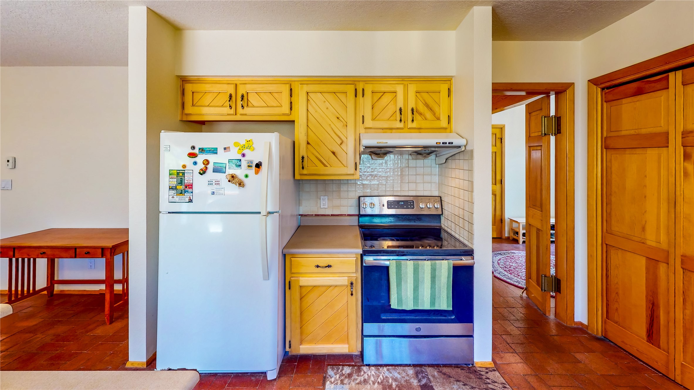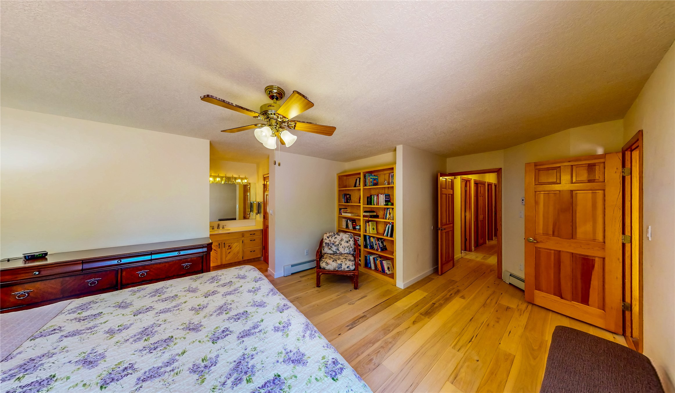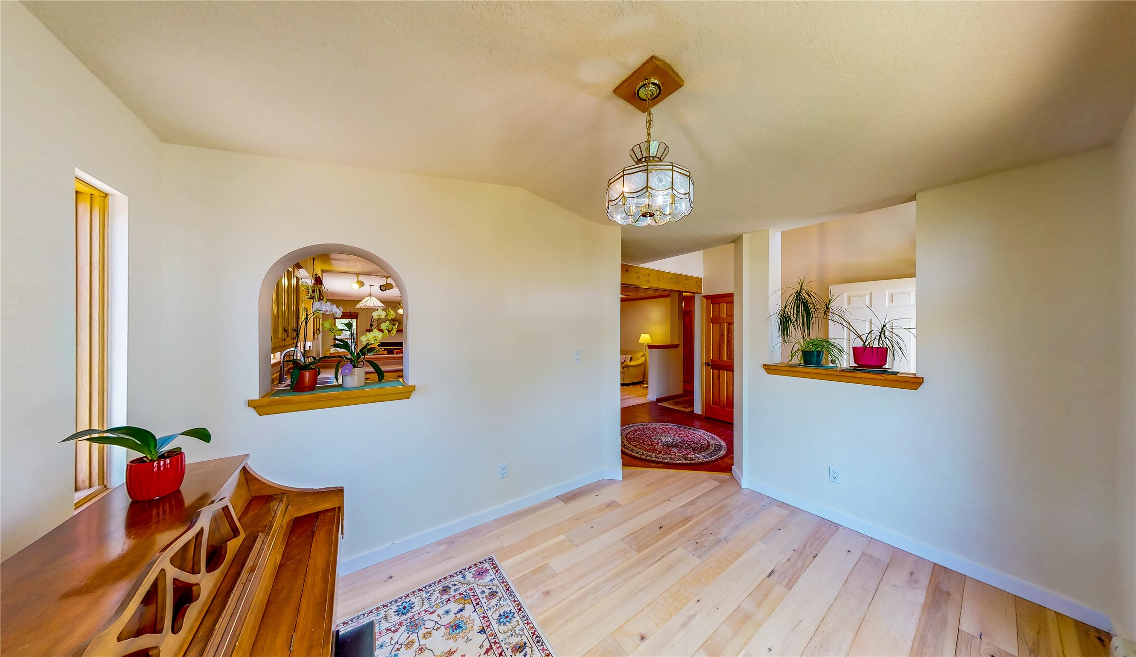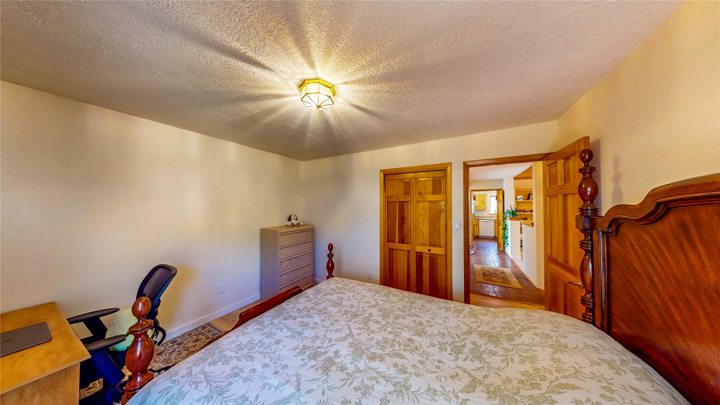 Tucked behind mature shrubs and trees, this charming custom ranch-style home located on a cul-de-sac in North Mesa offers a peaceful sense of privacy and timeless character. A lush front lawn welcomes you to the front entrance, where a brick-floored foyer sets a warm and inviting tone. Just off the entry is a versatile den that could easily serve as a formal dining room, office, or creative space. Straight ahead, the living room features wood plank ceilings with skylights, built-in shelving, and newly installed engineered wood floors that create a cozy yet open atmosphere. Glass doors open to a spacious covered patio and the beautifully landscaped backyard. The kitchen is well-appointed with wood cabinetry, tile backsplash, a pantry, and a peninsula bar top that provides extra seating and connects to the dining/family room. This inviting space centers around a gas fireplace, offering a comfortable spot to gather with family and friends. Down the hallway are two well-sized guest bedrooms and a full guest bathroom with a single sink vanity and a shower/tub combo. A dedicated laundry room provides additional storage and convenient access to the attached two-car garage. The spacious primary en-suite is privately located at the end of the hall for a true retreat, filled with natural light and complete with a large walk-in closet and built-in shelves. The en-suite bathroom includes a single sink vanity, a tub/shower combo in a private toilet closet for added functionality. Step outside to the fully fenced backyard, where mature landscaping, colorful flower beds, vegetable planters, and fruit trees create a lush, serene setting. A large patio offers the ideal space for outdoor dining, entertaining, or simply enjoying the sunshine. Located close to parks, hiking trails, schools, and local horse stables, this North Mesa home is perfect for those seeking both comfort and adventure. Don't miss your opportunity--schedule your private tour today!
