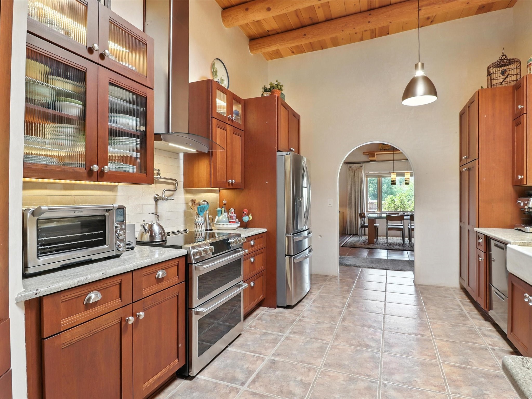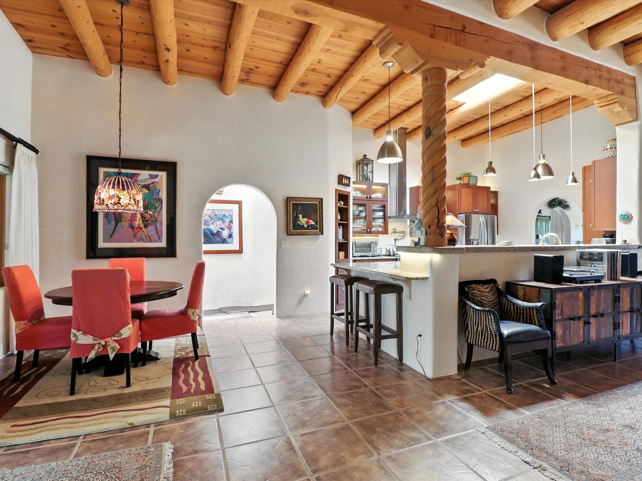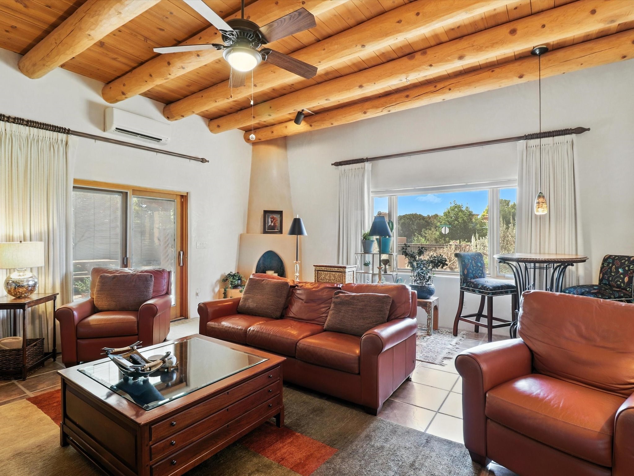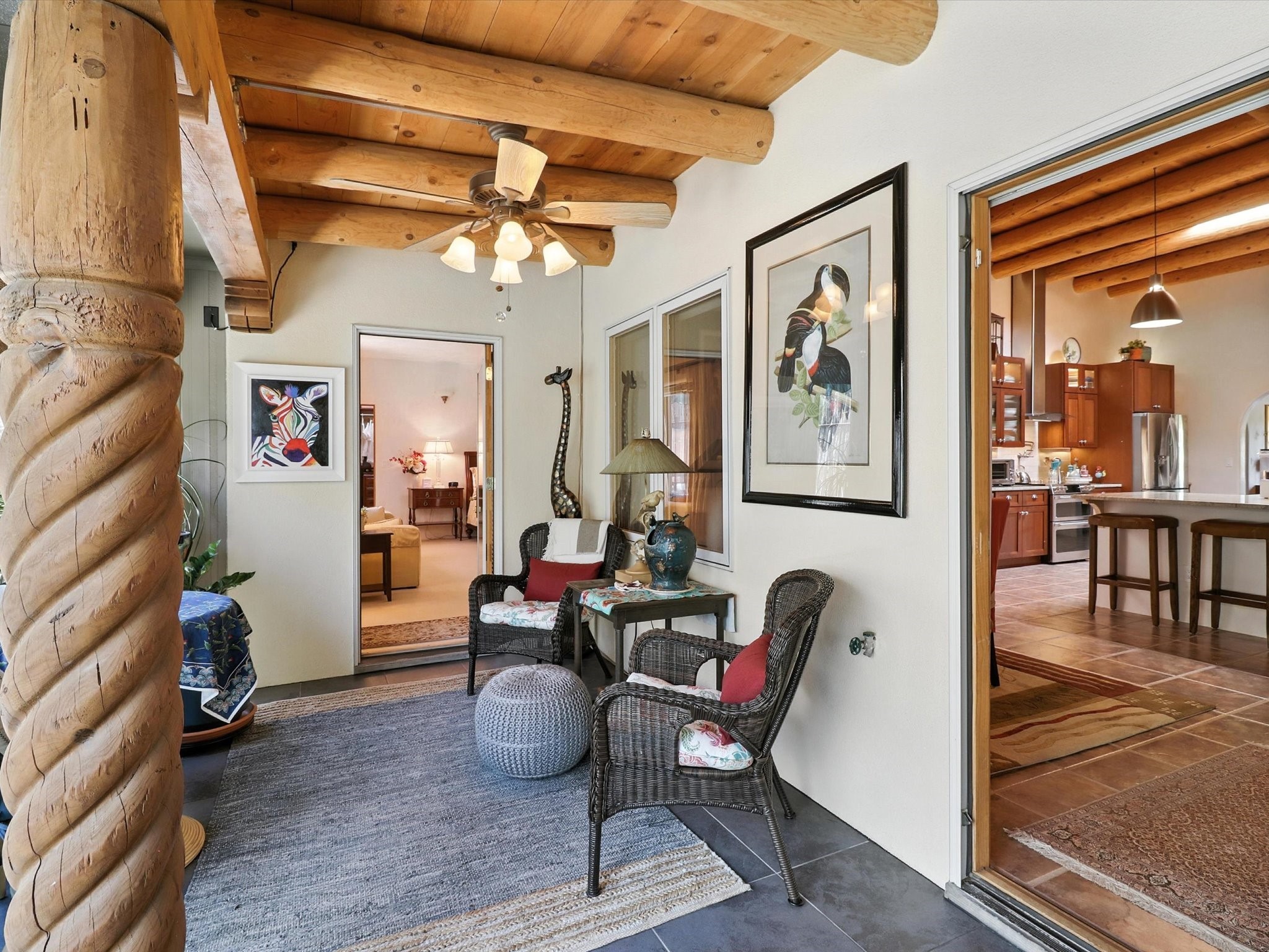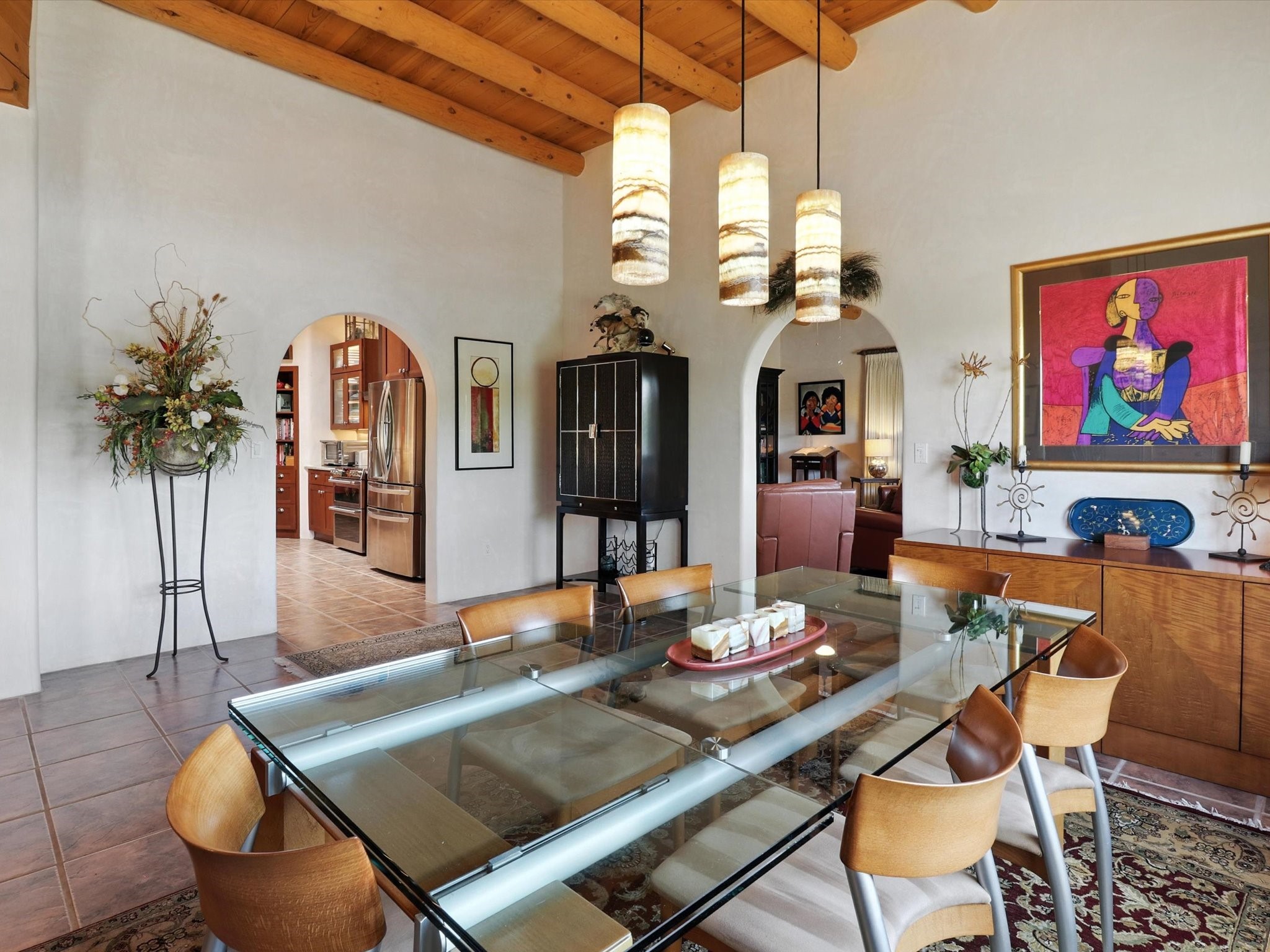 This beautifully maintained and thoughtfully updated home blends timeless Southwestern charm with refined, modern comfort. Spacious and gracefully proportioned rooms are enhanced by luxurious details throughout, including diamond finish plaster walls and elegant, large-format ceramic tile flooring. Step into the dramatic great room, where a soaring 12-foot viga ceiling and a cozy kiva fireplace create a stunning central gathering space. The fully remodeled kitchen is open to the living area and features slab granite countertops, stainless steel appliances, abundant custom cabinetry, and a sunny breakfast nook, perfect for everyday living and entertaining alike. The adjacent formal dining room, also crowned by a high viga ceiling, offers seamless flow for gatherings both intimate and celebratory.A separate den with a wood-burning kiva-style fireplace provides additional flexible living space and opens to a private rear patio and manicured outdoor area.The expansive owner's suite is thoughtfully positioned for privacy and serenity. It includes a peaceful sitting area, direct access to the heated sunroom, and a beautifully appointed updated bath featuring a glass brick wall that gently filters natural light. Two additional bedrooms are located at the opposite end of the home. One is currently serving as studio and office, the other a wonderful guest room, with both sharing a generous full bath. Additional features include: walled and gated yard with security cameras, attached oversized two-car garage, large walk-in closets in every bedroom, heated enclosed Portal Santa Fe room with adjoining covered BBQ area, 5 mini-split Mitsubishi systems for personalized cooling and supplemental heat w/ upgraded hyper compressors, 13 GPM tankless water heater, Toto Washlet toilets, 18 solar panel (owned), and a large in-town lot with all city utilities. This home has been a place of deep joy, creativity, & care, now ready to welcome its next chapter w/ warmth & grace.