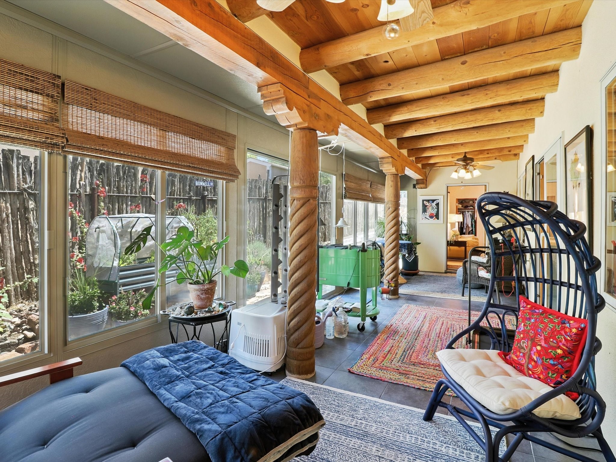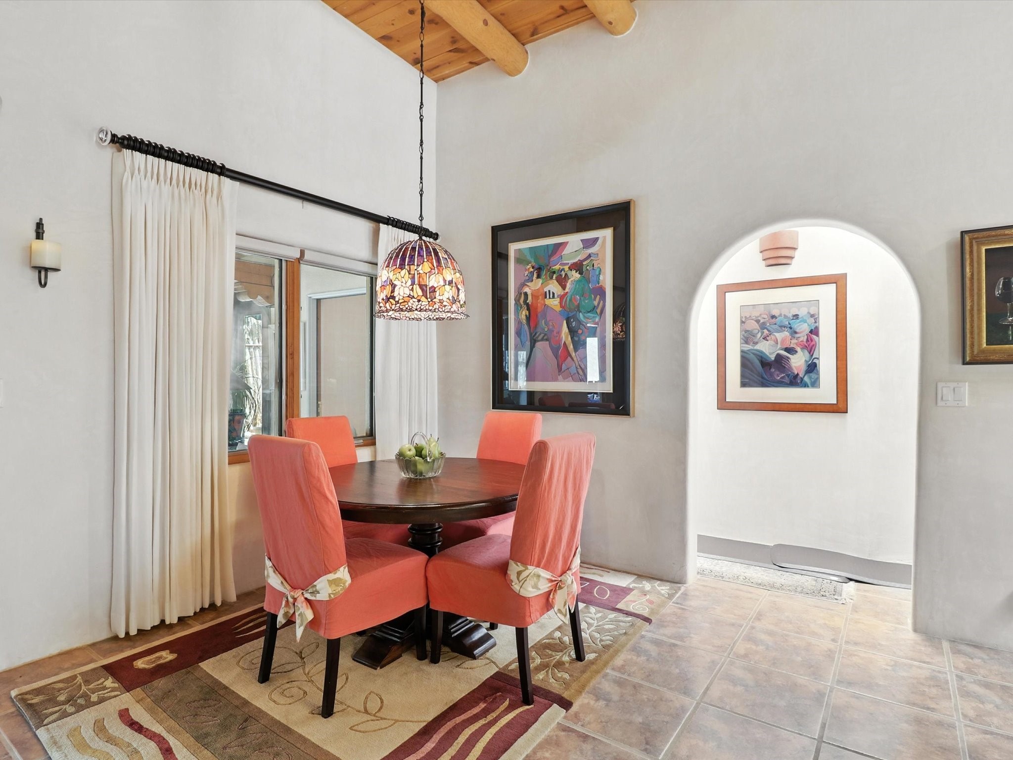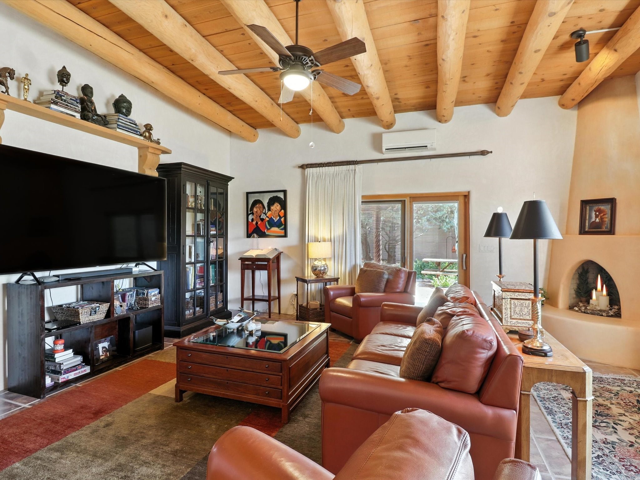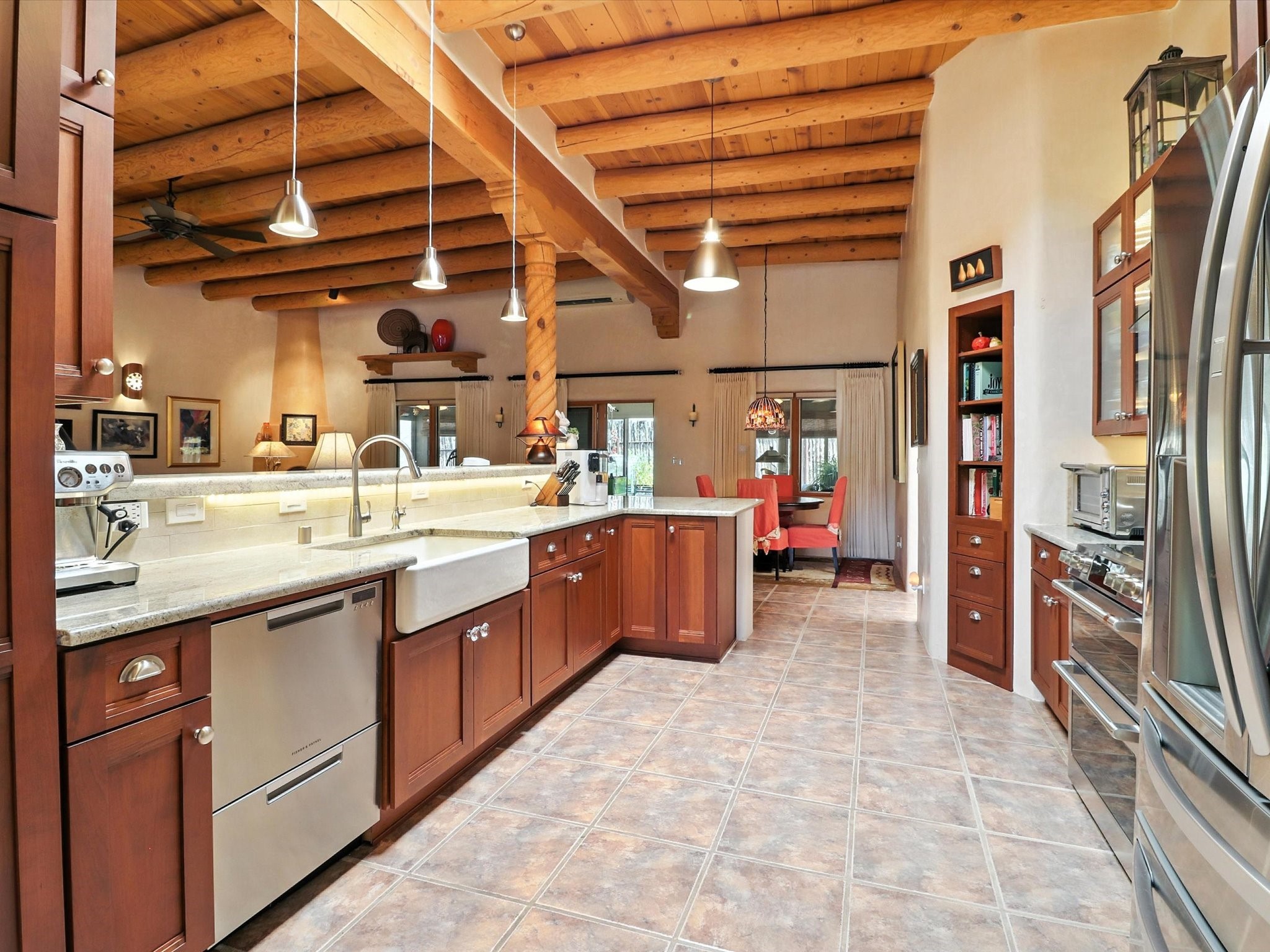 This beautifully maintained and thoughtfully updated home blends timeless Southwestern charm with refined, modern comfort. Spacious and gracefully proportioned rooms are enhanced by luxurious details throughout, including diamond finish plaster walls and elegant, large-format ceramic tile flooring. Step into the dramatic great room, where a soaring 12-foot viga ceiling and a cozy kiva fireplace create a stunning central gathering space. The fully remodeled kitchen is open to the living area and features slab granite countertops, stainless steel appliances, abundant custom cabinetry, and a sunny breakfast nook, perfect for everyday living and entertaining alike. The adjacent formal dining room, also crowned by a high viga ceiling, offers seamless flow for gatherings both intimate and celebratory.A separate den with a wood-burning kiva-style fireplace provides additional flexible living space and opens to a private rear patio and manicured outdoor area.The expansive owner's suite is thoughtfully positioned for privacy and serenity. It includes a peaceful sitting area, direct access to the heated sunroom, and a beautifully appointed updated bath featuring a glass brick wall that gently filters natural light. Two additional bedrooms are located at the opposite end of the home. One is currently serving as studio and office, the other a wonderful guest room, with both sharing a generous full bath. Additional features include: walled and gated yard with security cameras, attached oversized two-car garage, large walk-in closets in every bedroom, heated enclosed Portal Santa Fe room with adjoining covered BBQ area, 5 mini-split Mitsubishi systems for personalized cooling and supplemental heat w/ upgraded hyper compressors, 13 GPM tankless water heater, Toto Washlet toilets, 18 solar panel (owned), and a large in-town lot with all city utilities. This home has been a place of deep joy, creativity, & care, now ready to welcome its next chapter w/ warmth & grace.