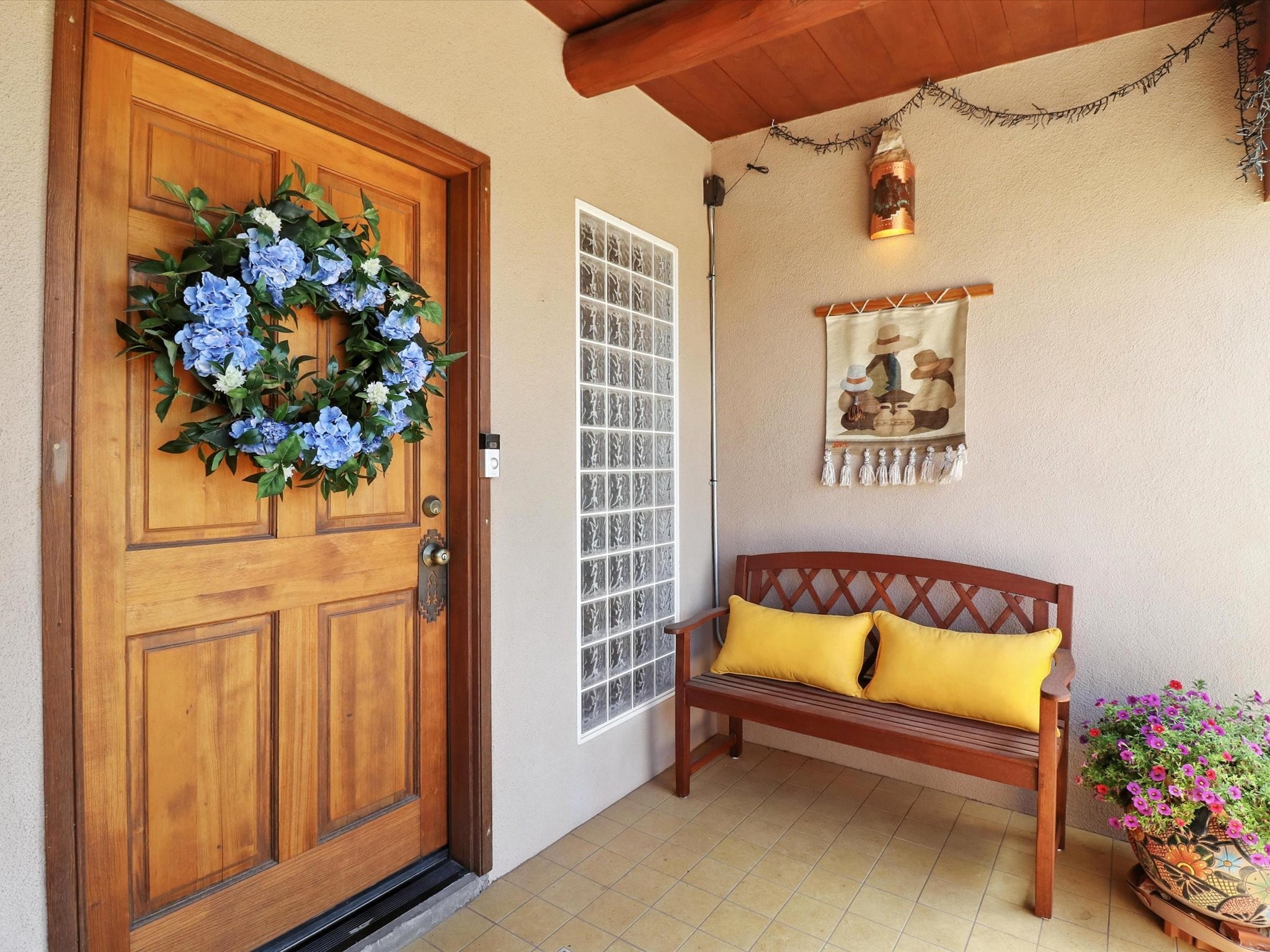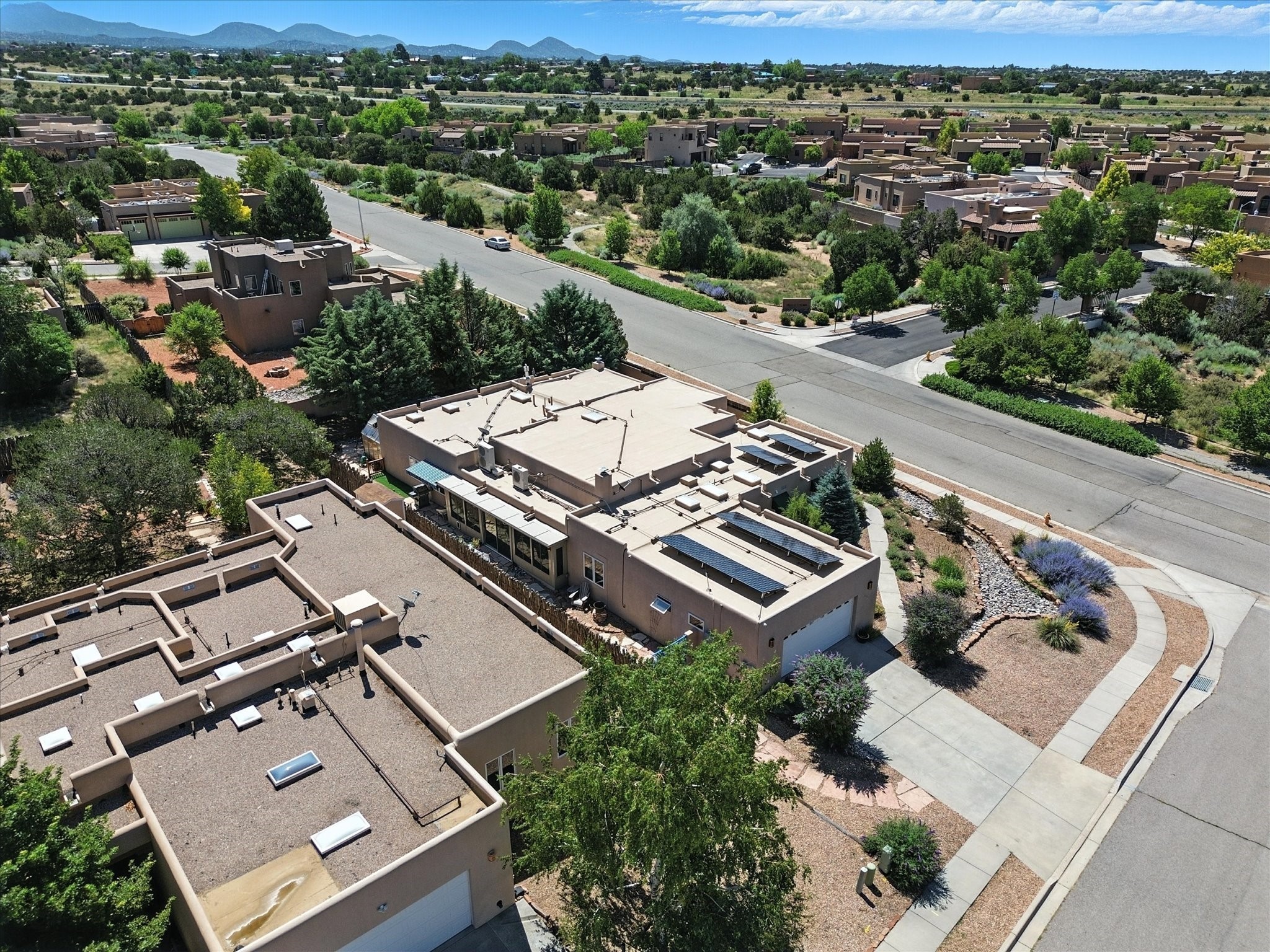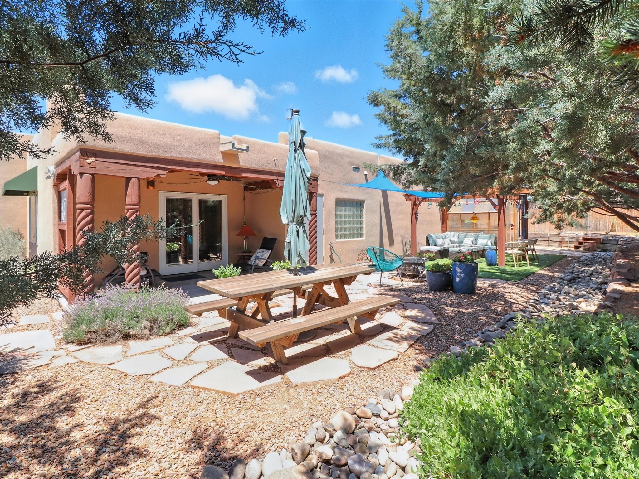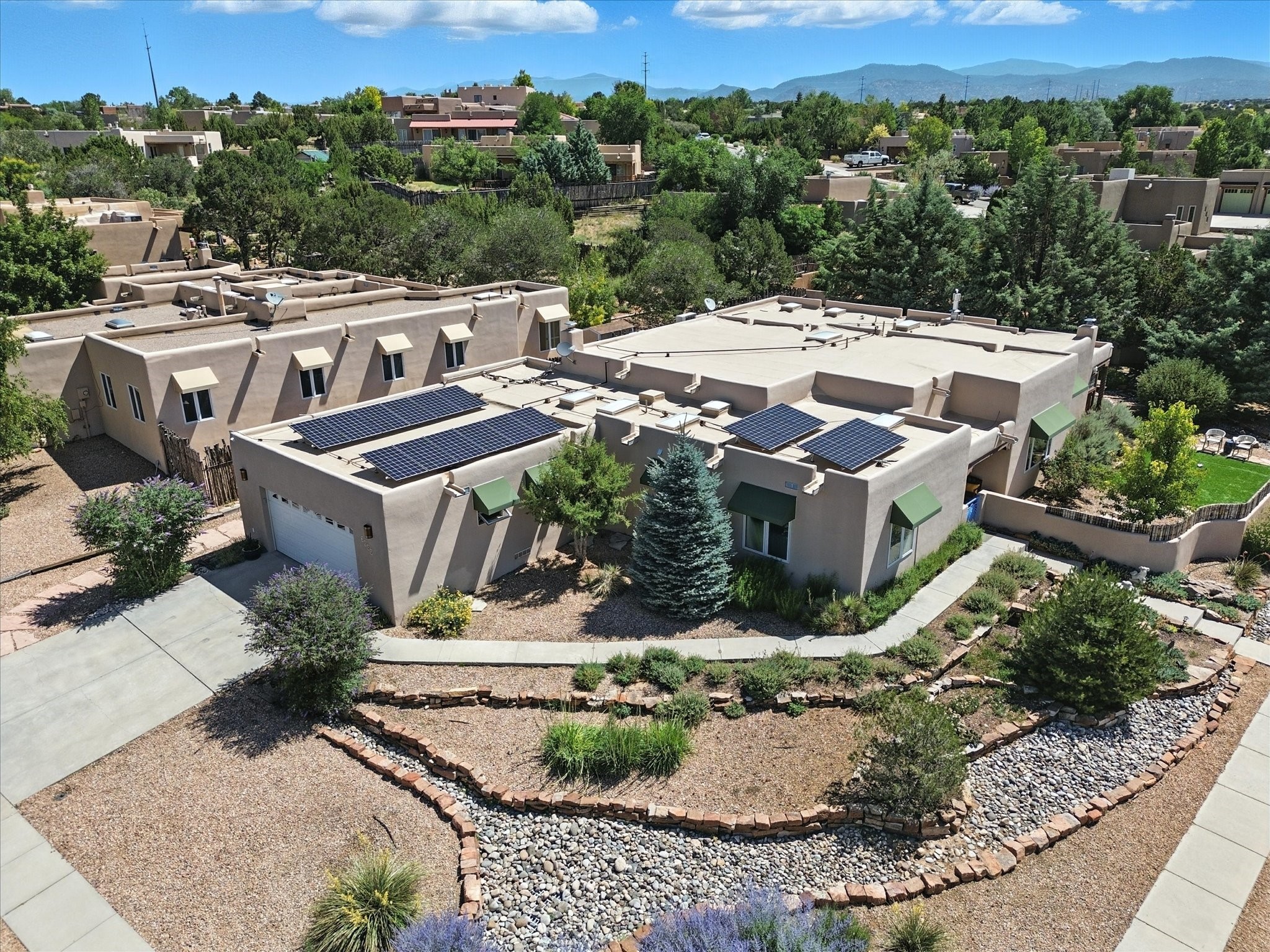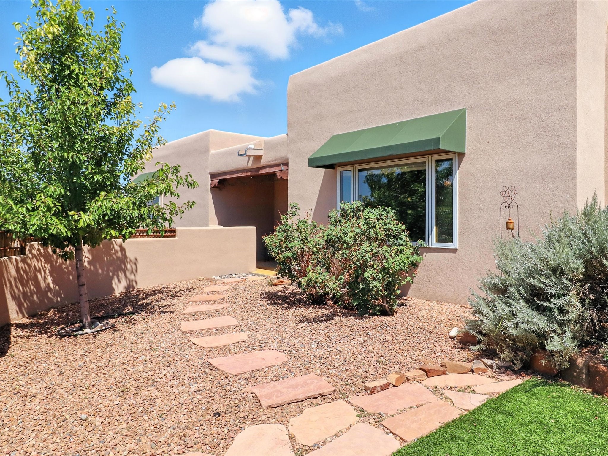 This beautifully maintained and thoughtfully updated home blends timeless Southwestern charm with refined, modern comfort. Spacious and gracefully proportioned rooms are enhanced by luxurious details throughout, including diamond finish plaster walls and elegant, large-format ceramic tile flooring. Step into the dramatic great room, where a soaring 12-foot viga ceiling and a cozy kiva fireplace create a stunning central gathering space. The fully remodeled kitchen is open to the living area and features slab granite countertops, stainless steel appliances, abundant custom cabinetry, and a sunny breakfast nook, perfect for everyday living and entertaining alike. The adjacent formal dining room, also crowned by a high viga ceiling, offers seamless flow for gatherings both intimate and celebratory.A separate den with a wood-burning kiva-style fireplace provides additional flexible living space and opens to a private rear patio and manicured outdoor area.The expansive owner's suite is thoughtfully positioned for privacy and serenity. It includes a peaceful sitting area, direct access to the heated sunroom, and a beautifully appointed updated bath featuring a glass brick wall that gently filters natural light. Two additional bedrooms are located at the opposite end of the home. One is currently serving as studio and office, the other a wonderful guest room, with both sharing a generous full bath. Additional features include: walled and gated yard with security cameras, attached oversized two-car garage, large walk-in closets in every bedroom, heated enclosed Portal Santa Fe room with adjoining covered BBQ area, 5 mini-split Mitsubishi systems for personalized cooling and supplemental heat w/ upgraded hyper compressors, 13 GPM tankless water heater, Toto Washlet toilets, 18 solar panel (owned), and a large in-town lot with all city utilities. This home has been a place of deep joy, creativity, & care, now ready to welcome its next chapter w/ warmth & grace.