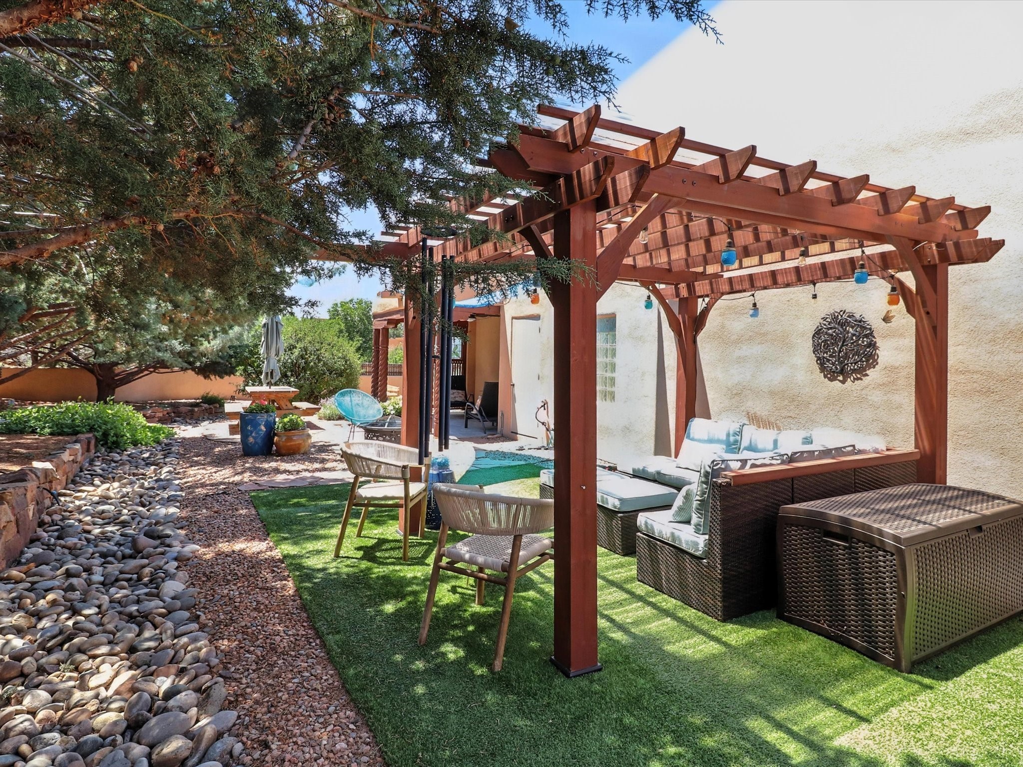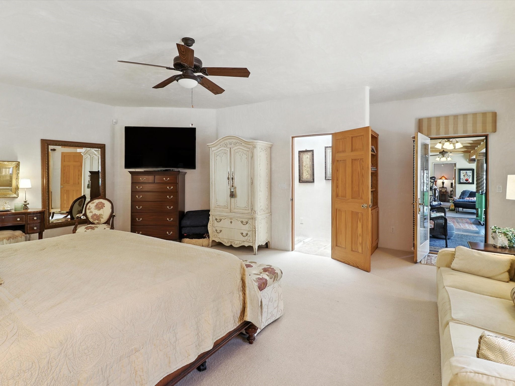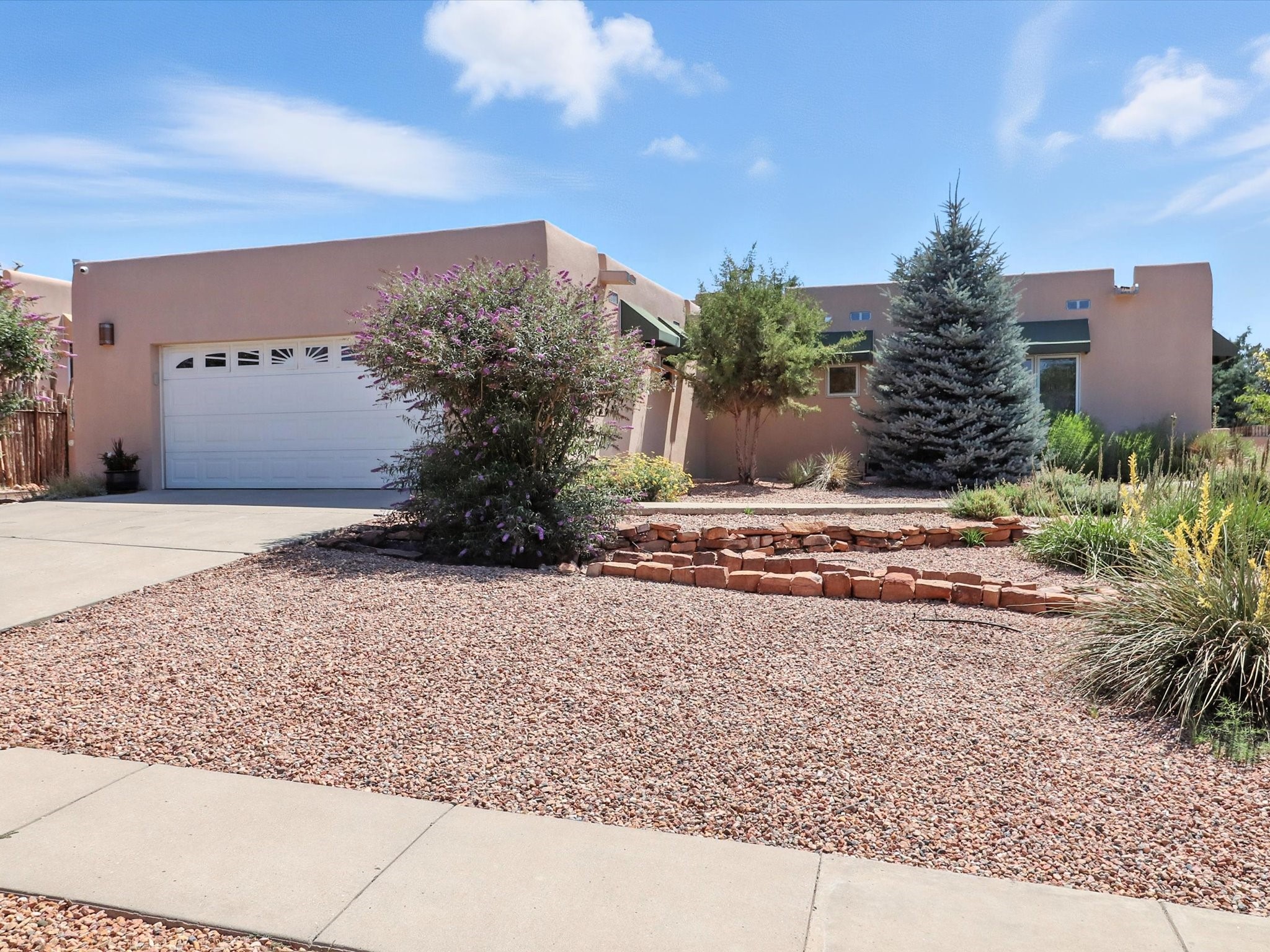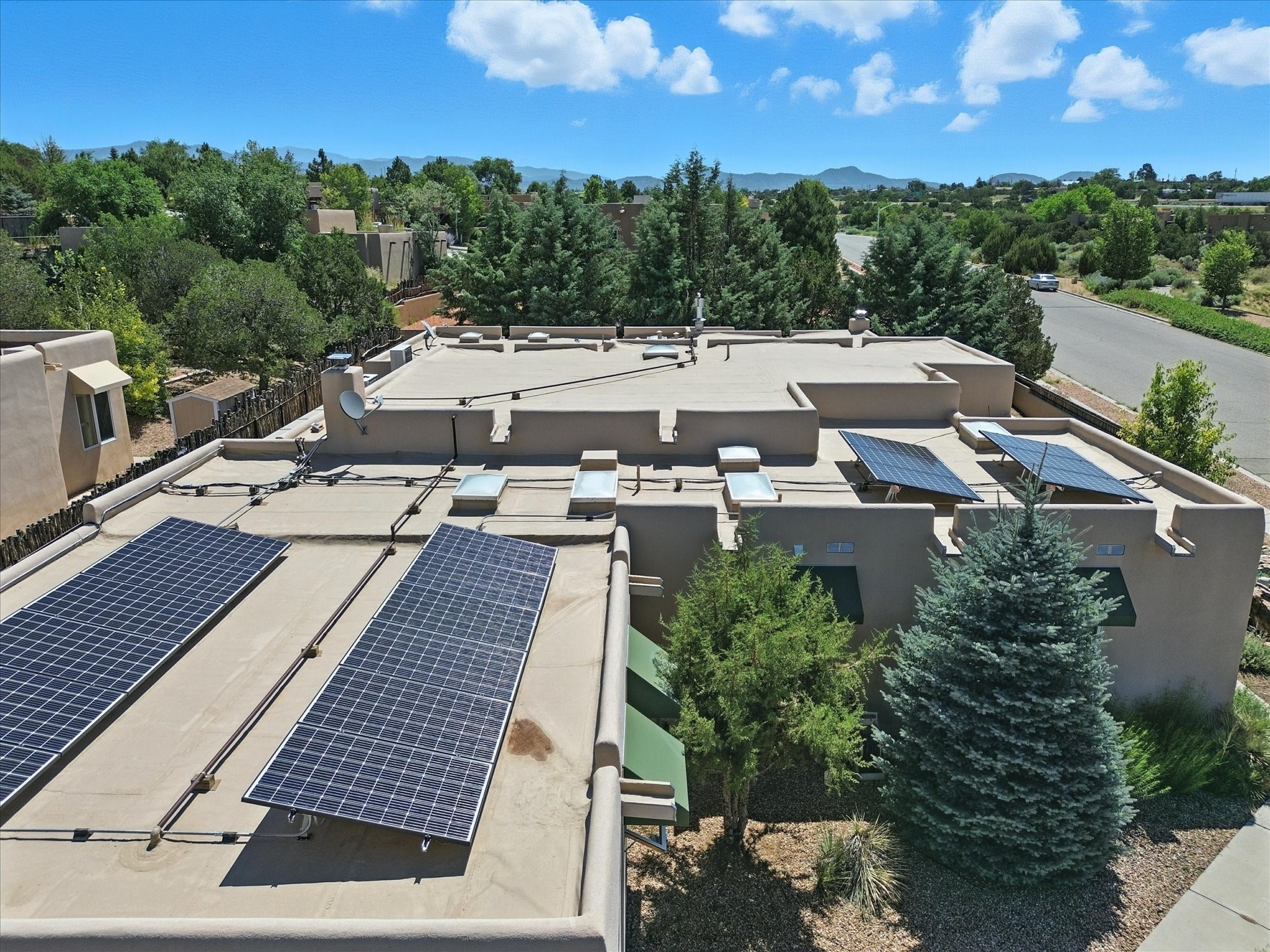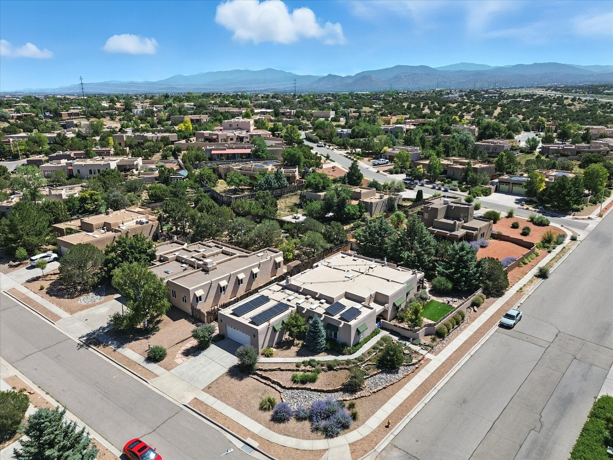 This beautifully maintained and thoughtfully updated home blends timeless Southwestern charm with refined, modern comfort. Spacious and gracefully proportioned rooms are enhanced by luxurious details throughout, including diamond finish plaster walls and elegant, large-format ceramic tile flooring. Step into the dramatic great room, where a soaring 12-foot viga ceiling and a cozy kiva fireplace create a stunning central gathering space. The fully remodeled kitchen is open to the living area and features slab granite countertops, stainless steel appliances, abundant custom cabinetry, and a sunny breakfast nook, perfect for everyday living and entertaining alike. The adjacent formal dining room, also crowned by a high viga ceiling, offers seamless flow for gatherings both intimate and celebratory.A separate den with a wood-burning kiva-style fireplace provides additional flexible living space and opens to a private rear patio and manicured outdoor area.The expansive owner's suite is thoughtfully positioned for privacy and serenity. It includes a peaceful sitting area, direct access to the heated sunroom, and a beautifully appointed updated bath featuring a glass brick wall that gently filters natural light. Two additional bedrooms are located at the opposite end of the home. One is currently serving as studio and office, the other a wonderful guest room, with both sharing a generous full bath. Additional features include: walled and gated yard with security cameras, attached oversized two-car garage, large walk-in closets in every bedroom, heated enclosed Portal Santa Fe room with adjoining covered BBQ area, 5 mini-split Mitsubishi systems for personalized cooling and supplemental heat w/ upgraded hyper compressors, 13 GPM tankless water heater, Toto Washlet toilets, 18 solar panel (owned), and a large in-town lot with all city utilities. This home has been a place of deep joy, creativity, & care, now ready to welcome its next chapter w/ warmth & grace.