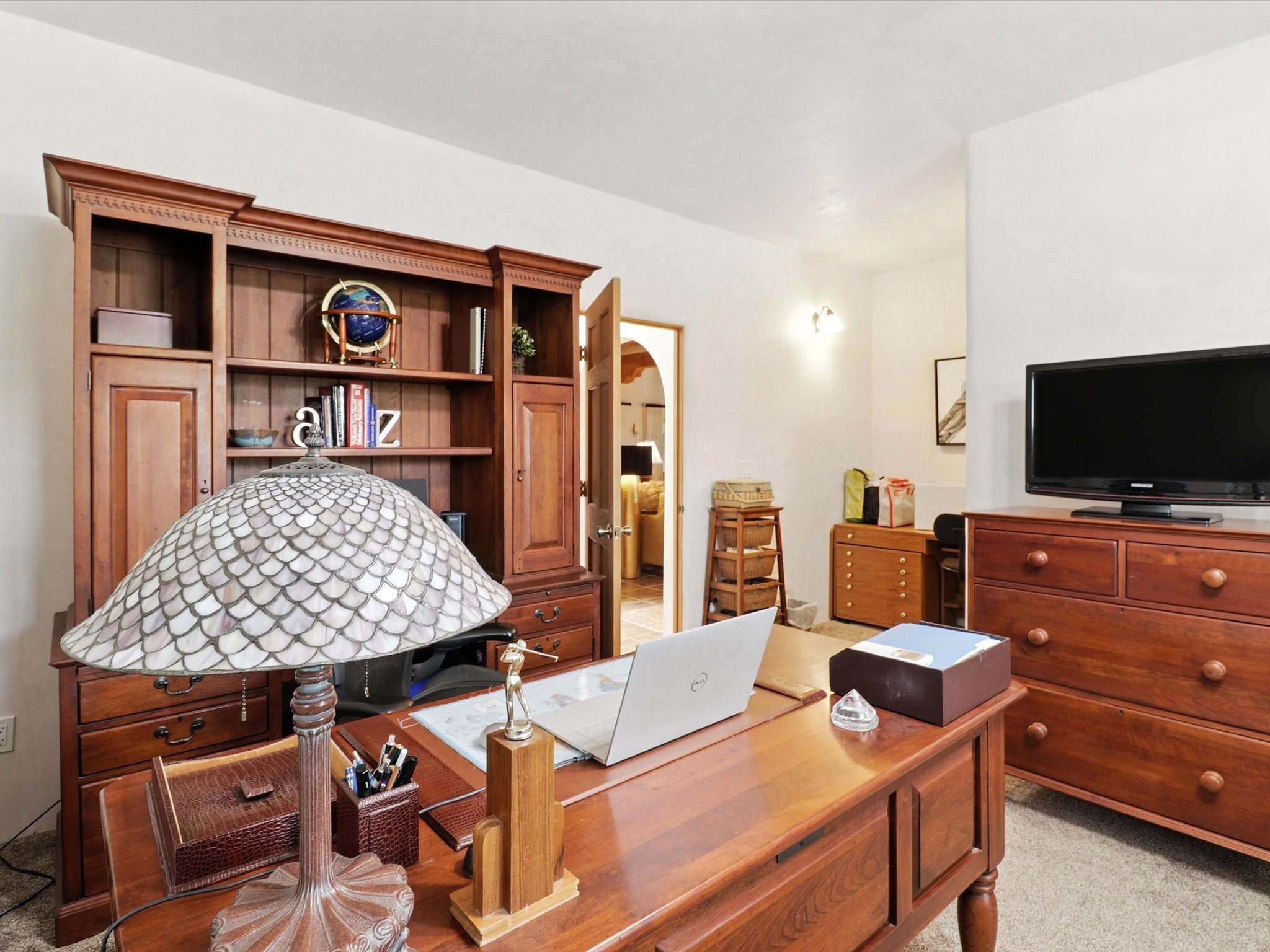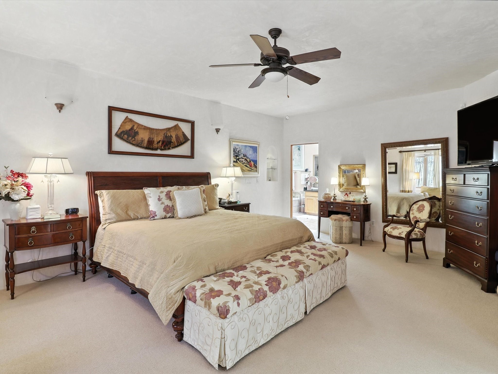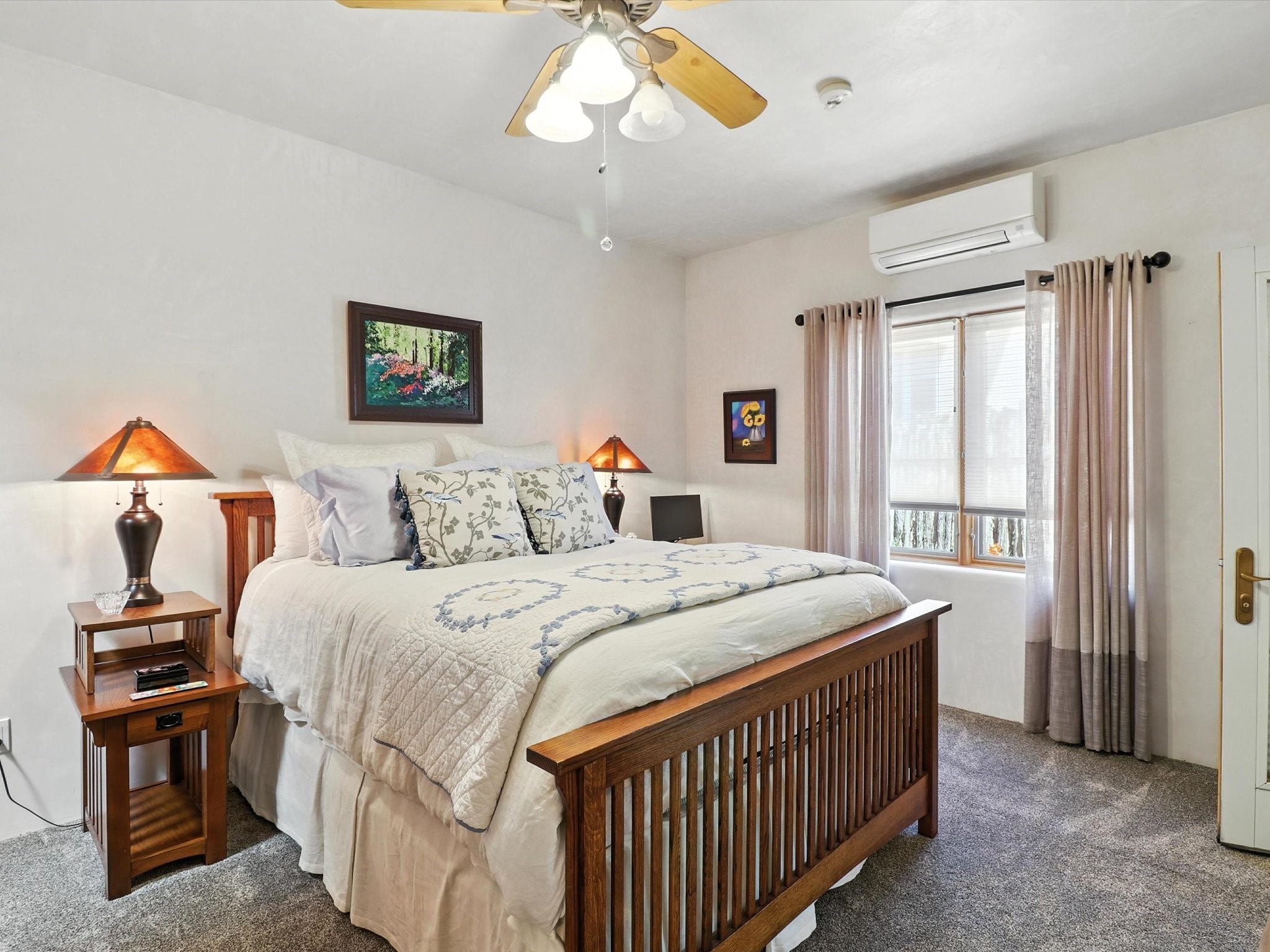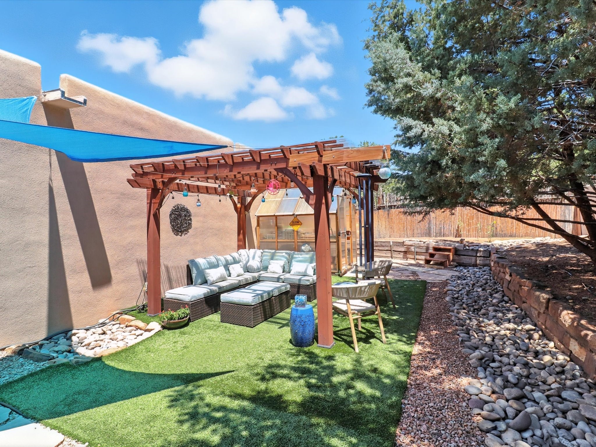 This beautifully maintained and thoughtfully updated home blends timeless Southwestern charm with refined, modern comfort. Spacious and gracefully proportioned rooms are enhanced by luxurious details throughout, including diamond finish plaster walls and elegant, large-format ceramic tile flooring. Step into the dramatic great room, where a soaring 12-foot viga ceiling and a cozy kiva fireplace create a stunning central gathering space. The fully remodeled kitchen is open to the living area and features slab granite countertops, stainless steel appliances, abundant custom cabinetry, and a sunny breakfast nook, perfect for everyday living and entertaining alike. The adjacent formal dining room, also crowned by a high viga ceiling, offers seamless flow for gatherings both intimate and celebratory.A separate den with a wood-burning kiva-style fireplace provides additional flexible living space and opens to a private rear patio and manicured outdoor area.The expansive owner's suite is thoughtfully positioned for privacy and serenity. It includes a peaceful sitting area, direct access to the heated sunroom, and a beautifully appointed updated bath featuring a glass brick wall that gently filters natural light. Two additional bedrooms are located at the opposite end of the home. One is currently serving as studio and office, the other a wonderful guest room, with both sharing a generous full bath. Additional features include: walled and gated yard with security cameras, attached oversized two-car garage, large walk-in closets in every bedroom, heated enclosed Portal Santa Fe room with adjoining covered BBQ area, 5 mini-split Mitsubishi systems for personalized cooling and supplemental heat w/ upgraded hyper compressors, 13 GPM tankless water heater, Toto Washlet toilets, 18 solar panel (owned), and a large in-town lot with all city utilities. This home has been a place of deep joy, creativity, & care, now ready to welcome its next chapter w/ warmth & grace.