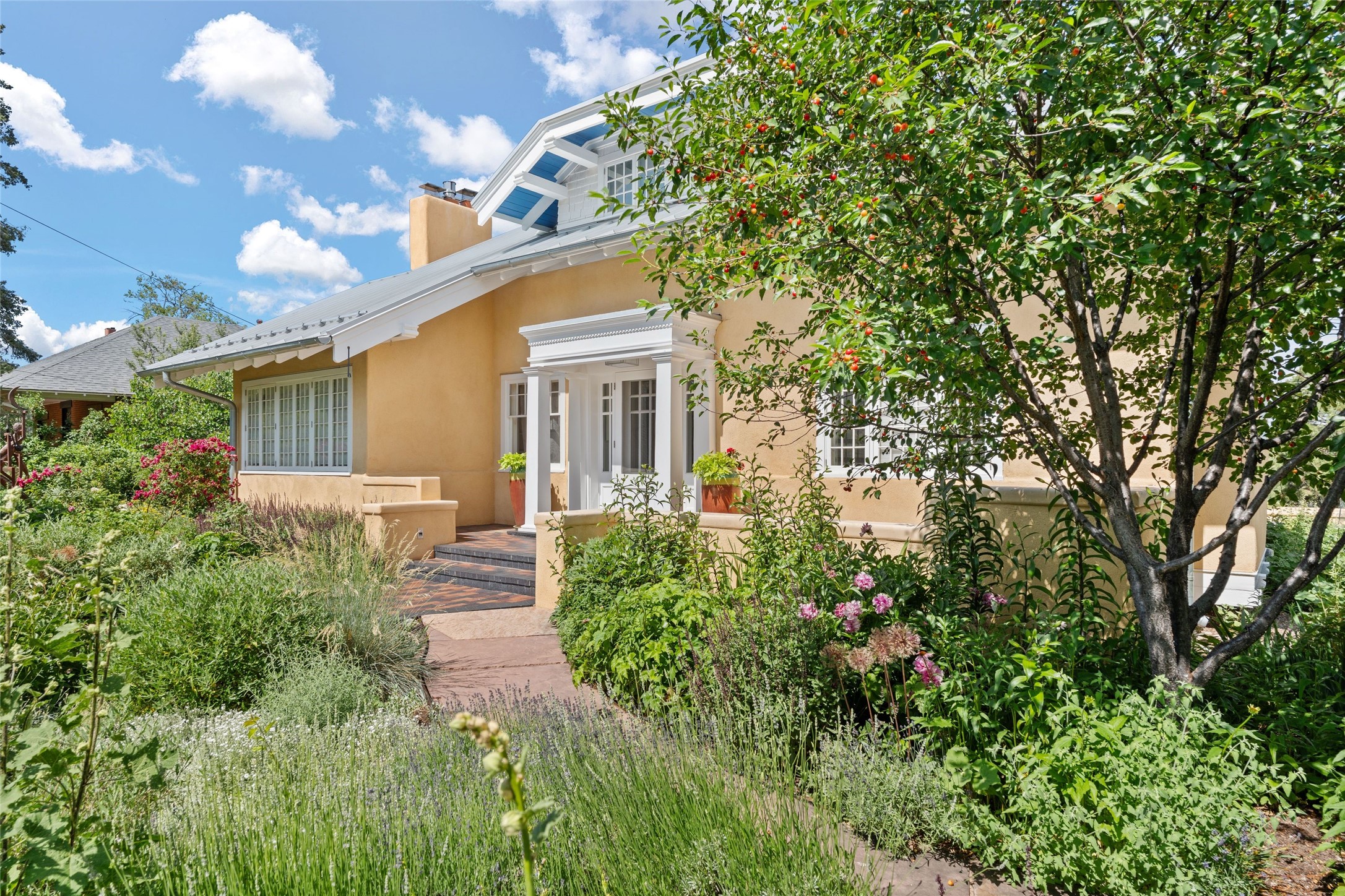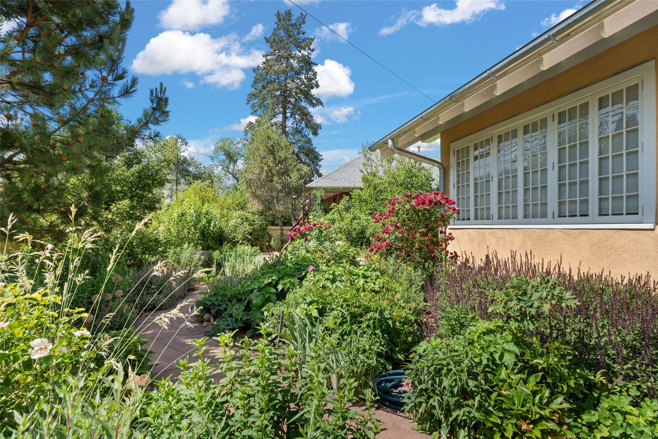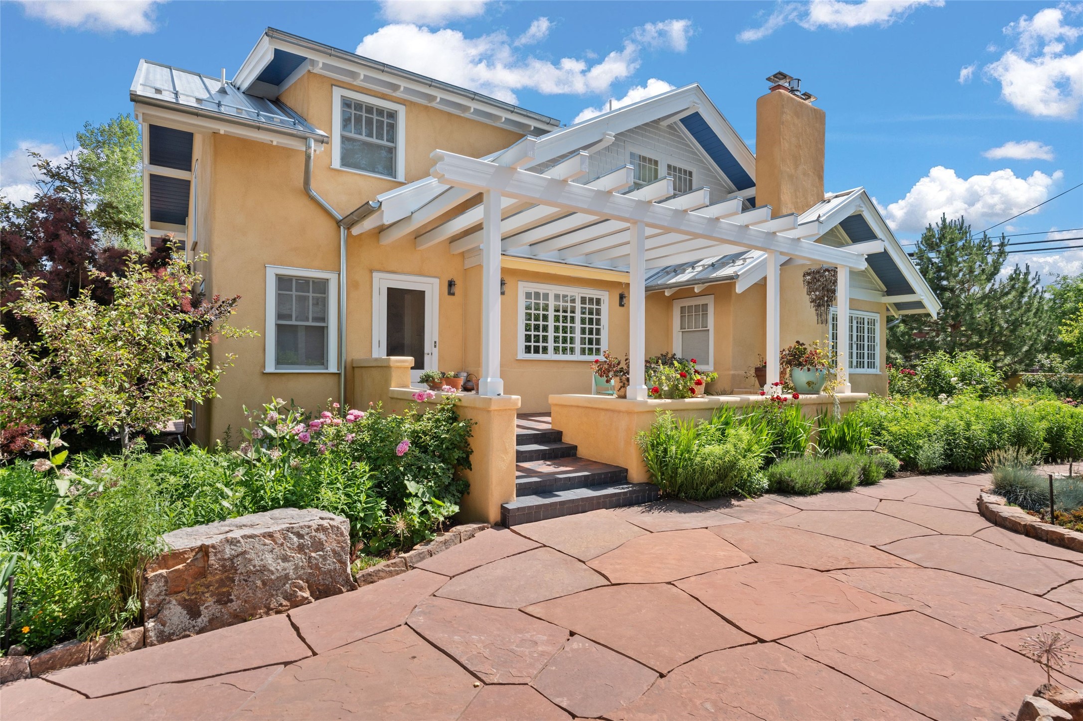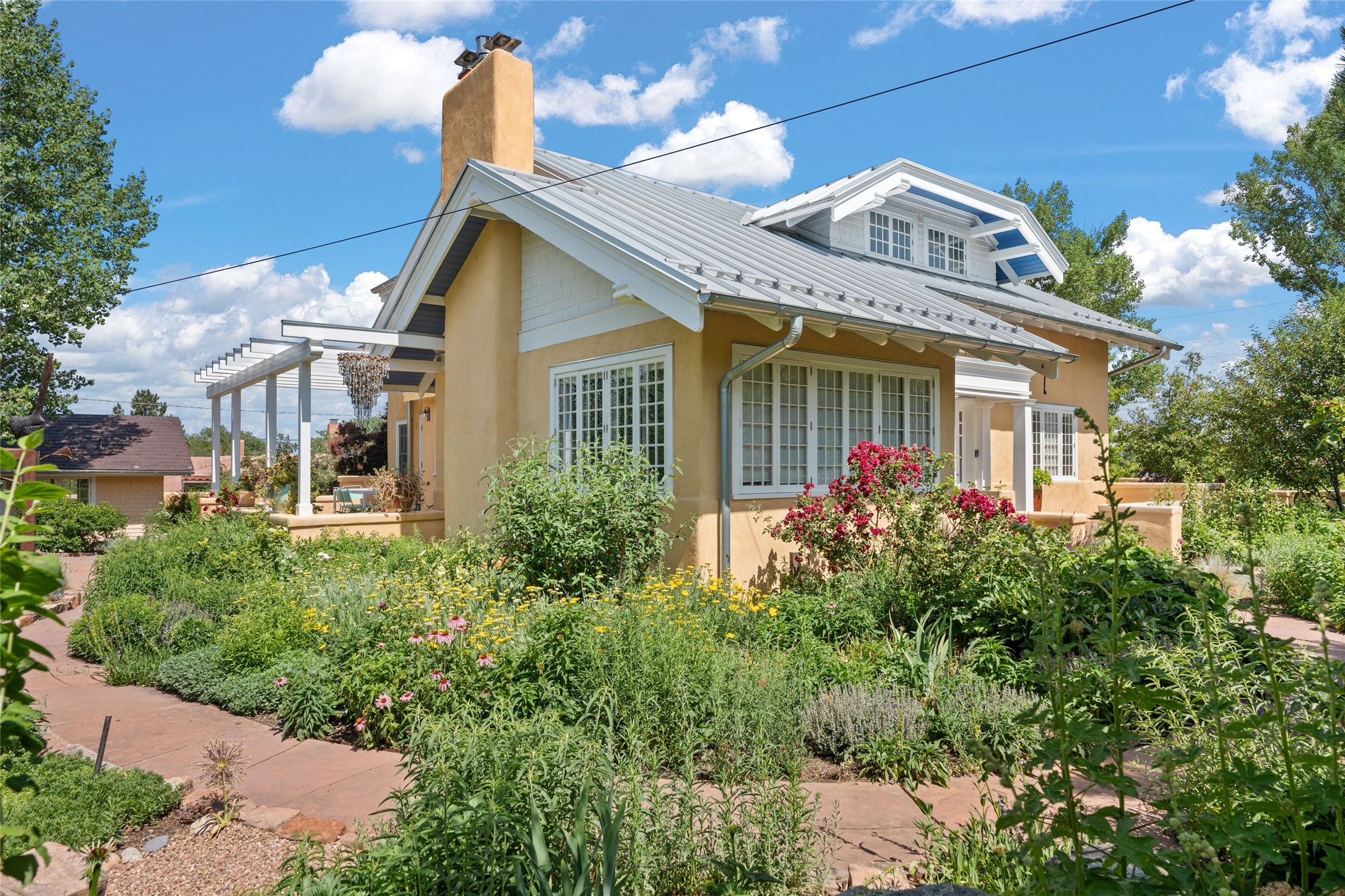Here's an opportunity to own a rare and special Craftsman-style home in South Capitol. The magnificent, flowering grounds, quality and scale separate this property from its surroundings, making it one of the most charming and irreplaceable properties in this sought-after downtown neighborhood. The over 3,000 square-foot, 4-bedroom, 3-bathroom, two-story home is complimented by a detached 450-square foot studio. Originally restored by award-winning builder Tierra Concepts, the historical home has updated finishes that are refined and timeless. The first level contains the elegant kitchen, primary bedroom suite, dining room, and flexible entertaining and relaxation spaces. The upstairs fits a den and three bedrooms or offices, sharing a full bathroom. Throughout the interior spaces are charming details and accents, like a reading nook built into the stairwell landing. A finished basement provides surprisingly ample storage, hard to find elsewhere downtown. While wrapped in a nostalgic package of a past architectural era, the house holds a Gold LEED certification. Modern updates include a whole-house water treatment system, high-efficiency furnace, on-demand water heater, ERV air circulation system, and rainwater catchment cisterns. Despite the bounties of the home and studio, the real highlight are the stunning landscaped grounds. Flagstone paths meander past fountains and blooming garden beds to sitting areas tucked away behind masks of purple, yellow, red flowers. Outside the kitchen is a brick patio beneath a wooden pergola, overlooking the fire pit seating area. The privacy and serenity of the property is in contrast to its in-town and walkable location. 904 Don Gaspar is a world of privacy in the heart of Santa Fe, offering a rare balance of history and design.