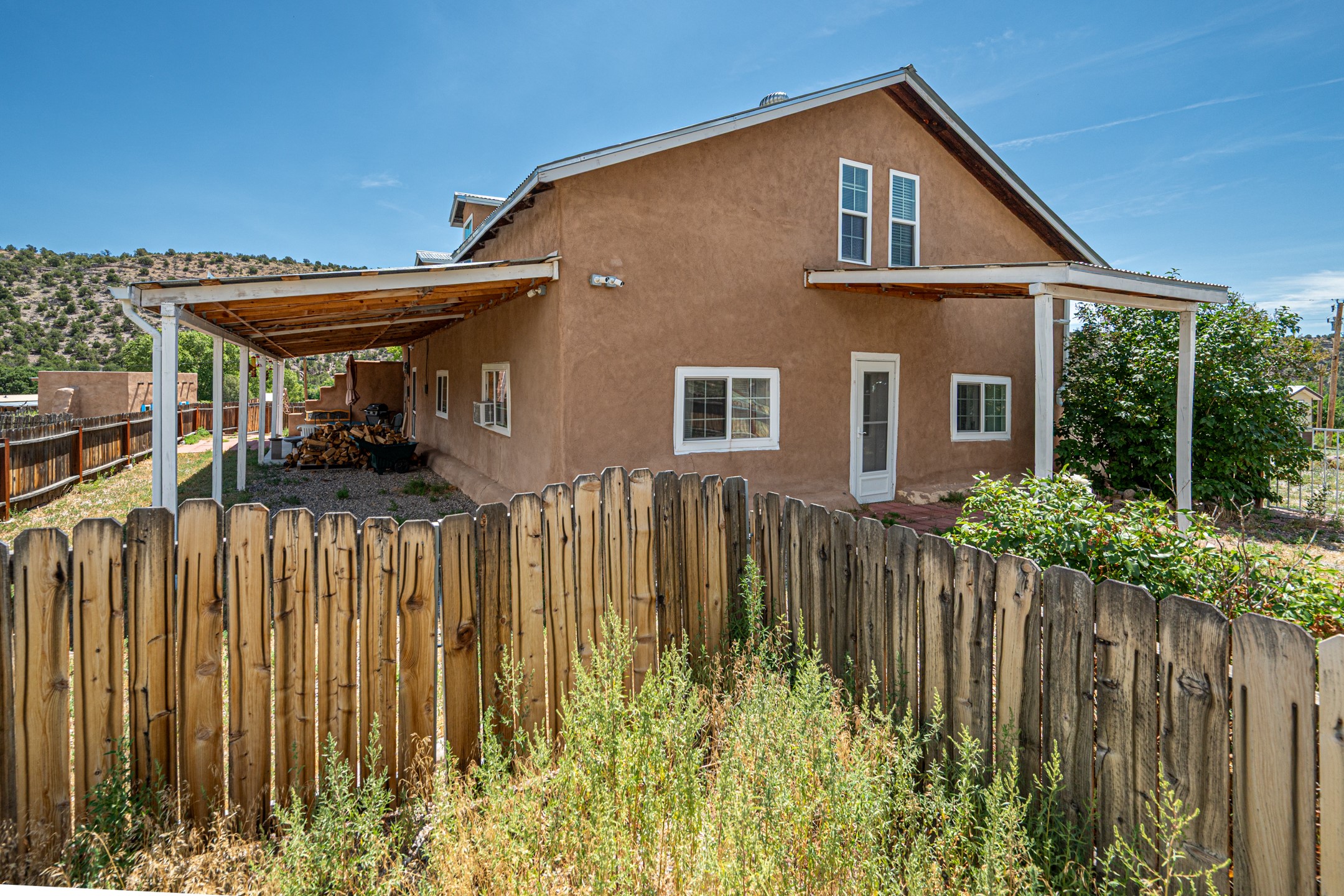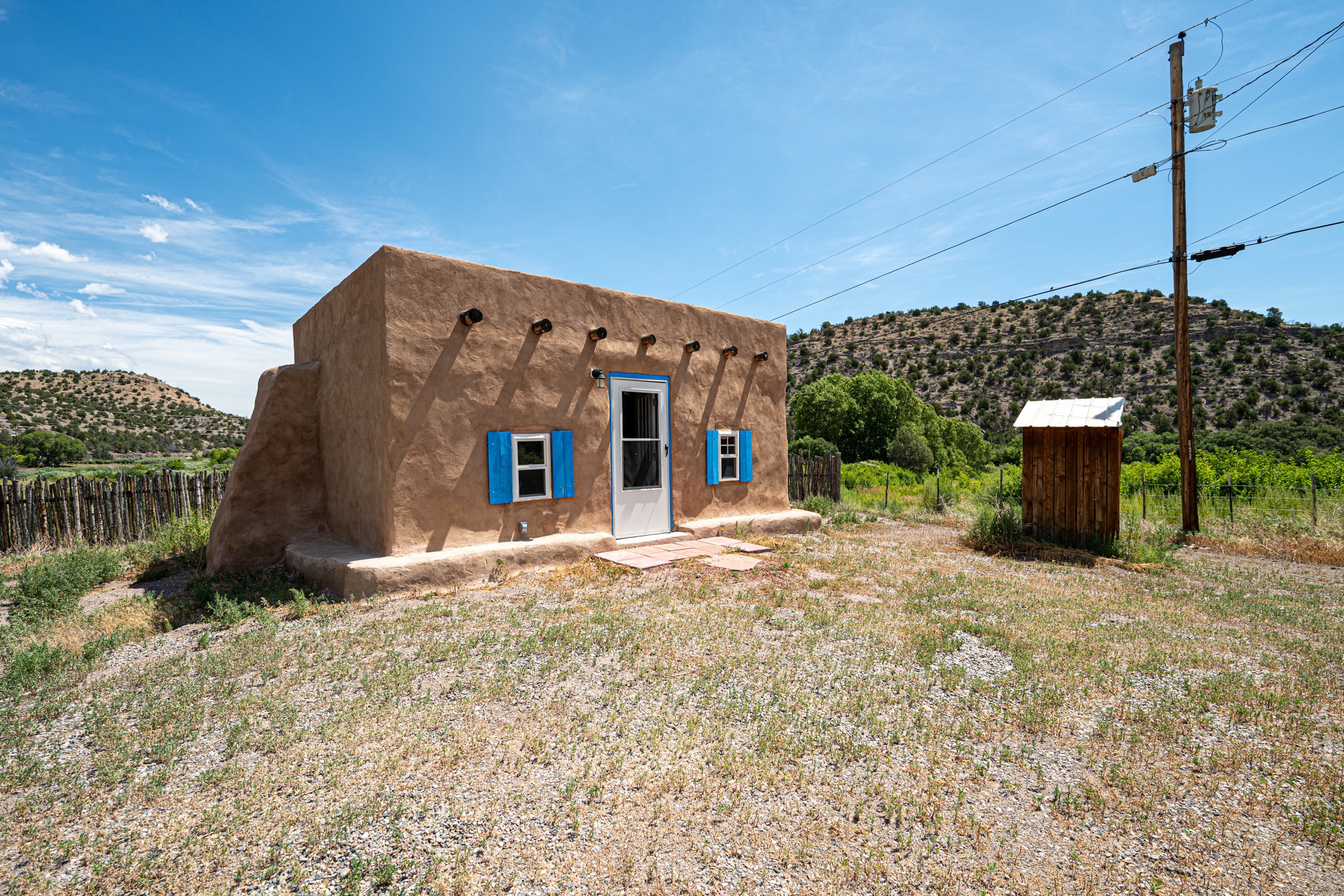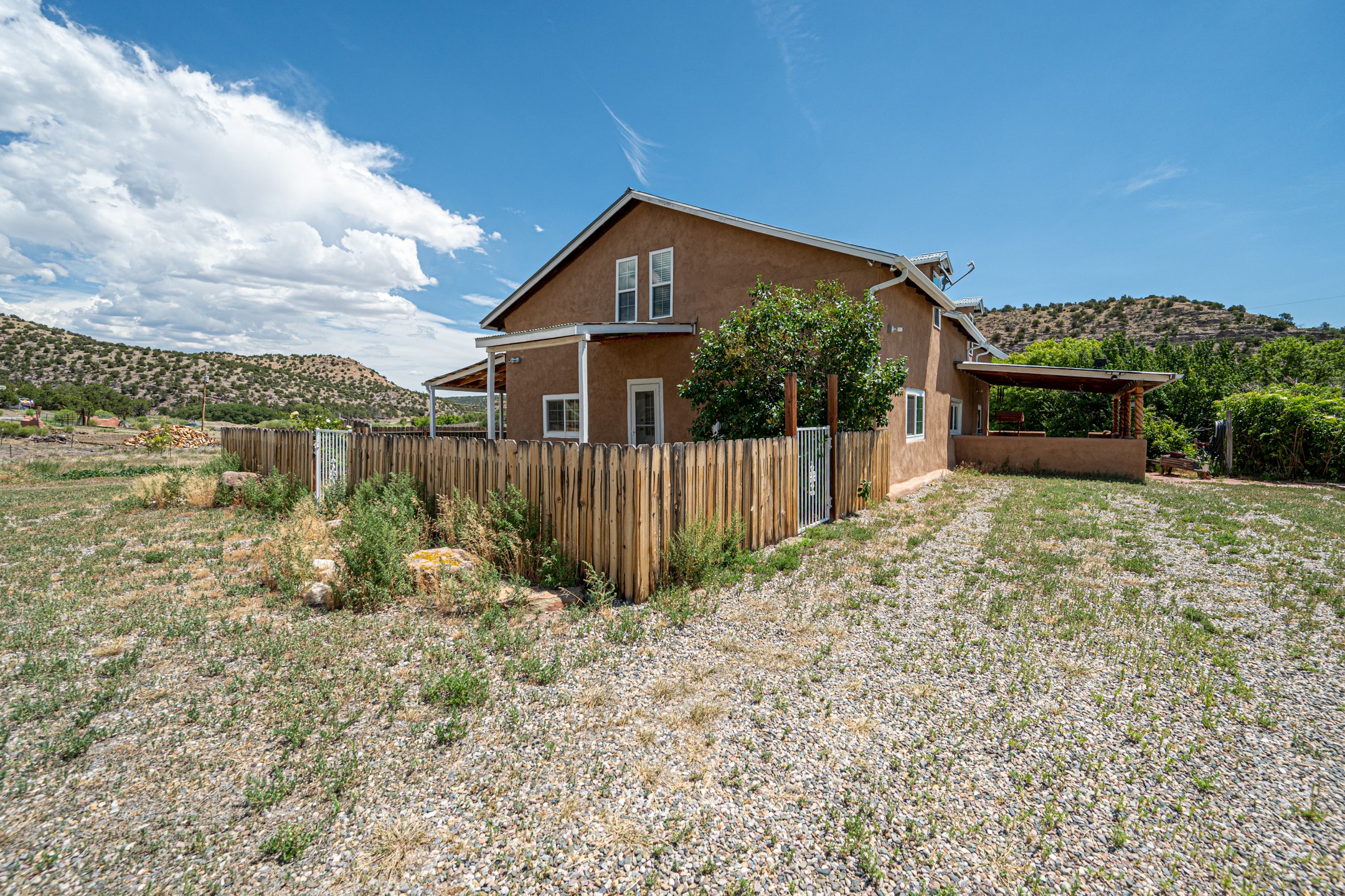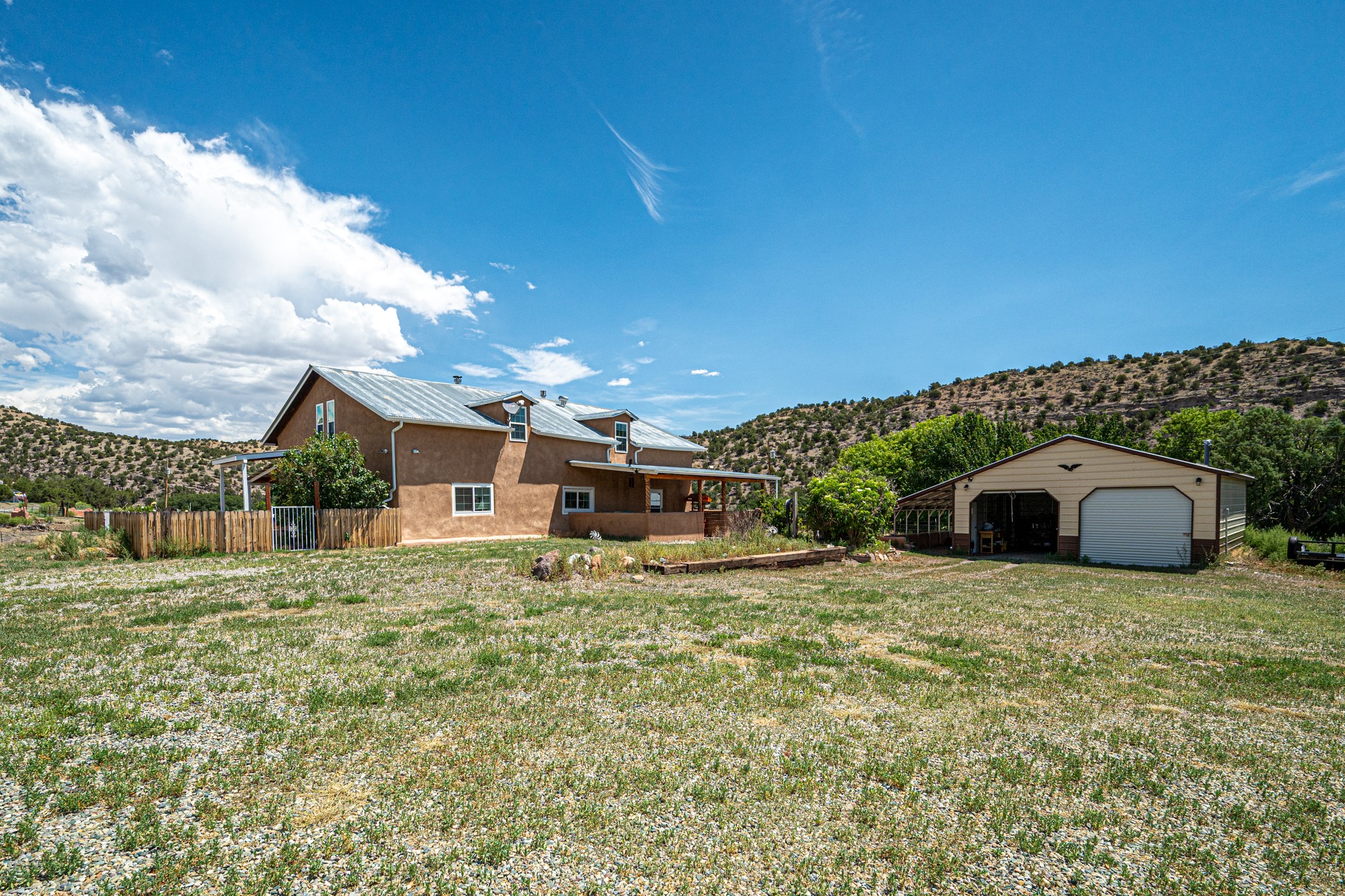 This sprawling ranch sits on 24 acres with an underground irrigation system throughout and the Tusas River winding through the estate. It consist of an 2600 Sq/Ft adobe (mud block) two-story main house built in the early 1940s. The thick, earthen walls, offers a unique and comforting warmth during the colder months and are cool during the hot summer days are also a glimpse into the rich historic past of New Mexico. Within a short walking distance from the main home, is the 320 Sq/Ft casita dating early circa 1830's. The allure of adobe-style home building, often referred to as Pueblo style, lies in its romantic visual appeal that resonates with many seeking a traditional Southwestern aesthetic. The influence of Moorish architecture on adobe homes is notable, reflecting centuries of cultural exchange between North Africa and Spain, which subsequently impacted the architectural landscape of New Mexico. This historical connection adds a layer of depth to the architectural heritage of the area. The property additionally features a 24'x28' two-car garage; a 36'x 40' workshop and a 36' x36' metal barn. Traditional farming in the area included harvesting alfalfa, vegetables and other farming, largely organic. The community of La Madera population is about 150 people, which offers a great deal of privacy. The mountains surrounding the property are a "high-elevation desert landscape" are characterized by dramatic mountains, broad valleys, high elevation, alkaline soil, and an abundance of diverse plant and animal life. Also offered is the potential of purchasing the farm equipment at a reduced rate. Property is ideal for horses, sheep, cattle, goats, pets and other livestock.