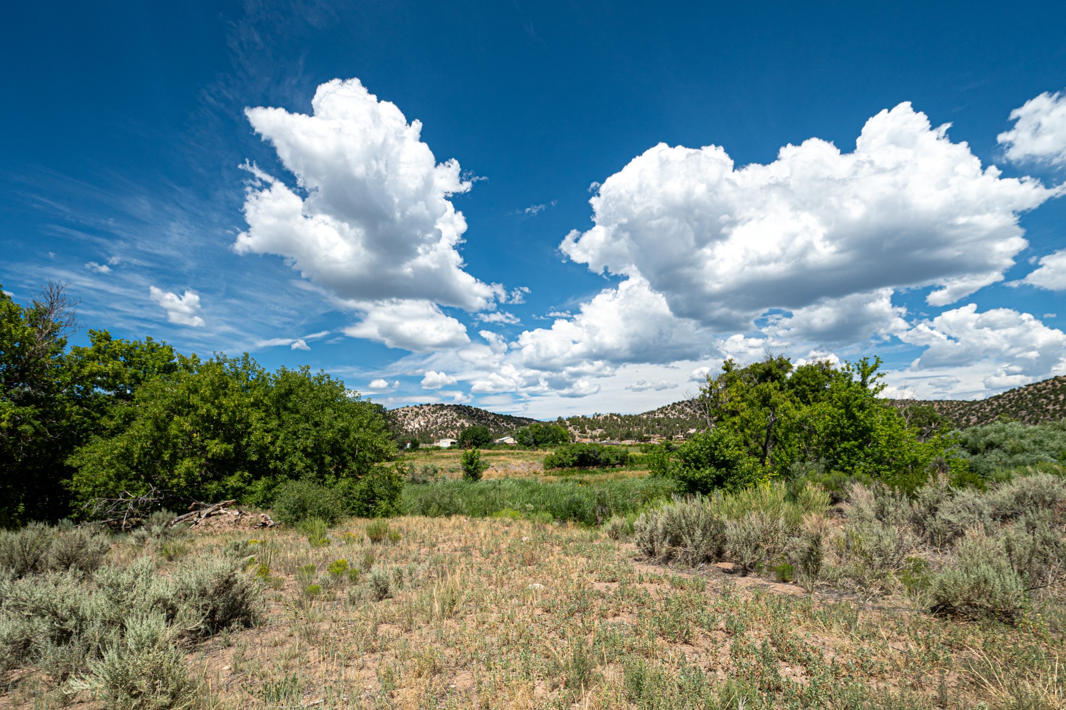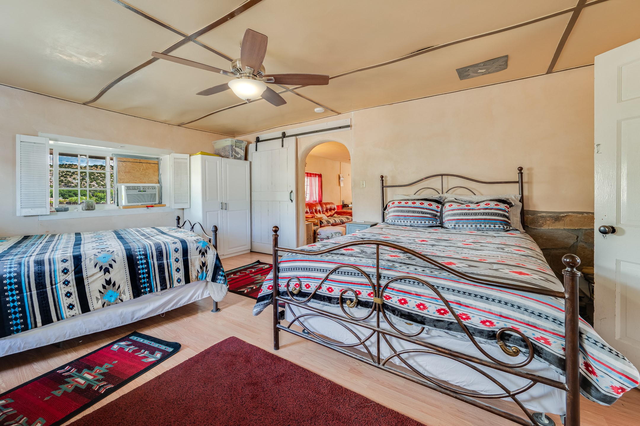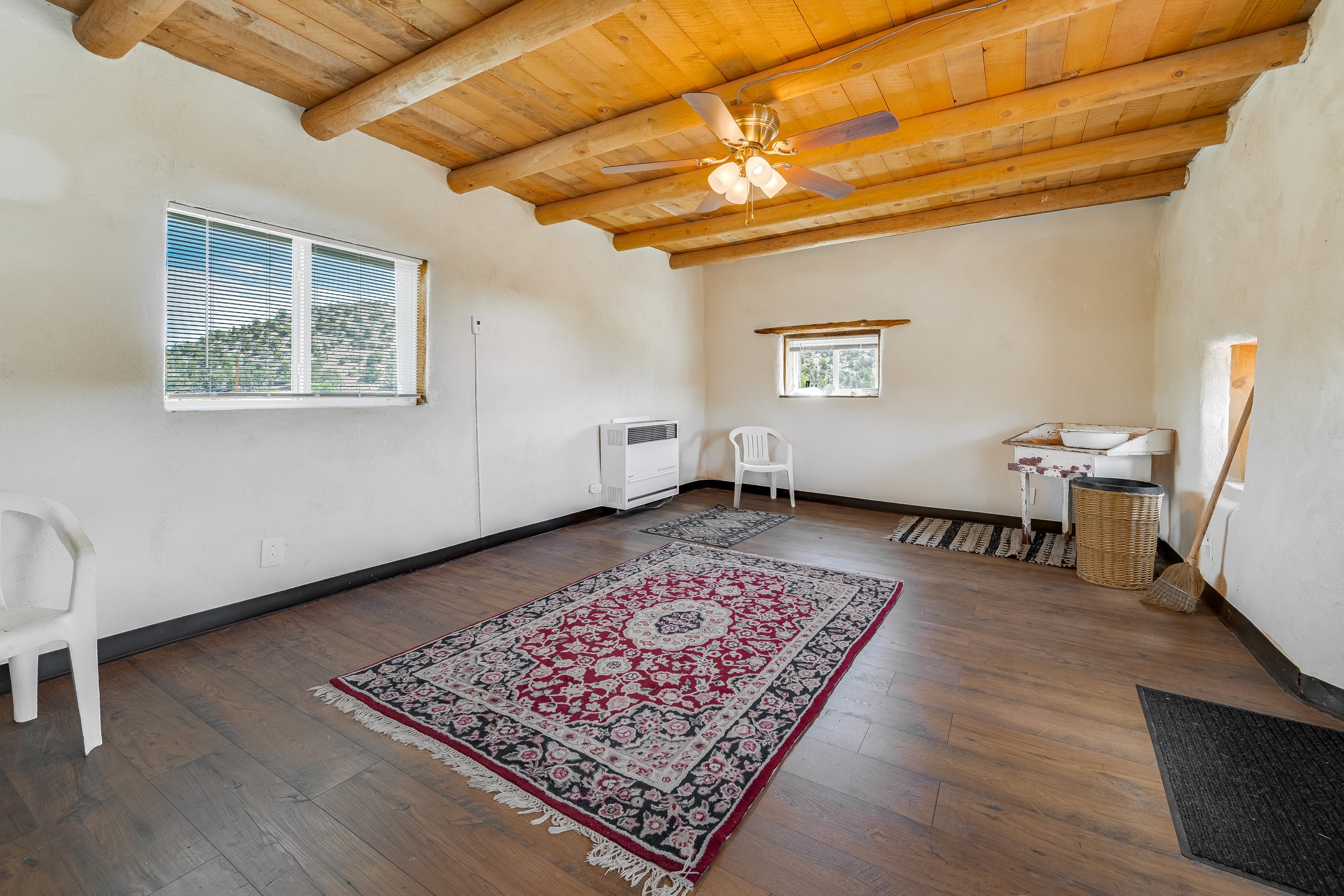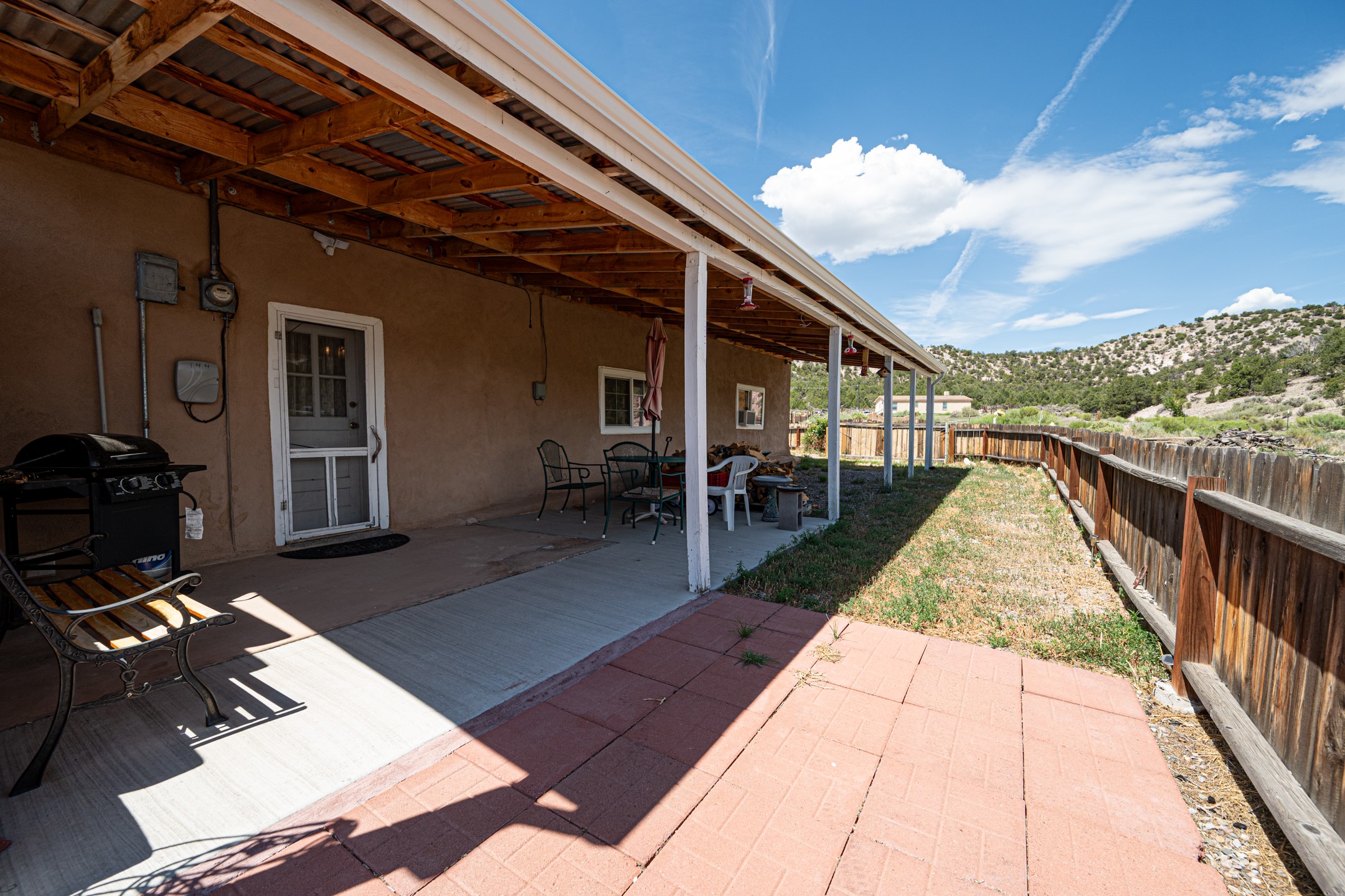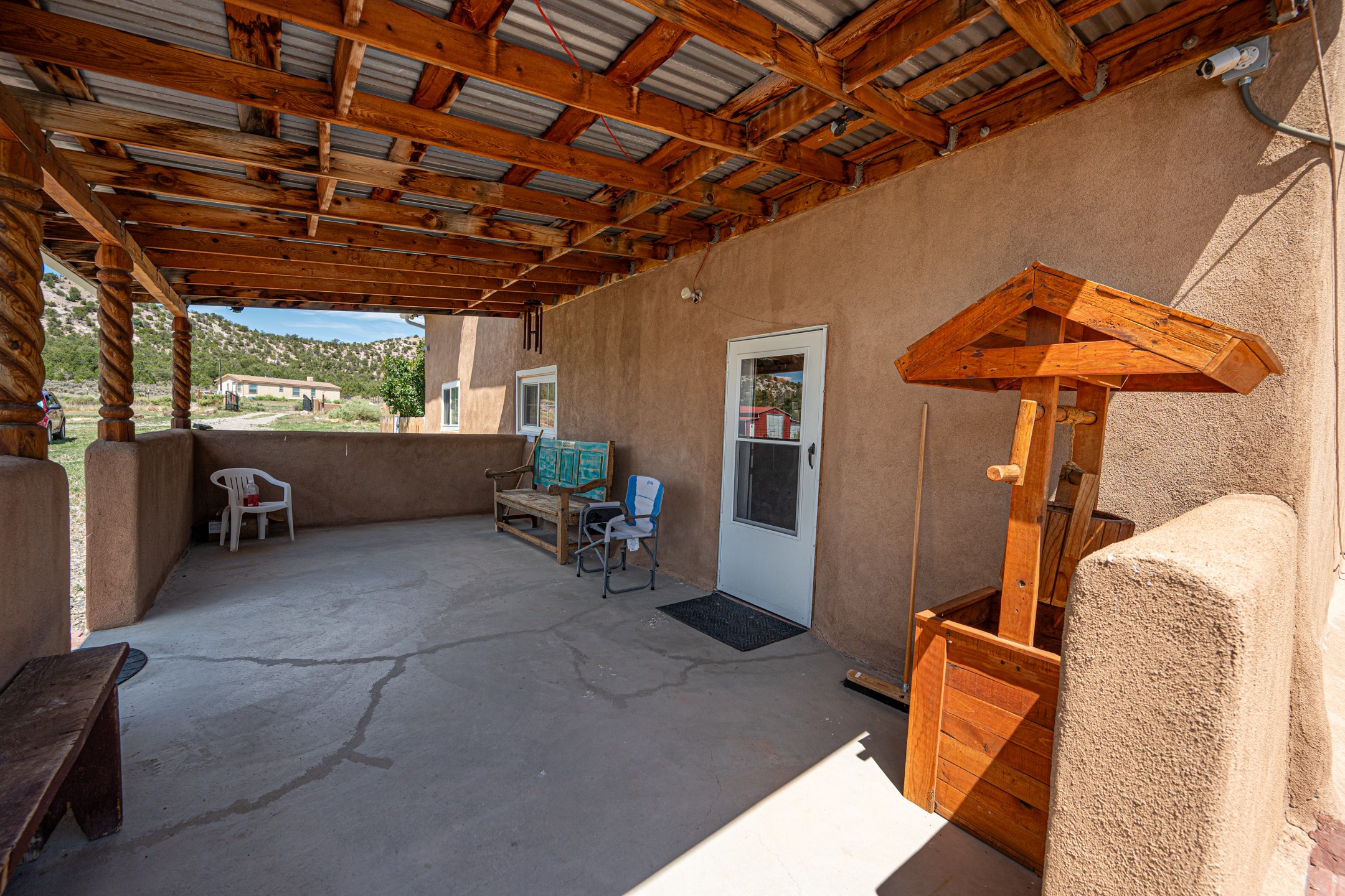 This sprawling ranch sits on 24 acres with an underground irrigation system throughout and the Tusas River winding through the estate. It consist of an 2600 Sq/Ft adobe (mud block) two-story main house built in the early 1940s. The thick, earthen walls, offers a unique and comforting warmth during the colder months and are cool during the hot summer days are also a glimpse into the rich historic past of New Mexico. Within a short walking distance from the main home, is the 320 Sq/Ft casita dating early circa 1830's. The allure of adobe-style home building, often referred to as Pueblo style, lies in its romantic visual appeal that resonates with many seeking a traditional Southwestern aesthetic. The influence of Moorish architecture on adobe homes is notable, reflecting centuries of cultural exchange between North Africa and Spain, which subsequently impacted the architectural landscape of New Mexico. This historical connection adds a layer of depth to the architectural heritage of the area. The property additionally features a 24'x28' two-car garage; a 36'x 40' workshop and a 36' x36' metal barn. Traditional farming in the area included harvesting alfalfa, vegetables and other farming, largely organic. The community of La Madera population is about 150 people, which offers a great deal of privacy. The mountains surrounding the property are a "high-elevation desert landscape" are characterized by dramatic mountains, broad valleys, high elevation, alkaline soil, and an abundance of diverse plant and animal life. Also offered is the potential of purchasing the farm equipment at a reduced rate. Property is ideal for horses, sheep, cattle, goats, pets and other livestock.